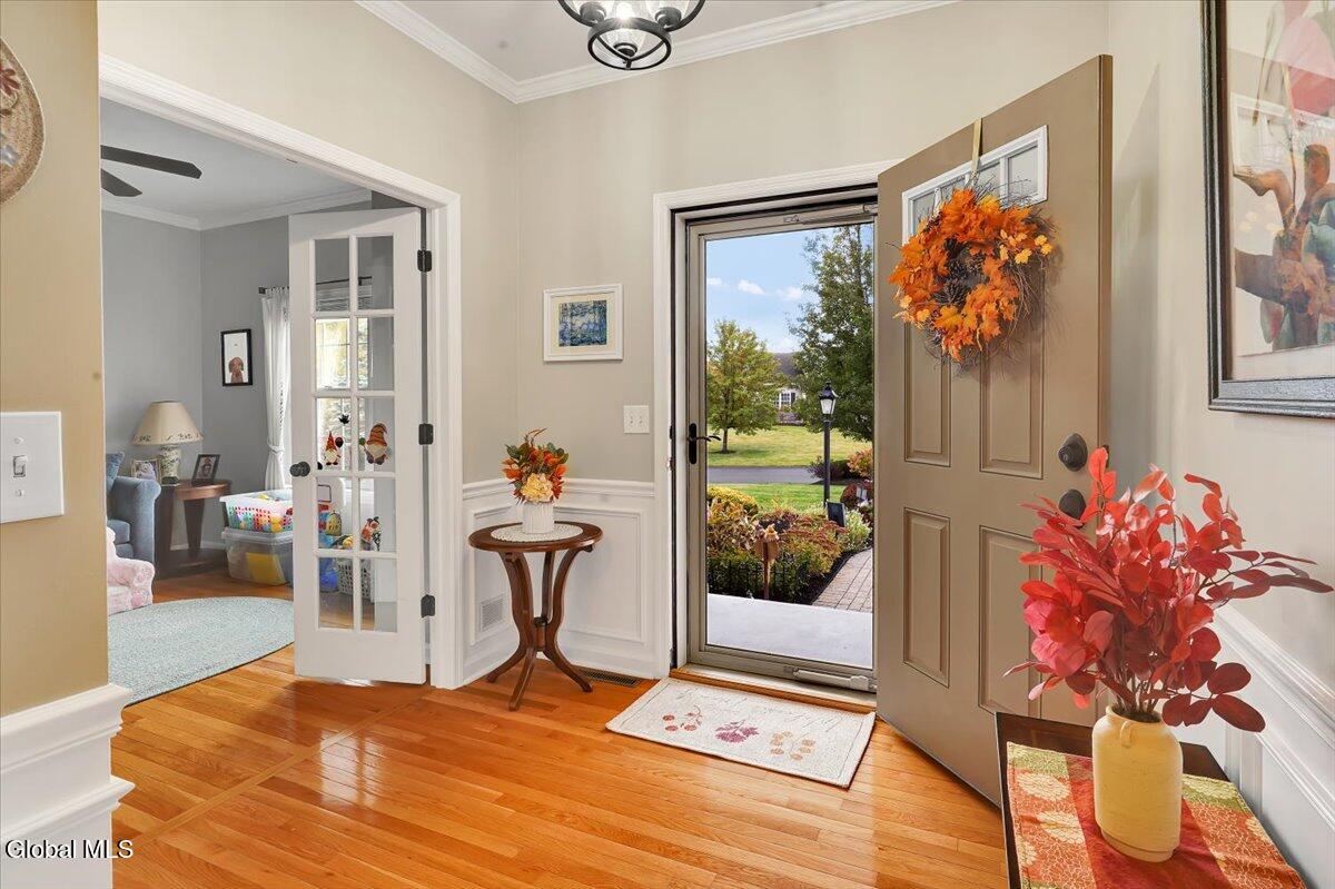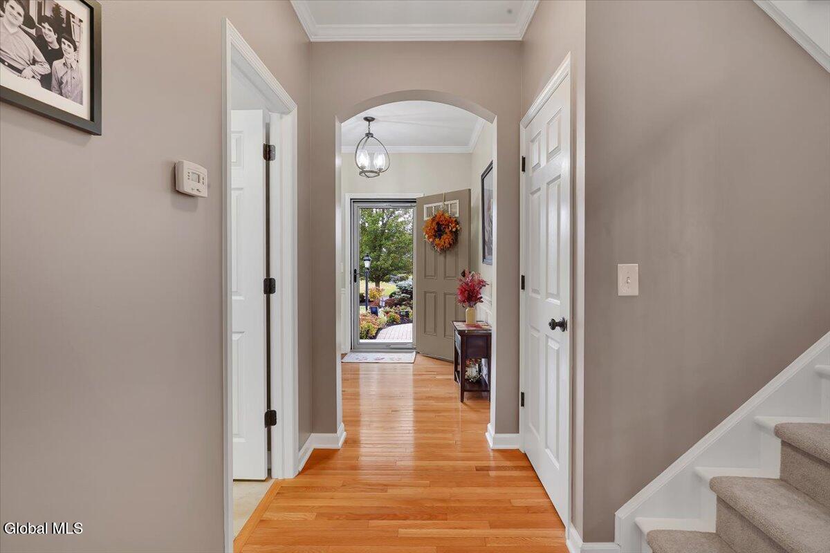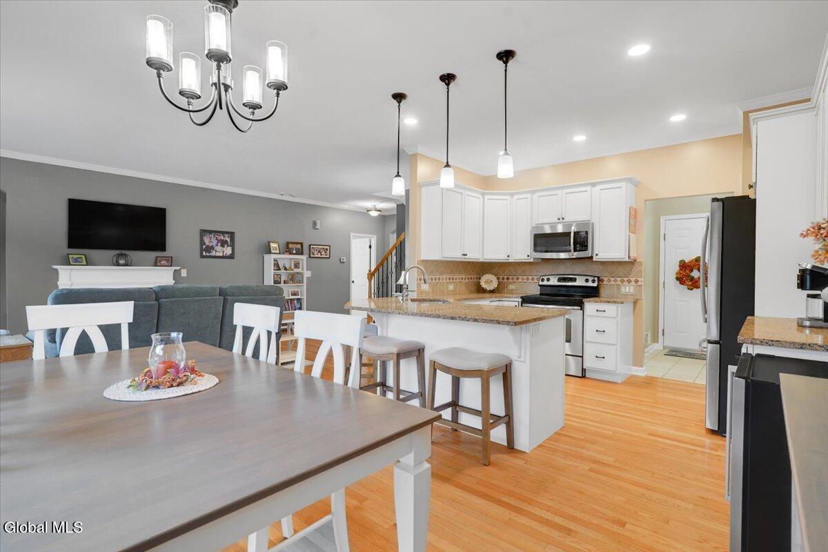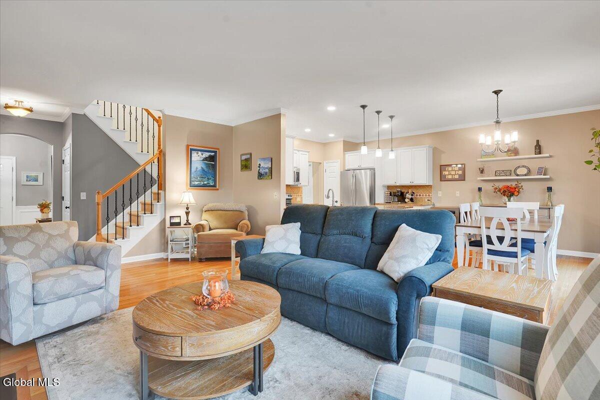 OPEN HOUSE CANCELLED! Discover refined living in this beautifully appointed two-story townhouse, perfectly blending sophistication and comfort. This 3-bed/2.5 bath home boasts an open-concept floor plan showcasing gleaming hardwood floors and crown molding. A stately fireplace anchors the inviting living room, creating the perfect ambiance for relaxing or entertaining. The kitchen is equipped with stainless steel appliances and ample cabinetry, seamlessly flowing into the dining and living spaces. The first-floor primary suite offers a private retreat with a spacious walk-in closet and a spa-inspired bath adorned with ceramic tile and elegant fixtures. Two additional bedrooms and a full bath provide comfort and flexibility for family or guests. Enjoy the convenience of first-floor laundry and a full unfinished basement—ideal for future expansion or additional storage. Outdoor living is equally impressive with a covered front porch and a pressure-treated deck overlooking a fenced in backyard complete with front and rear sprinkler system. Additional highlights include a two-car garage, central air, and access to premier community. The beautiful, spacious community clubhouse includes fully equipped fitness center, locker rooms, billiard room, library, full kitchen, and entertainment areas including a sparkling pool. If you are looking for additional outdoor activities, enjoy the pickleball and tennis courts as well as the nearby paved hiking trails are perfect! Experience the perfect balance of luxury, style, and low-maintenance living in this exceptional home. *Washer and dryer, Wine refrigerator and refrigerator in garage are NOT included in sale.