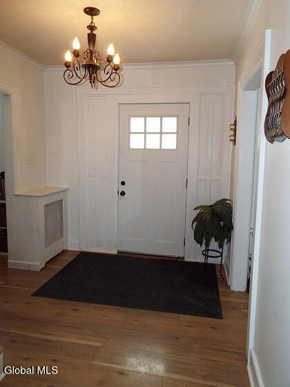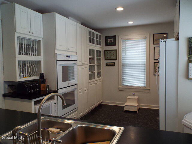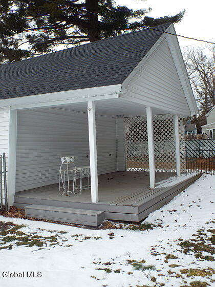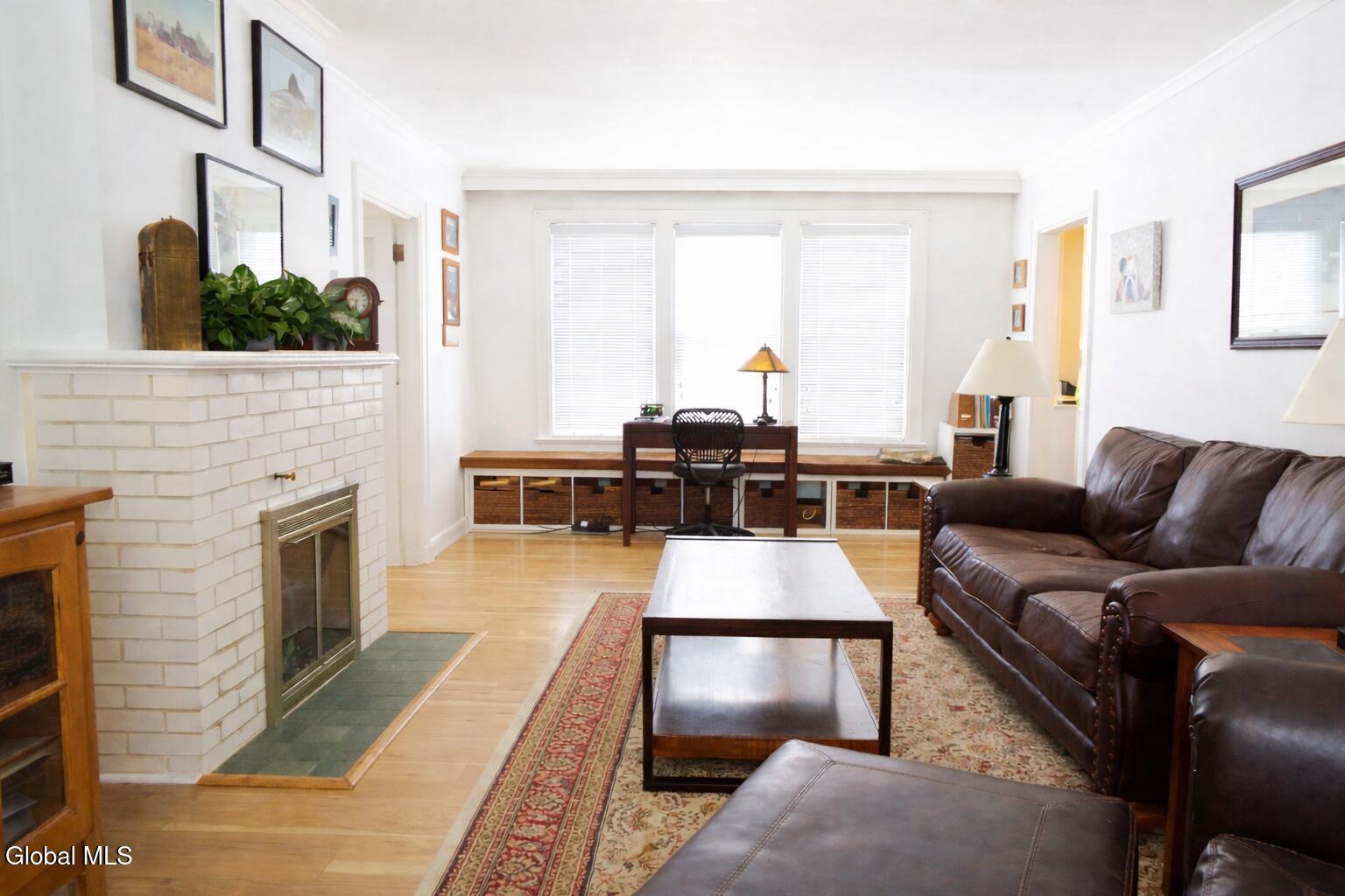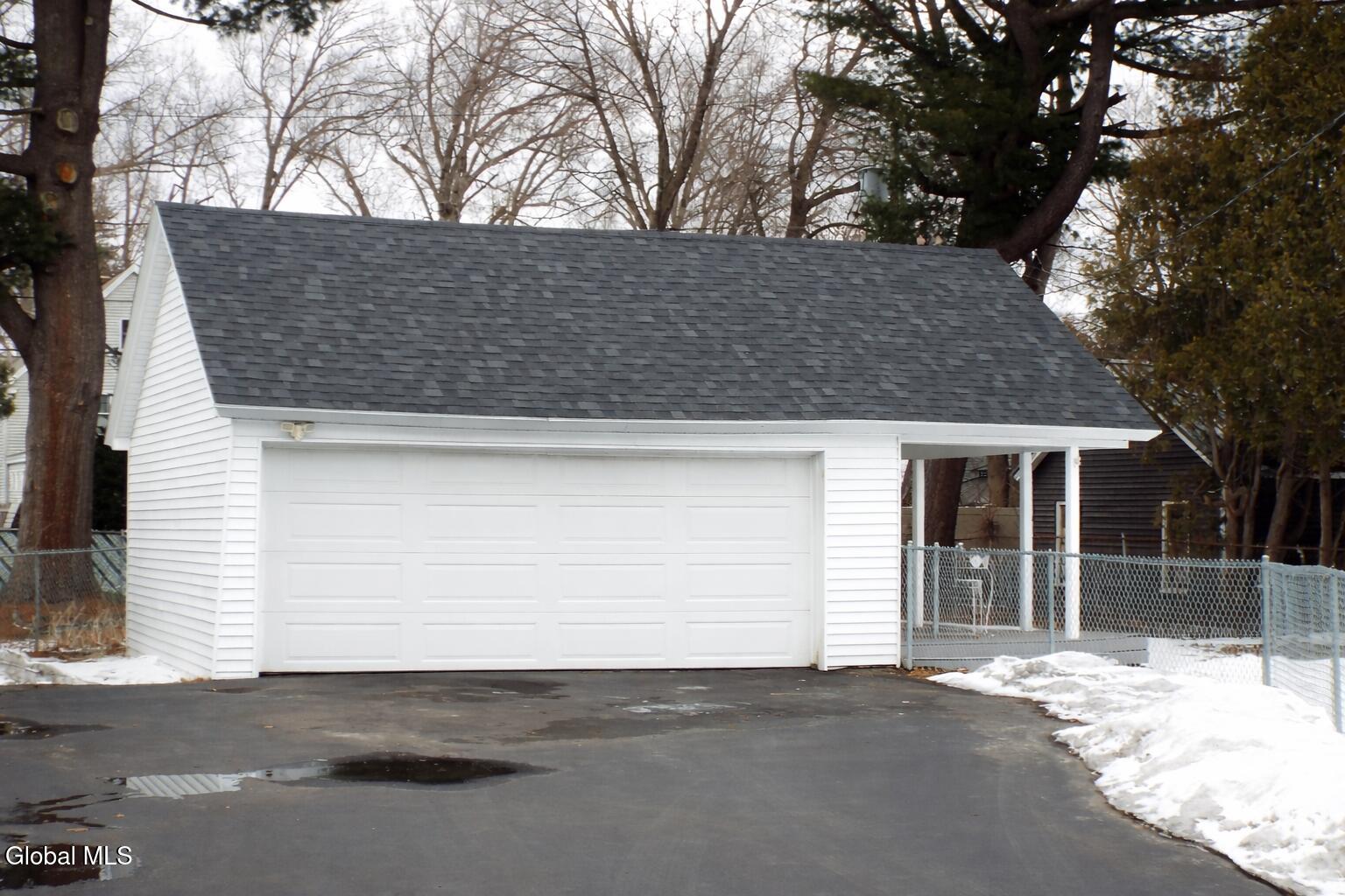 Center Hall Colonial featuring a beautiful foyer with an open staircase. The large living room is filled with natural sunlight and offers a charming wood-burning fireplace. A spacious family room/den includes a cozy gas fireplace, while the formal dining room is bright and inviting with plenty of windows. The remodeled kitchen boasts all-new appliances, including double ovens and a dishwasher. Newer laminate floors and thermal windows throughout provide style, durability, and energy efficiency. Upstairs you'll find generously sized bedrooms, including a newly painted third bedroom, abundant storage space, and a full bath. The walk-up attic is floored and features a cedar closet, offering excellent additional storage Outside, the property features a two-car detached garage with an attached patio and a fenced-in backyard, providing great space for parking, privacy, and outdoor entertaining.