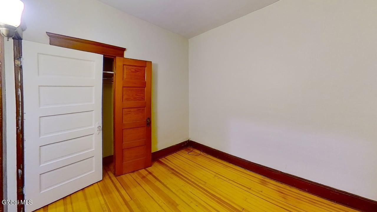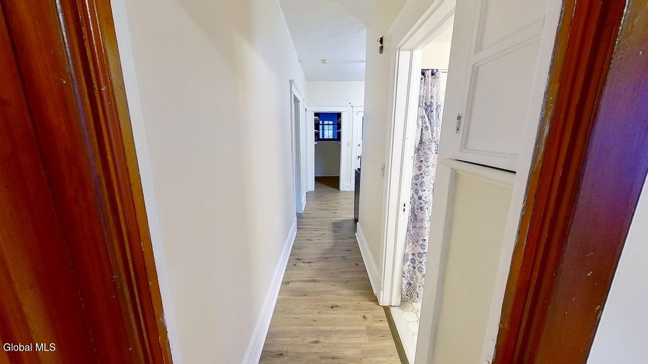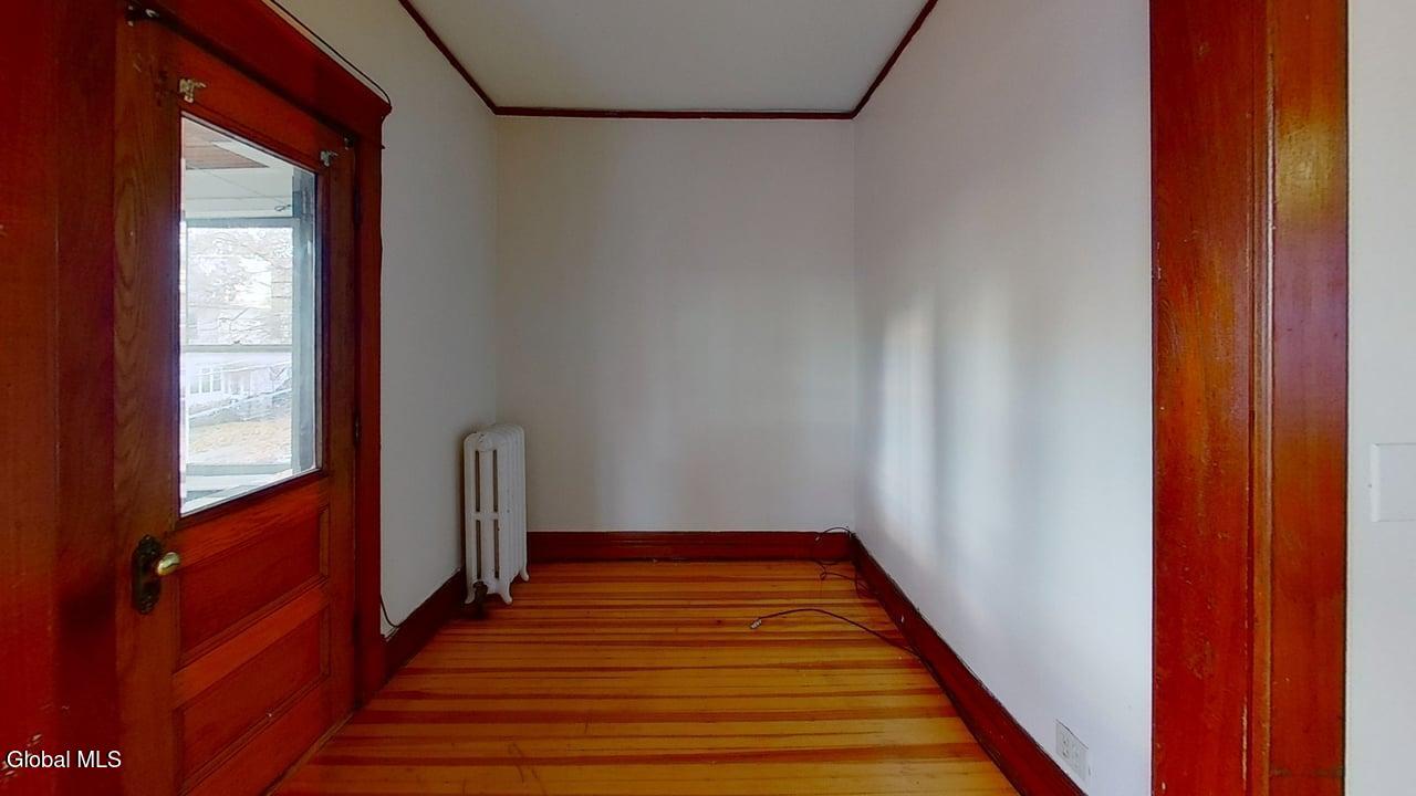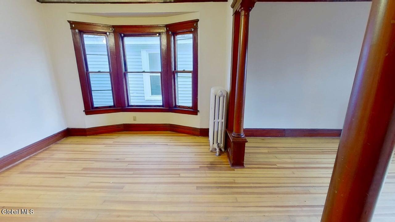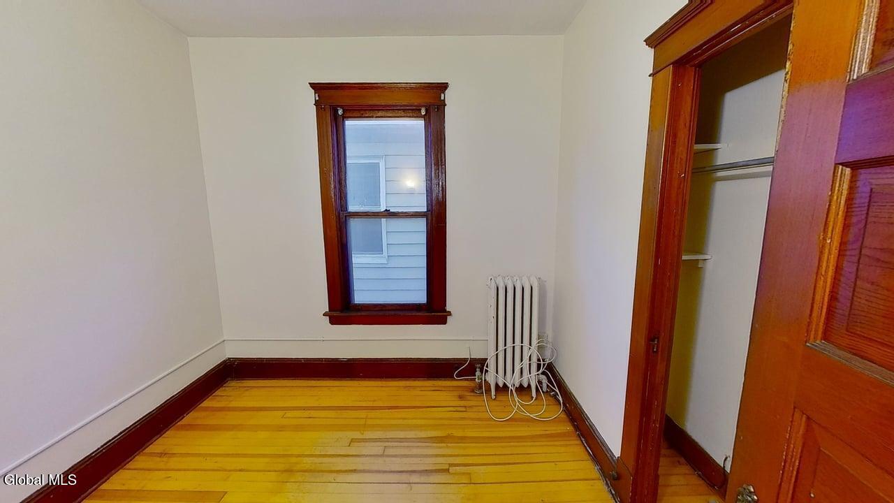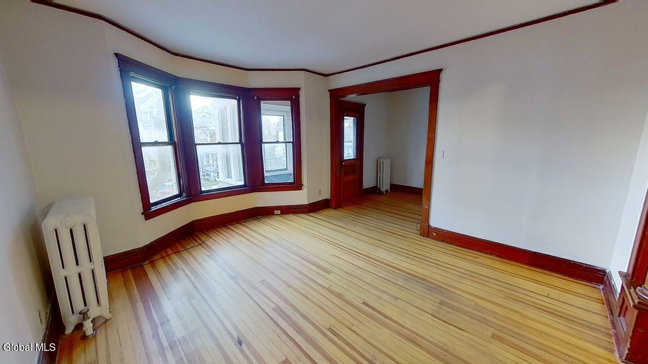AVAILABLE 4/15/2026 Spacious three bedroom flat located on the second floor. Large living room with alcove area and access to front enclosed porch, and separate dining room. Eat in Kitchen, newly renovated with brand new stainless steel appliances, pantry, and vinyl flooring. Three bedrooms, each with closets. Bathroom has full shower, tile flooring and linen cabinets. Refinished hardwood floors and natural wood trim throughout. Front and rear enclosed porches. Large yard in rear. Conveniently located with easy access to downtown, colleges, hospital, highways, local attractions and bus route. Good Condition