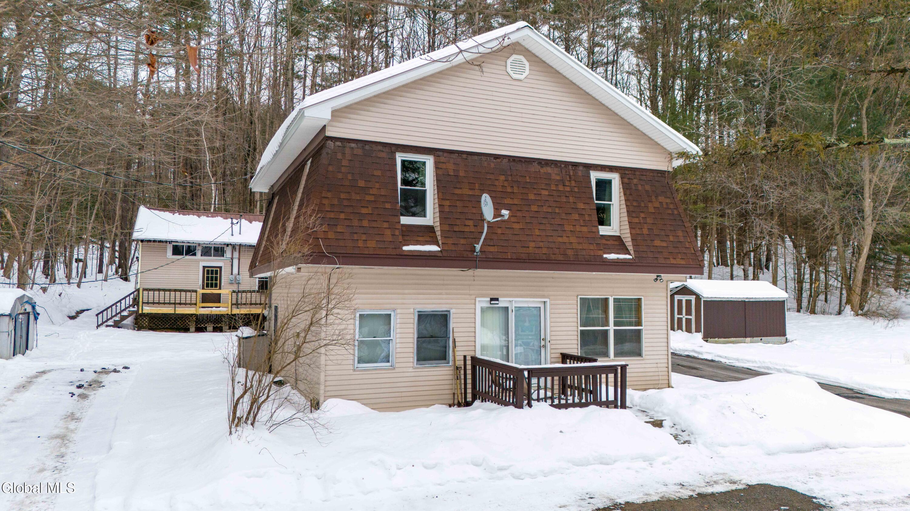 A rare and exciting opportunity in the Village of Northville-this versatile property offers two homes on one parcel plus a 10' lake permit on Great Sacandaga Lake, located just ¼ mile away on Skiff Road, complete with a dock for easy lake access and summer fun. The primary dwelling is a spacious two-story home offering approximately 1,248 sq ft of living space and a one-car garage. The main level includes a bedroom, full bath, and an open-concept kitchen, living, and dining area, along with an unfinished bonus room ready for your ideas. Upstairs, you'll find a large family room, another full bath, and a bonus room that could be converted into a kitchen. With both interior and exterior entrances and separate electric meters for each level, this home offers excellent flexibility for an in-law suite or rental apartment. The second dwelling is a two-family home, with upper and lower units, each approximately 812 sq ft. The lower unit features two bedrooms, a full bath, living room, kitchen, and a deck. The upper unit includes one bedroom, a full bath, living room, kitchen, deck and a dining room that could serve as a second bedroom with modifications. Both units are currently occupied by tenants in good standing and have separate electric meters, offering immediate income potential. With shared septic, ample off-street parking, and close proximity to lakes, shopping, dining, and outdoor recreation, this property delivers flexibility, lifestyle, and strong investment appeal all in one. Live, rent, or invest-opportunities like this don't come along often. Schedule your private showing today!