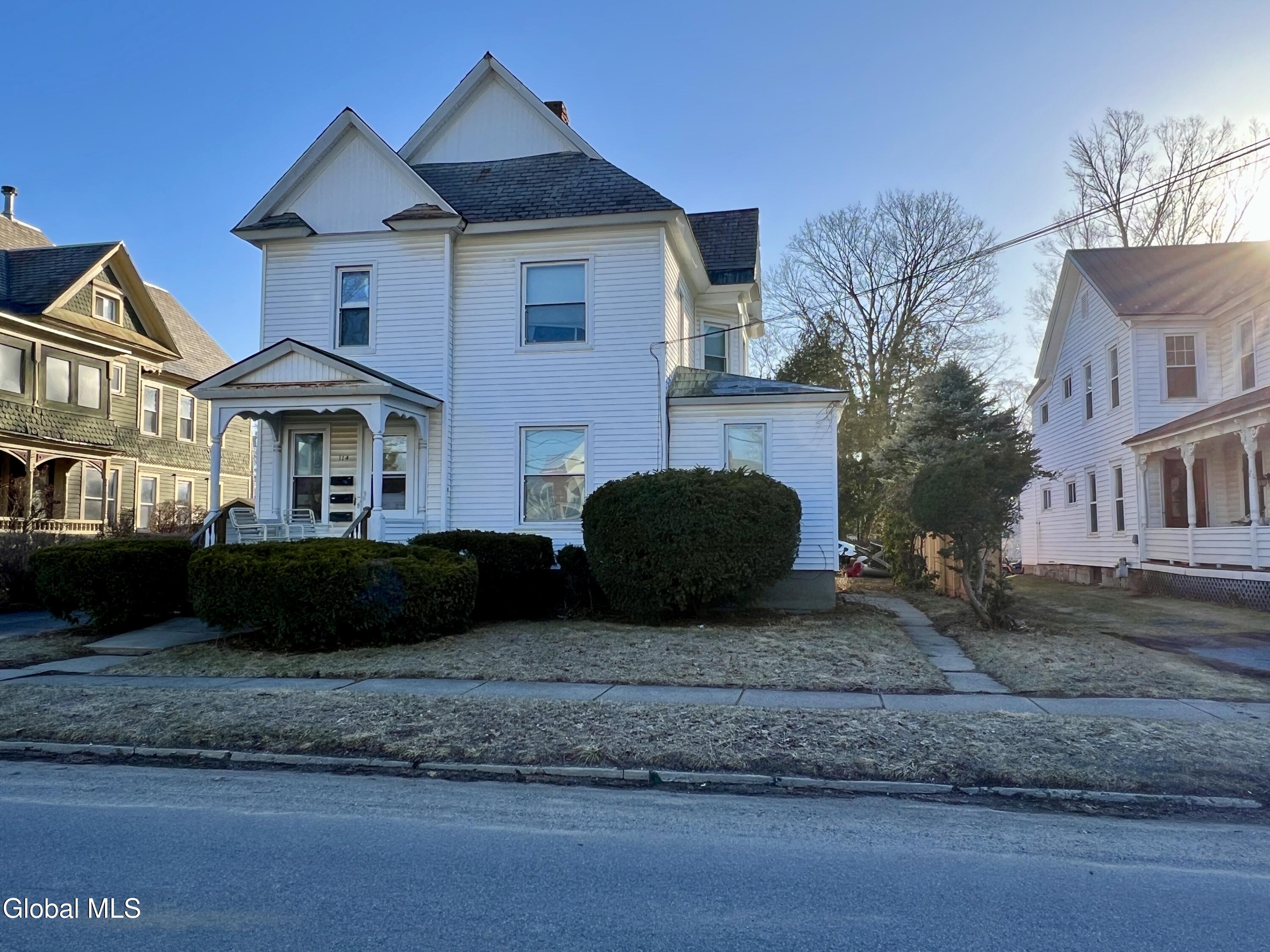 Excellent investment opportunity or ideal owner-occupied 3-unit rental property offering classic character and thoughtful updates throughout. The exterior features an original slate roof with copper trim, replacement windows, and low-maintenance vinyl siding. The spacious first-floor one-bedroom apartment showcases gleaming hardwood floors, original built-in cabinetry, a formal dining room, comfortable living room, and a large open kitchen with access to basement laundry. Enjoy additional living space with a generous side sun porch and enclosed rear porch area. The second-floor front one-bedroom apartment features brand-new carpeting in bedroom (tenant removed from LR), with original hardwood flooring in the living room ready to be refinished. A unique third-level area provides potential to be finished into an additional room or expanded living space. The renovated second-floor rear apartment includes new kitchen cabinetry, granite countertops, refinished hardwood floors, a washer/dryer hookup, updated bathroom, new laminate floors, and a bright sitting sun porch. The property has been well maintained and includes two brand-new water heaters installed in 2025, 3rd water heater approx 6 years old. A large, welcoming main foyer highlights stunning original woodwork, including detailed stairs, banister, and wall accents that reflect the home's timeless craftsmanship. Agent is owner.