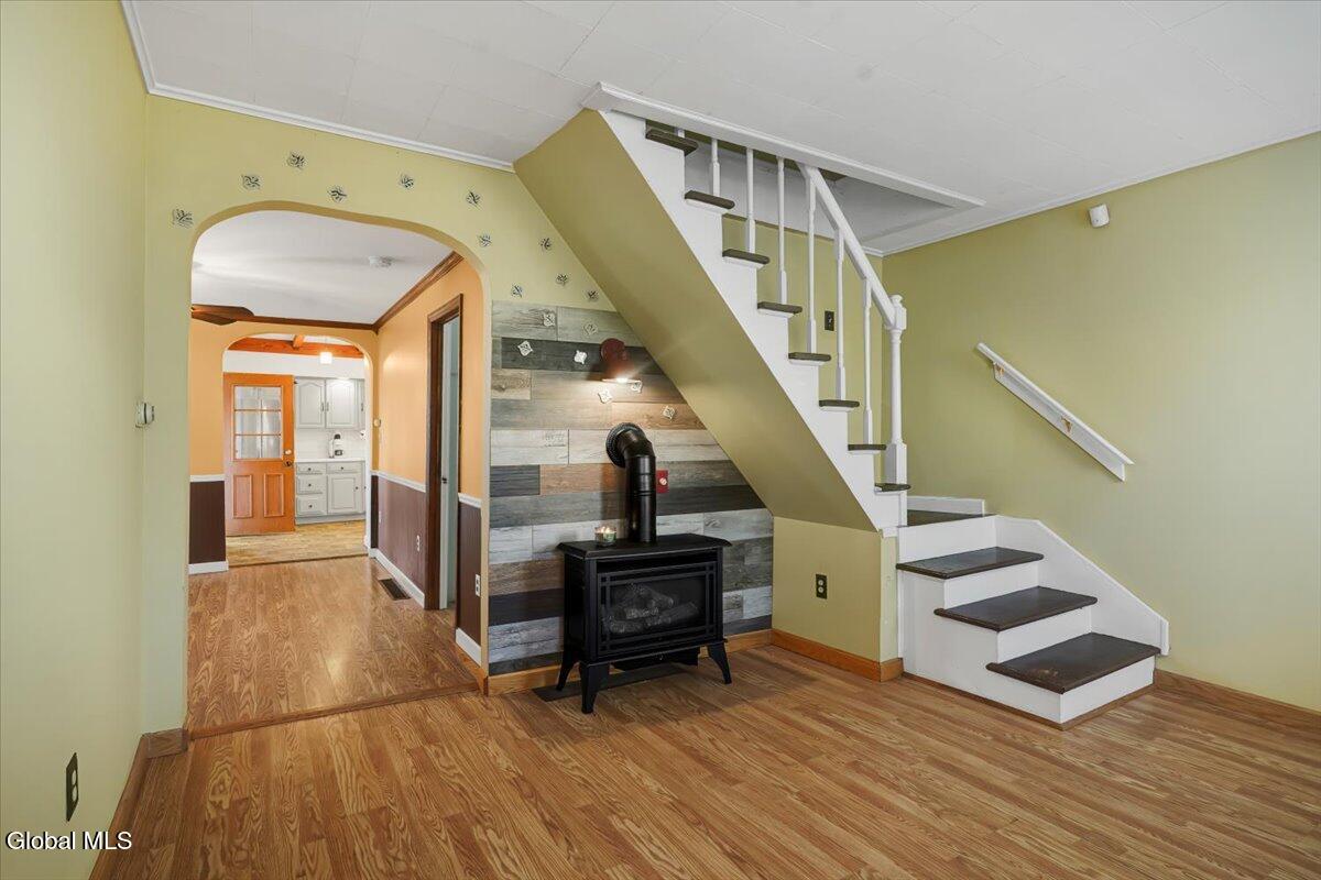 Welcome to this updated 3 bed/2 full bath home situated on a double lot. A paved driveway leads to the detached garage being used as a bonus space game room. Inside, you'll find a living room featuring a cozy fireplace, eat-in kitchen and ceramic tile bath. The primary bedroom has a generous sized walk-in closet. A convenient main level laundry room and one bedroom adds everyday practicality. Step outside to enjoy exceptional and private outdoor living with fenced in front and back yards, pergola, deck, storage shed, and an above-ground pool, perfect for relaxing or entertaining. Located near highways and shopping, this home is a great combination of space, updates, and amenities - this property is ready to welcome you home.