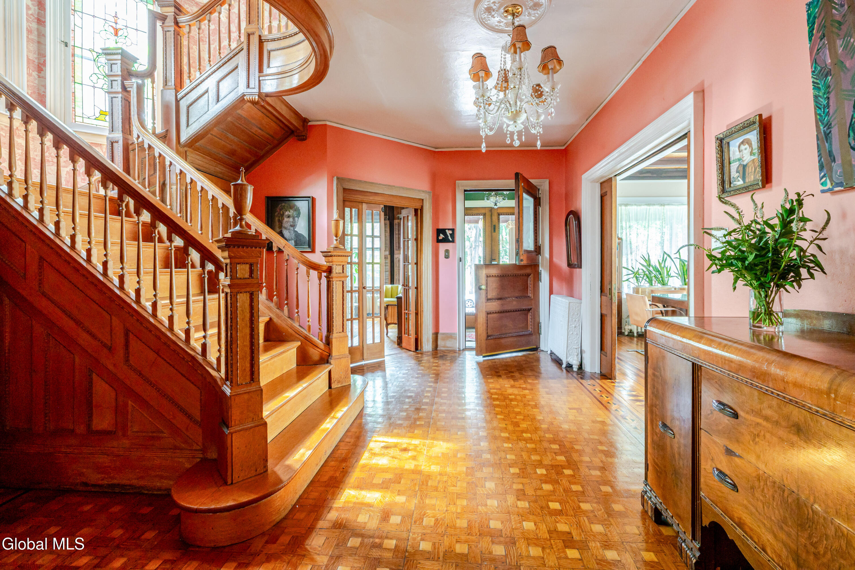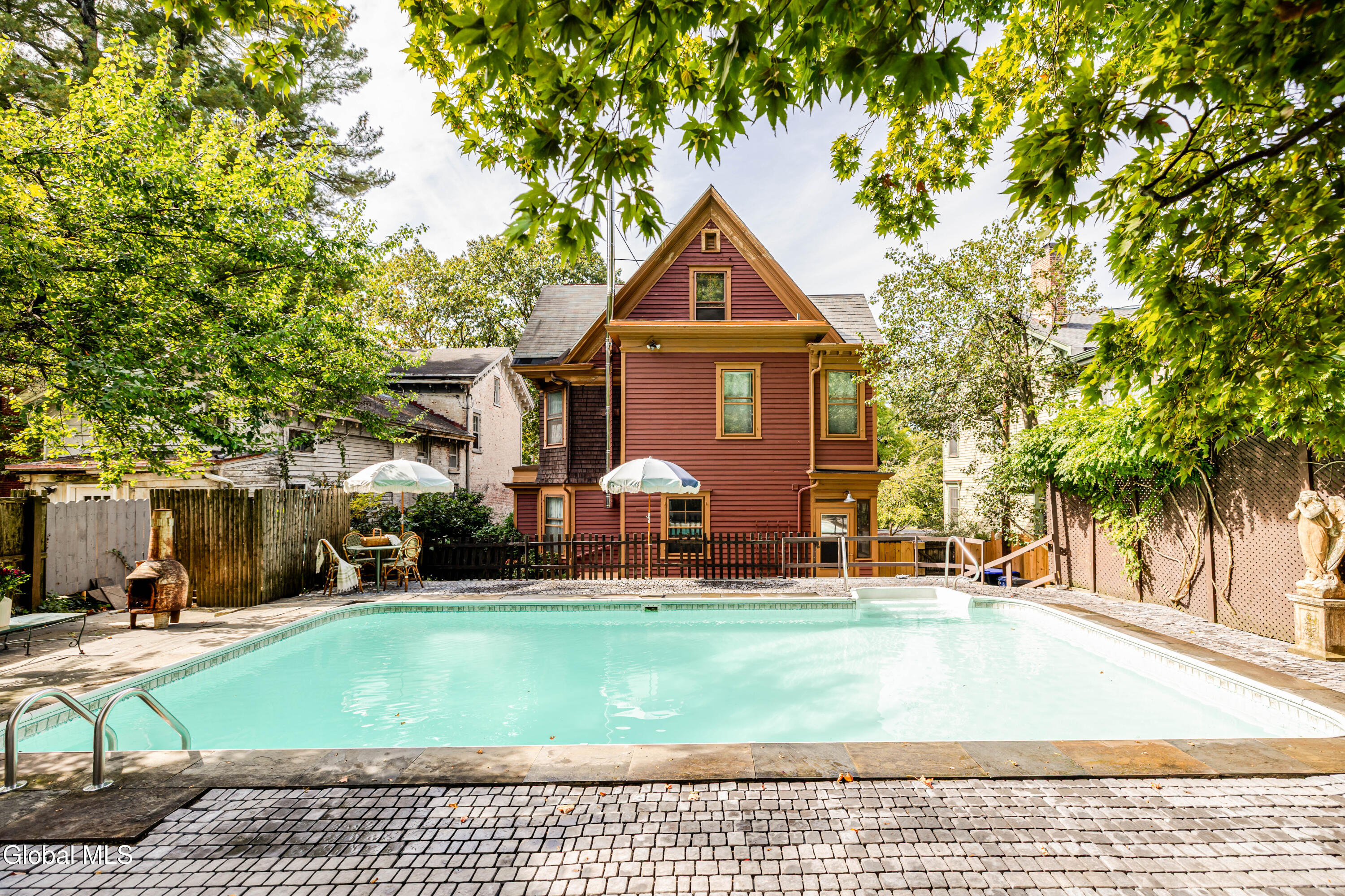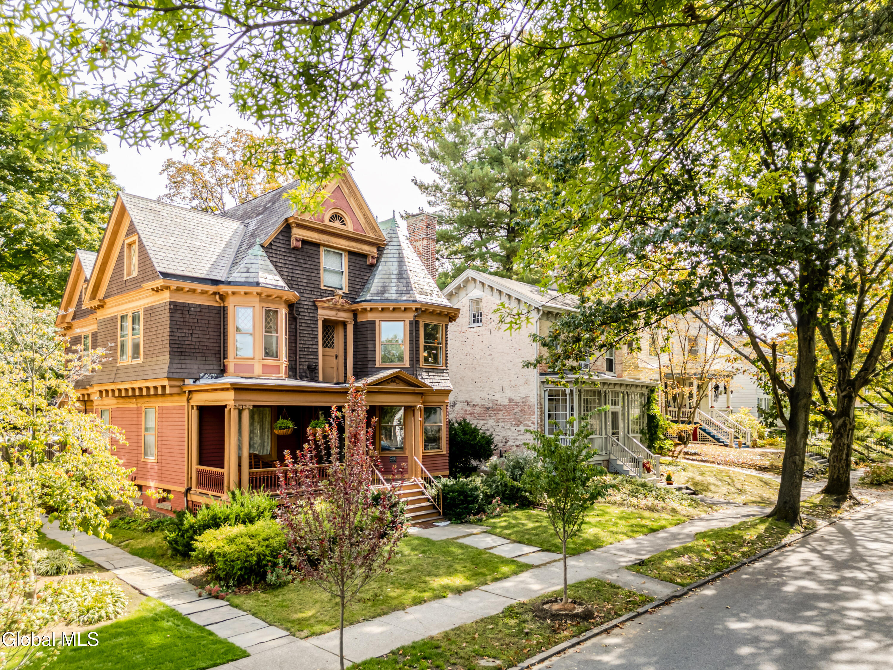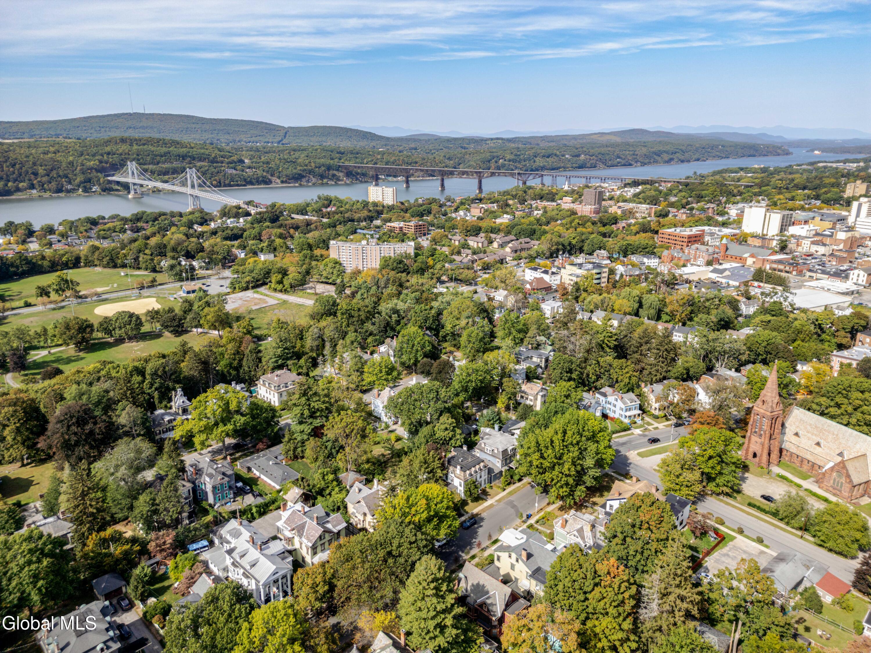 Welcome to Lloyd Manor, a distinguished 1899 residence in the heart of the Academy Street Historic District, designed for banker George Sherman by noted architect-in-residence Percival M. Lloyd. Combining elements of Greek Revival, Queen Anne, and Victorian design, this landmark home reflects the artistic ambition of Poughkeepsie's Gilded Age, and has been lovingly preserved and updated for modern living. Inside, the gracious interior and layout reflects the architectural elegance of a bygone era. Ornamental egg-and-dart moldings, a bifurcated staircase with a vaulted plaster mezzanine, stained glass windows, and ornamental fireplaces speak to the home's craftsmanship and history. The main level includes a parlor, study, and dining room with original tiger oak and parquet floors, and a cheerful kitchen with an industrial Garland stove. Upstairs, four bedrooms and a full bath offer comfort, while a partially finished third floor provides flexible space for a studio, home office, or guest suite. Recent updates have respected the home's heritage while ensuring everyday ease: a new furnace, updated plumbing, refinished porch floors, restored slate roof, and a renovated marble bathroom with a custom viewing window that preserves rare 19th-century wallpaper. Outside, an in-ground pool, deck, and private gardens extend the living space, creating a retreat for entertaining or quiet relaxation. The one-car garage and freshly painted cedar-shake exterior complete the picture of thoughtful stewardship and care. Set along one of Poughkeepsie's most storied avenues, X offers a vibrant Hudson Valley lifestyle with historic charm. Residents enjoy strolls through Calvert Vaux's Springside Park, scenic bike rides across the Walkway Over the Hudson, and tennis at the Poughkeepsie Tennis Club. Minutes from Amtrak and the Hudson River, this storied residence offers heritage, leisure, and timeless Hudson Valley appeal, all just 90 minutes from Manhattan.