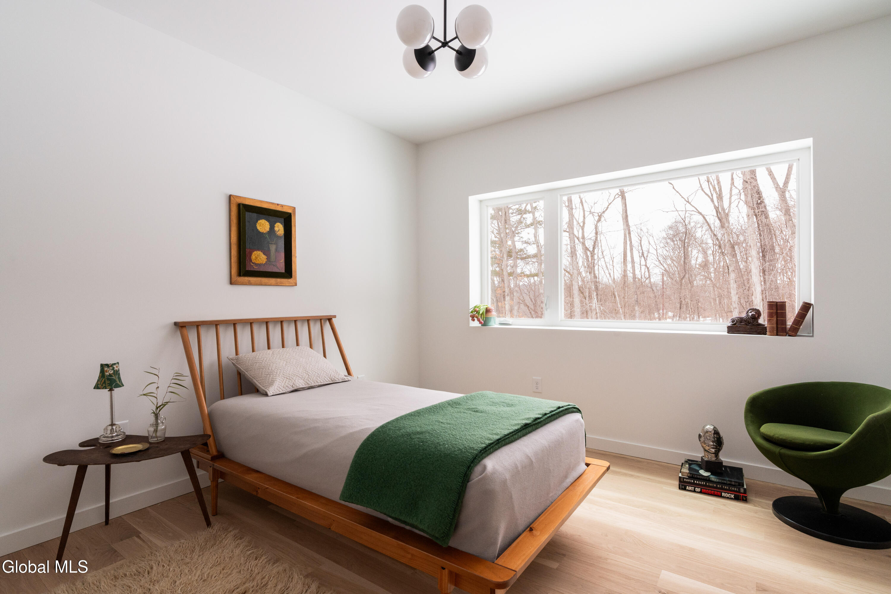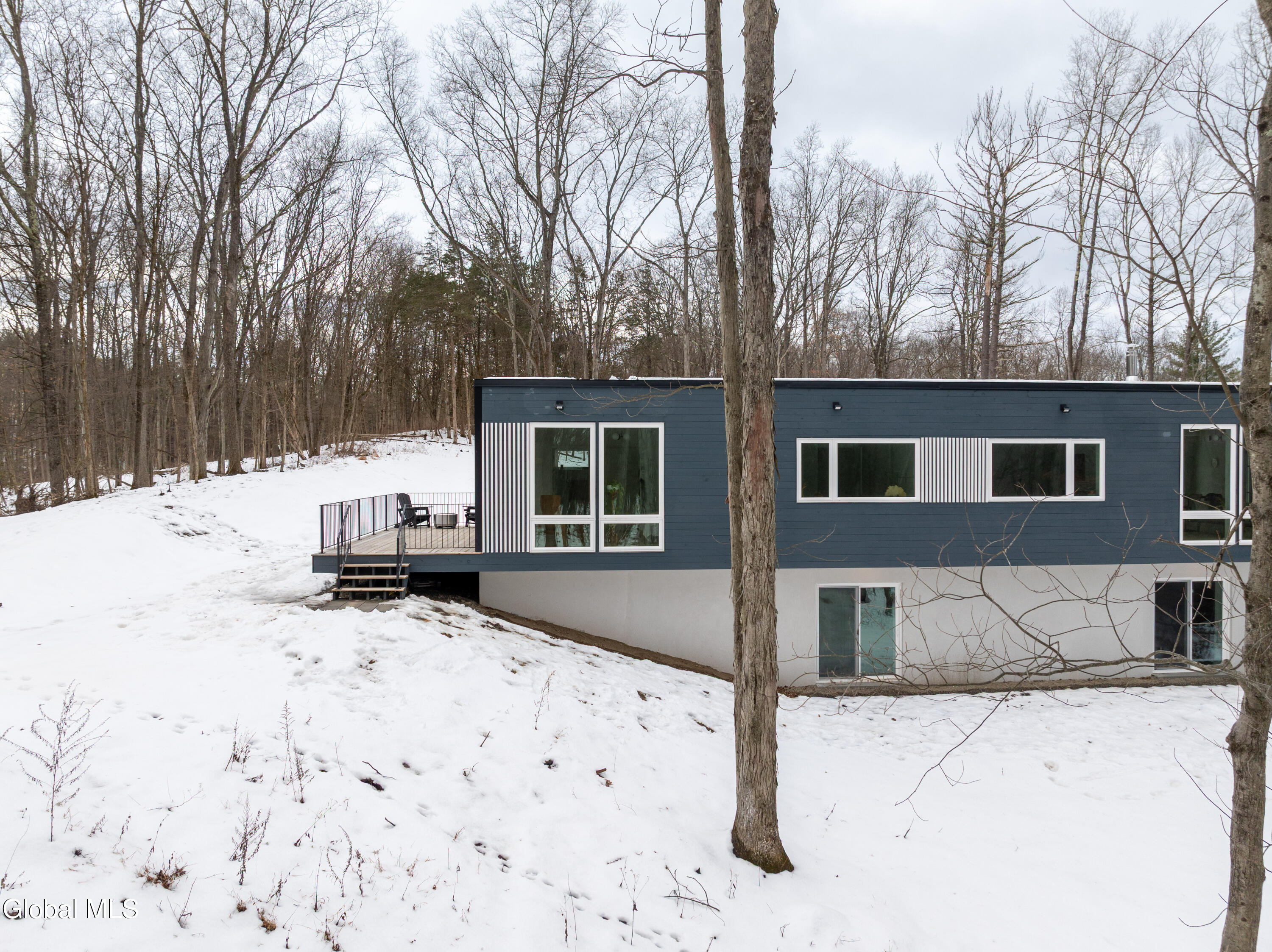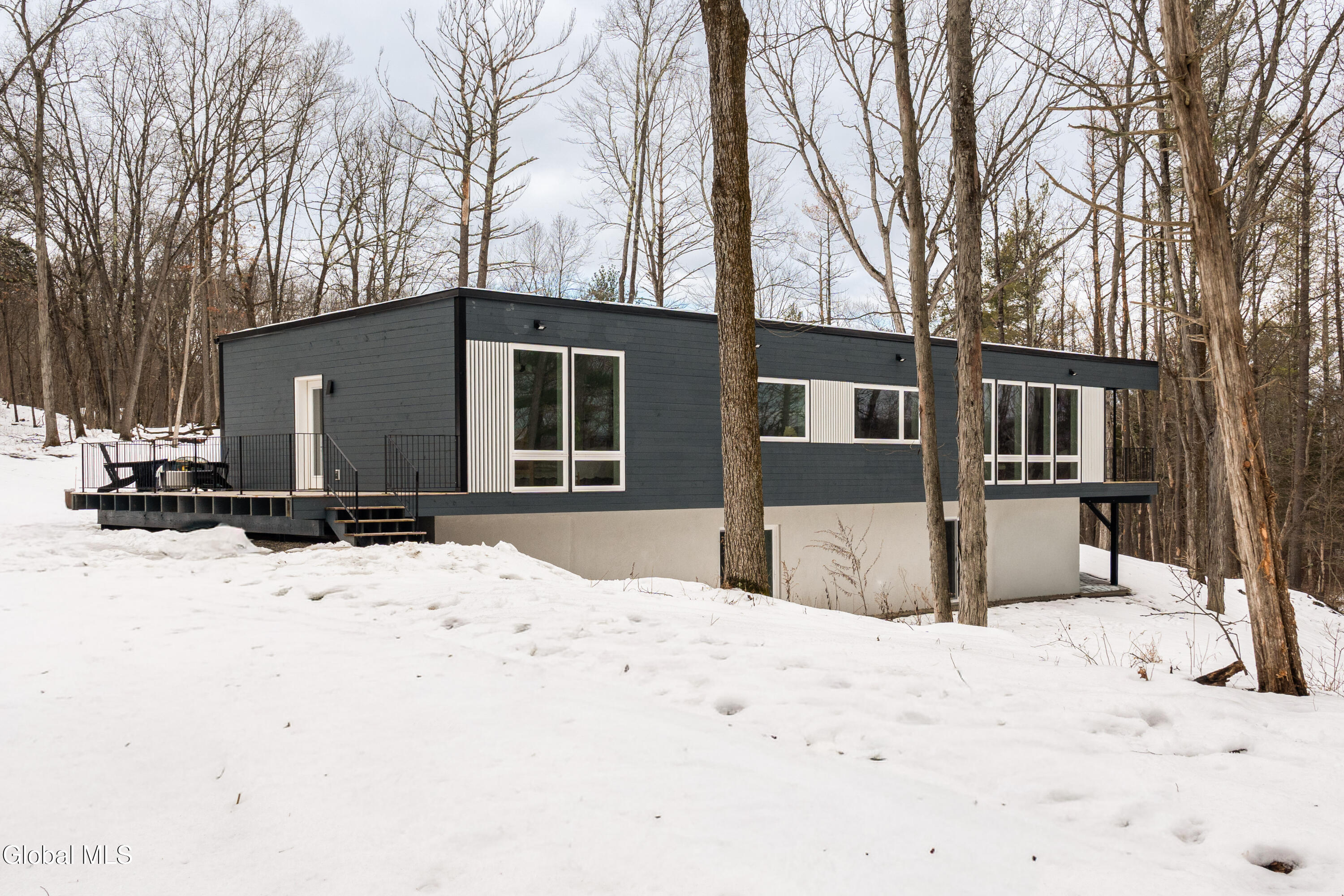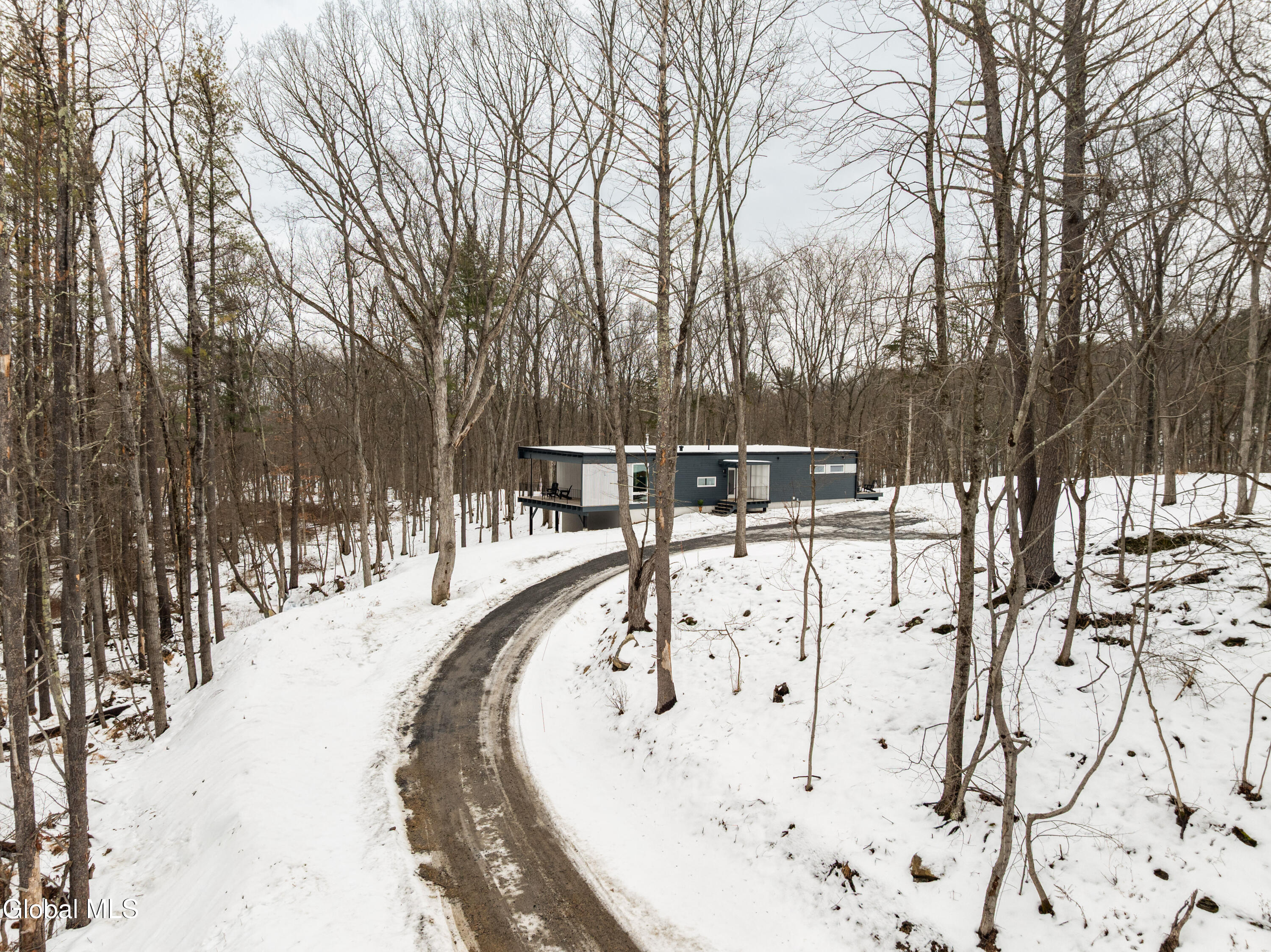 Welcome to Sylvan Wald House, a newly built midcentury-inspired home at the end of a long private driveway on 17 wooded acres in the northern Catskills. Architecture by Garrison Architects, the studio behind the celebrated Piaule resort, this energy-efficient residence features white oak millwork and oversized windows framing sweeping Catskill views. The kitchen includes designer Bertazzoni appliances, soapstone counters and a waterfall island, and the living area is anchored by a Norwegian wood-burning stove. The first-floor primary suite has a spa bath and a private cedar deck. Two additional bedrooms and a finished lower level with wet bar and full bathroom offer flexible space. Stained pine siding completes the home's quiet presence, appearing almost to float above the landscape. Minutes to Catskill's village amenities, 15 minutes to Hudson.