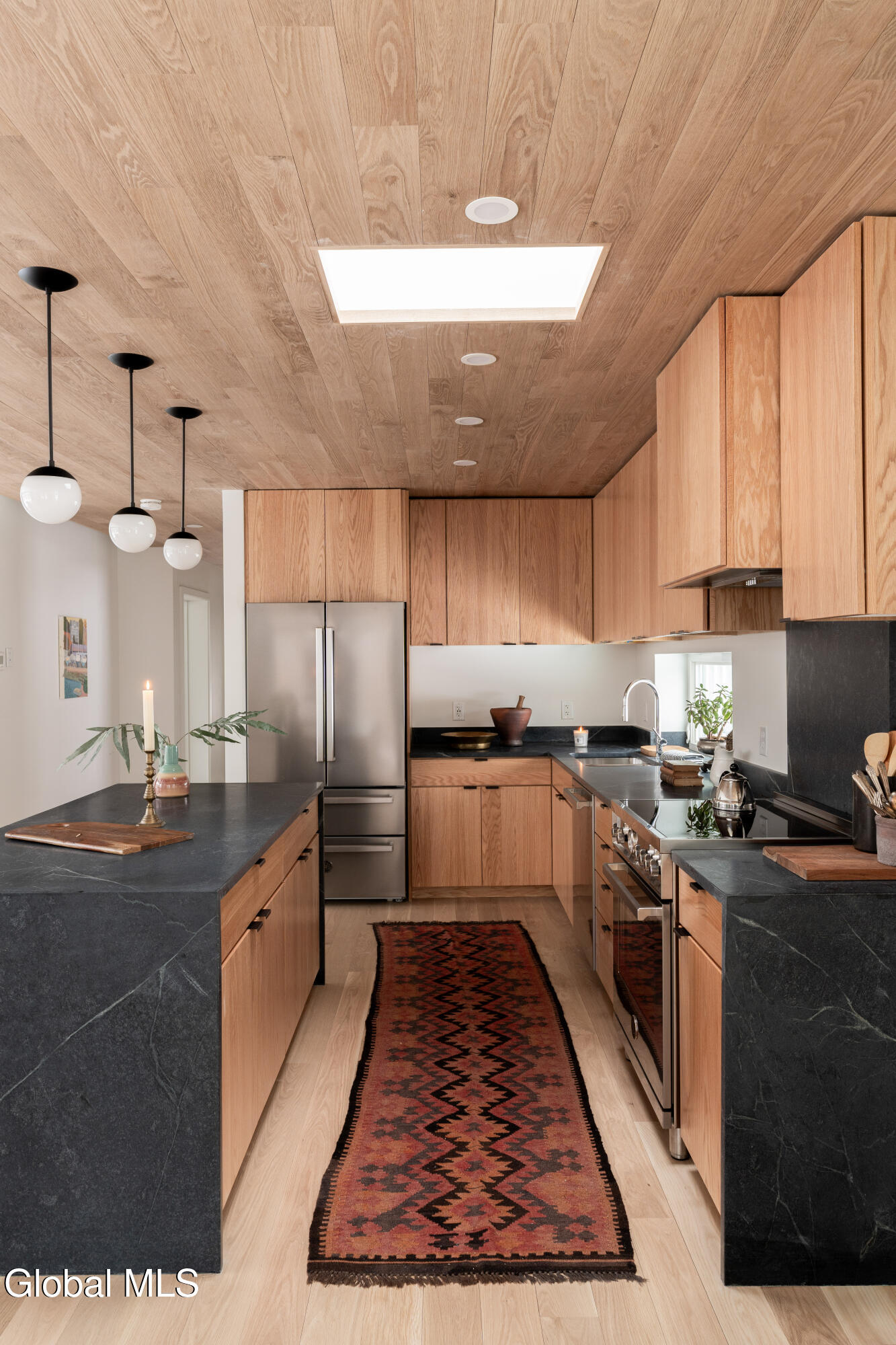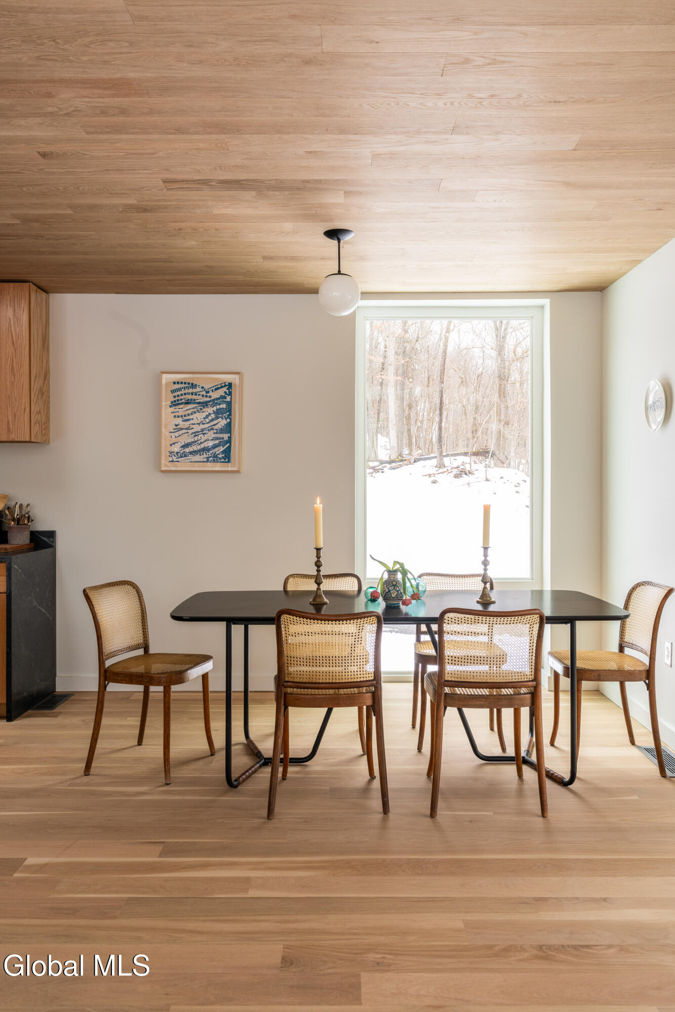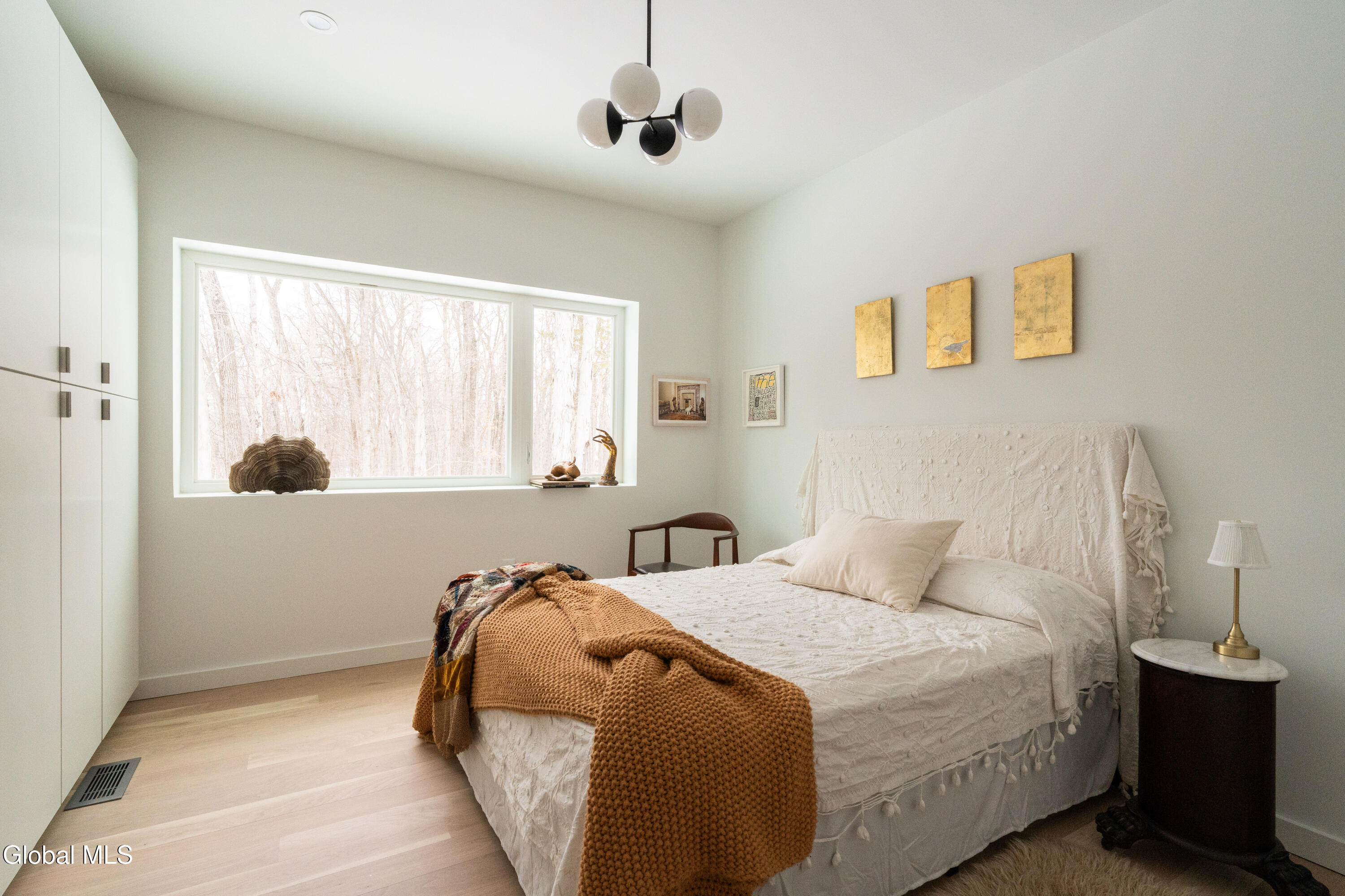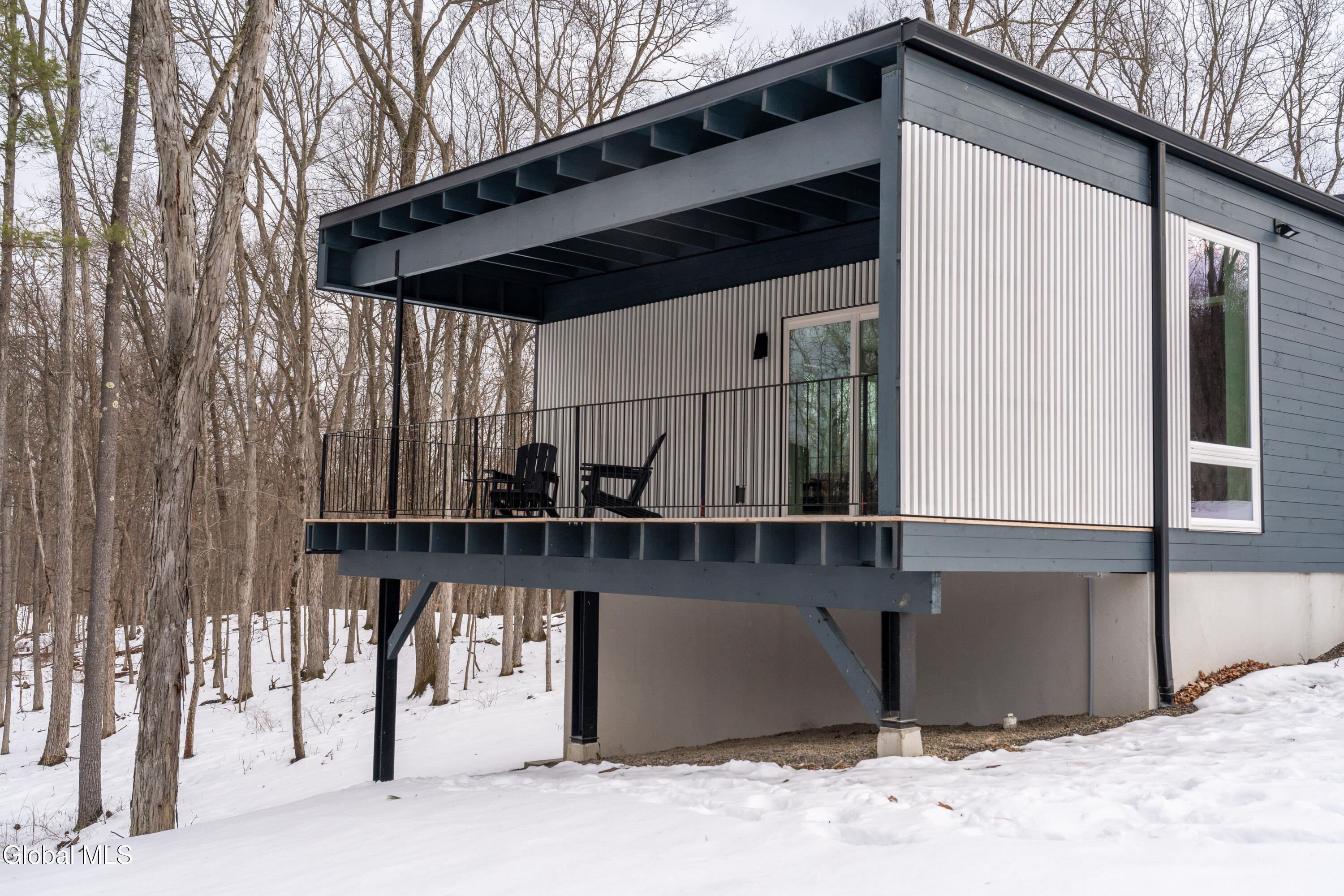 Welcome to Sylvan Wald House, a newly built midcentury-inspired home at the end of a long private driveway on 17 wooded acres in the northern Catskills. Architecture by Garrison Architects, the studio behind the celebrated Piaule resort, this energy-efficient residence features white oak millwork and oversized windows framing sweeping Catskill views. The kitchen includes designer Bertazzoni appliances, soapstone counters and a waterfall island, and the living area is anchored by a Norwegian wood-burning stove. The first-floor primary suite has a spa bath and a private cedar deck. Two additional bedrooms and a finished lower level with wet bar and full bathroom offer flexible space. Stained pine siding completes the home's quiet presence, appearing almost to float above the landscape. Minutes to Catskill's village amenities, 15 minutes to Hudson.