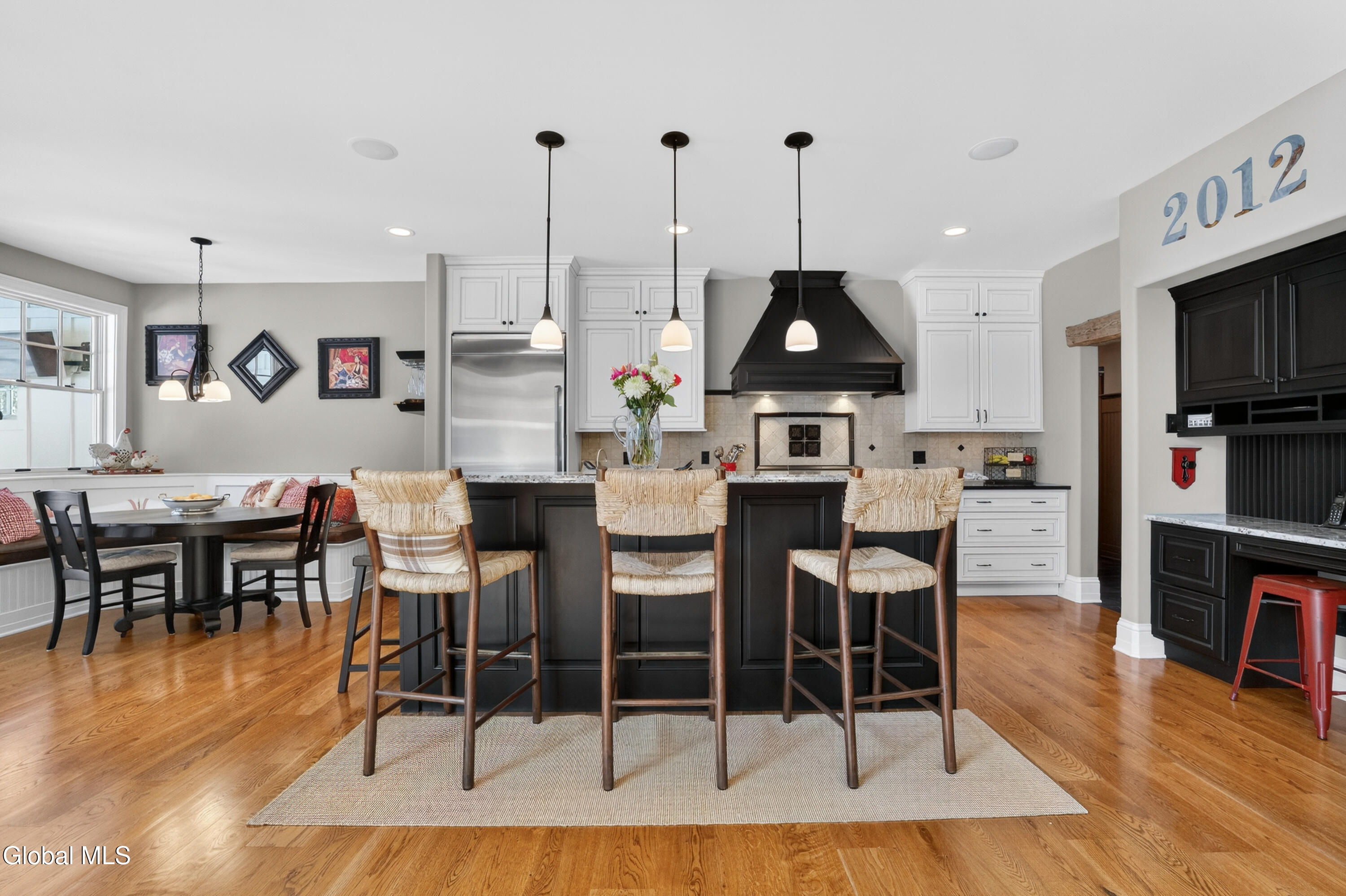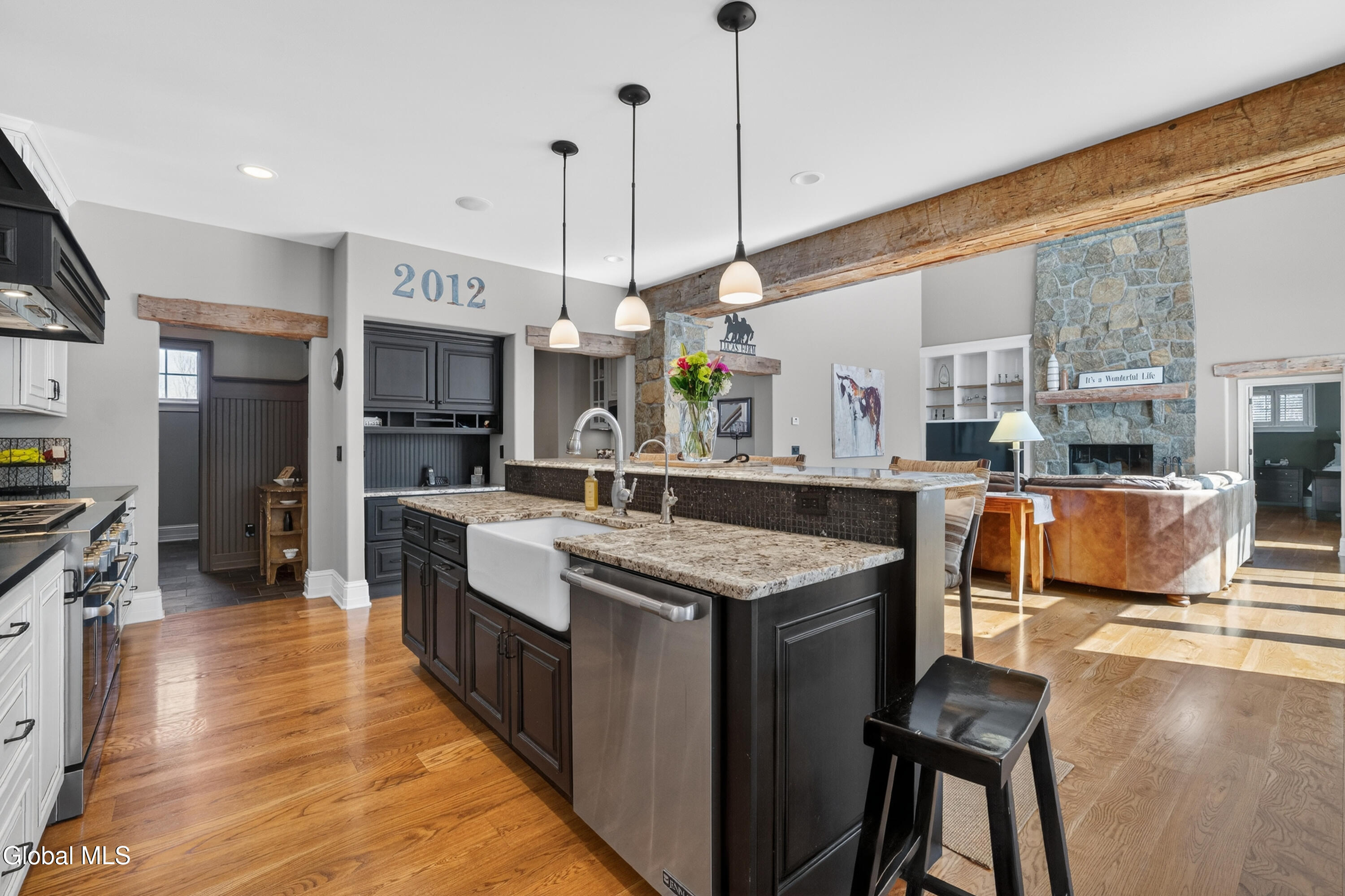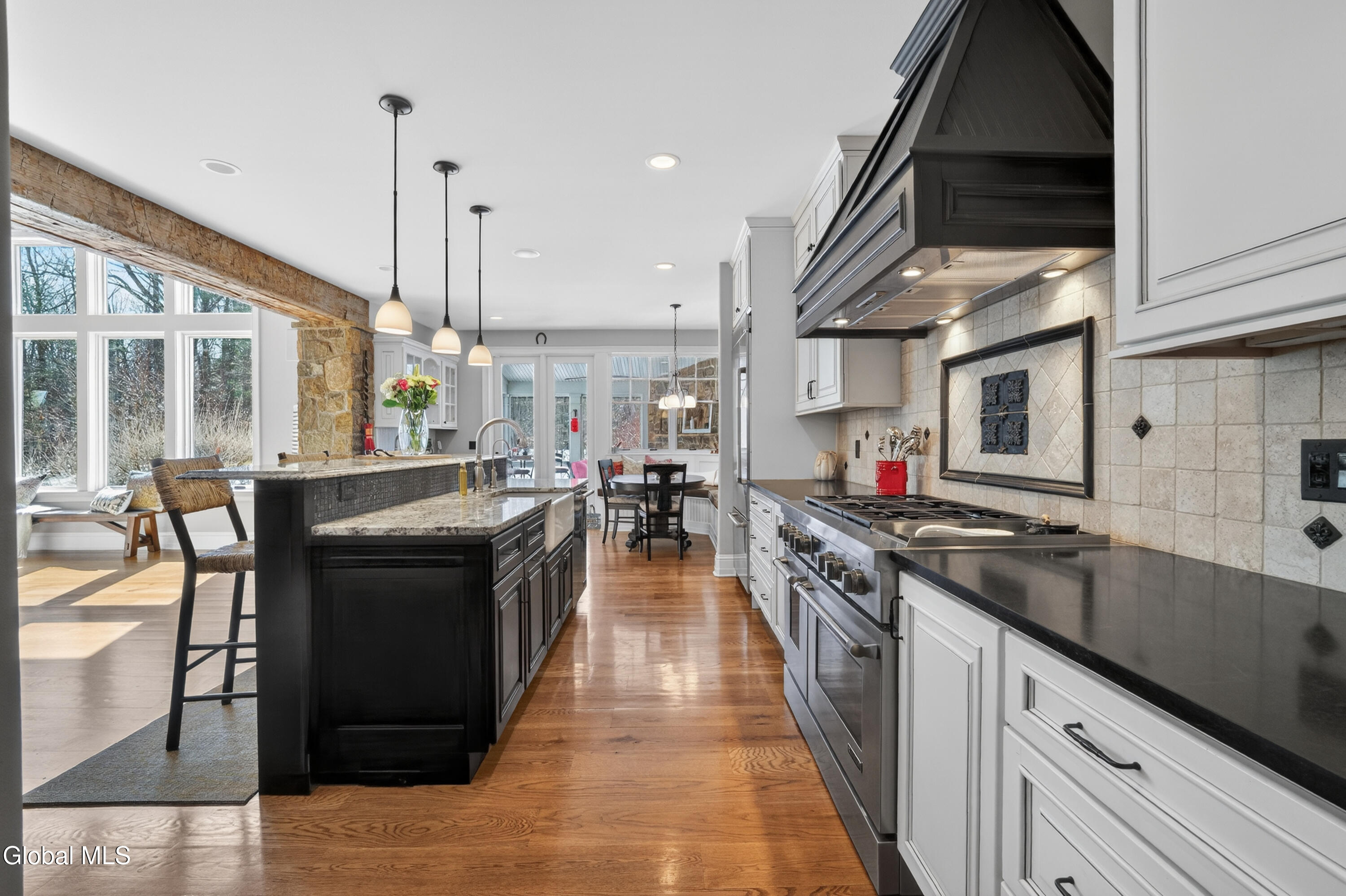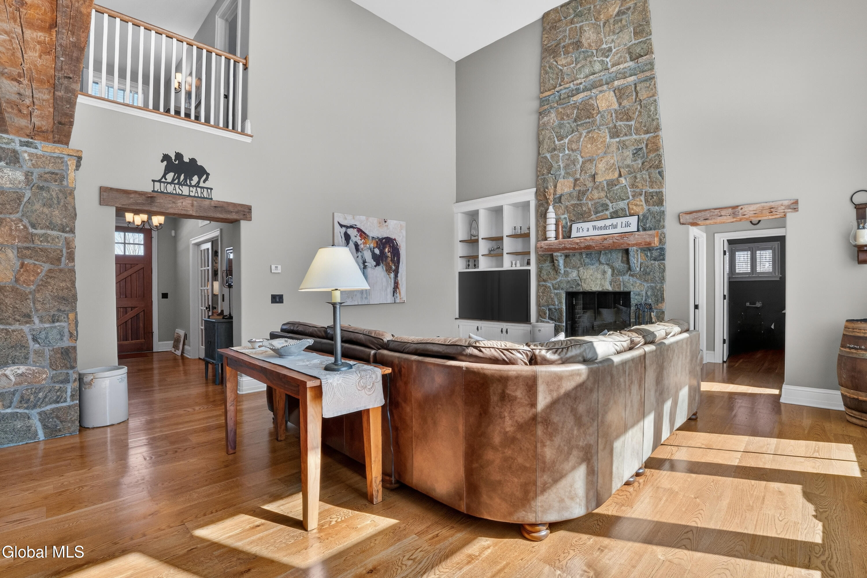 Welcome to 13 Saratoga Farm Road, an exceptional custom John Witt residence set on nearly 6 private acres in one of Saratoga County's most unique luxury communities. Located just minutes from downtown Saratoga Springs, this property offers a rare combination of refined craftsmanship, privacy, and an equestrian-friendly lifestyle. Built in 2012, this thoughtfully designed home offers over 3,100 above ground sq ft with 3 bedrooms, 3 full baths, and 2 half baths, centered around a stunning great room with 24-foot cathedral ceilings and a dramatic floor-to-ceiling stone fireplace. Oversized windows fill the space with natural light while knotty white oak floors and reclaimed wood beams highlight the exceptional quality and character throughout. The chef's kitchen features JennAir appliances, soapstone and granite countertops, a large center island, custom floor-to-ceiling cabinetry, and a built-in breakfast nook, flowing seamlessly into the main living area; ideal for both everyday living and entertaining. A private primary suite provides a peaceful retreat with a spa-inspired bath featuring a deep soaking whirlpool tub with air-bubble spa system, honed granite and polished marble finishes, and premium Brizo fixtures. Additional highlights include a home office with custom built-ins, Hubbardton Forge lighting, M-Tech hardware, and a finished lower level offering flexible recreation space. The outdoor living is just as impressive with a screened porch featuring Vermont slate flooring and a cozy propane fireplace, perfect for relaxing while overlooking the private wooded setting. The home also includes a whole-house Generac generator, whole-home security system, and a well system with filtration and softener. Located in the sought-after Saratoga Farm community, known for its spacious homesites and private horse trails, this property offers a truly special opportunity. A rare offering combining craftsmanship, privacy, and lifestyle in one remarkable home.