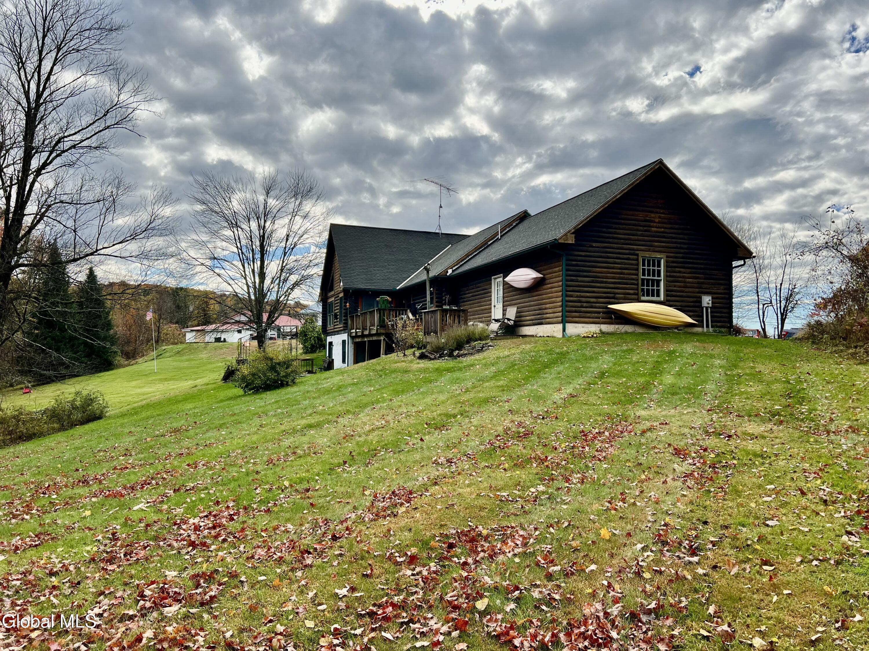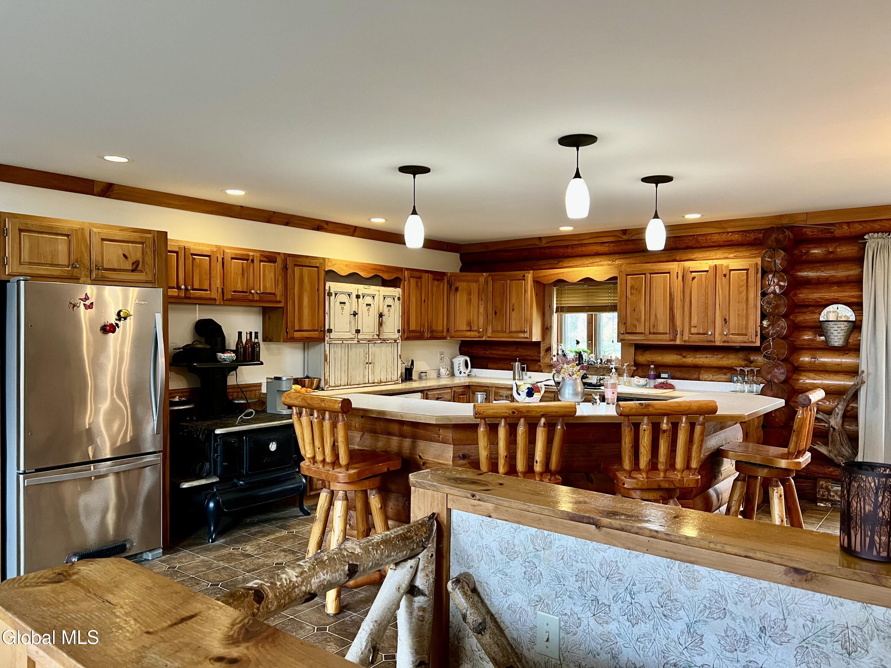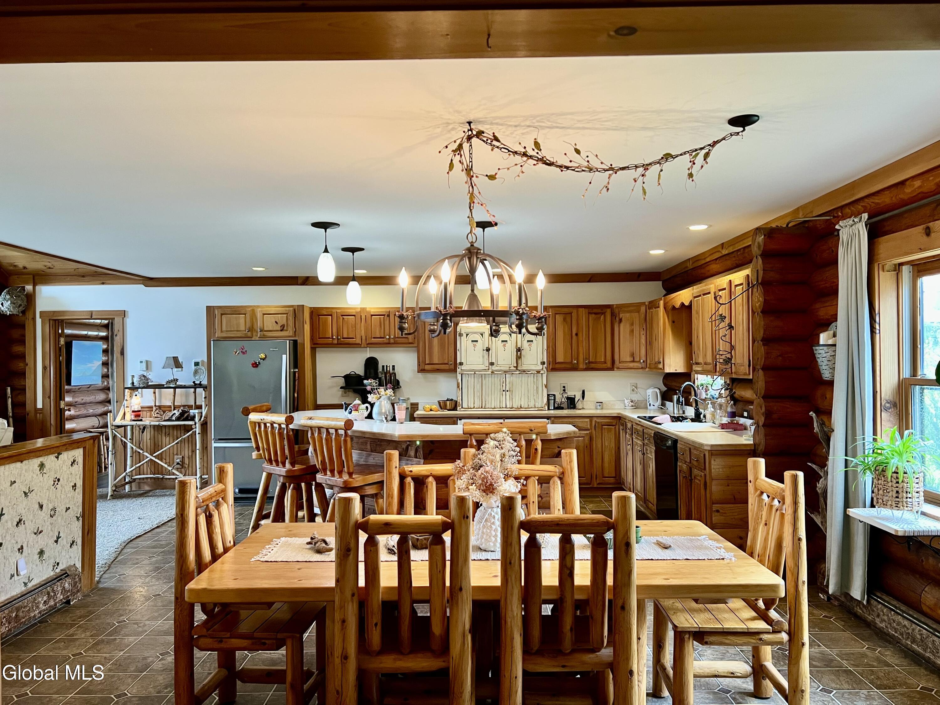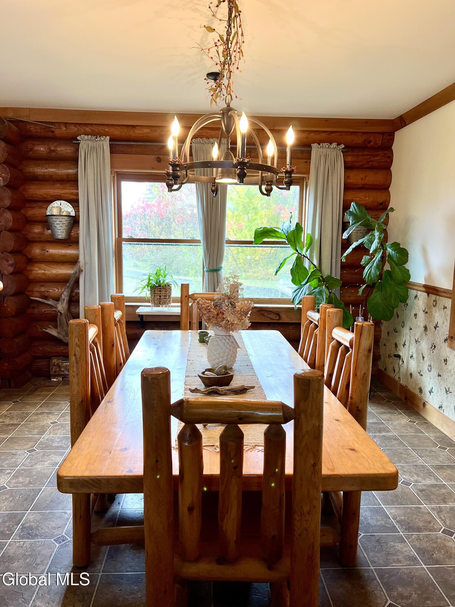 This 3 bedroom, 2 bath log home was built by a contractor for his family back in 2000. A lot of thought and care went into building it. Lovely perennial gardens. The main part of the home is open concept with Kitchen, Dining and Living Room offering great space for gathering. Log dining room set and 4 log stools, at eat at counter, are staying with the house. Cathedral ceiling and beautiful gas fireplace in the living room, with windows on both sides. French Door leading out to the upper decks. Master Bedroom with sitting area, walk-in closet and updated bath w/ granite counter and walk-in tile shower, is on the opposite end of the house from the other 2 bedrooms, which have a bath next to them. Laundry area is on the main level. Full Basement with huge potential for more living space. There is already a family room in the basement. This family was big into archery, and there is a space in the basement for practicing, and the seller will leave the set up if someone is interested in it. Lots of extra space for a workshop. Attached garage offers lots of space for a workshop, and/or cars. Paved Driveway makes life much easier. Surveyed lot is .64 acres. Other items included in the sale are the old cookstove in the kitchen (currently not hooked up to a chimney, but it is more than decorative, as it makes a great place to put hot dishes for serving. A log stand in the living room and the log rocking chair in the master bedroom are also included in the sale. Updated Propane Heating System installed 1/11/2017