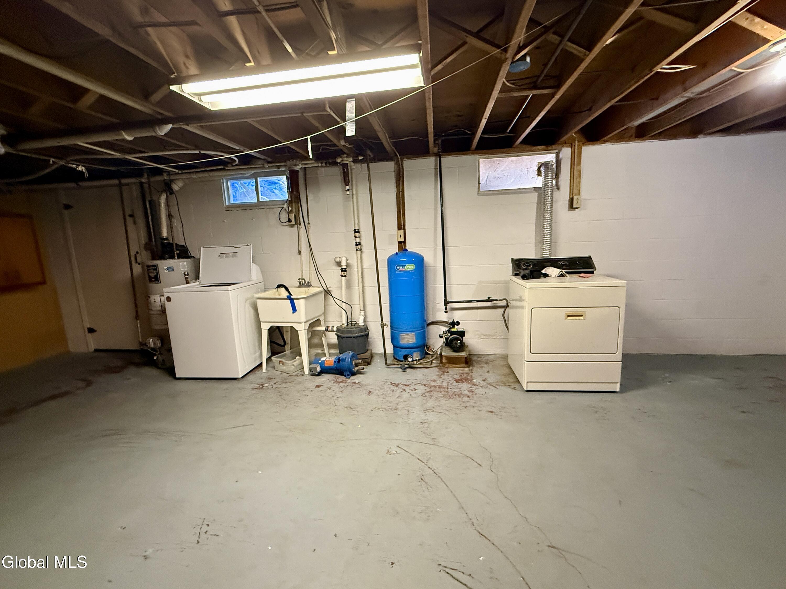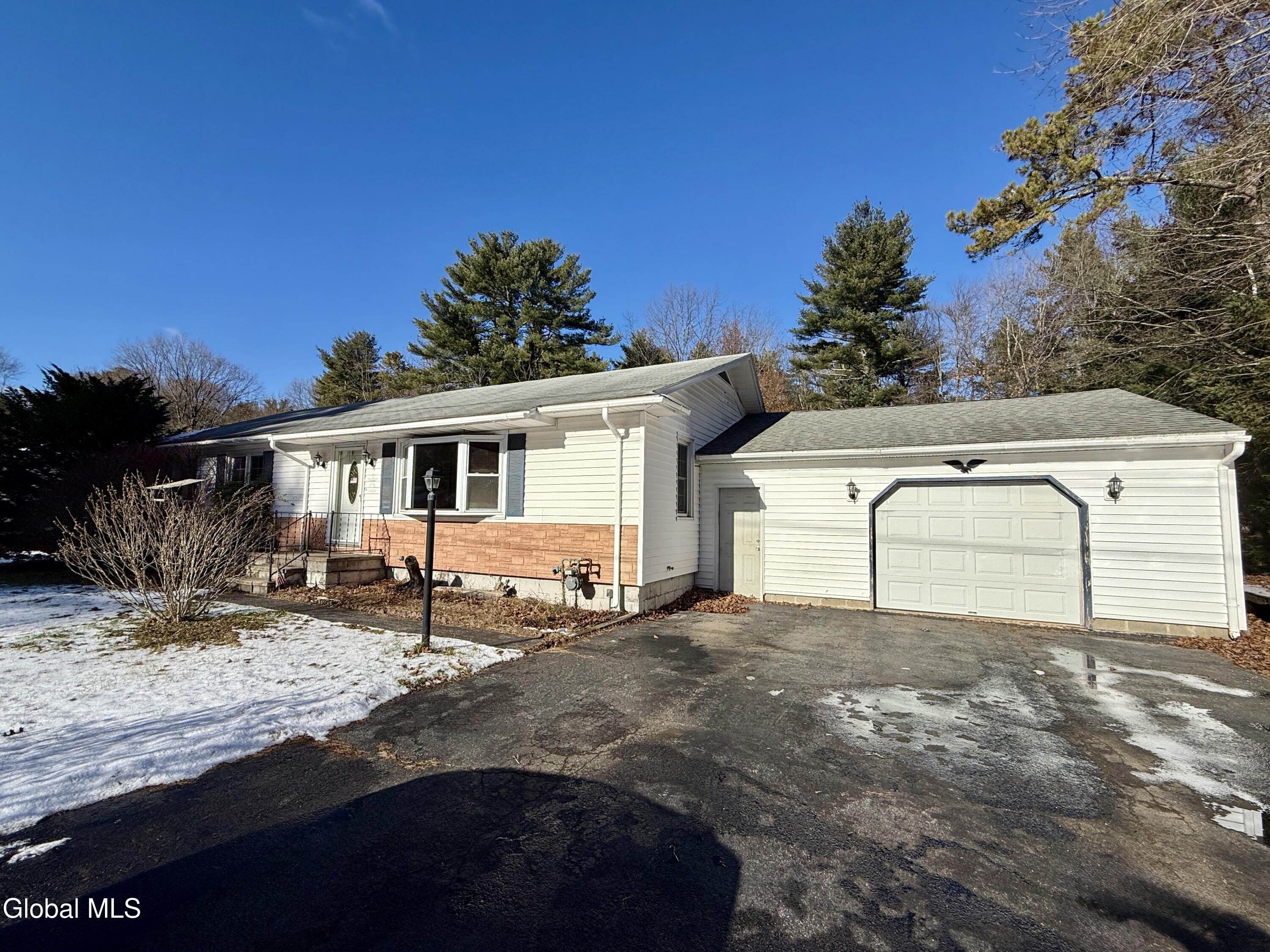 This move-in ready ranch offers a freshly painted interior and a spacious eat-in kitchen updated approximately eight years ago, now featuring a brand-new stove and new refrigerator. The home includes laminate flooring throughout, with hardwood floors exposed in one bedroom, and an updated bathroom with ceramic tile. Newer windows are installed throughout, and most rooms are equipped with ceiling fans. The full basement provides exceptional space with a half bath and potential for additional rooms or recreational areas. Mechanical updates include a hot water heater installed in 2015, central air conditioning, and washer and dryer that remain with the property. An oversized two-car garage, large fenced yard, and storage shed add to the home's appeal. The inground pool, complete with a new liner, creates an inviting outdoor retreat. Home sold as-is.