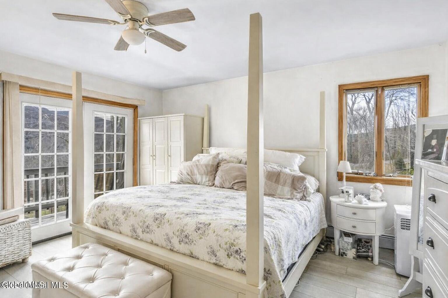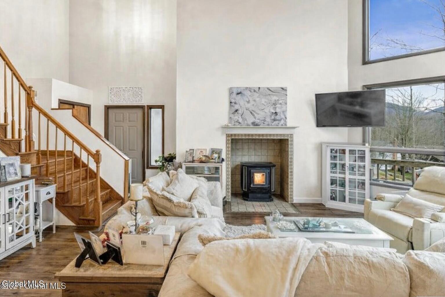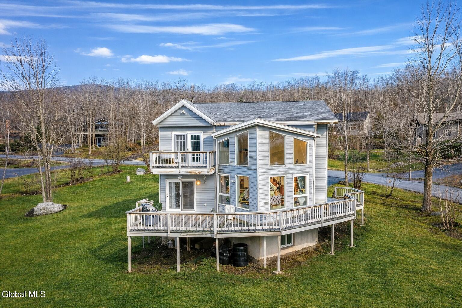 Beautiful Contemporary with breathtaking views of Hunter Mountain Ski Resort in the heart of the Catskill Mountains. This light-filled home features dramatic floor-to-ceiling windows and soaring cathedral ceilings, bringing in an abundance of natural sunlight while perfectly framing the stunning mountain scenery. The primary suite offers a peaceful retreat with its own private balcony and an ensuite bath featuring a granite-topped vanity and tiled shower. A secondary bedroom located at the front of the home boasts vaulted ceilings and sliding glass doors leading to a private veranda, perfect for enjoying the mountain air. Ideally located within walking distance to the Village of Hunter and just a 2-minute drive to the slopes at Hunter Mountain Resort, this home offers the perfect balance of convenience, views, and Catskill charm--ideal as a full-time residence, weekend getaway, or investment property.