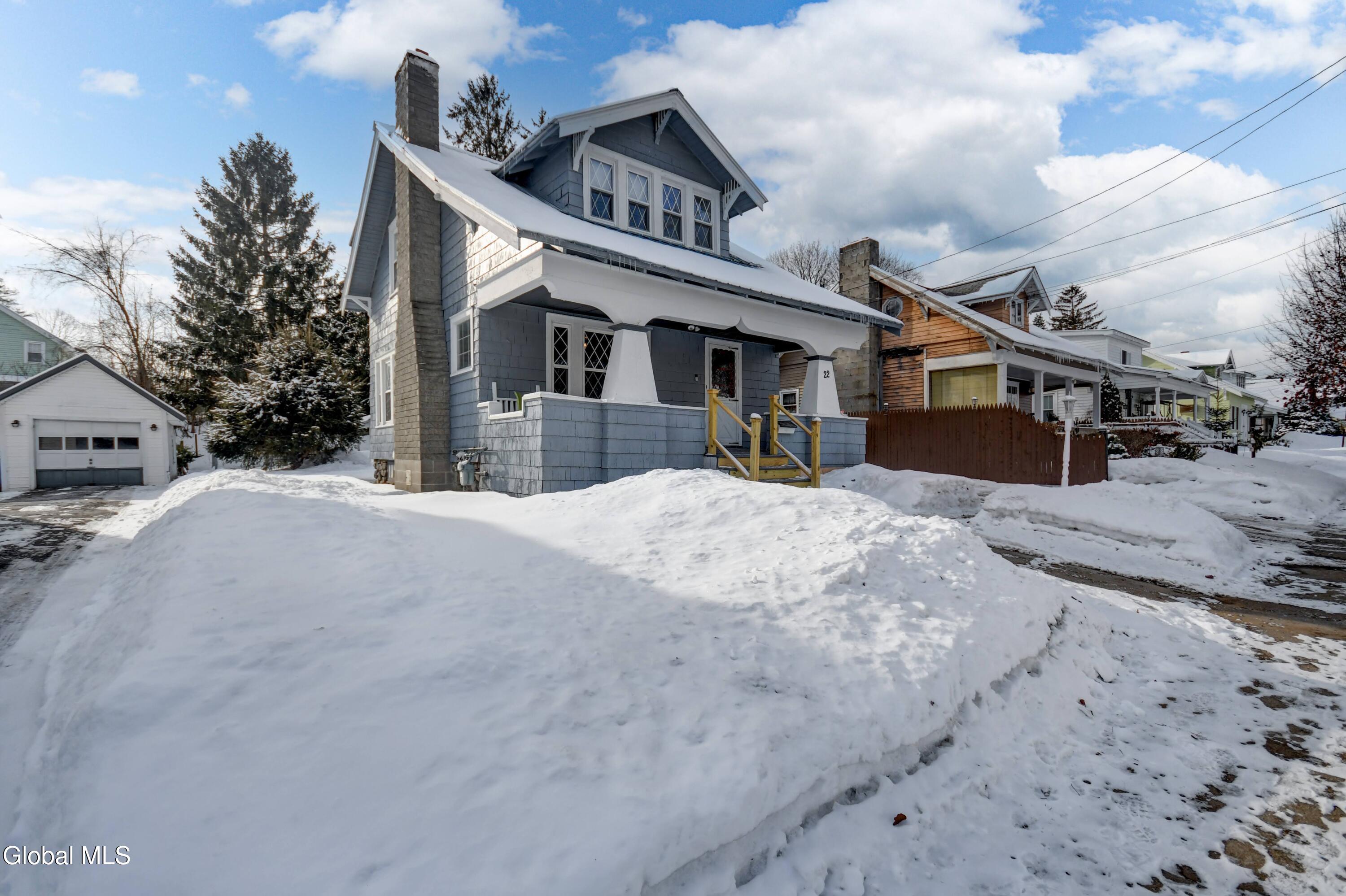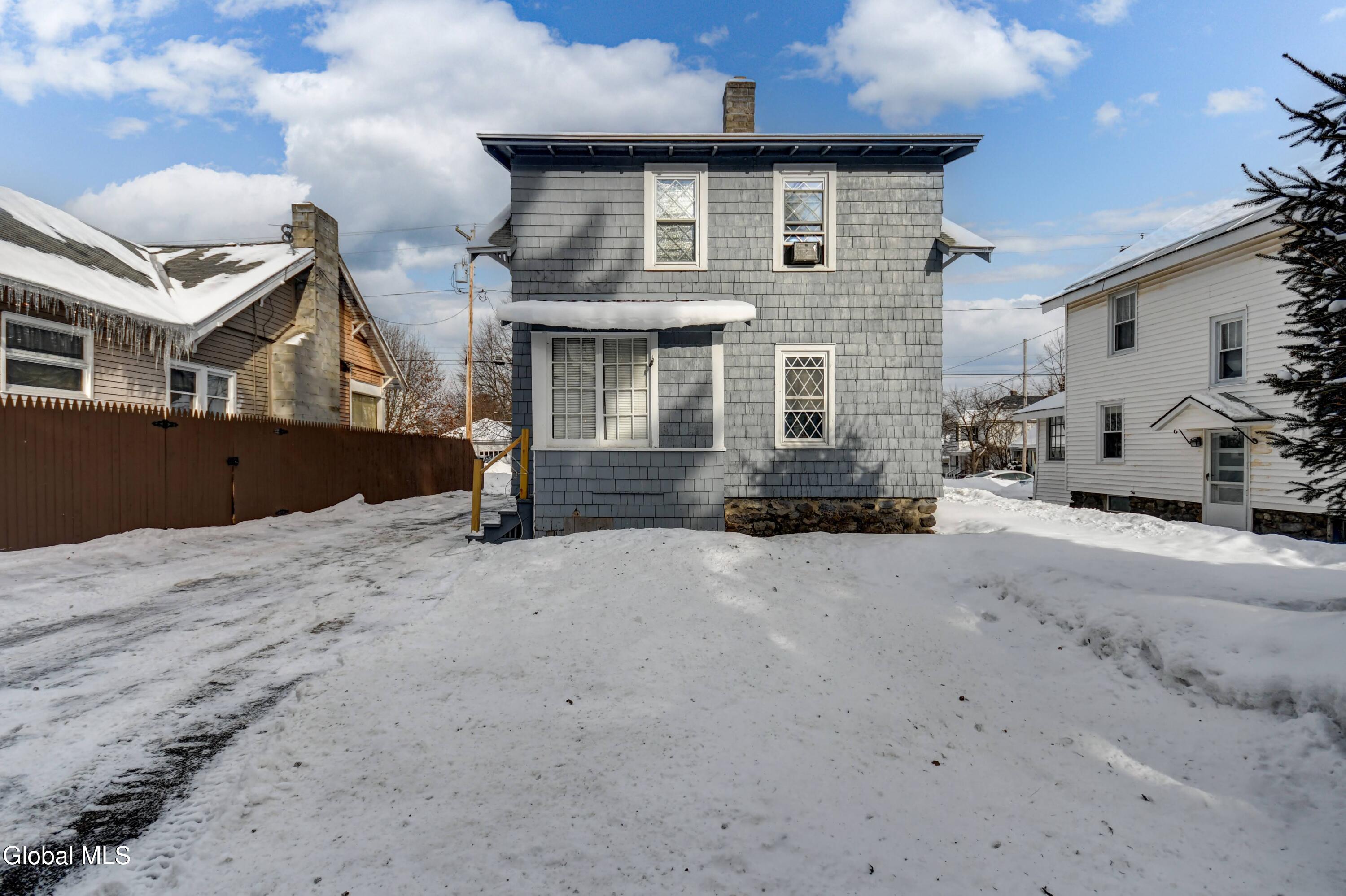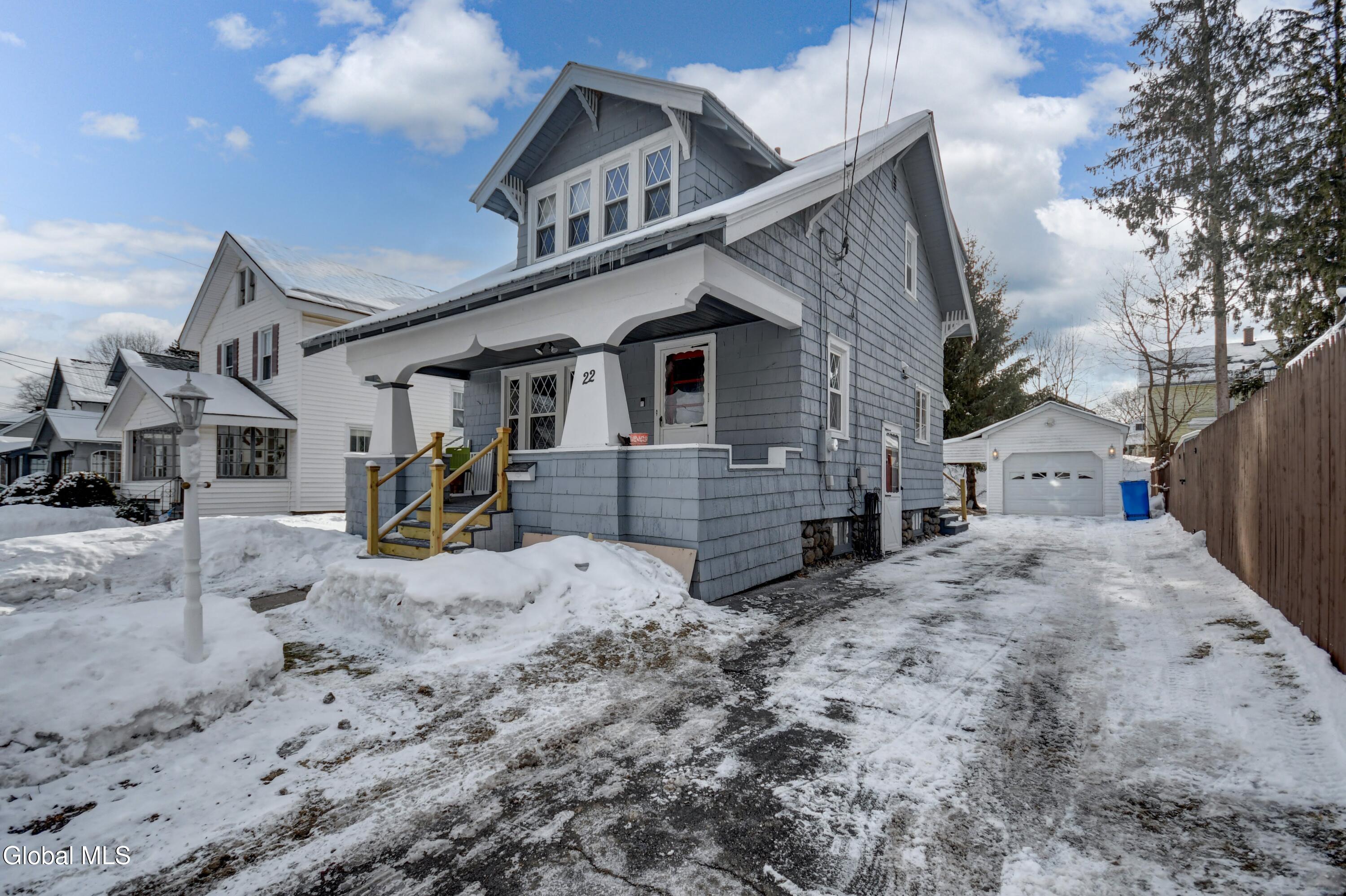 Welcome to this charming Arts & Crafts-style home featuring classic cedar siding and timeless character throughout. Thoughtfully maintained and move-in ready, this inviting residence offers a warm blend of craftsmanship and everyday comfort. Step inside to a cozy living room with a wood-burning fireplace, flanked by built-in shelving, creating a welcoming space to relax or entertain. The kitchen and dining area flow seamlessly into the living room, making the layout both functional and comfortable for daily life. Upstairs, you'll find two bedrooms and a full bath. The full basement adds valuable storage and includes laundry and a convenient half bath, expanding the home's usable space. Outside, enjoy the convenience of a paved driveway with off-street parking, a one-car detached garage, and a covered patio attached to the garage-ideal for outdoor gatherings or quiet evenings. The backyard also features a 15' x 24' pet pen, providing a secure area for outdoor enjoyment. With its classic style, thoughtful updates, and practical features, this home offers comfort, character, and value in an established neighborhood close to local amenities.