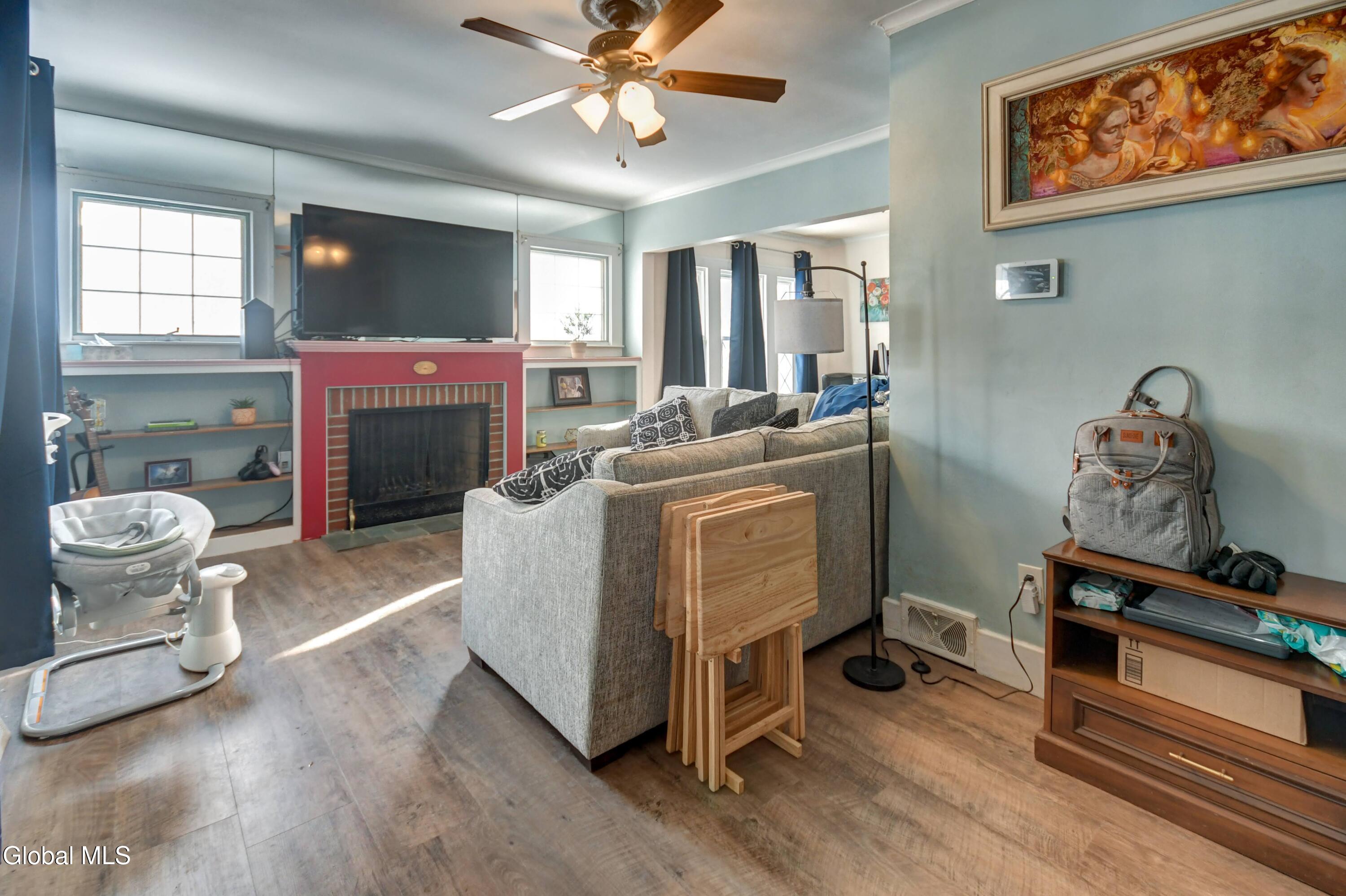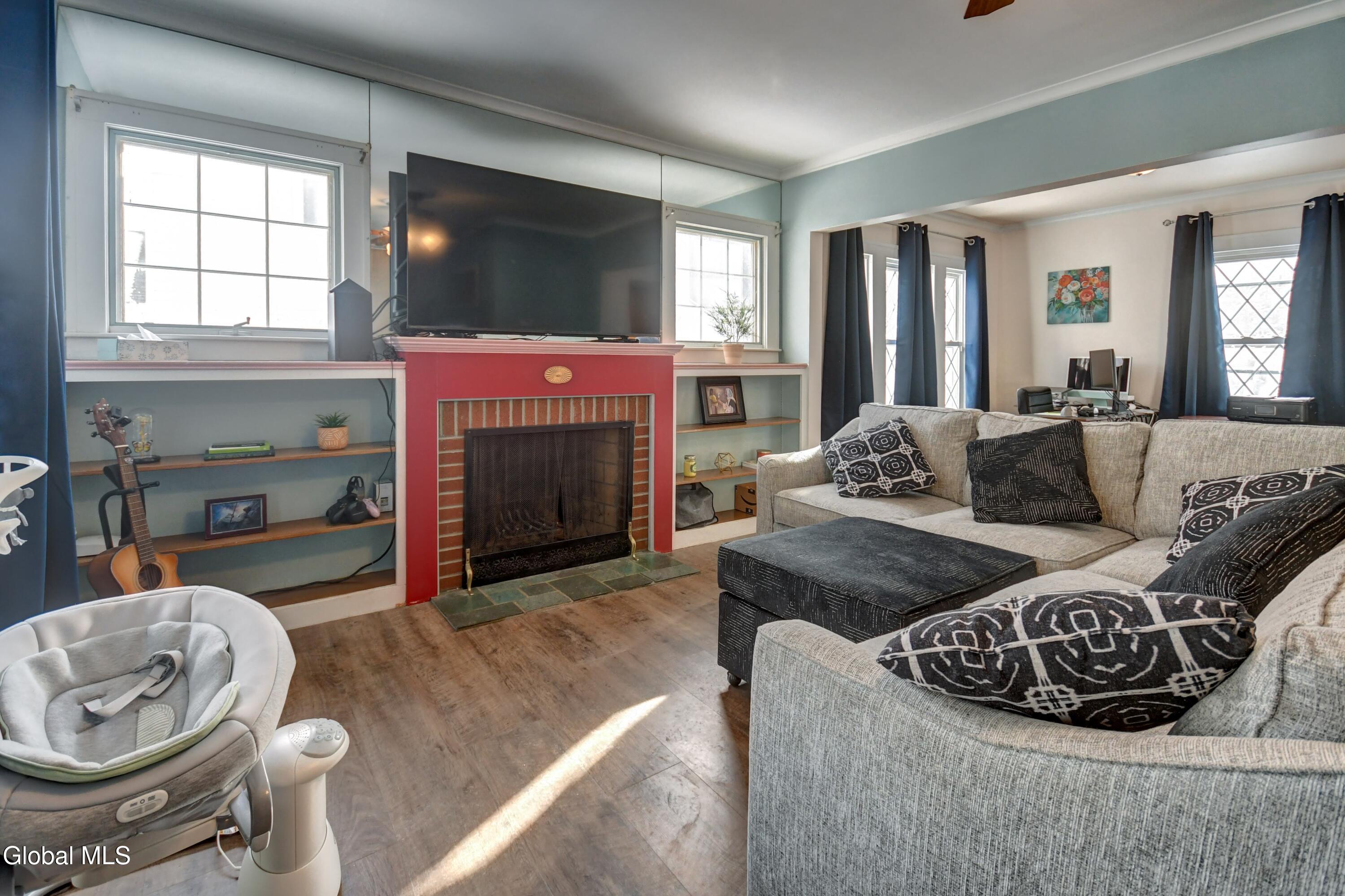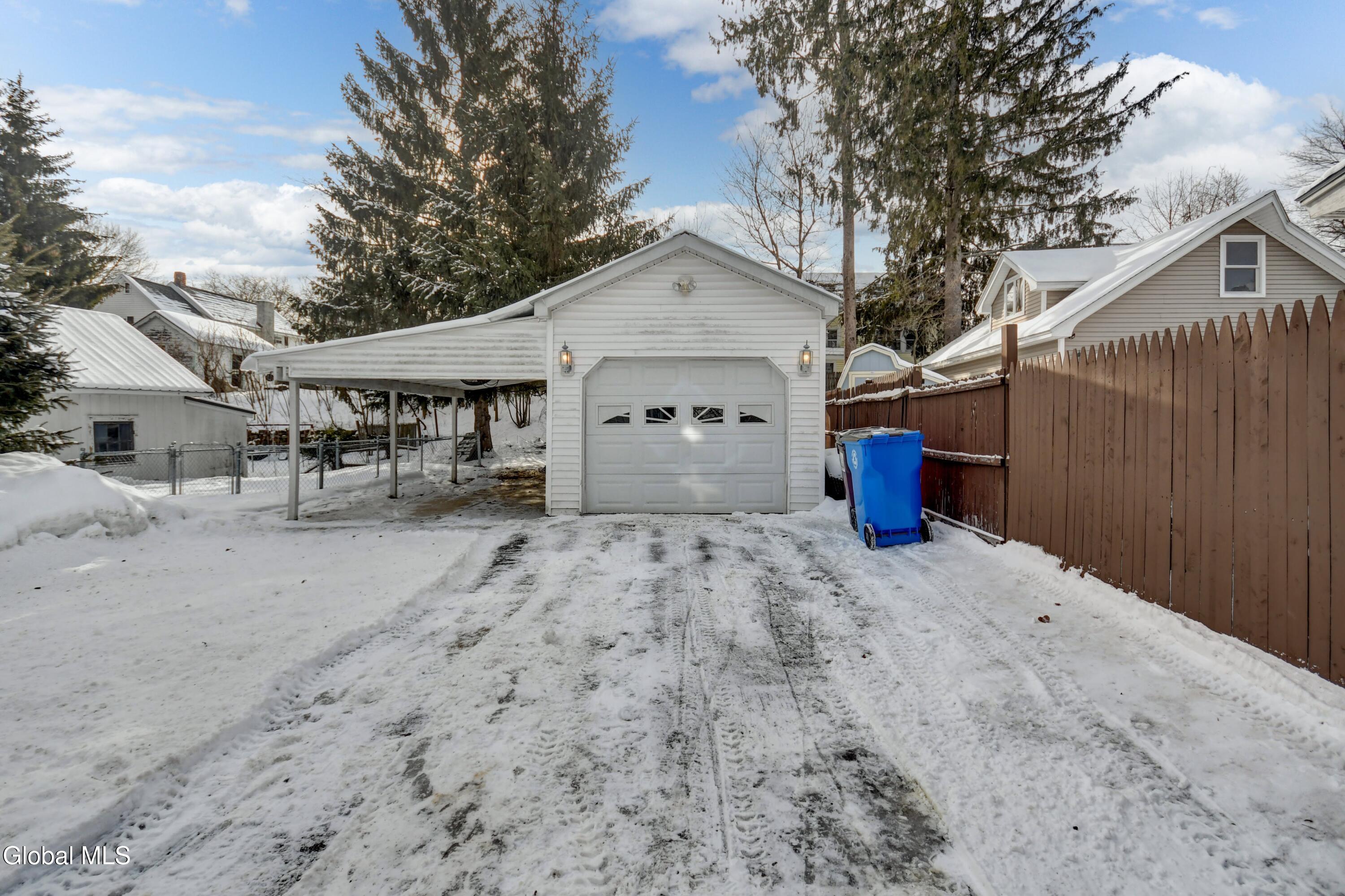 Welcome to this charming Arts & Crafts-style home featuring classic cedar siding and timeless character throughout. Thoughtfully maintained and move-in ready, this inviting residence offers a warm blend of craftsmanship and everyday comfort. Step inside to a cozy living room with a wood-burning fireplace, flanked by built-in shelving, creating a welcoming space to relax or entertain. The kitchen and dining area flow seamlessly into the living room, making the layout both functional and comfortable for daily life. Upstairs, you'll find two bedrooms and a full bath. The full basement adds valuable storage and includes laundry and a convenient half bath, expanding the home's usable space. Outside, enjoy the convenience of a paved driveway with off-street parking, a one-car detached garage, and a covered patio attached to the garage-ideal for outdoor gatherings or quiet evenings. The backyard also features a 15' x 24' pet pen, providing a secure area for outdoor enjoyment. With its classic style, thoughtful updates, and practical features, this home offers comfort, character, and value in an established neighborhood close to local amenities.