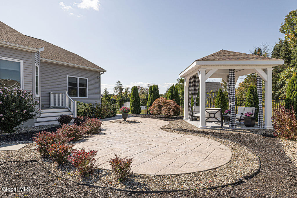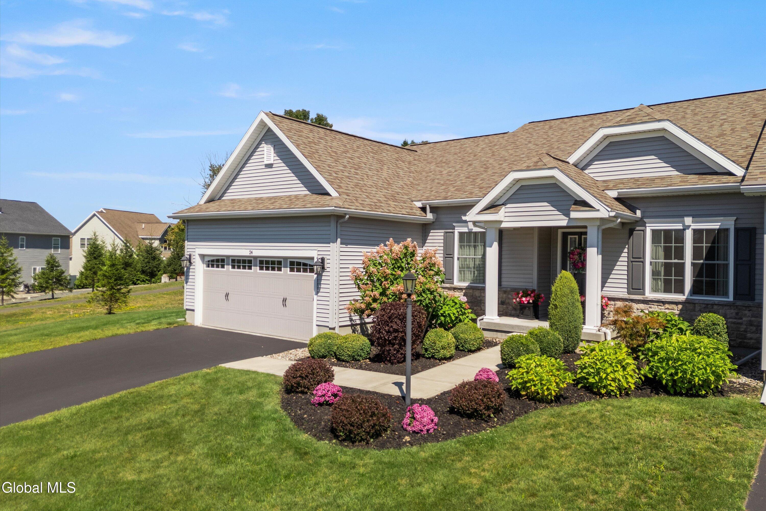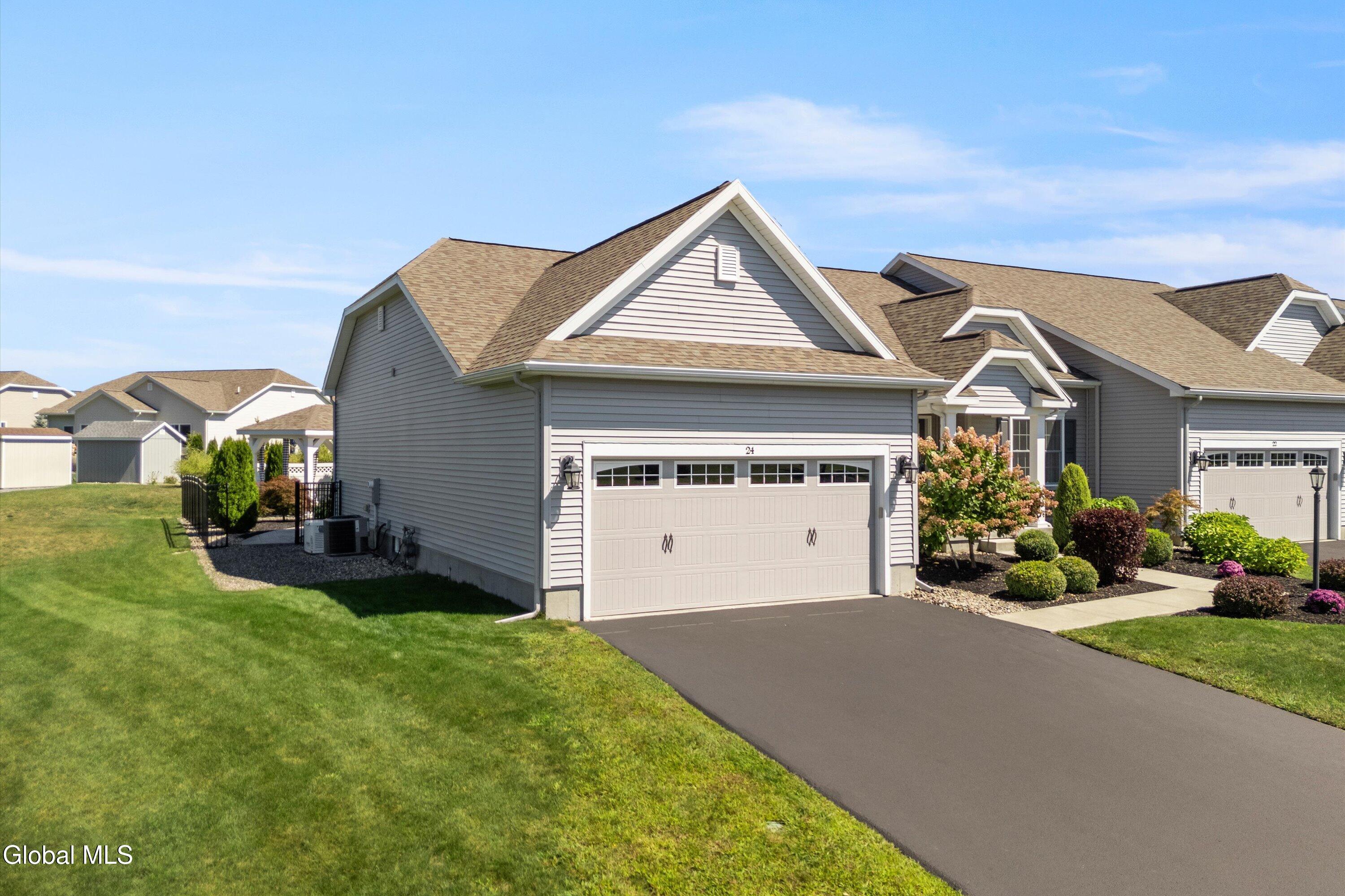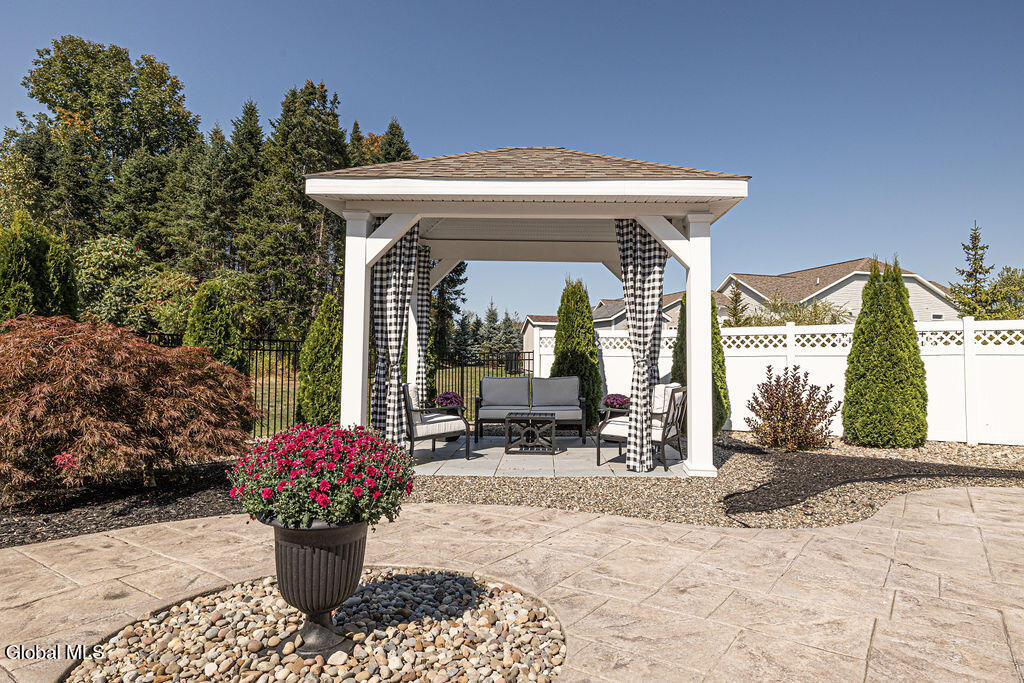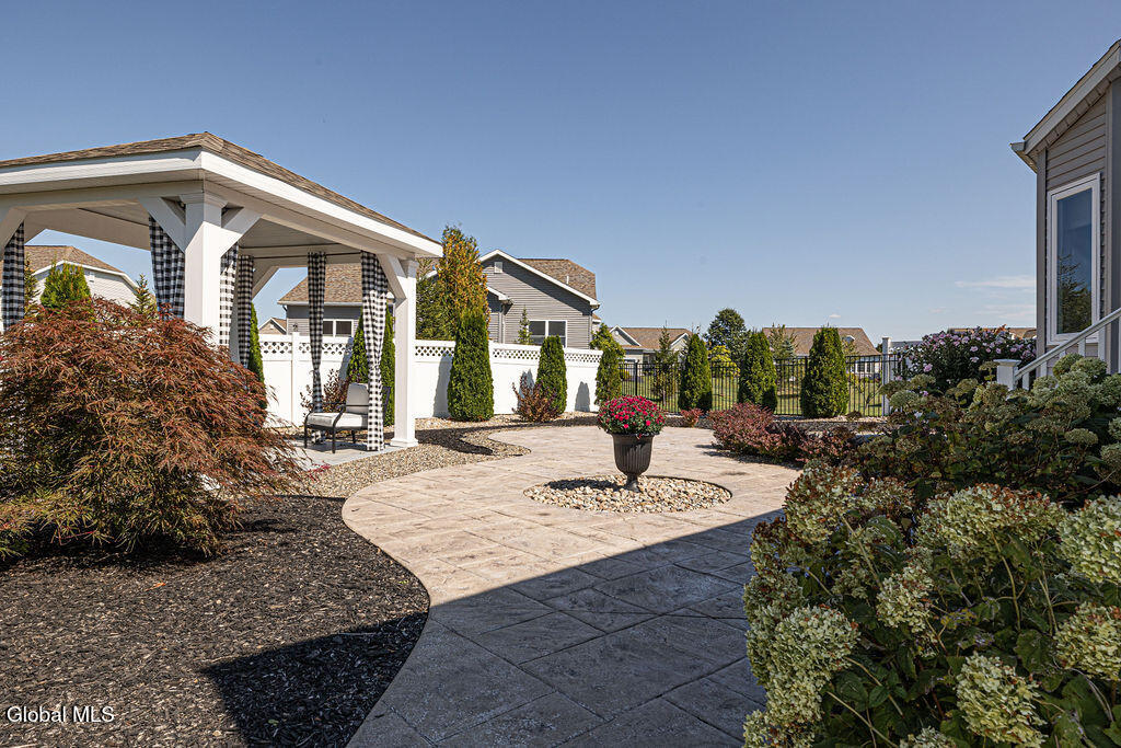 This beautiful, custom, single-story end-unit townhome is nestled in a park-like setting, complete with its own pavilion, stamped concrete patio and walks, and an area already primed for a fire pit. Inside the 3-bedroom, 2- bath, 1734 square foot home, the upgrades continue, including hardwoods and quartz countertops throughout, a 13 1/2-foot kitchen island, a convection double oven, 42'' white Schrock cabinets with crown moulding, and a gas fireplace with marble surround. A low HOA takes care of lawn/shrub maintenance and snow removal. Custom landscaping, decorative fencing, a finished two-car garage, and a Generac generator are definitely perks. Add to all of this community walking paths and a neighborhood that is quiet, safe, and has the established look and feel of mature trees and landscaping although it is still young, and you have a rare find. Its superior location is close to I 87 and an easy ride to Saratoga, Malta, and Ballston Spa, with lots of shopping and good restaurants nearby.