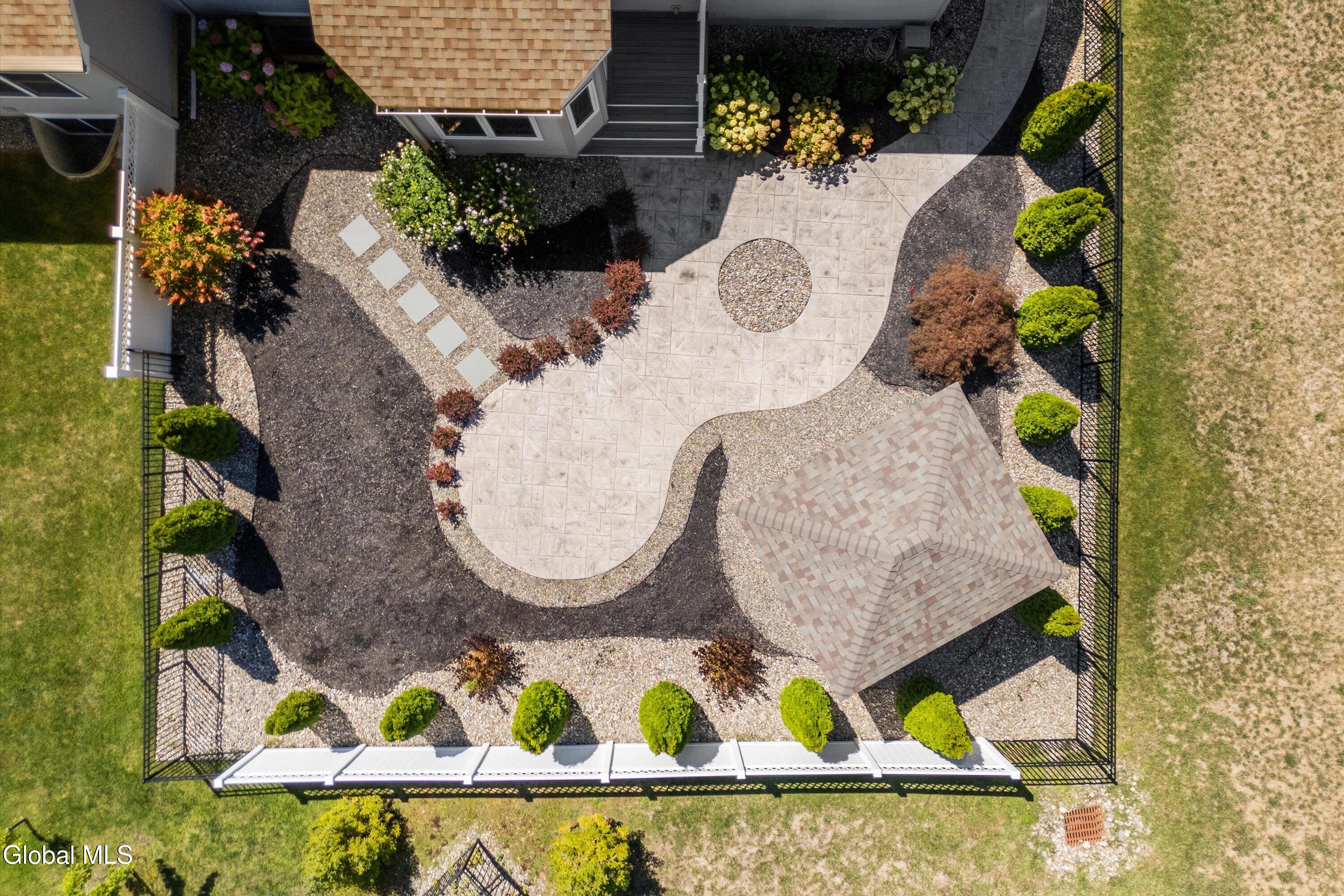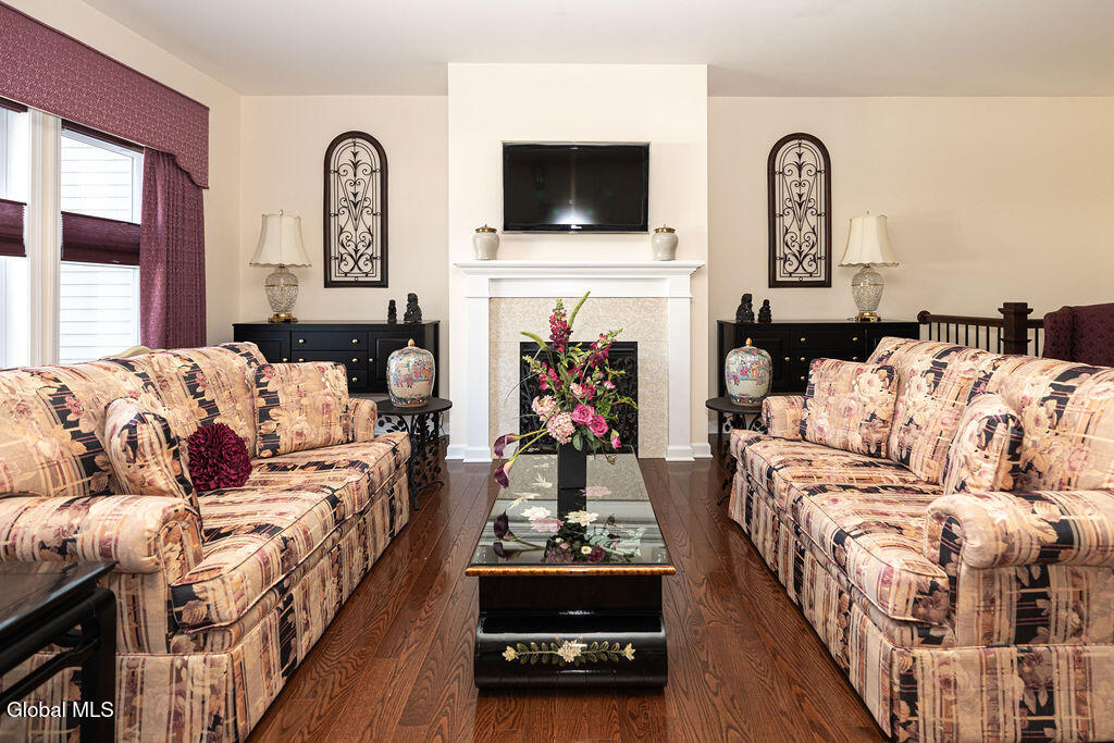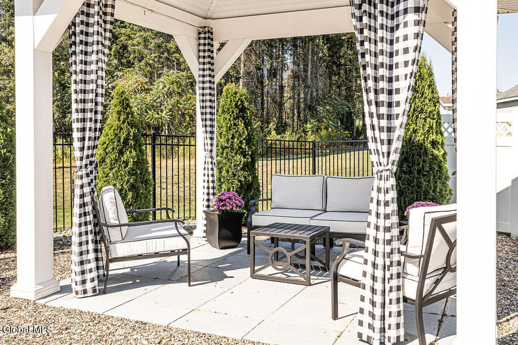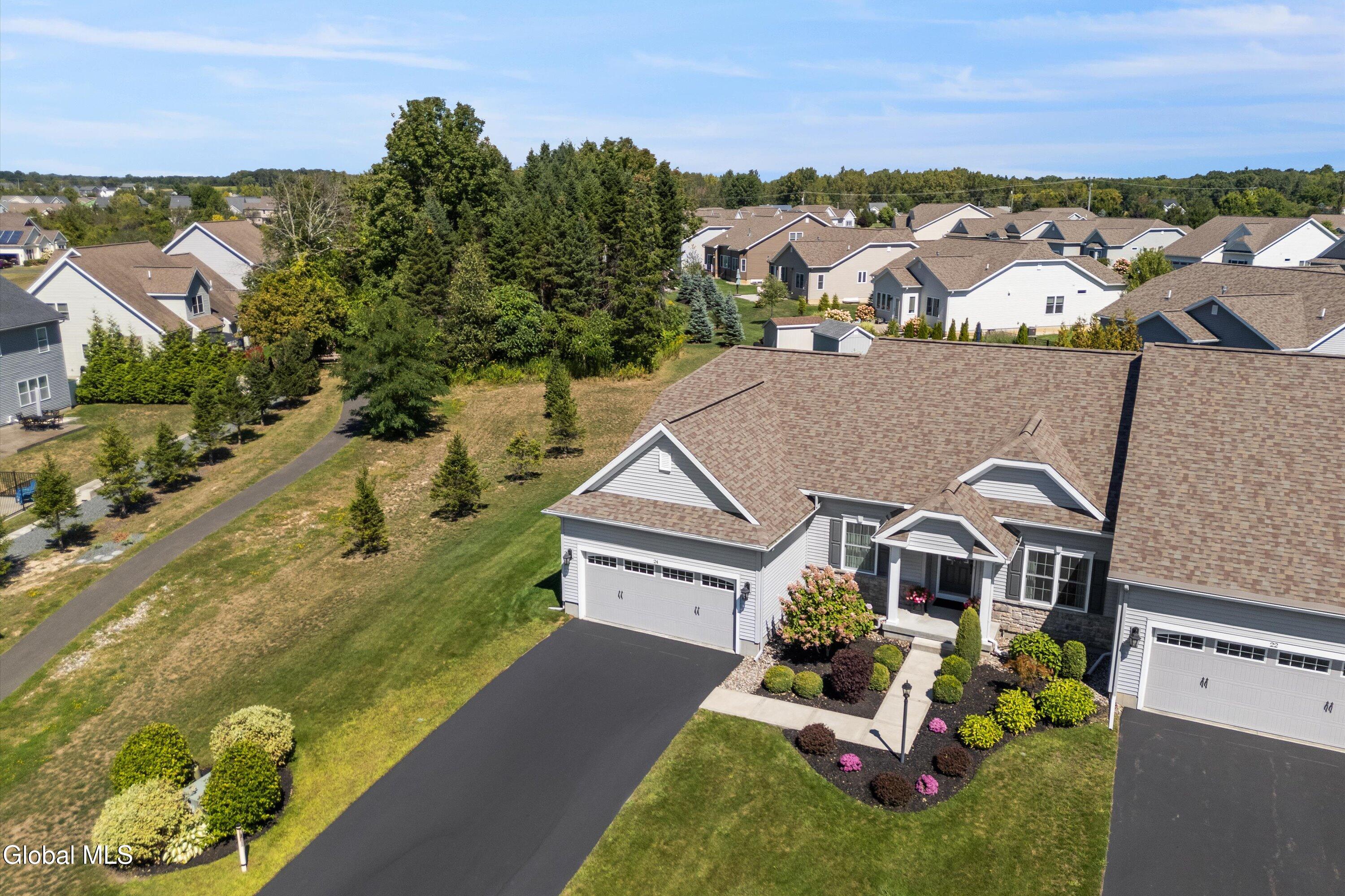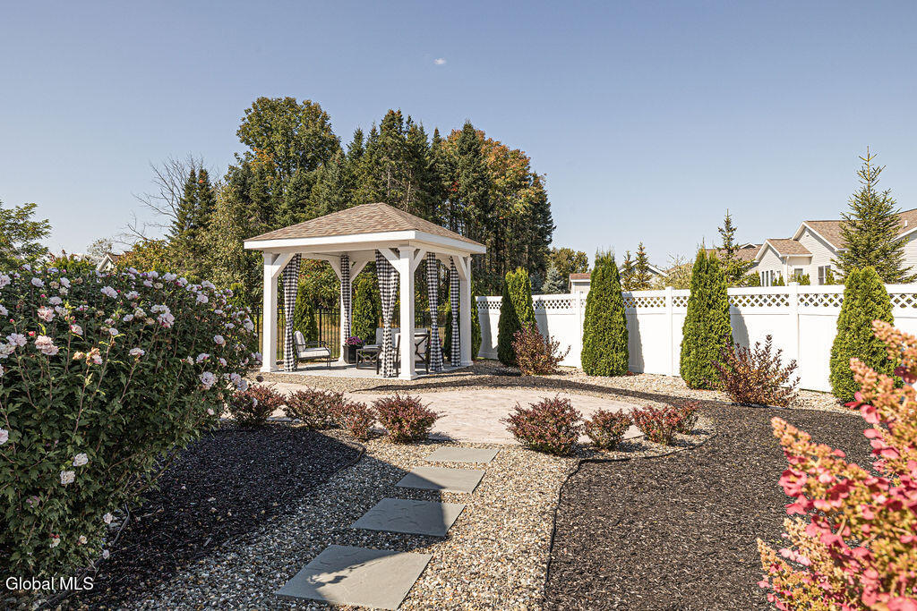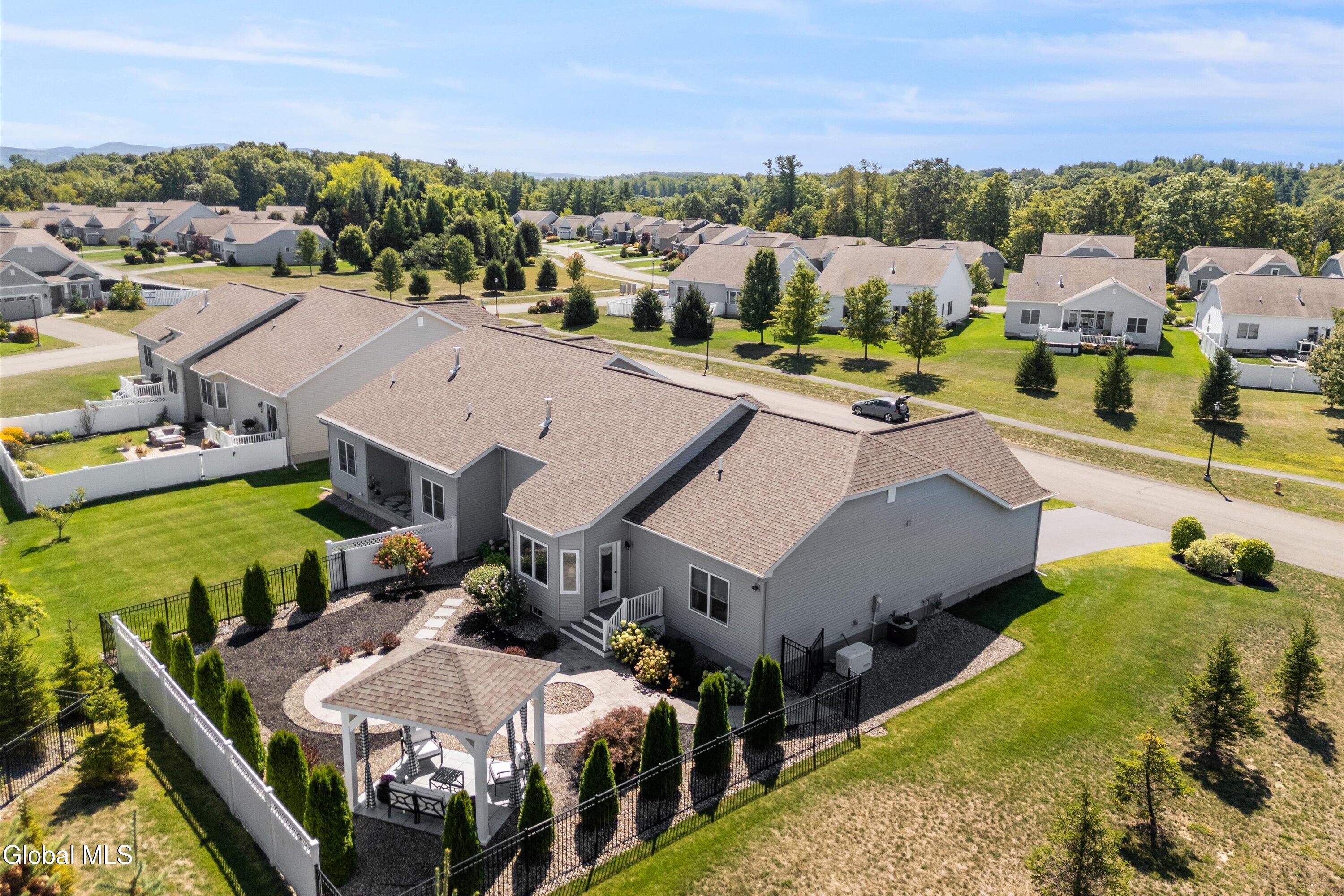 This beautiful, custom, single-story end-unit townhome is nestled in a park-like setting, complete with its own pavilion, stamped concrete patio and walks, and an area already primed for a fire pit. Inside the 3-bedroom, 2- bath, 1734 square foot home, the upgrades continue, including hardwoods and quartz countertops throughout, a 13 1/2-foot kitchen island, a convection double oven, 42'' white Schrock cabinets with crown moulding, and a gas fireplace with marble surround. A low HOA takes care of lawn/shrub maintenance and snow removal. Custom landscaping, decorative fencing, a finished two-car garage, and a Generac generator are definitely perks. Add to all of this community walking paths and a neighborhood that is quiet, safe, and has the established look and feel of mature trees and landscaping although it is still young, and you have a rare find. Its superior location is close to I 87 and an easy ride to Saratoga, Malta, and Ballston Spa, with lots of shopping and good restaurants nearby.