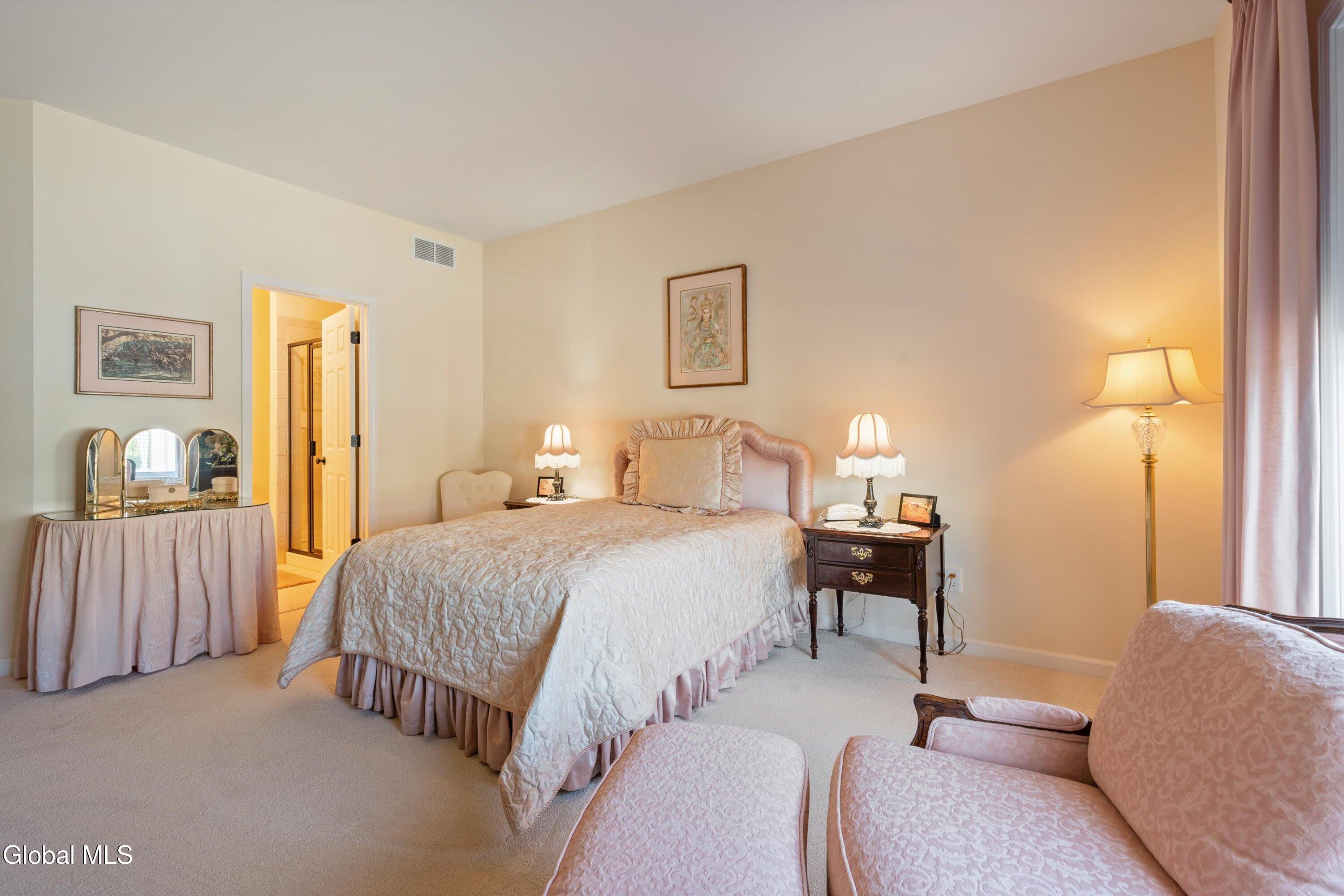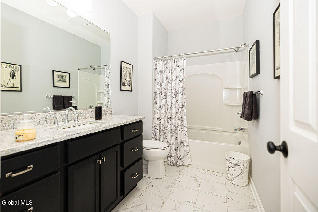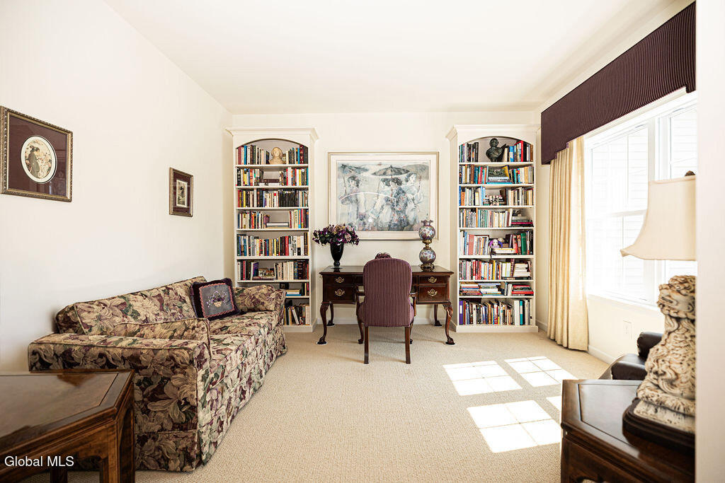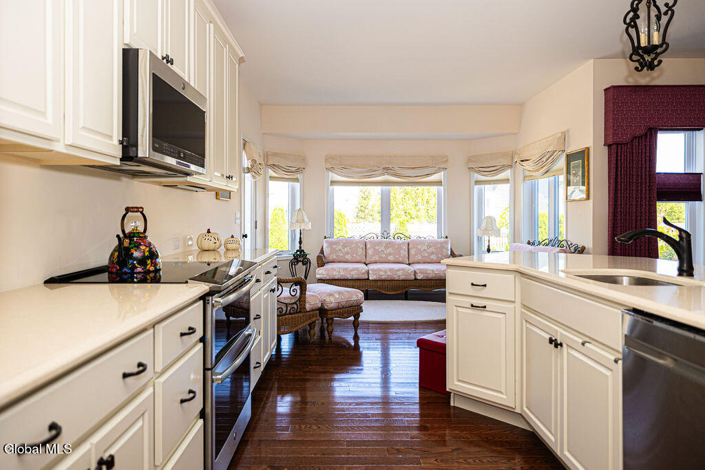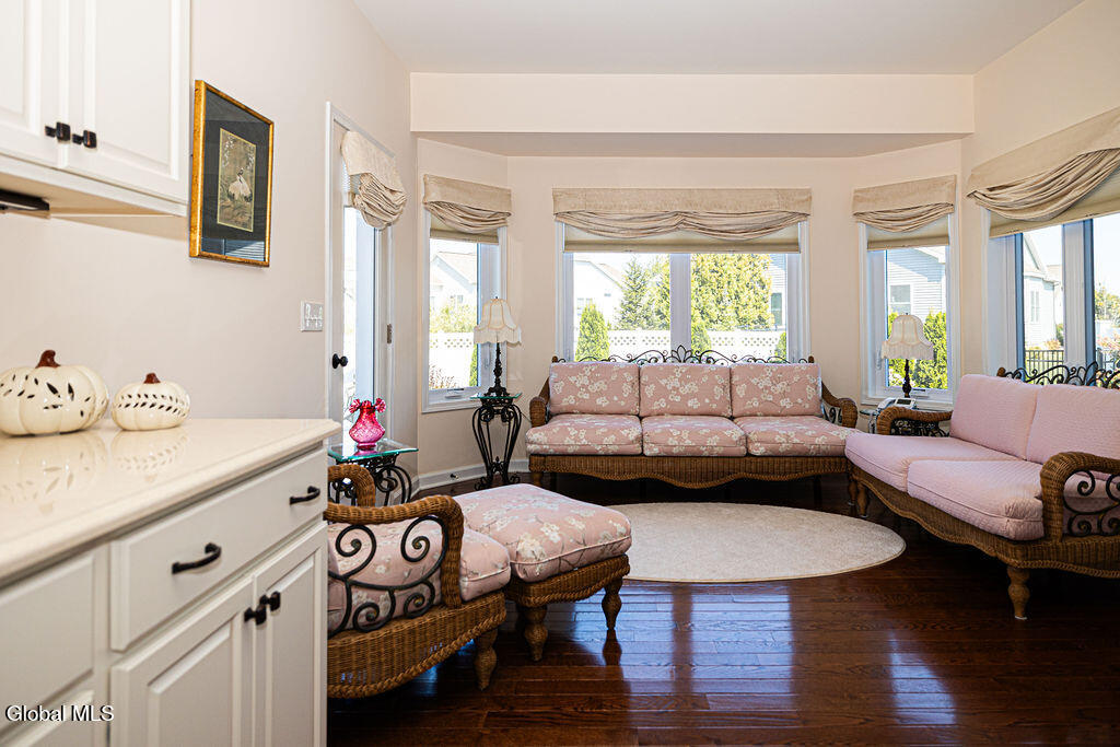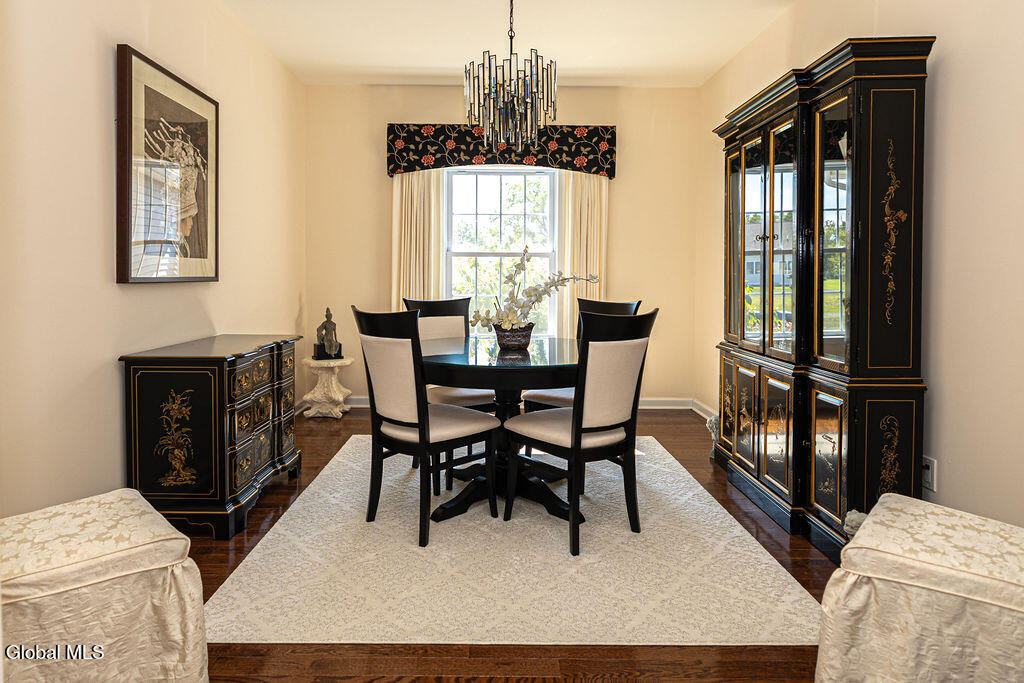 This beautiful, custom, single-story end-unit townhome is nestled in a park-like setting, complete with its own pavilion, stamped concrete patio and walks, and an area already primed for a fire pit. Inside the 3-bedroom, 2- bath, 1734 square foot home, the upgrades continue, including hardwoods and quartz countertops throughout, a 13 1/2-foot kitchen island, a convection double oven, 42'' white Schrock cabinets with crown moulding, and a gas fireplace with marble surround. A low HOA takes care of lawn/shrub maintenance and snow removal. Custom landscaping, decorative fencing, a finished two-car garage, and a Generac generator are definitely perks. Add to all of this community walking paths and a neighborhood that is quiet, safe, and has the established look and feel of mature trees and landscaping although it is still young, and you have a rare find. Its superior location is close to I 87 and an easy ride to Saratoga, Malta, and Ballston Spa, with lots of shopping and good restaurants nearby.