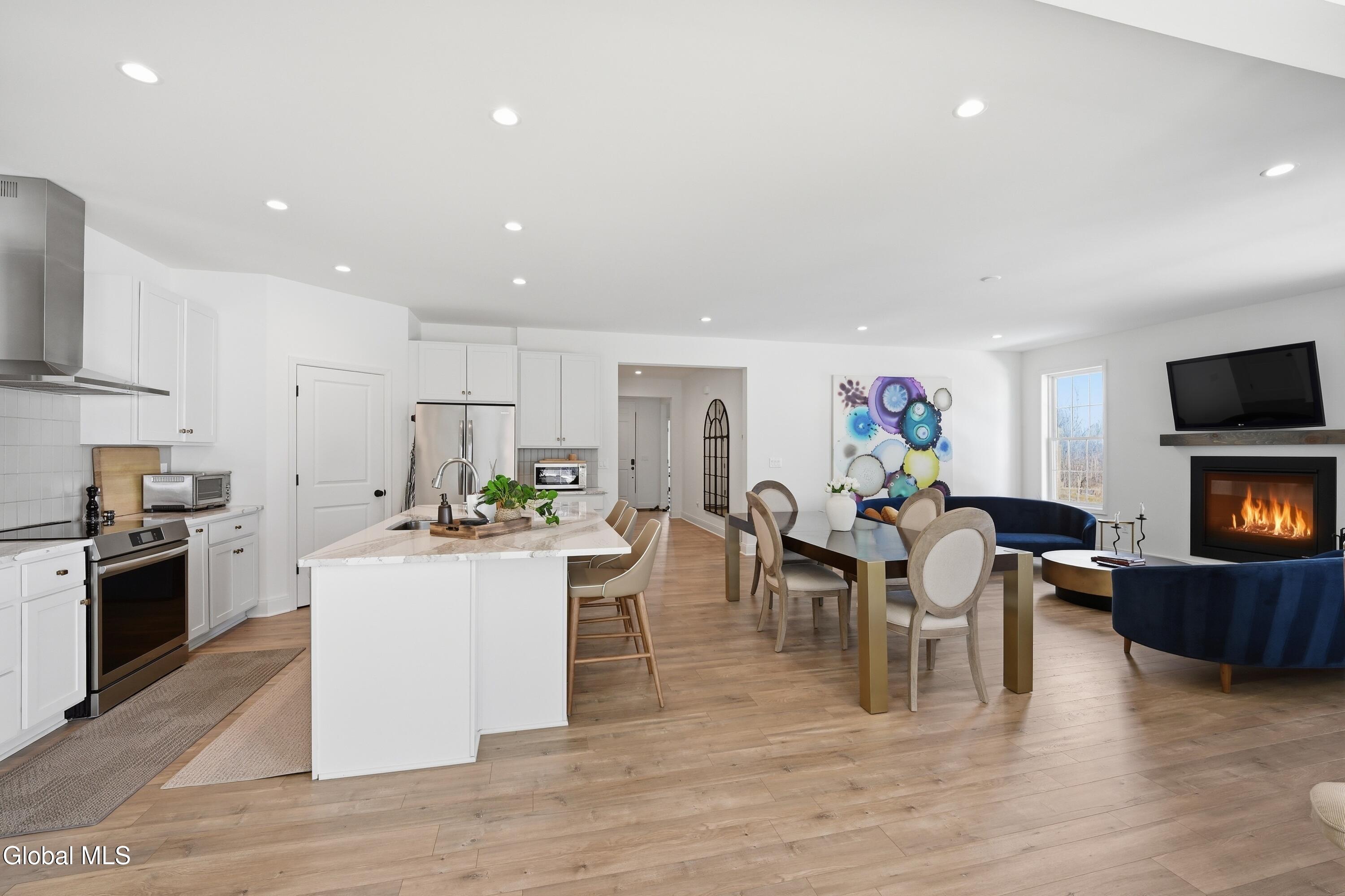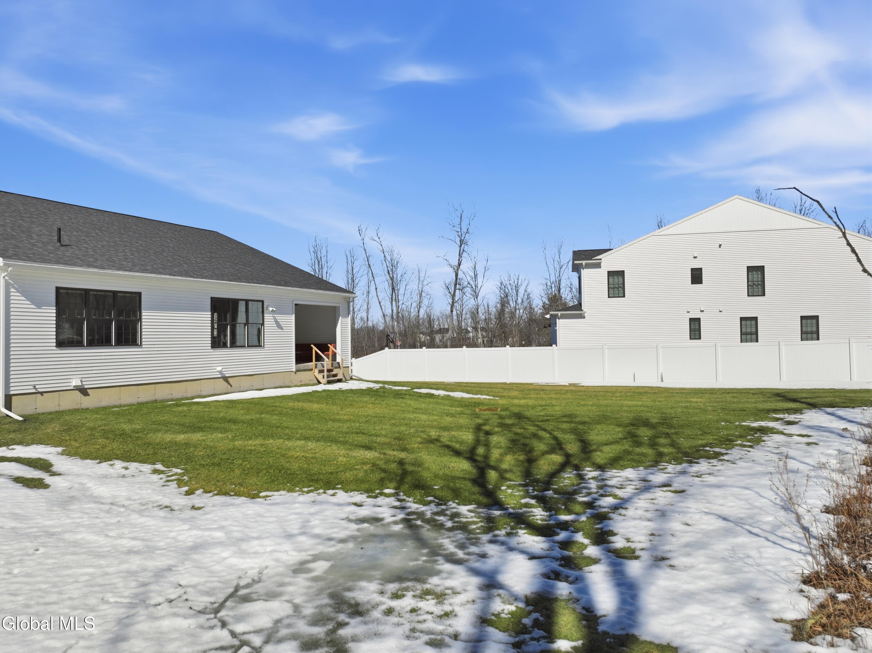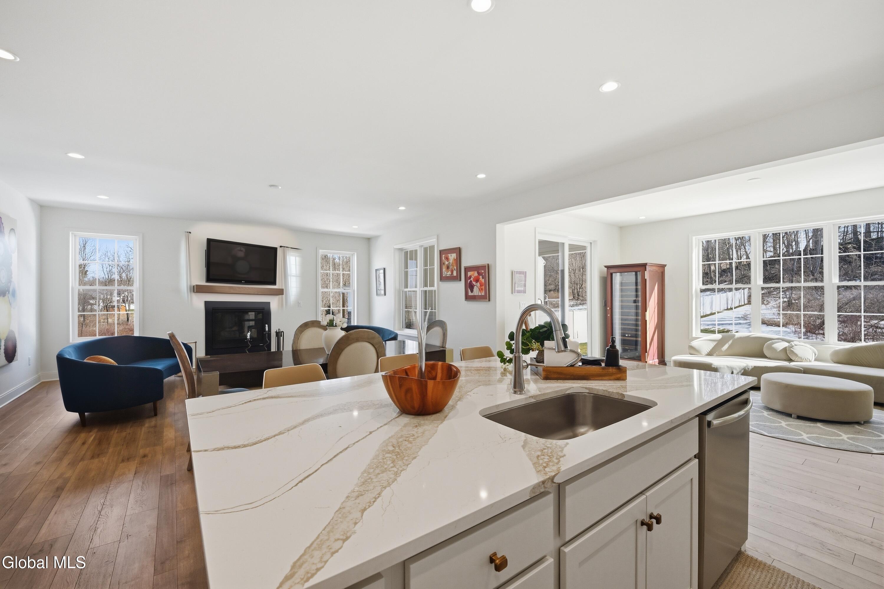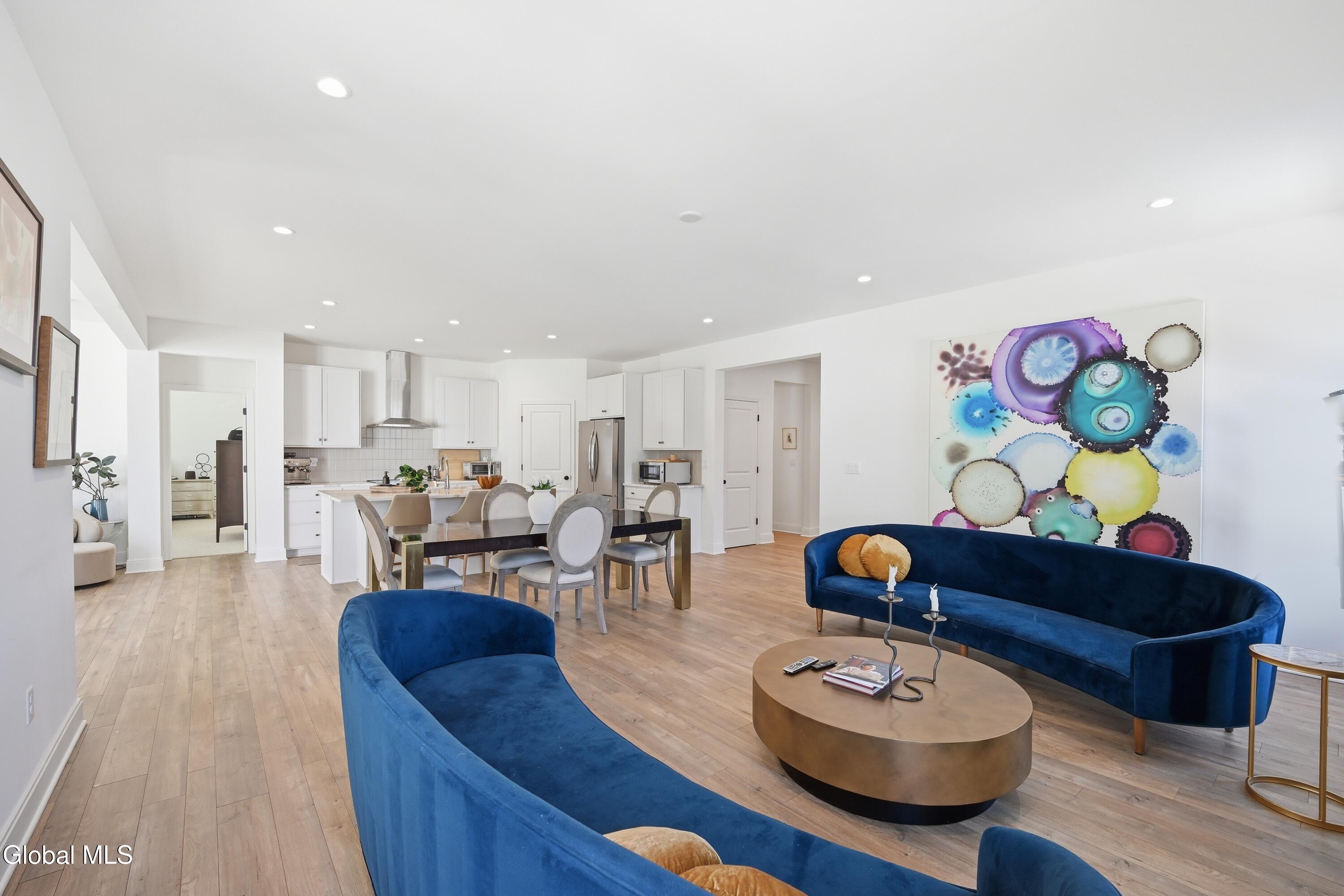 Built in 2024 by Marini Homes, this bright, nearly-new ranch sitting near the end of a quiet cul-de-sac offers over 2,400 sqft of gracious one-floor living. A sparkling cappuccino quartz kitchen with oversized island and induction range anchors the flexible living and dining layout. A sun-filled seating area (or dining room) opens to a covered patio overlooking a private, tree-lined backyard. Four spacious bedrooms extend across three sides of the home, designed for generational living and privacy. The primary suite includes a luxury bath with free-standing tub, separate shower, two vanities and an oversized walk-in closet. The home features two additional full bathrooms, first floor laundry room, full basement, sprinkler system, and a three-car garage with electric vehicle charger. North Colonie Schools.