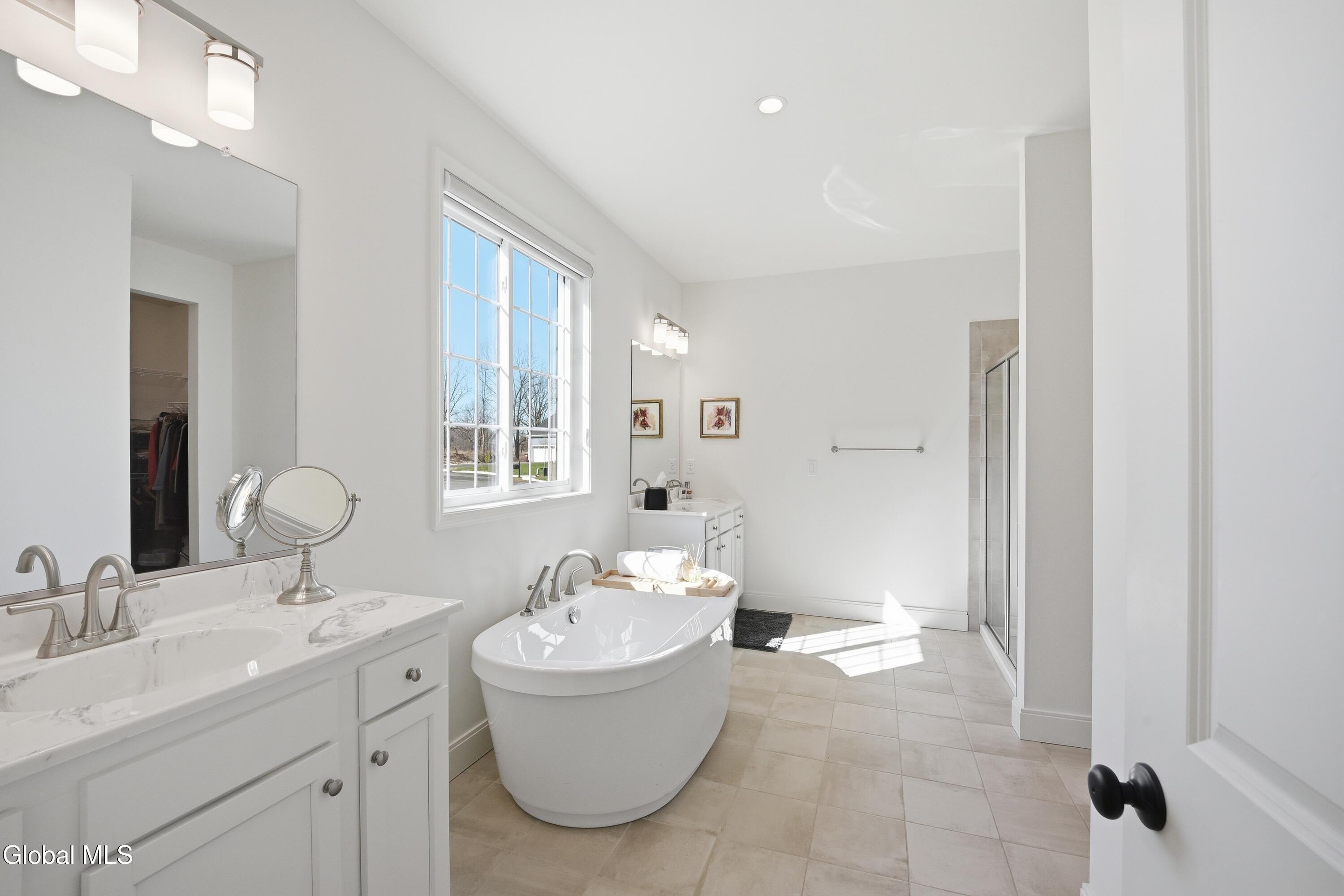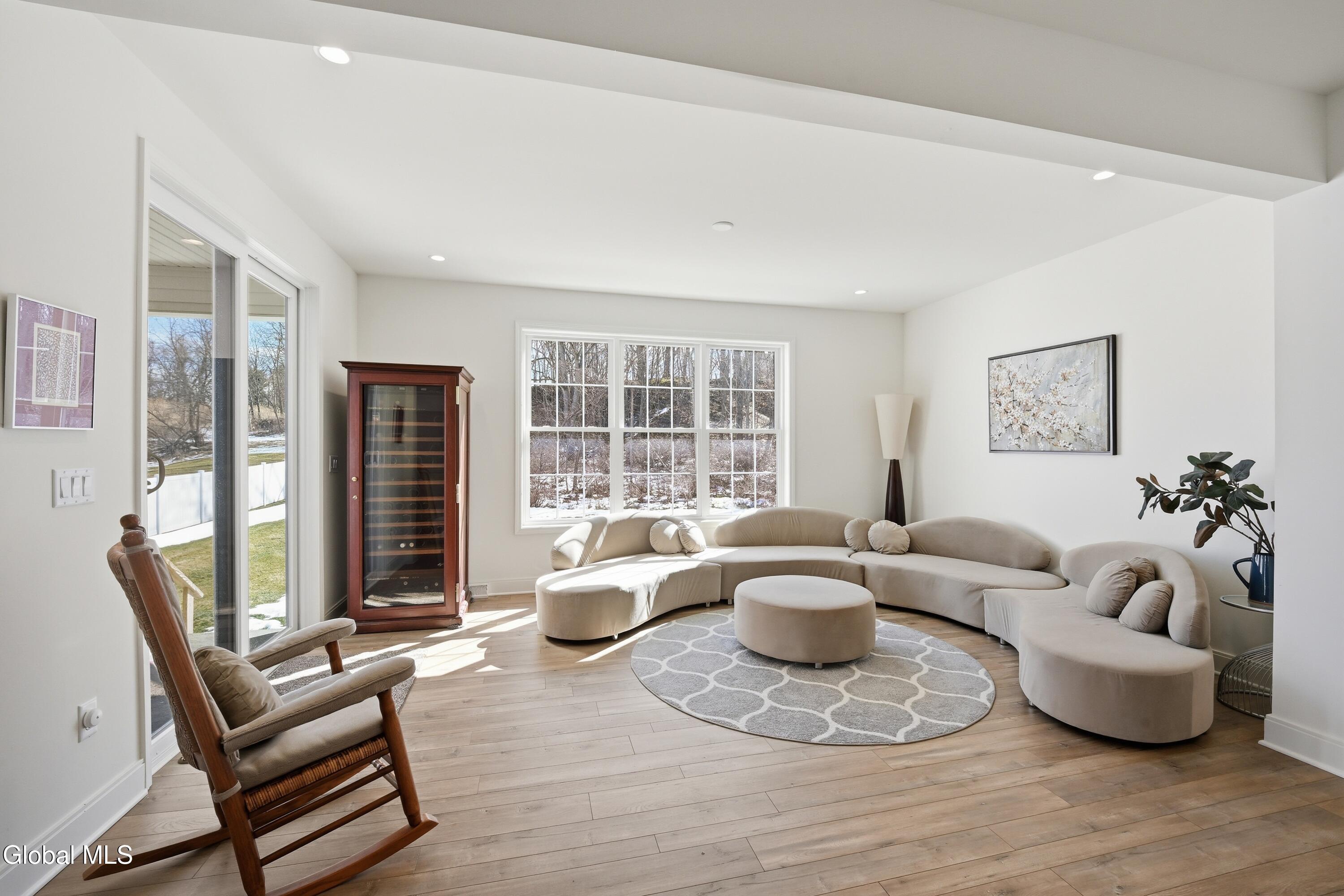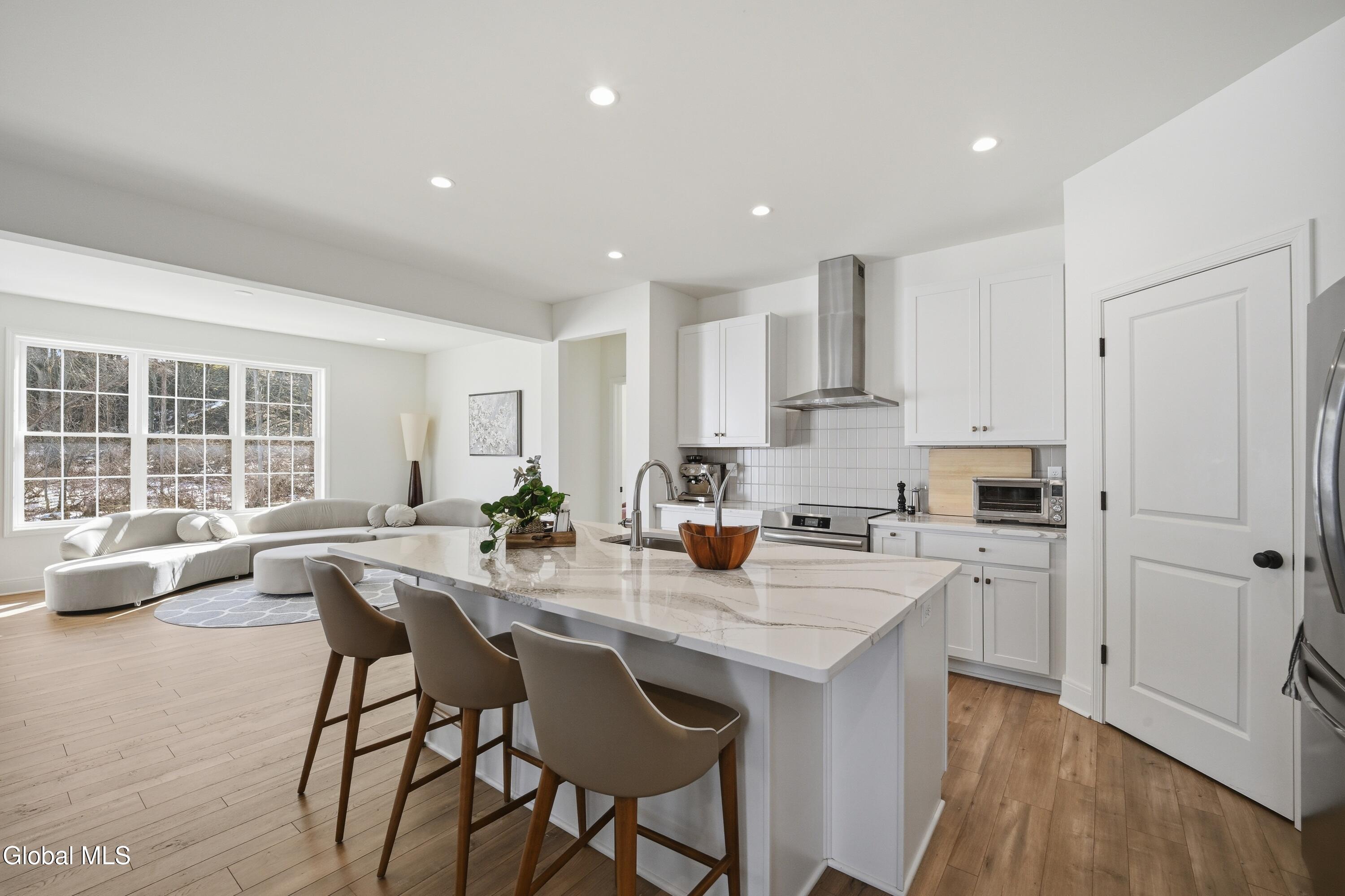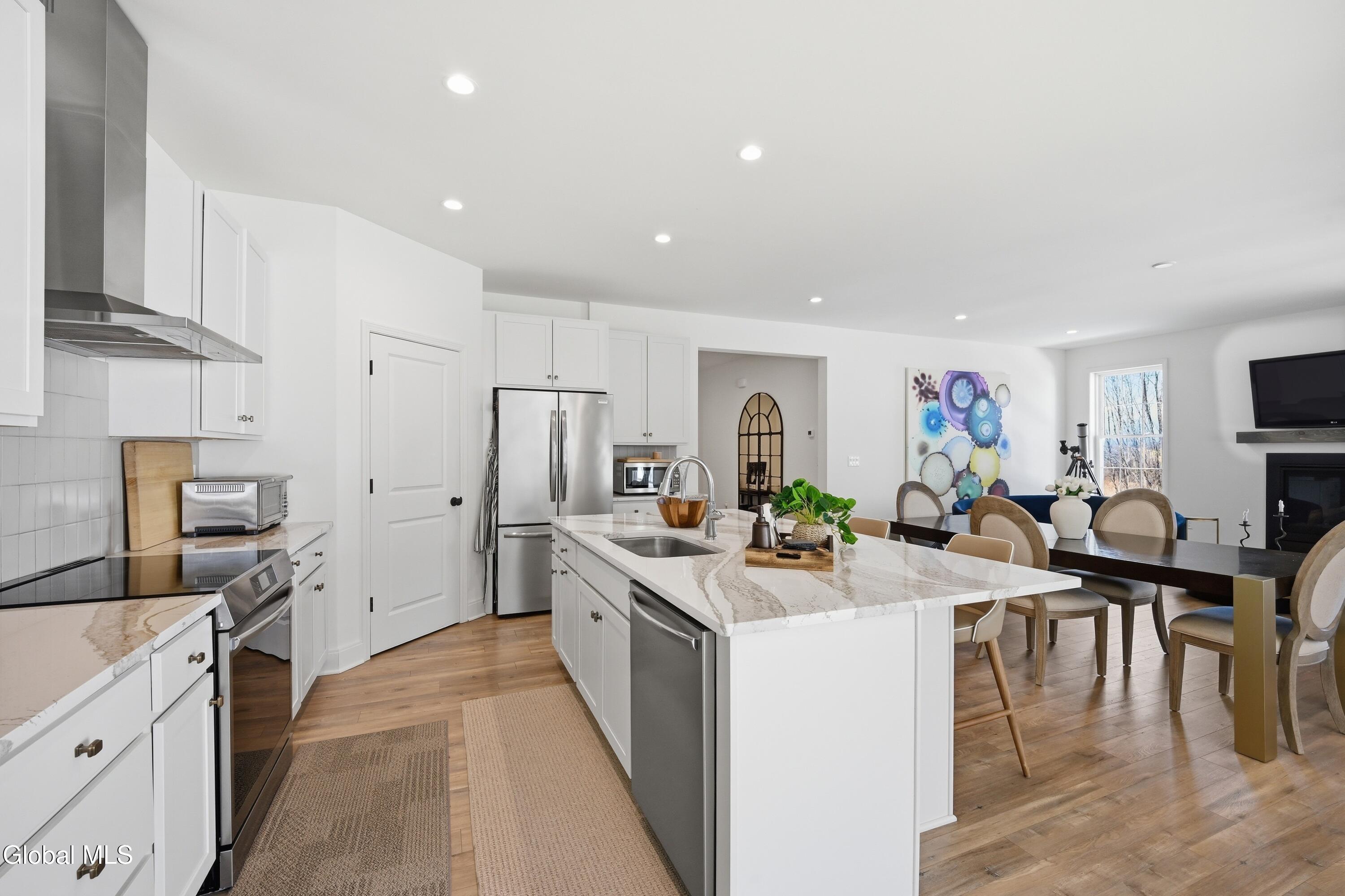 Built in 2024 by Marini Homes, this bright, nearly-new ranch sitting near the end of a quiet cul-de-sac offers over 2,400 sqft of gracious one-floor living. A sparkling cappuccino quartz kitchen with oversized island and induction range anchors the flexible living and dining layout. A sun-filled seating area (or dining room) opens to a covered patio overlooking a private, tree-lined backyard. Four spacious bedrooms extend across three sides of the home, designed for generational living and privacy. The primary suite includes a luxury bath with free-standing tub, separate shower, two vanities and an oversized walk-in closet. The home features two additional full bathrooms, first floor laundry room, full basement, sprinkler system, and a three-car garage with electric vehicle charger. North Colonie Schools.