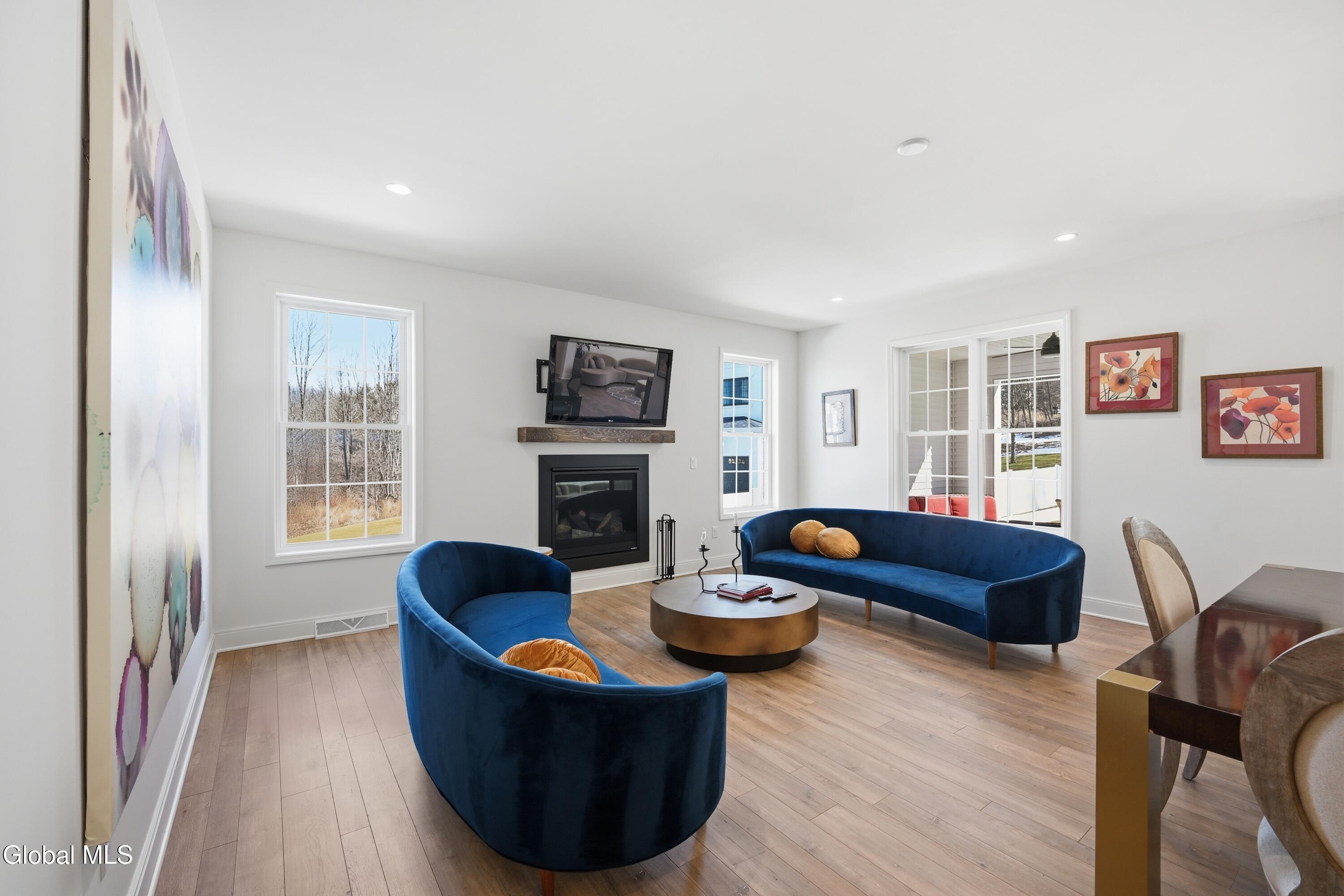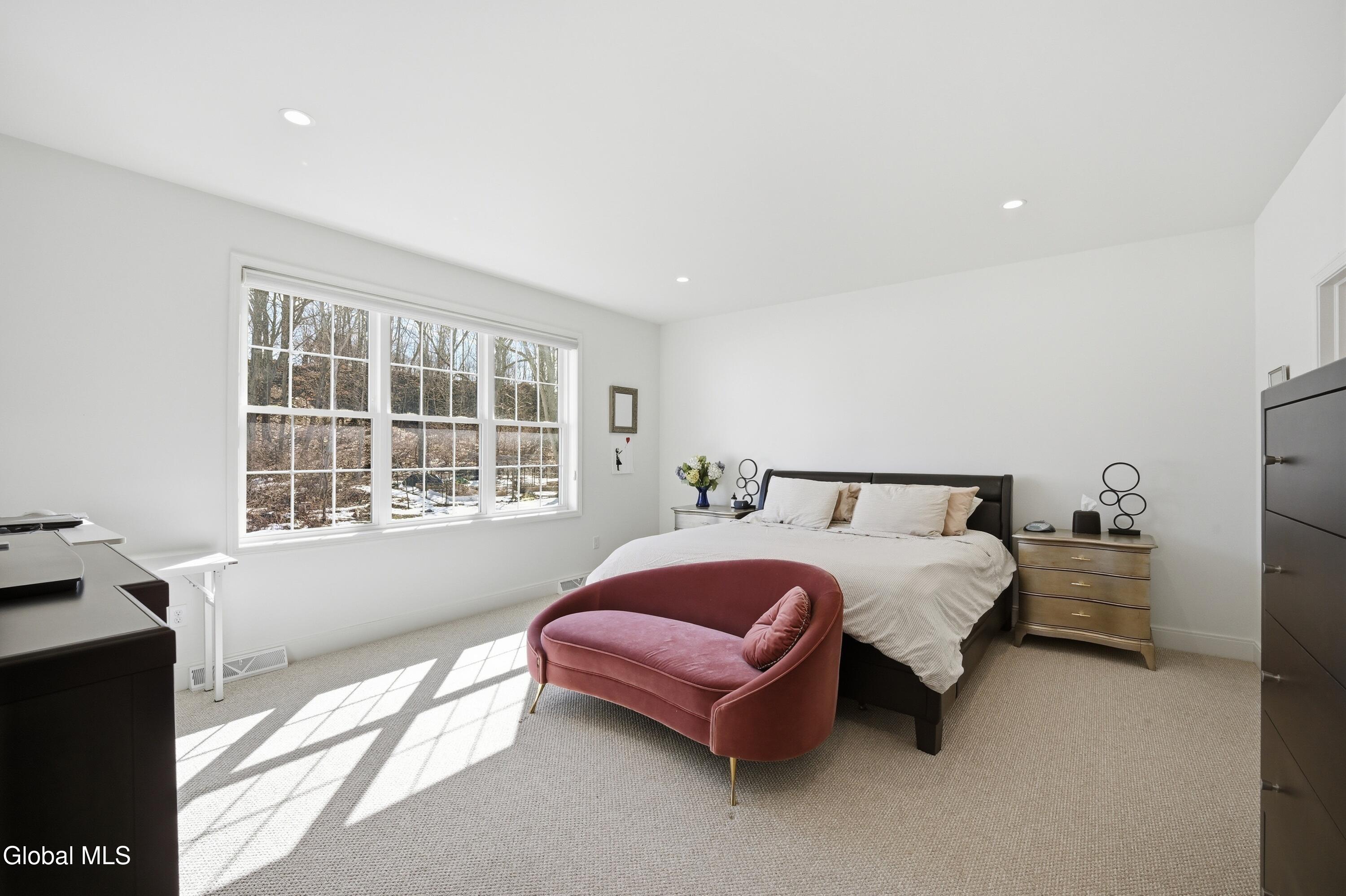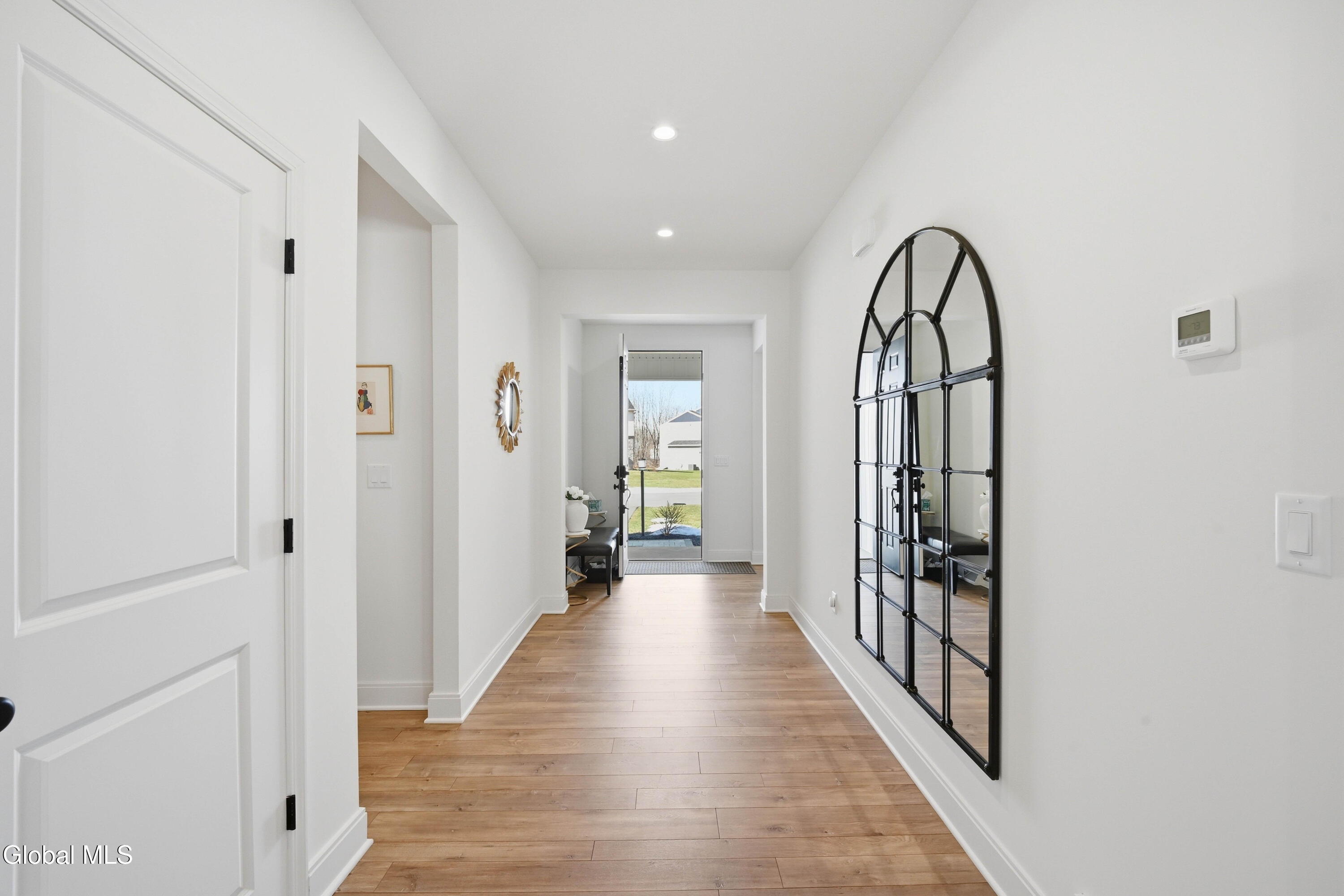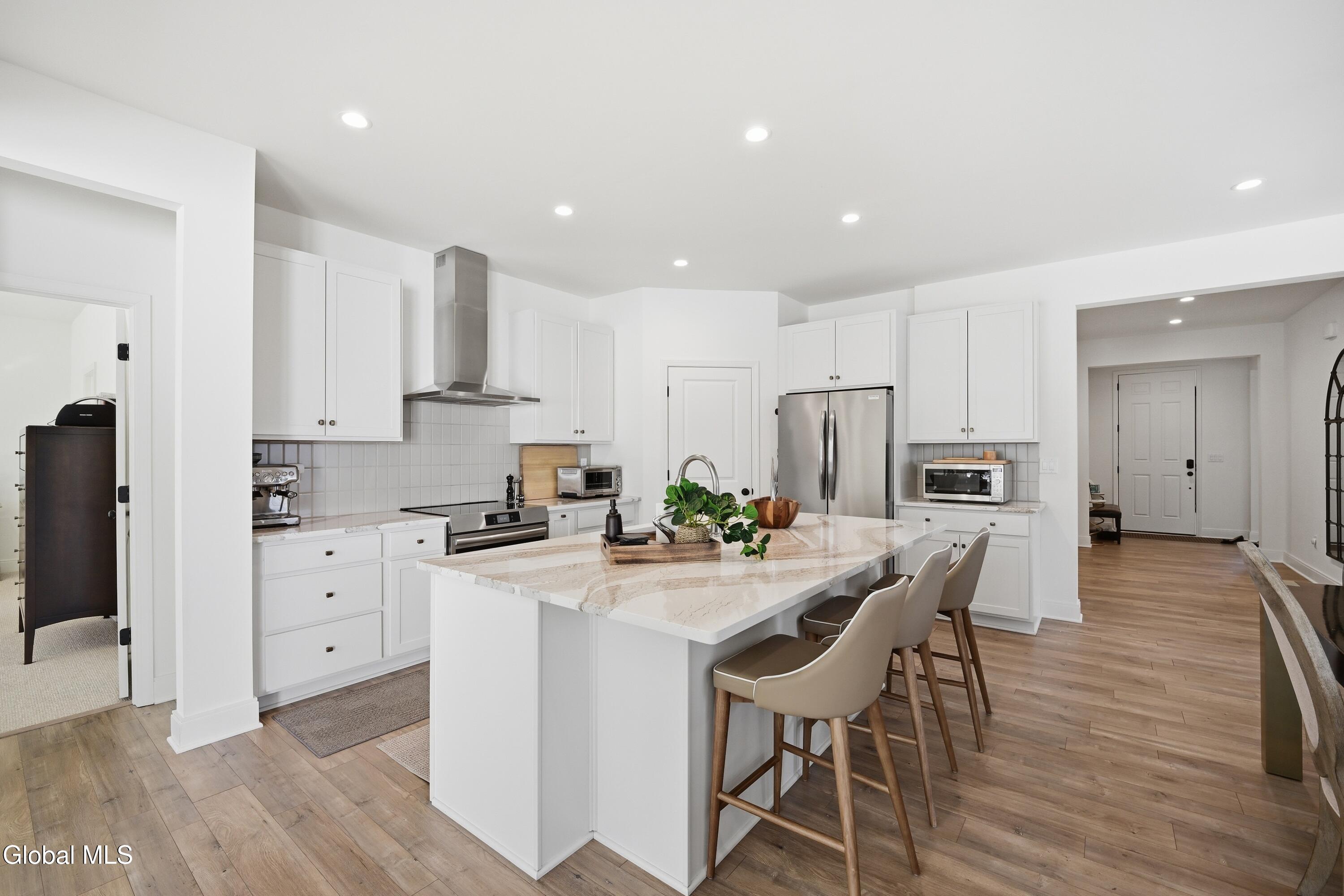 Built in 2024 by Marini Homes, this bright, nearly-new ranch sitting near the end of a quiet cul-de-sac offers over 2,400 sqft of gracious one-floor living. A sparkling cappuccino quartz kitchen with oversized island and induction range anchors the flexible living and dining layout. A sun-filled seating area (or dining room) opens to a covered patio overlooking a private, tree-lined backyard. Four spacious bedrooms extend across three sides of the home, designed for generational living and privacy. The primary suite includes a luxury bath with free-standing tub, separate shower, two vanities and an oversized walk-in closet. The home features two additional full bathrooms, first floor laundry room, full basement, sprinkler system, and a three-car garage with electric vehicle charger. North Colonie Schools.
