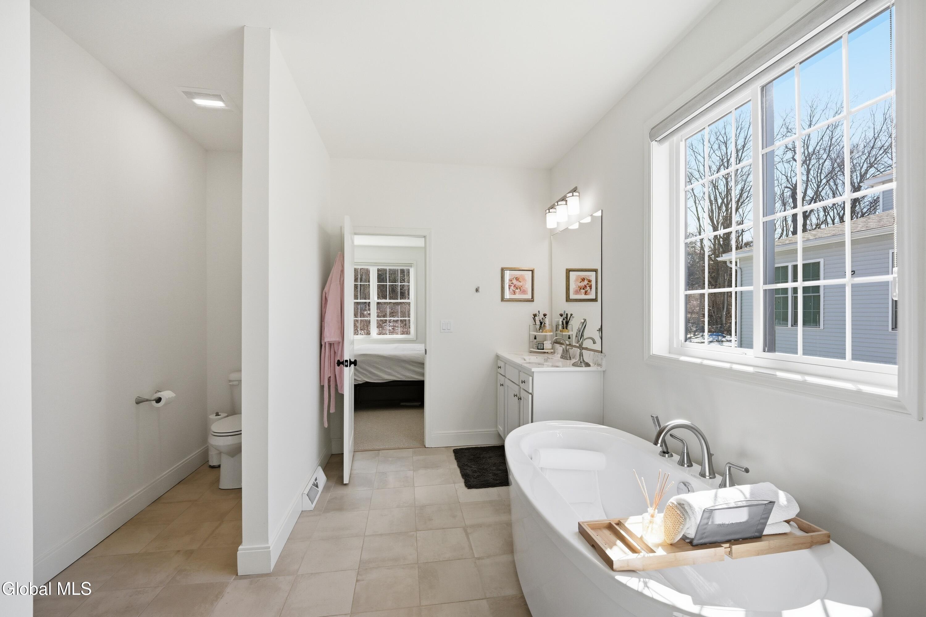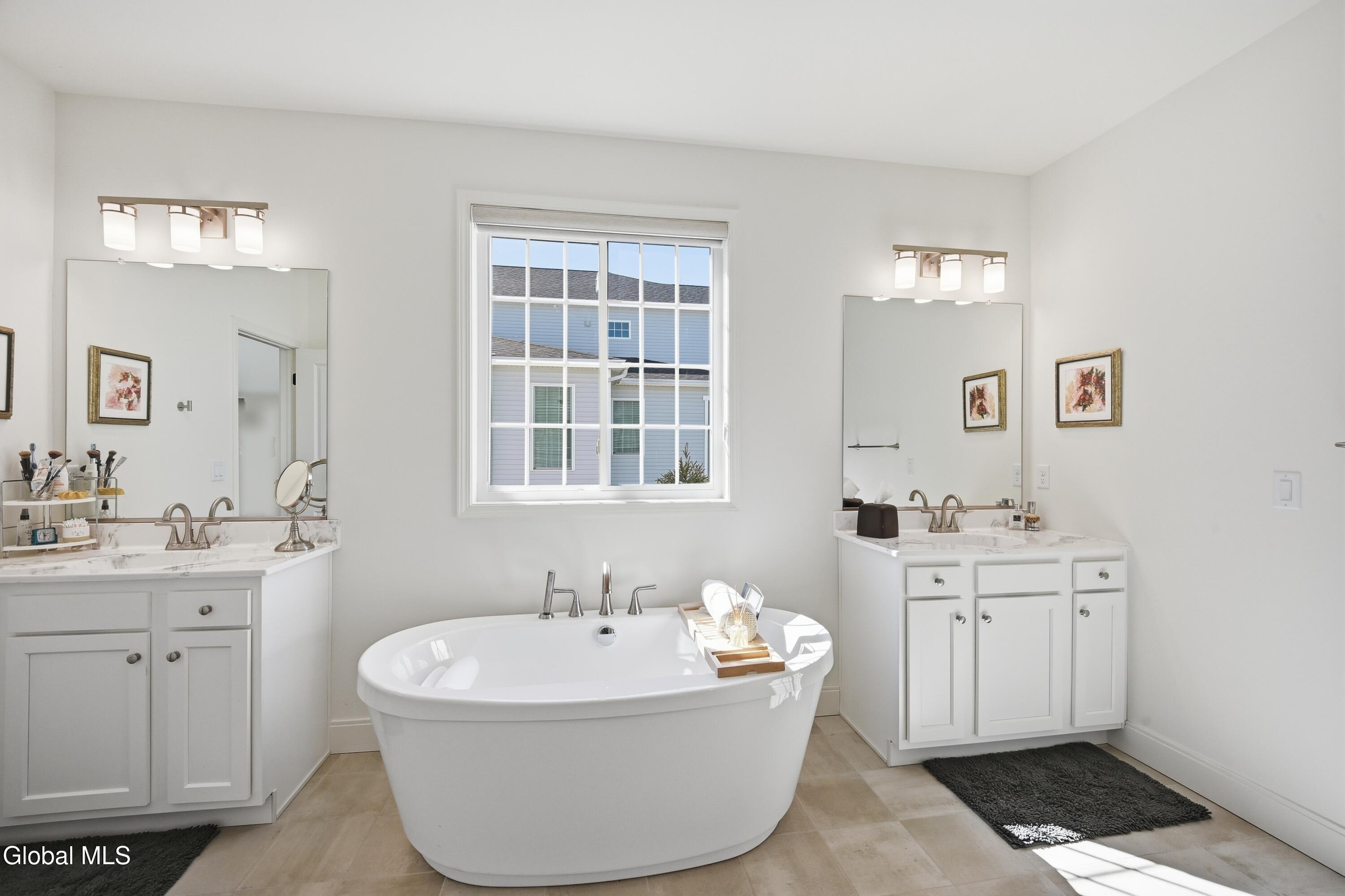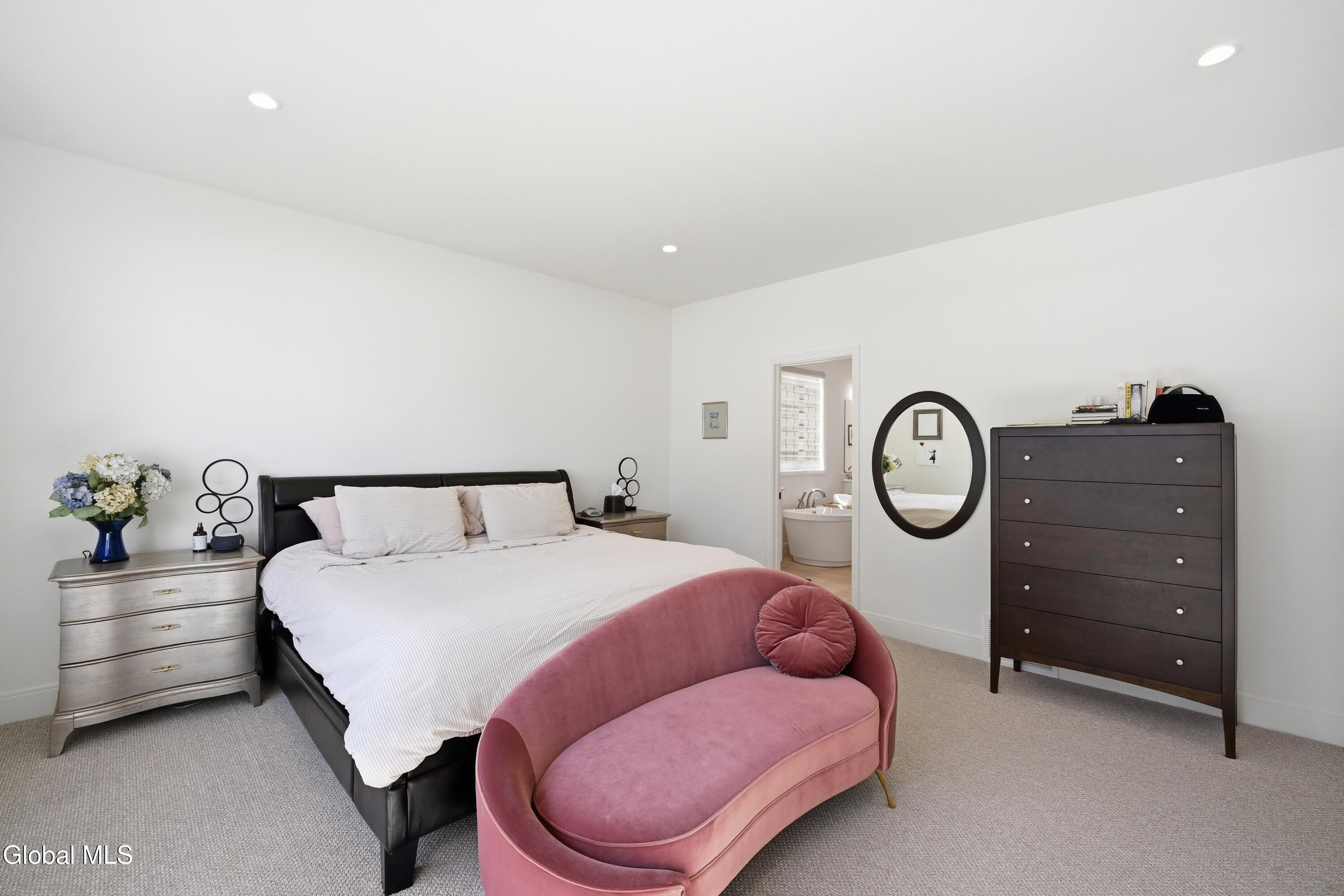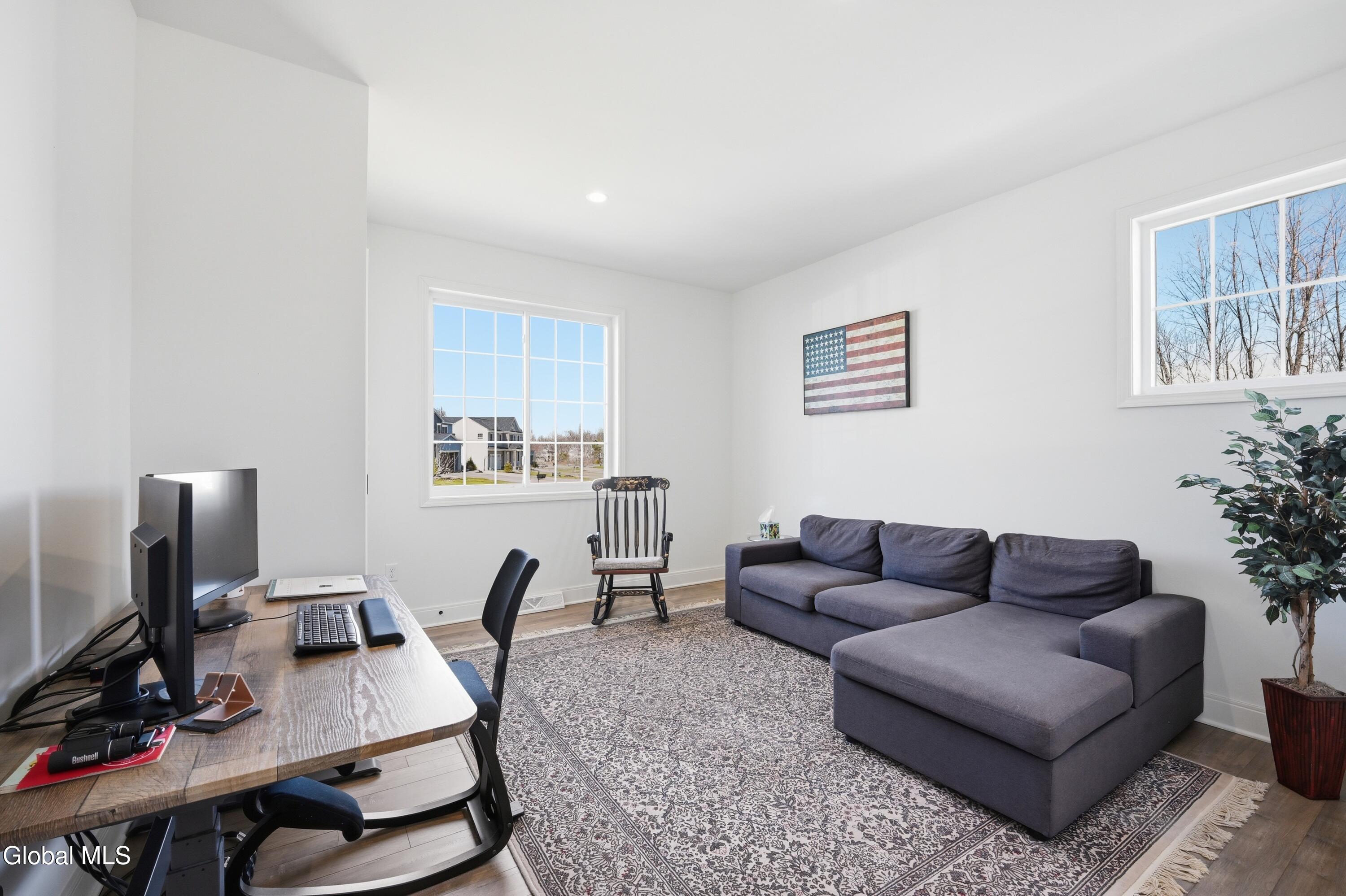 Built in 2024 by Marini Homes, this bright, nearly-new ranch sitting near the end of a quiet cul-de-sac offers over 2,400 sqft of gracious one-floor living. A sparkling cappuccino quartz kitchen with oversized island and induction range anchors the flexible living and dining layout. A sun-filled seating area (or dining room) opens to a covered patio overlooking a private, tree-lined backyard. Four spacious bedrooms extend across three sides of the home, designed for generational living and privacy. The primary suite includes a luxury bath with free-standing tub, separate shower, two vanities and an oversized walk-in closet. The home features two additional full bathrooms, first floor laundry room, full basement, sprinkler system, and a three-car garage with electric vehicle charger. North Colonie Schools.