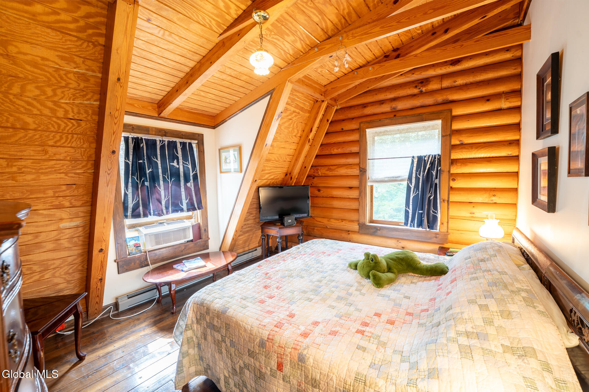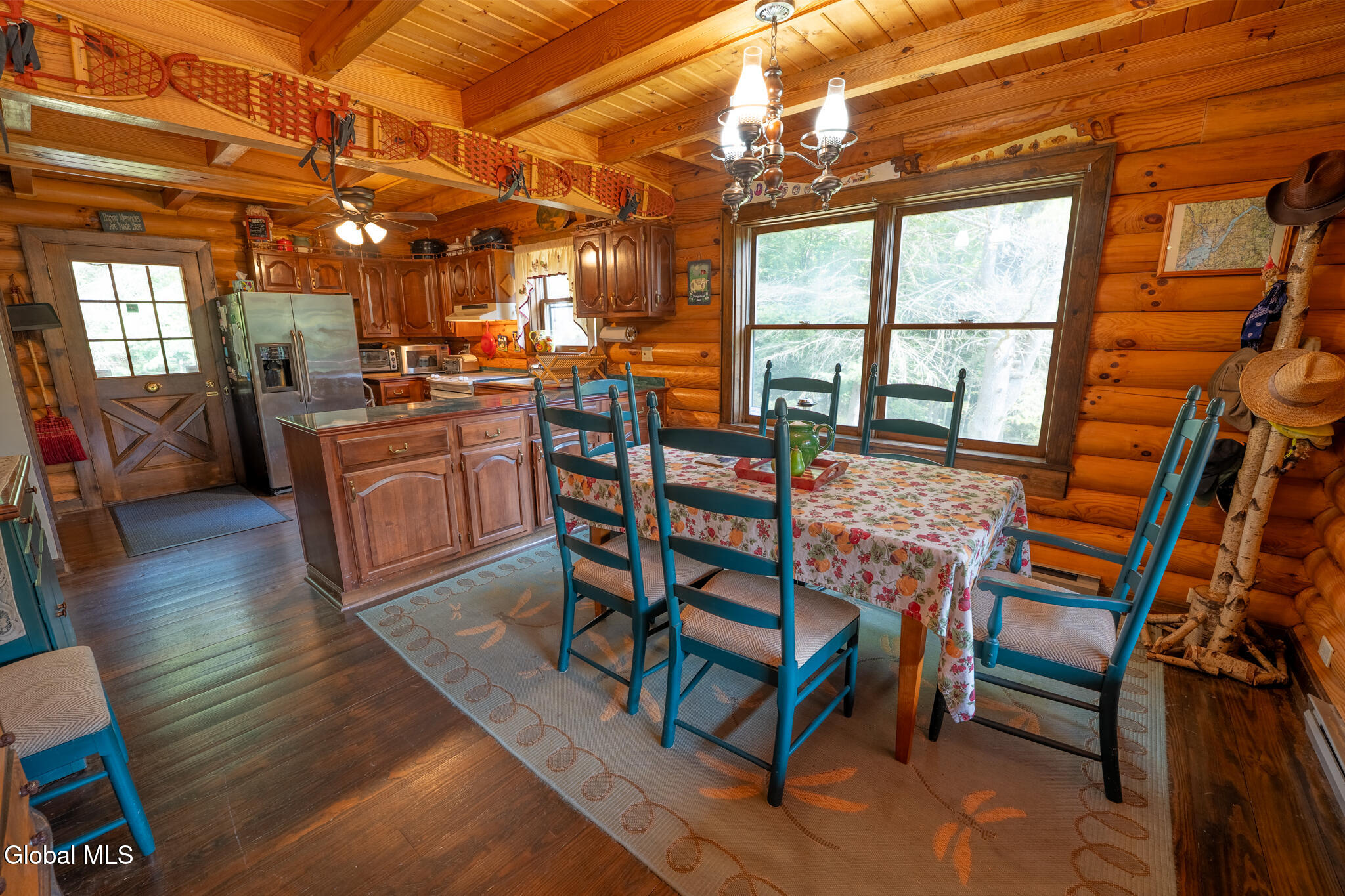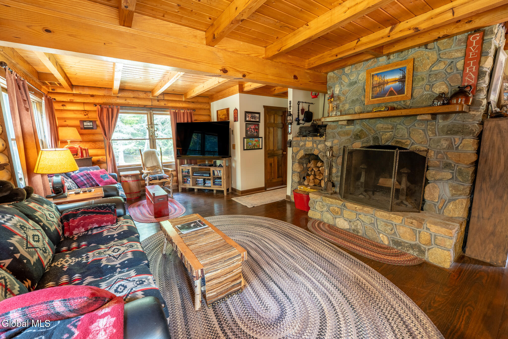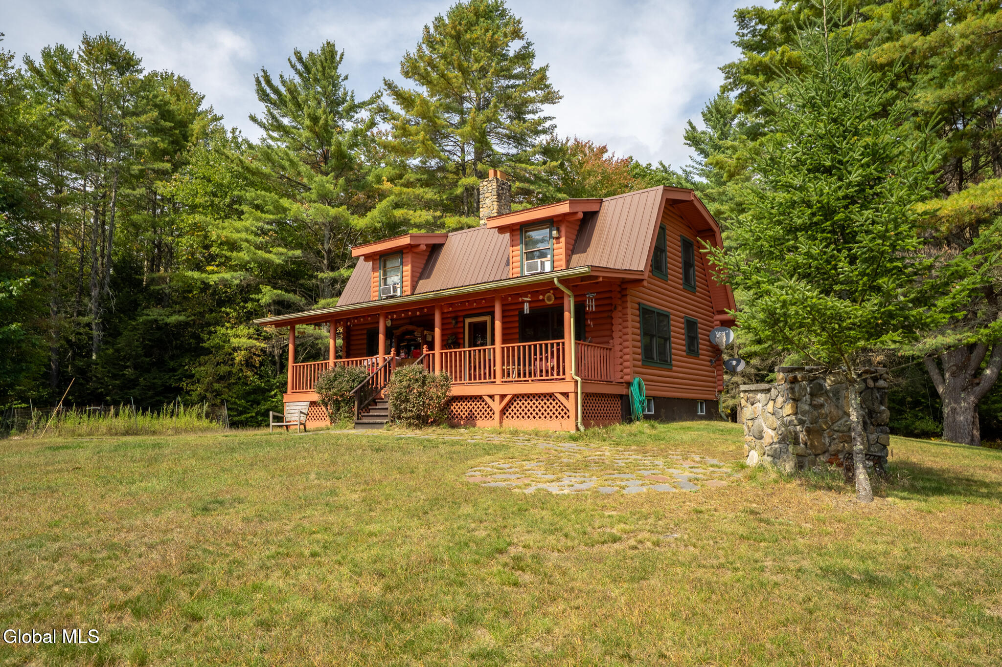 HIGHEST AND BEST OFFERS BY 5PM SATURDAY 10/11 Set on 43 acres, this beautiful year-round log home features rich wood details throughout. Large living room with wood burning stone fireplace and accompanying stone wood bin. Open floor plan for kitchen & dining gives great space for preparing meals and visiting with family and friends at the same time. Centrally located front door opens to a full front porch with a hot tub, and a stone patio just off the porch featuring a stone BBQ! Three bedrooms and two full baths upstairs (plus a half bath downstairs). Private bath for the primary bedroom. Vaulted wood ceilings in all 3 bedrooms. This home sits back from the road with plenty of privacy and 43 acres to explore, including 2 ponds. One car garage under the house plus a shed and small carport as well. In addition to the garage, the basement offers lots of room for storage and a wood stove! EV charging station too! If you're ready to leave the hustle behind and live life with more space and less noise, this one's worth a look. Home is being sold Furnished with a few exclusions for personal items.