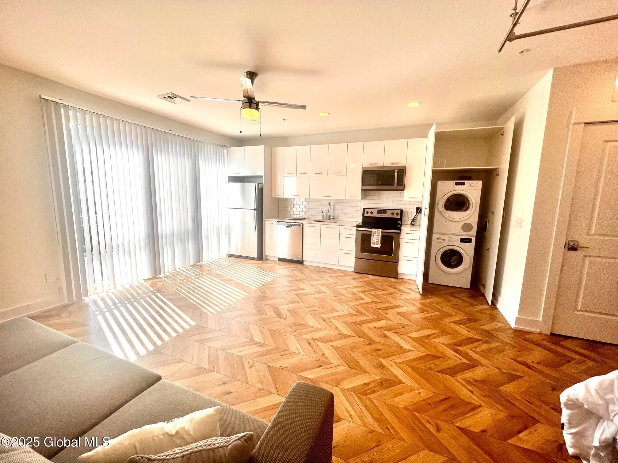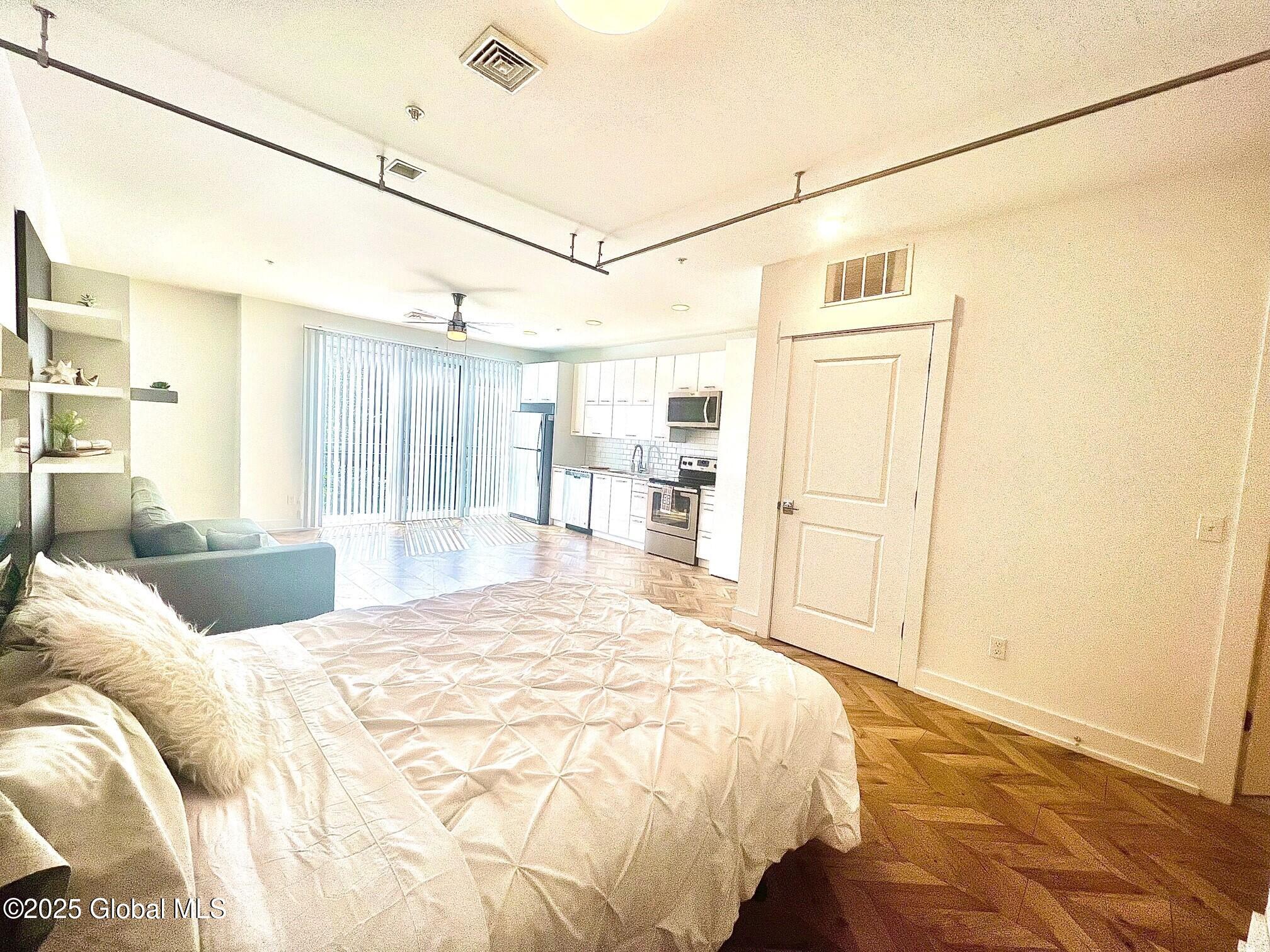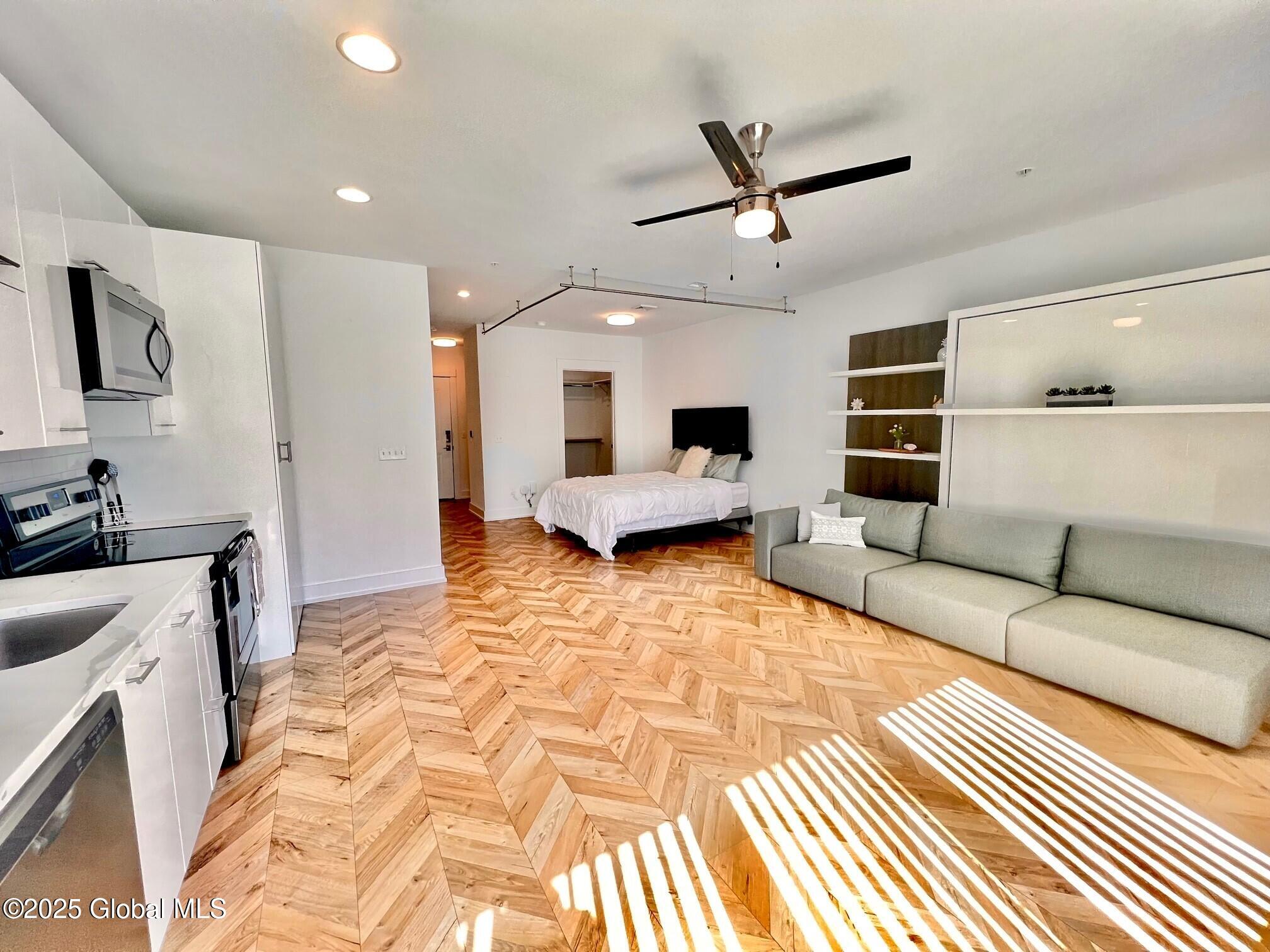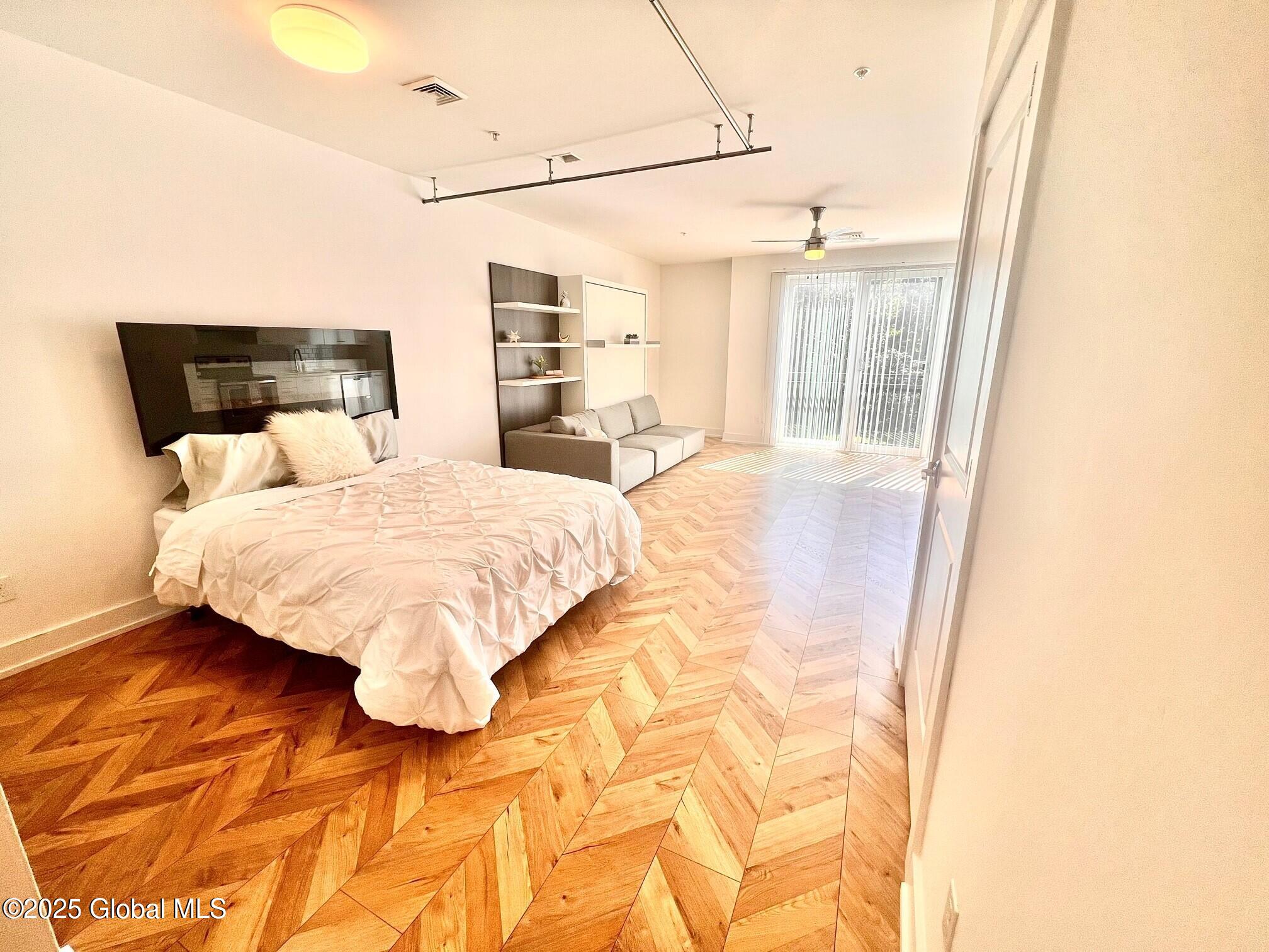 Sunny, modern, beautiful and spacious furnished 1st floor studio available now! This home offers a large sliding glass door, expansive fireplace (electric), herringbone flooring throughout, and sparkling clean quartz kitchen and bath. The space can accomodate king-sized furniture! Murphy bed included! Large walk-in closet with built-ins. Lovely neighborhood close to shopping, Downtown Saratoga Springs - Spring Run Trail, newly connected Greenbelt Trail, and quiet one-way roads all accessible within moments. Pet-friendly (fees apply) up to two well-behaved pets allowed. Easy application process can be completed online; virtual tours available. Includes internet, smart home, doorstep trash removal, flex lease terms available. Garage available $85/mth, storage units start at $25/month.