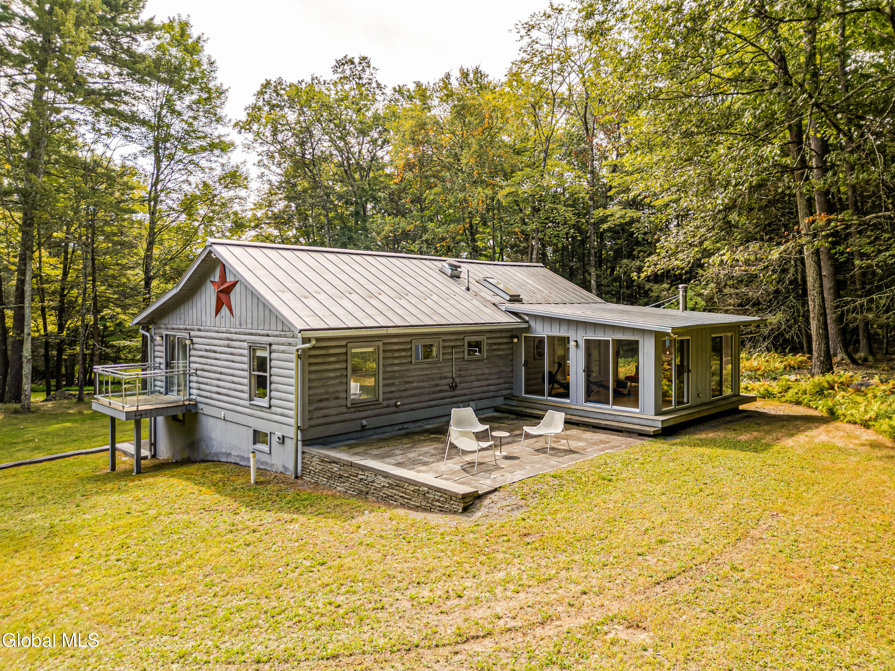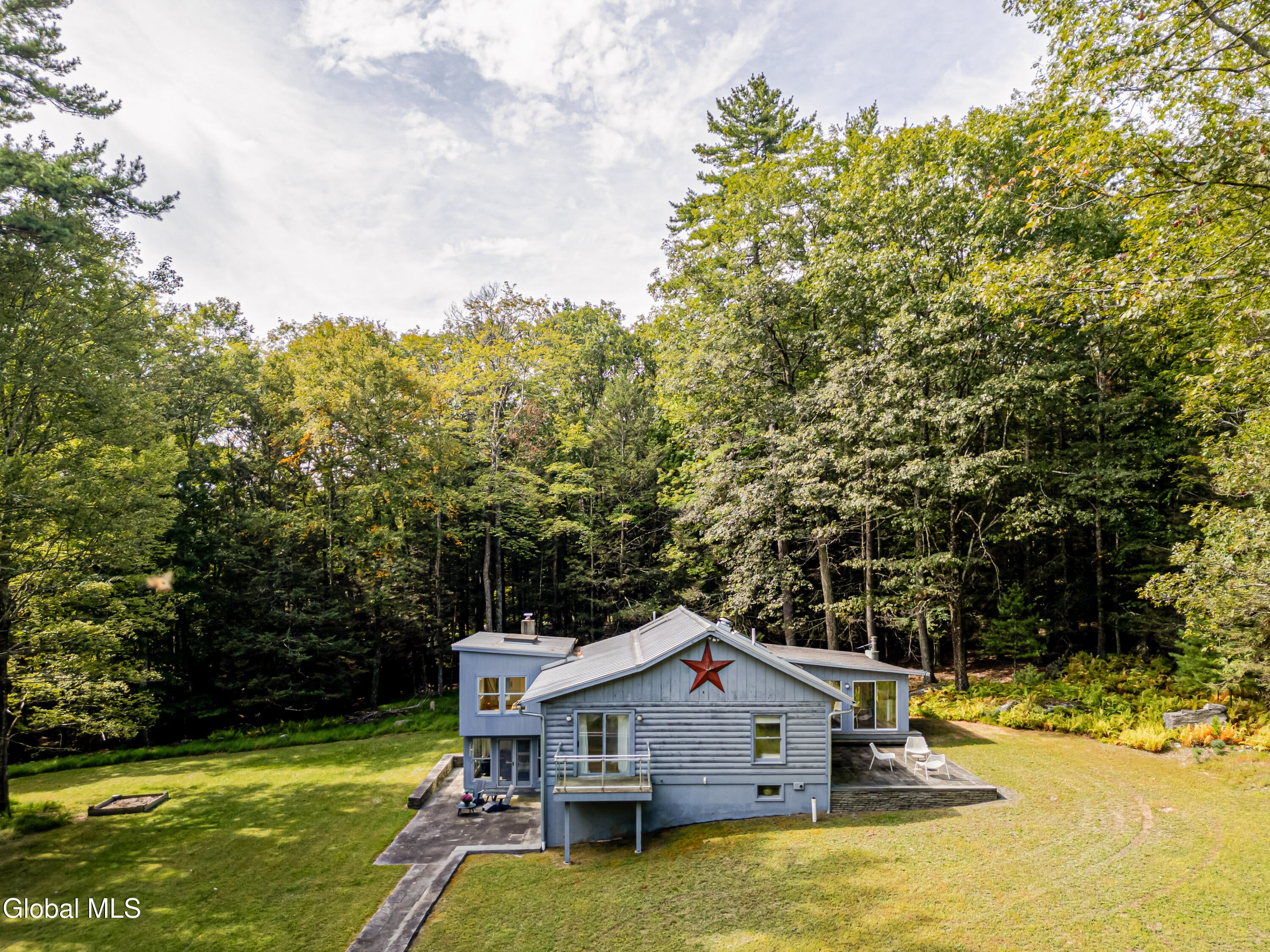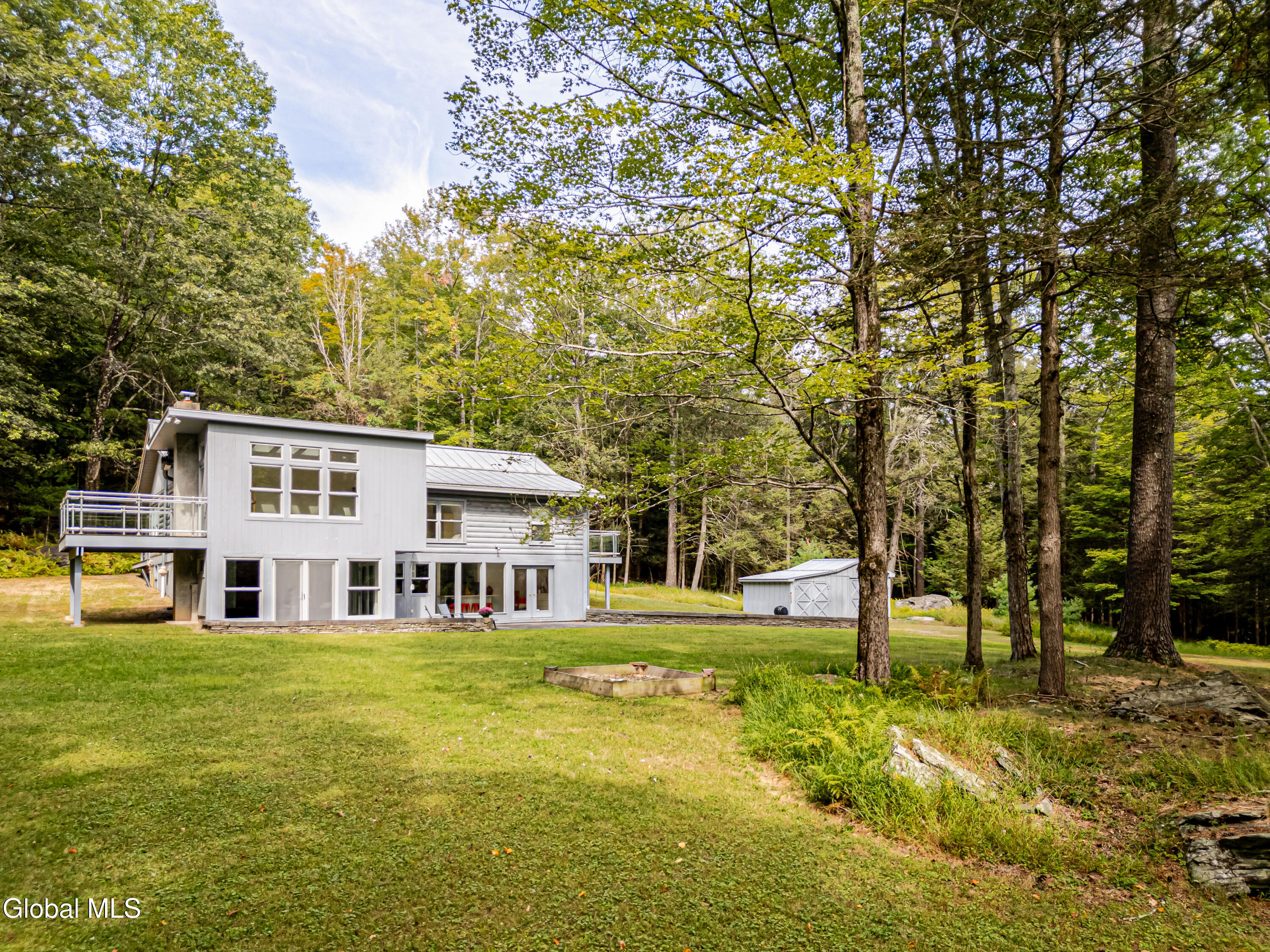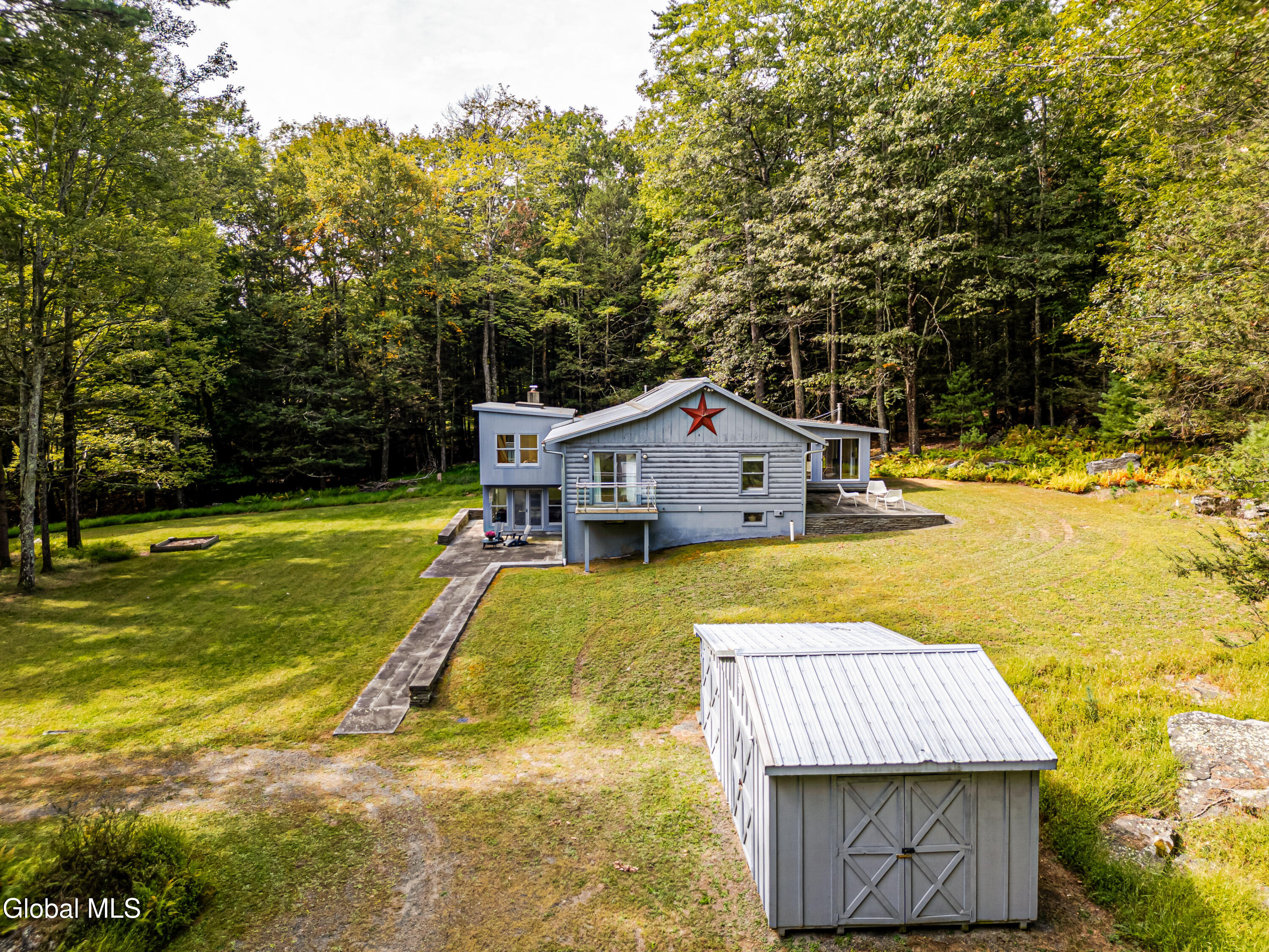 Welcome to Fawn House, a modern rustic retreat in evolving Accord, celebrated for its rural tranquility and sophisticated amenities. Sitting quietly on over 28 acres across two parcels, this property offers privacy, peace, and an effortless connection to nature. Walls of glass and a Scandinavian-inspired design fill the 3,055-square-foot residence with natural light, creating a warm and welcoming atmosphere. The first floor is designed for gathering, with an open kitchen, dining, and living area at its center. A den with a wood stove provides a cozy retreat in cooler months, while a full bath, laundry room, and storage room add comfort and convenience. Upstairs, a vaulted great room opens to a sunroom with another wood stove, perfect for watching the seasons unfold. The spacious primary suite is complemented by two additional bedrooms, a study, and two full baths, balancing private space with areas for work or guests. Decks and bluestone patios extend the living space outdoors, ideal for entertaining or unwinding among the quiet beauty of the landscape. The property consists of two parcels: The home sits on 4.89 acres with a shed and an oversized garage that offers abundant storage and flexible possibilities. The adjoining 23.5-acre parcel remains undeveloped, preserving a serene backdrop while offering potential for future expansion or long-term conservation. Though tucked away, the location is minutes from farm-to-table favorites like Westwind Orchard, Accord Market, Saunderskill Farm and Ravenwood, along with the member's club, spa, and restaurant at Inness. The nearby towns of Stone Ridge, High Falls, and New Paltz offer additional shops and dining, while Minnewaska State Park and Mohonk Preserve are close at hand for endless outdoor adventure. This rare Hudson Valley offering combines modern design, expansive acreage, and a prime location, making it an exceptional retreat or full-time residence.