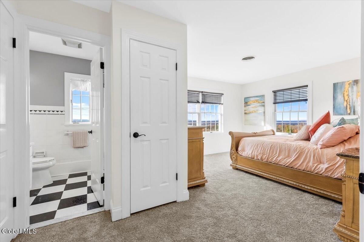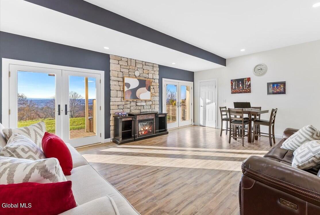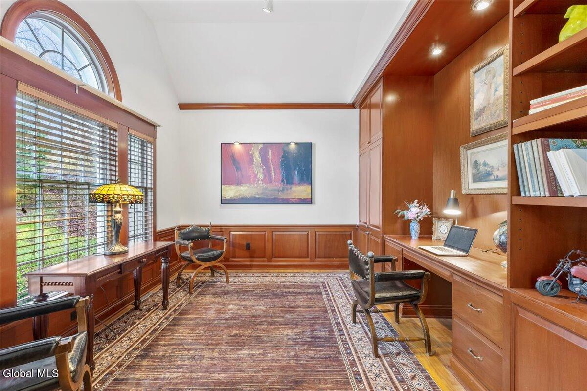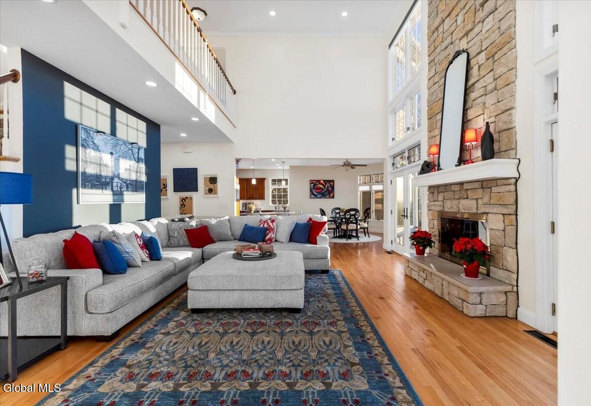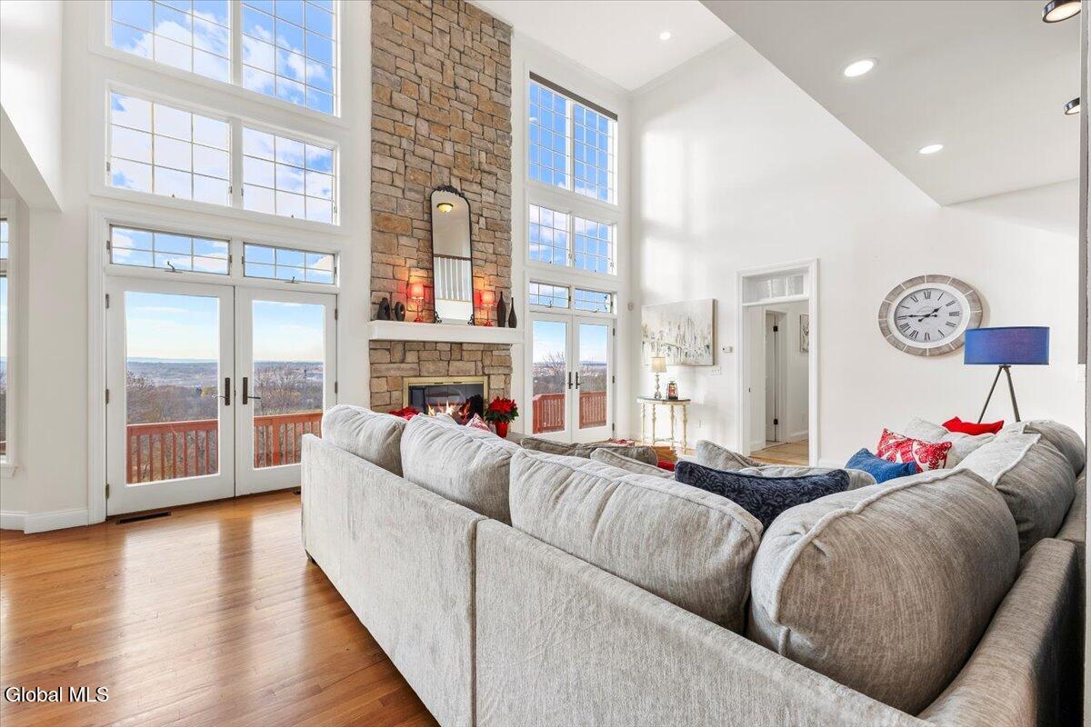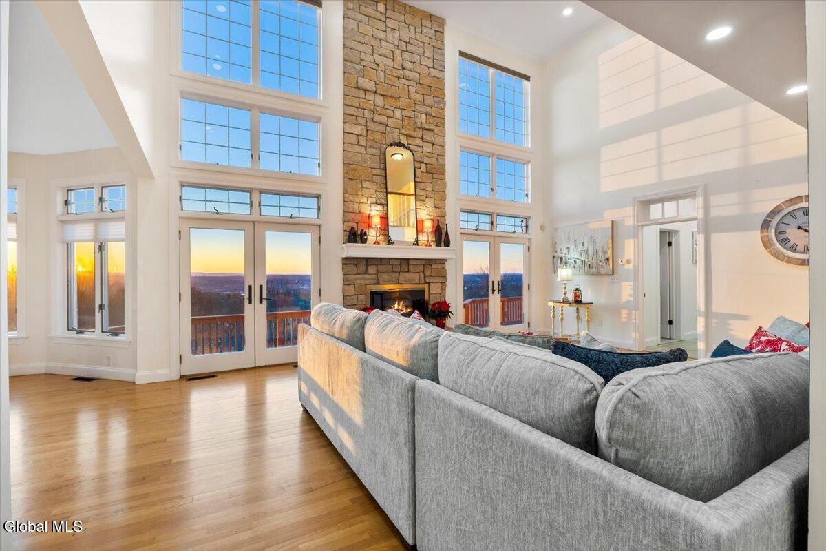Look at me now! A major makeover—ready for entertaining and family celebrations. From sunrise to sundown, expansive windows keep the Hudson River, Frear Park Golf Course, and Downtown Troy in view. Step into 30 Arabia through a welcoming foyer to a formal living room and a private office lined with full-wall built-ins for a polished, library feel. Continue to the formal dining room, then the home opens to a soaring two-story great room with a stacked-stone fireplace and French doors to the wraparound deck. The view-filled eat-in kitchen shines with new countertops, and a first-floor laundry sits nearby. Two stairways—from the foyer and the great room—lead up to five bedrooms and three full baths: the primary suite steals the show with picture windows, a soaking tub, walk-in closet, and private bath; a second view bedroom enjoys its own smaller ensuite; the remaining bedrooms share a classic Jack-and-Jill. A finished walkout lower level adds bright, flexible space. Updates include a new roof, whole-home paint (with an epoxy-finished garage floor), all-LED lighting, and new carpet upstairs. Outside, improved drainage, refreshed landscaping, and an area prepped for a future infinity-style pool complete. 30 Stone Arabia, perched above it all, with a never-ending horizon. OPEN HOUSE: 11/23/25 11:00-1:00