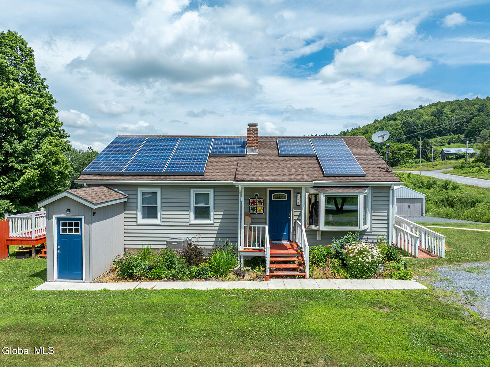 Light-filled ranch on 6 spacious acres! This inviting home features an open-concept layout with an updated kitchen with dining area, and spacious living room with a sunny bay window. The main level offers three comfortable bedrooms and a full bath with laundry. A stunning sunroom leads to a large, partially covered deck—perfect for relaxing or entertaining. The mostly finished walk-out basement includes a furnished 1-bedroom apartment, ideal for intergenerational living or as an income rental. Additional features include a new AC/heat pump, transferable leased solar panels for energy efficiency, a 16'x48' pole barn with parking for two vehicles and extra storage, a storage shed, and a large open field. Conveniently located to cultural & recreational attractions in Southern VT & NW Mass.