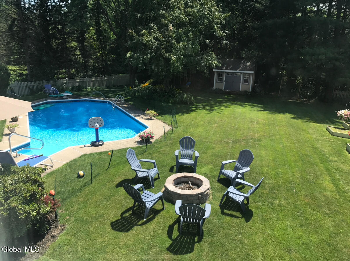 Welcome to this sprawling classic Colonial nestled in the desirable Crossroads neighborhood! Step inside to find a bright, open floor plan featuring beautiful hardwood floors and soaring cathedral ceilings. A spacious elevated family room offers the perfect gathering space for relaxing or entertaining. The granite kitchen blends style and function with ample cabinetry, counter space, and natural light. Upstairs, the spacious primary suite provides a private retreat with an updated spa-inspired bath showcasing a double-sink vanity and beautifully tiled walk-in fully enclosed steam shower with bench. Enjoy outdoor living at its best on your private, tree-lined ½-acre lot complete with an heated inground pool—(Heater only 5 years old, Pool Cover only 1 year old) perfect for summer fun and entertaining. Combining timeless character with modern comfort, this home offers the ideal balance of space, privacy, and location within the highly regarded Bethlehem School District. A true gem in one of the area's most sought-after neighborhoods!