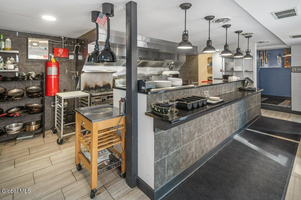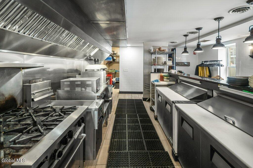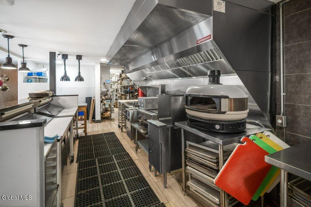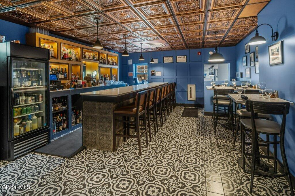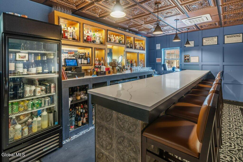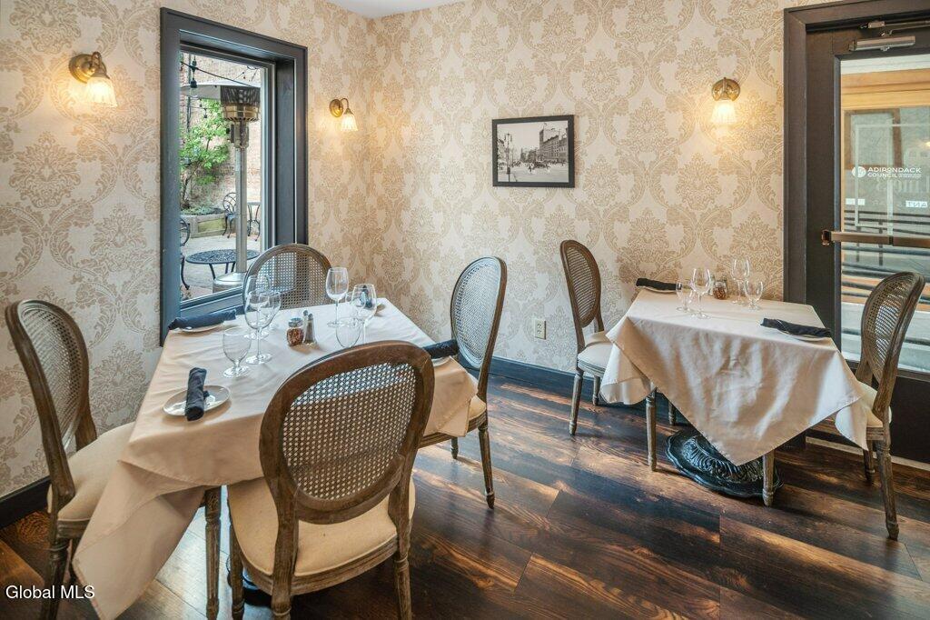 This hip, urban, center square location is a brick, 1920's built, zoned R2C which means it can stay commercial or be used single family or two family residential. Completely rebuilt from the interior with new wiring, and electrical panel, heating and AC updated, concrete footings added, resurfaced facade patio side, extremely private courtyard, new blacktop alleyway, new roof on entire building, inside new sheet rocked walls, fully insulated, new flooring, tile in the kitchen, bar and bathrooms, granite in kitchen and bar areas, high end tables and chairs, commercial grade appliances, laundry space, office perfect for a small restaurant operation. Conveniently located to everything downtown Albany.