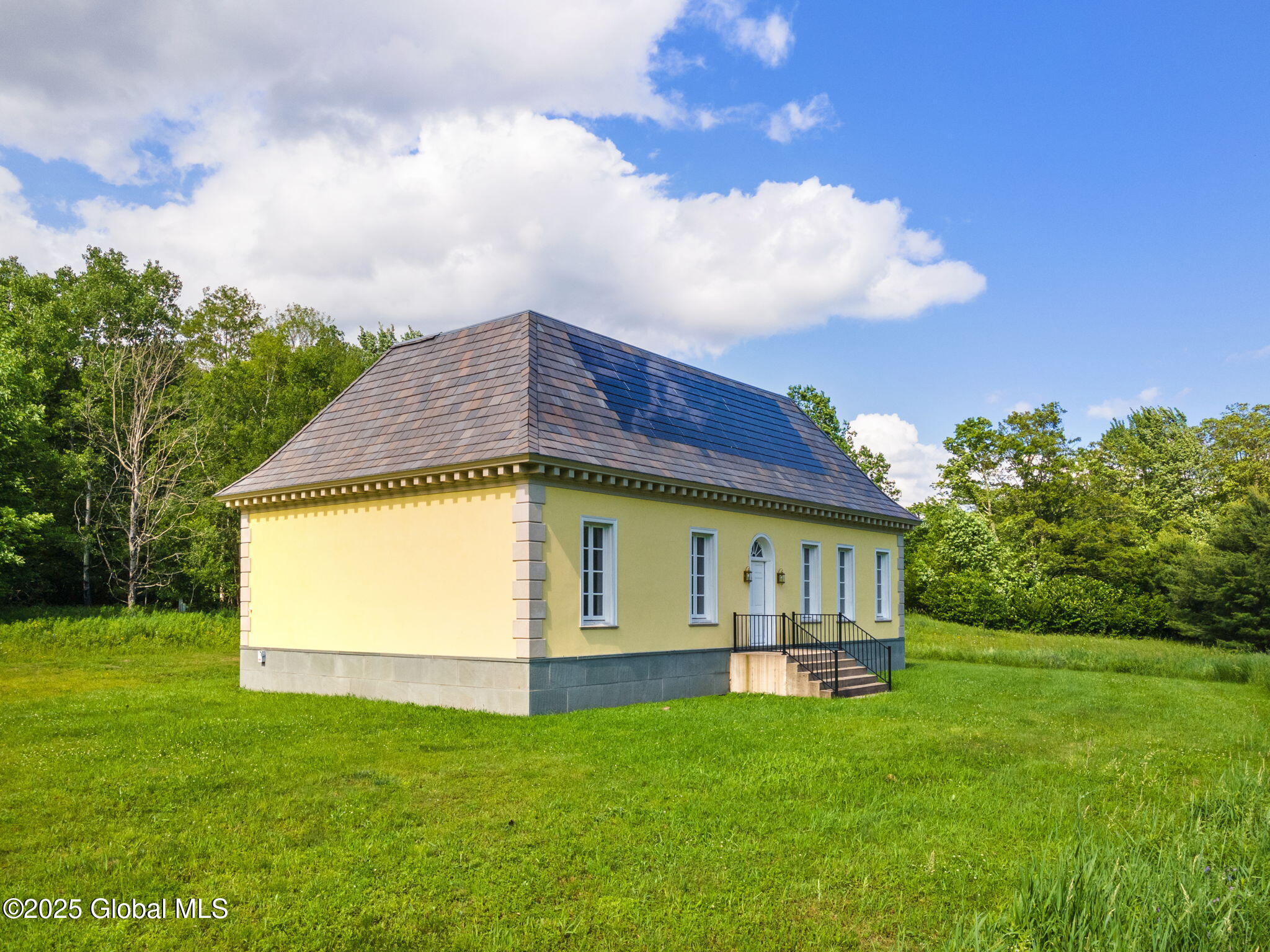 Nestled on 47 secluded acres with a large swimming pond, this one-of-a-kind property blends Old World architectural charm with modern sustainability. Originally built as an art gallery/studio, the structure features influences from English, French, and German design—including elements inspired by West Woodhay House, the Kensington Orangerie, and Sanssouci Palace. Inside, soaring ceilings, hardwood floors, and oversized windows create a grand, light-filled space. Eco-conscious touches include geothermal heating and embedded solar tiles. Surrounded by elm and lime trees, hedgerows, and David Austin roses, this extraordinary space offers endless potential for a private retreat, creative business, or dream residence.