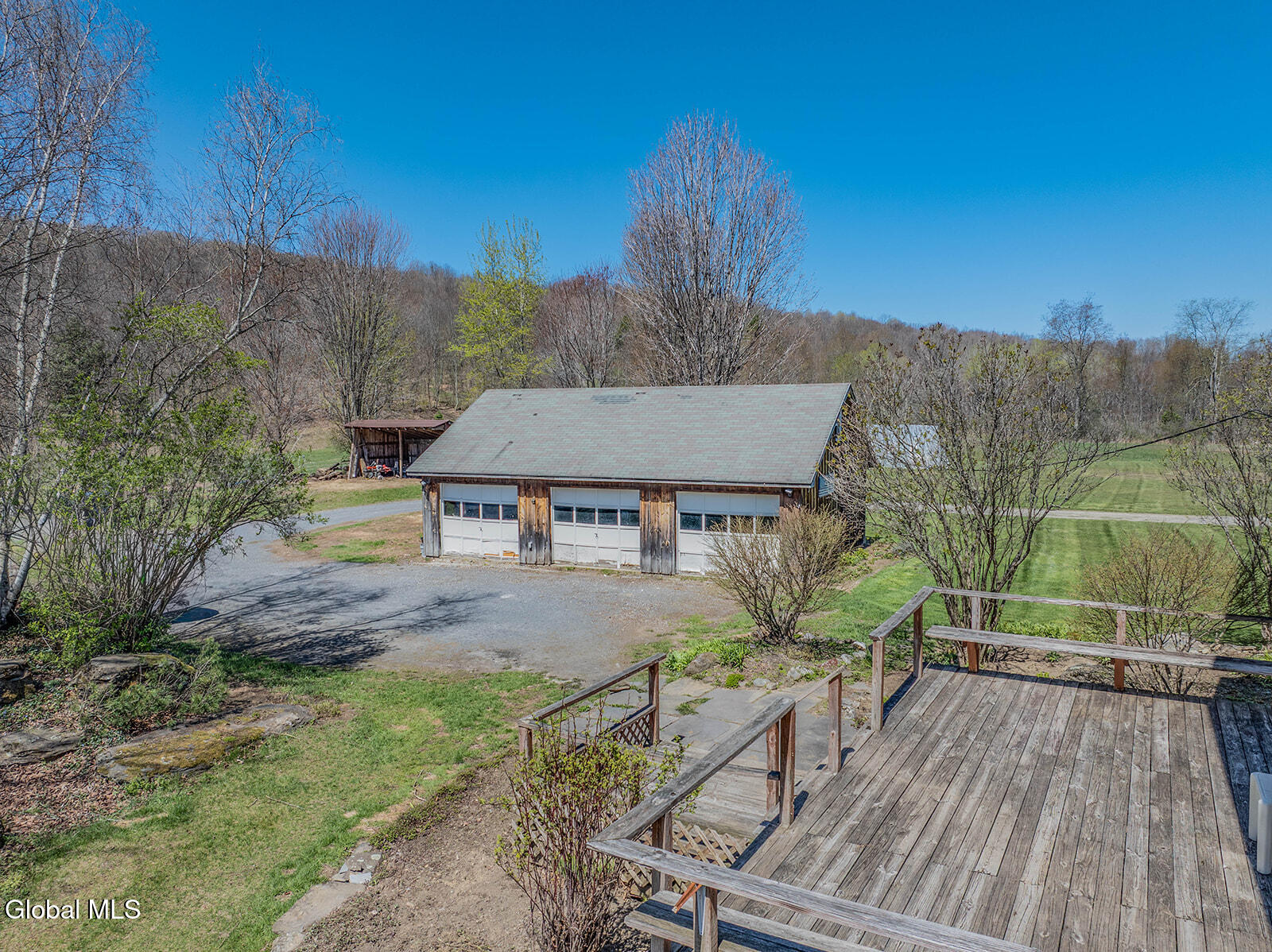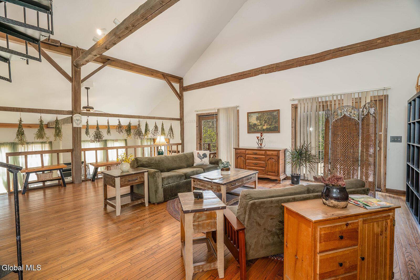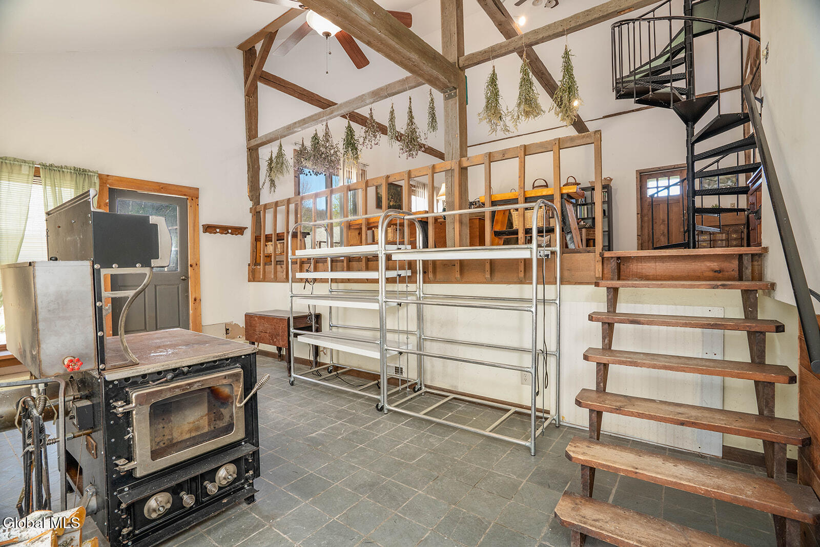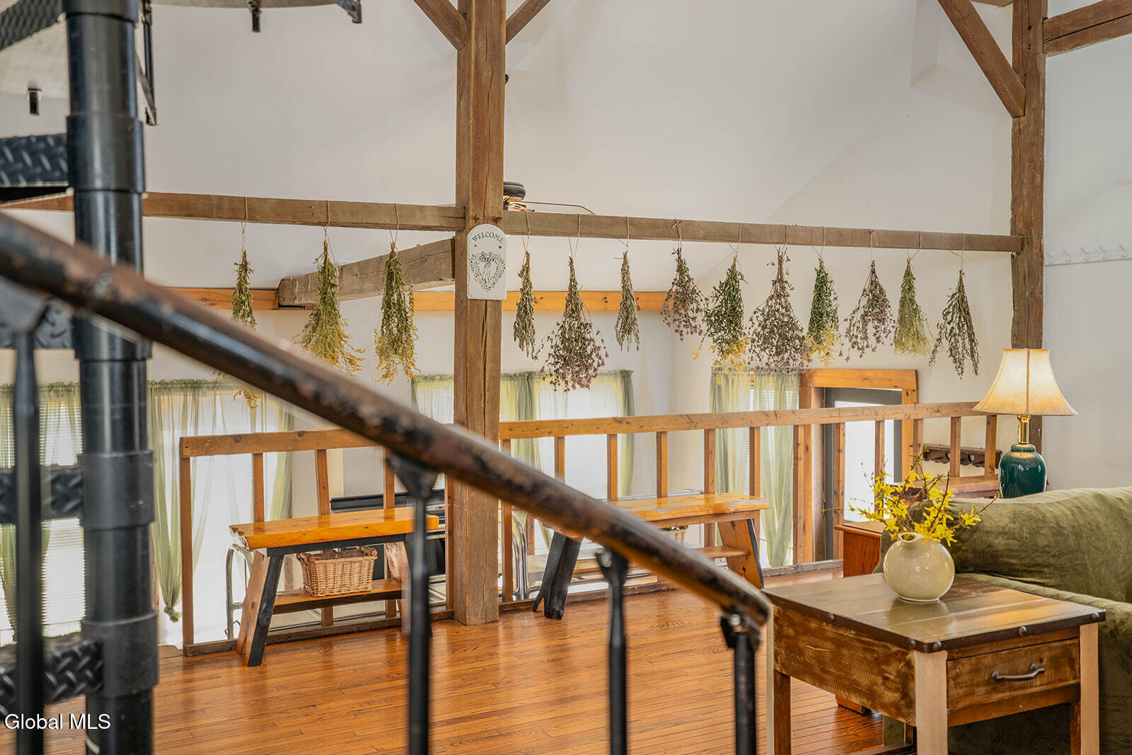 Dramatic and full of character, this striking barn conversion offers rustic charm and thoughtful functionality set on 15.74 beautiful acres. Soaring ceilings, stunning exposed beams, and expansive windows and glass doors flood the home with natural light. A focal point is the impressive Great Room with cathedral ceilings and a spiral staircase leading to a second-floor loft with a bedroom and full bath--an ideal retreat for guests or a private workspace. A sun-drenched mudroom with tiled flooring provides the perfect spot for muddy boots or starting seedlings or tending to plants year-round. Please note: the existing woodstove is excluded, and the chimney needs repair. French doors lead into a bright dining room framed by oversized windows, accompanied by a spacious kitchen and pantry closet. The primary suite offers a peaceful escape with a full bath and its own private sitting deck, while two additional bedrooms, another full bathroom, and a laundry room provide ample space. Step outside to a rear deck overlooking established perennial beds and manicured grounds featuring medicinal herb gardens, berry bushes, and a firepit for relaxing evenings under the stars. The greenhouse is negotiable, offering even more potential for those with a green thumb. Perfectly suited for an agrarian or self-sufficient lifestyle, the property includes a mix of open meadow and wooded land with trails ideal for hiking and mountain biking, all within a vibrant farming community. A three-car garage with storage loft and attached chicken coop adds to the versatility. Enjoy efficient living with a wood boiler and large woodshed, complemented by an oil-fired hot air furnace in the basement for backup heat when needed. Although some TLC is needed, this is a truly special opportunity to embrace country living without compromising on comfort or character.