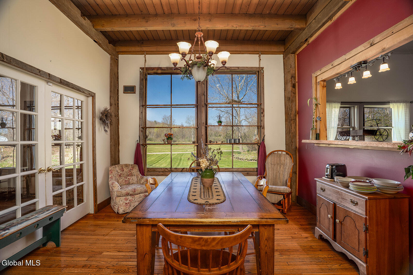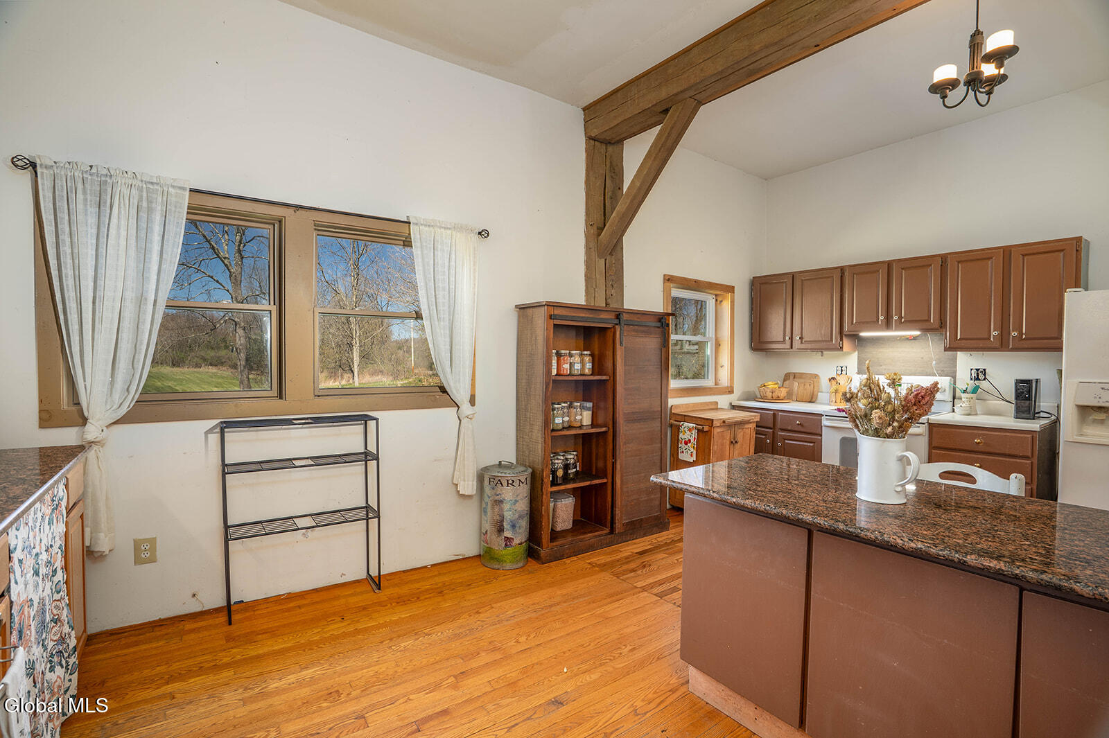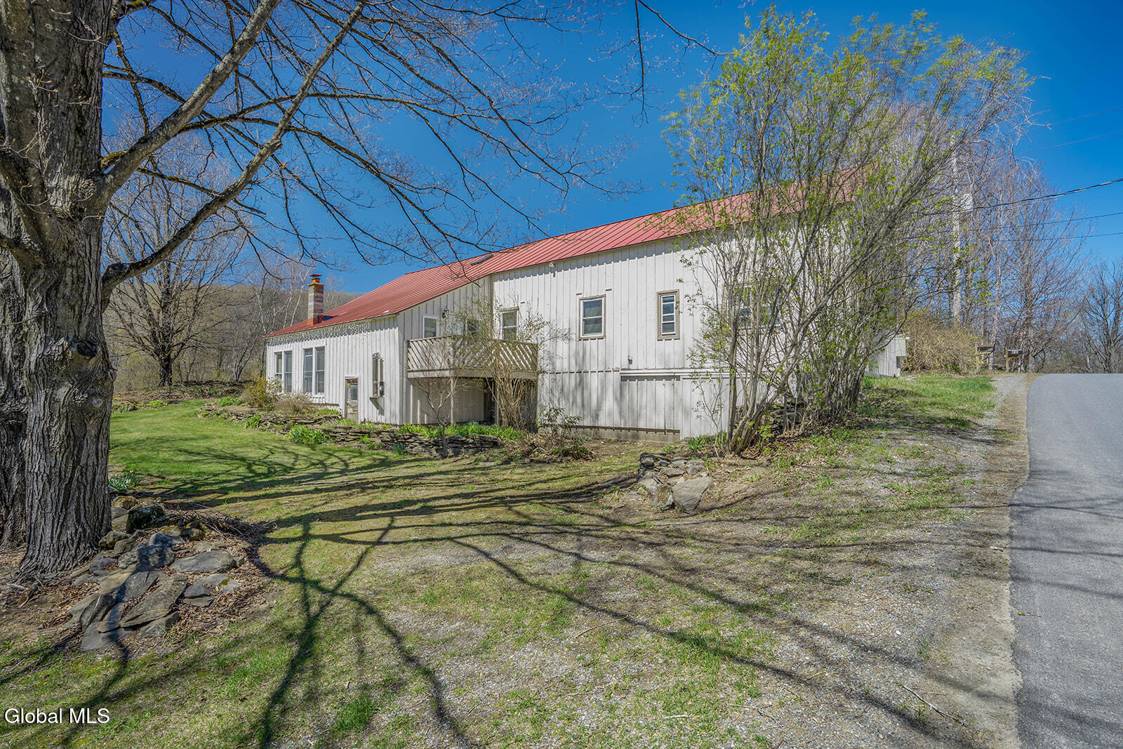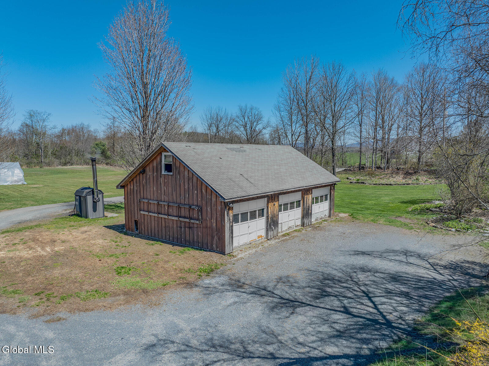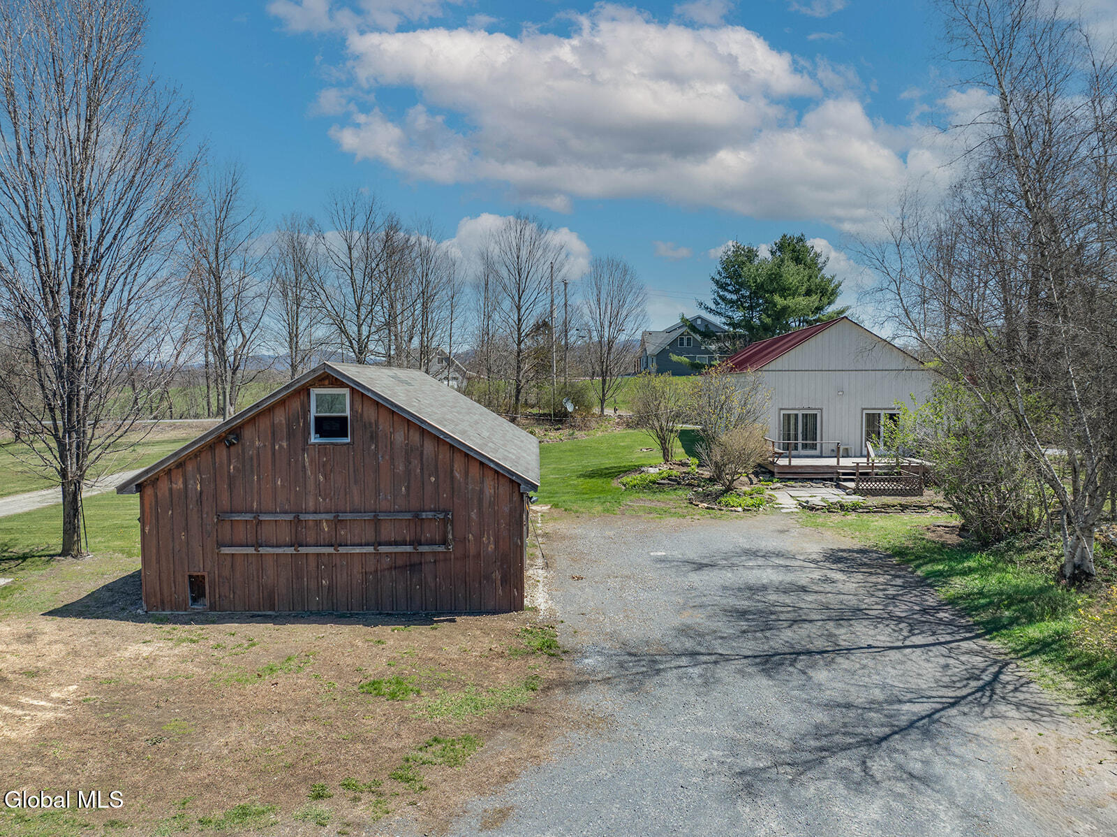Dramatic and full of character, this striking barn conversion offers rustic charm and thoughtful functionality set on 15.74 beautiful acres. Soaring ceilings, stunning exposed beams, and expansive windows and glass doors flood the home with natural light. A focal point is the impressive Great Room with cathedral ceilings and a spiral staircase leading to a second-floor loft with a bedroom and full bath--an ideal retreat for guests or a private workspace. A sun-drenched mudroom with tiled flooring provides the perfect spot for muddy boots or starting seedlings or tending to plants year-round. Please note: the existing woodstove is excluded, and the chimney needs repair. French doors lead into a bright dining room framed by oversized windows, accompanied by a spacious kitchen and pantry closet. The primary suite offers a peaceful escape with a full bath and its own private sitting deck, while two additional bedrooms, another full bathroom, and a laundry room provide ample space. Step outside to a rear deck overlooking established perennial beds and manicured grounds featuring medicinal herb gardens, berry bushes, and a firepit for relaxing evenings under the stars. The greenhouse is negotiable, offering even more potential for those with a green thumb. Perfectly suited for an agrarian or self-sufficient lifestyle, the property includes a mix of open meadow and wooded land with trails ideal for hiking and mountain biking, all within a vibrant farming community. A three-car garage with storage loft and attached chicken coop adds to the versatility. Enjoy efficient living with a wood boiler and large woodshed, complemented by an oil-fired hot air furnace in the basement for backup heat when needed. Although some TLC is needed, this is a truly special opportunity to embrace country living without compromising on comfort or character.