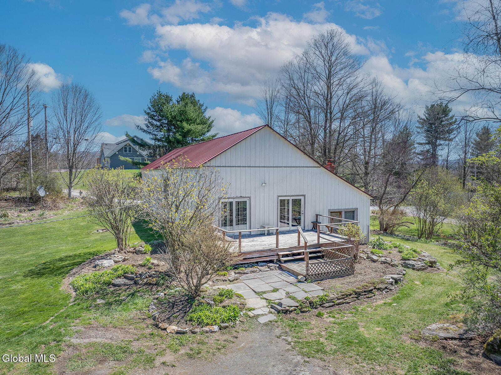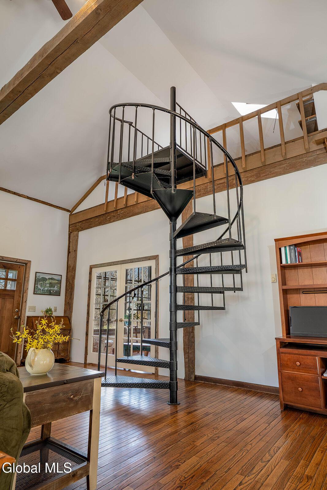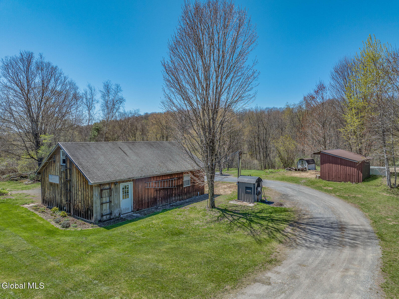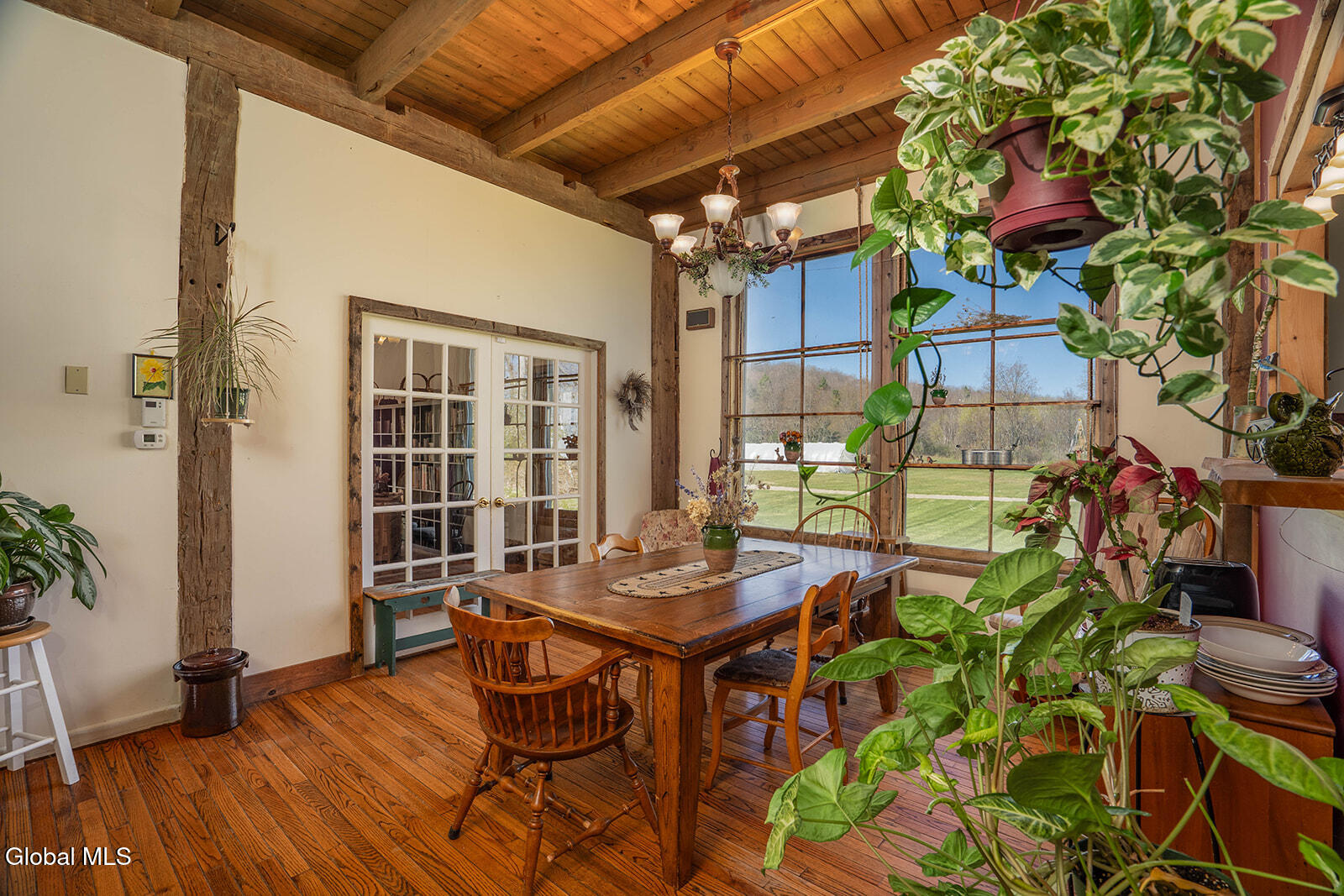 Dramatic and full of character, this striking barn conversion offers rustic charm and thoughtful functionality set on 15.74 beautiful acres. Soaring ceilings, stunning exposed beams, and expansive windows and glass doors flood the home with natural light. A focal point is the impressive Great Room with cathedral ceilings and a spiral staircase leading to a second-floor loft with a bedroom and full bath--an ideal retreat for guests or a private workspace. A sun-drenched mudroom with tiled flooring provides the perfect spot for muddy boots or starting seedlings or tending to plants year-round. Please note: the existing woodstove is excluded, and the chimney needs repair. French doors lead into a bright dining room framed by oversized windows, accompanied by a spacious kitchen and pantry closet. The primary suite offers a peaceful escape with a full bath and its own private sitting deck, while two additional bedrooms, another full bathroom, and a laundry room provide ample space. Step outside to a rear deck overlooking established perennial beds and manicured grounds featuring medicinal herb gardens, berry bushes, and a firepit for relaxing evenings under the stars. The greenhouse is negotiable, offering even more potential for those with a green thumb. Perfectly suited for an agrarian or self-sufficient lifestyle, the property includes a mix of open meadow and wooded land with trails ideal for hiking and mountain biking, all within a vibrant farming community. A three-car garage with storage loft and attached chicken coop adds to the versatility. Enjoy efficient living with a wood boiler and large woodshed, complemented by an oil-fired hot air furnace in the basement for backup heat when needed. Although some TLC is needed, this is a truly special opportunity to embrace country living without compromising on comfort or character.