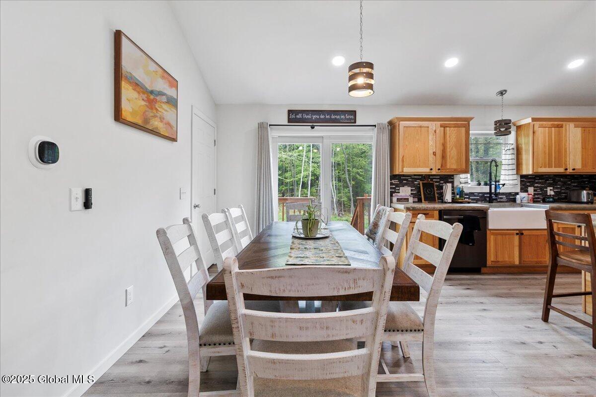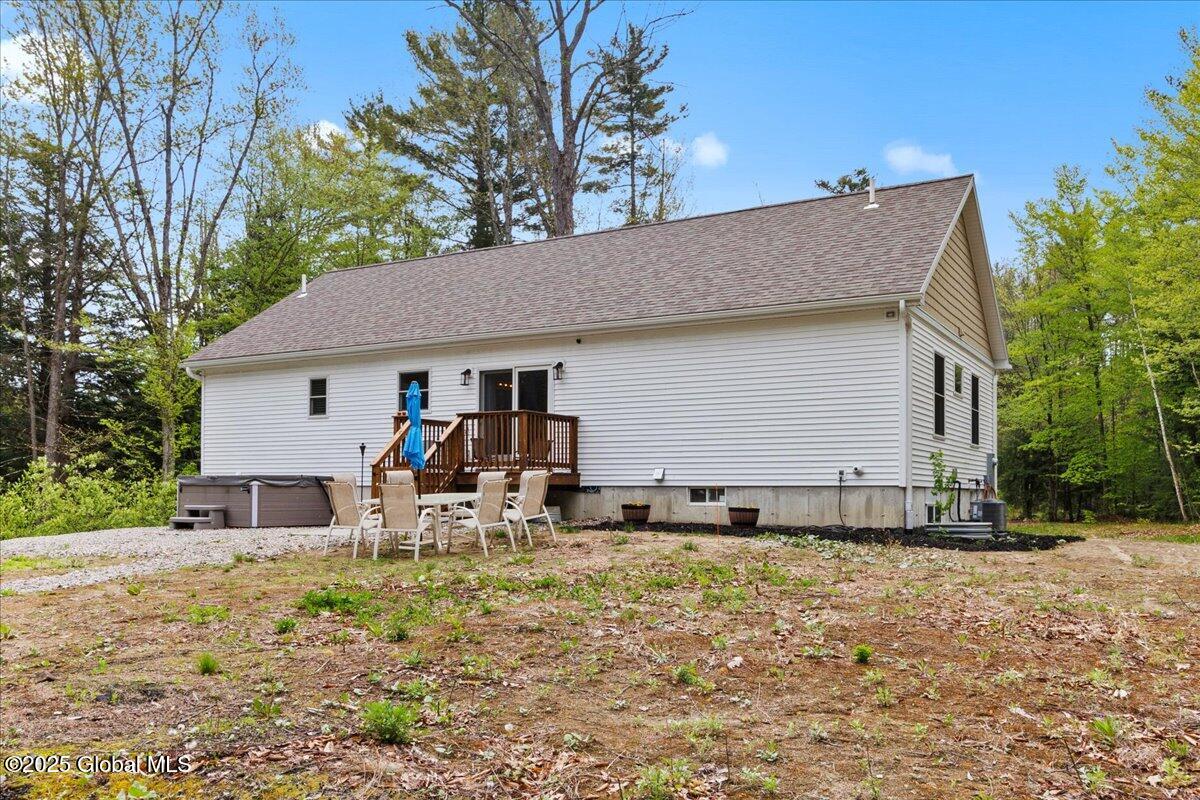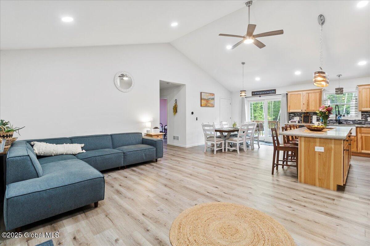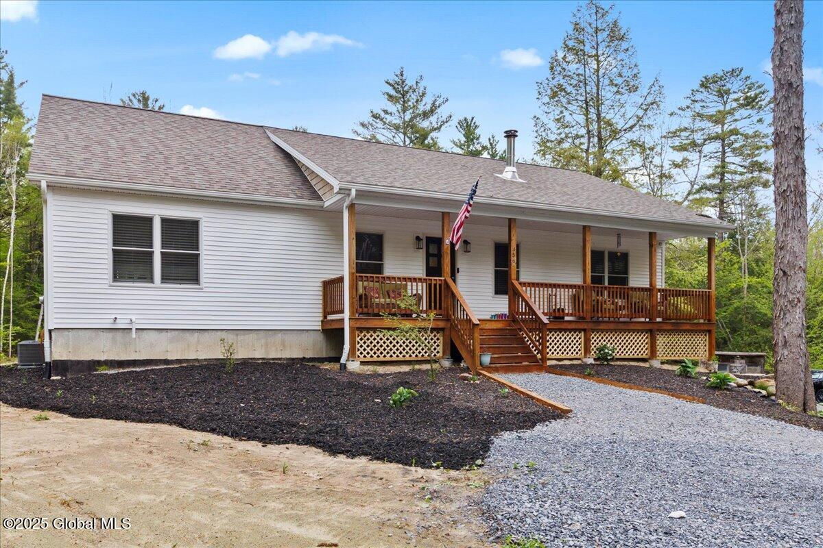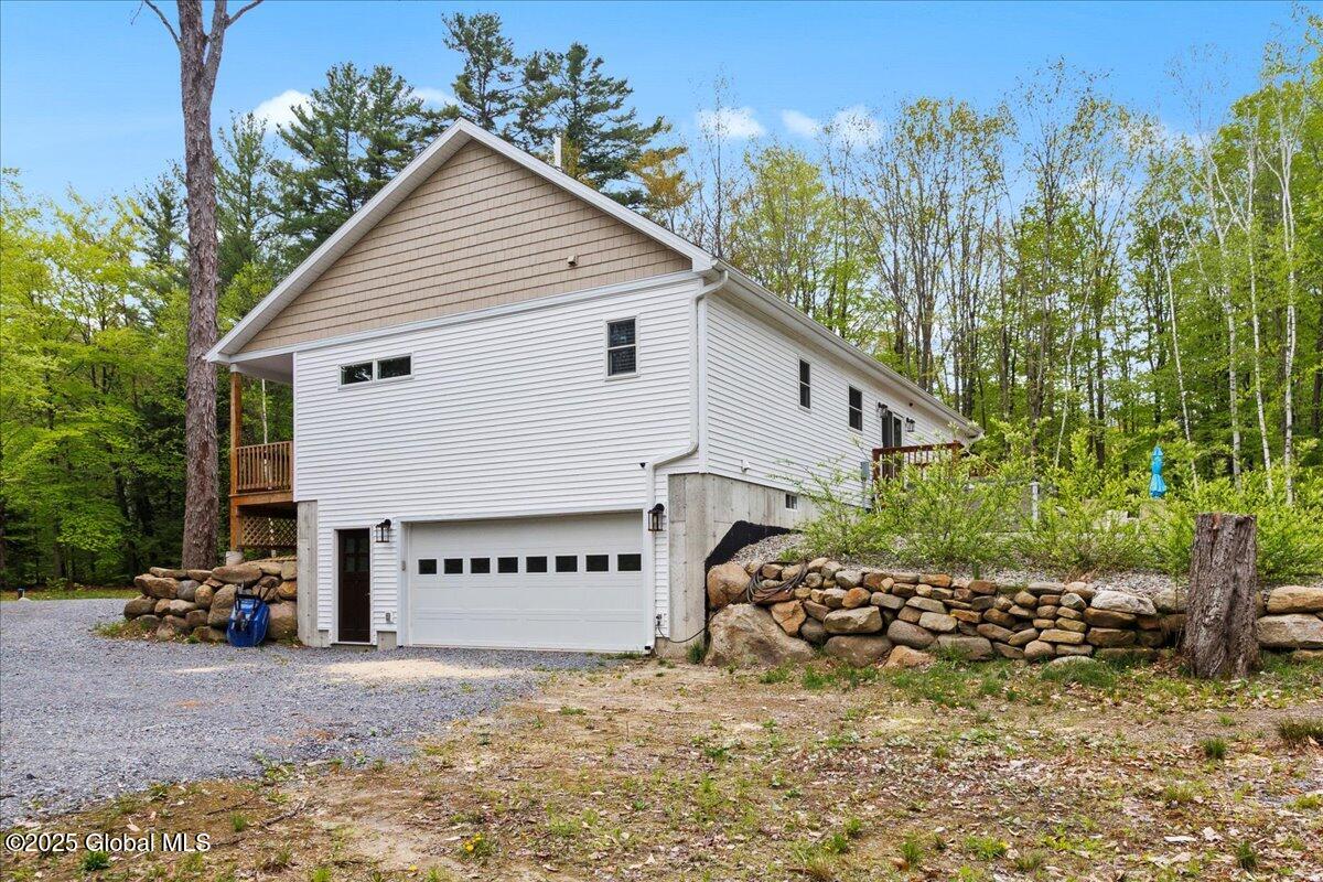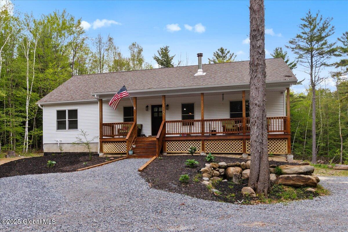 Private Adirondack Escape on over 7 acres! This 2021 single-story home offers a perfect mix of comfort, space, and charm. The open floor plan features natural finishes, hickory cabinets, a farmhouse apron sink, large center island, and a pot filler over the stove—ideal for both daily living and entertaining. The spacious great room brings in plenty of natural light. A front porch welcomes morning coffee, while the finished basement with egress adds extra living space, storage, and an oversized two-car garage. Surrounded by mature trees and natural landscaping, this private retreat is less than a mile from Jenny Lake and Hunt Lake, and under 30 minutes to Saratoga Springs and Lake George. See docs for upgrades.