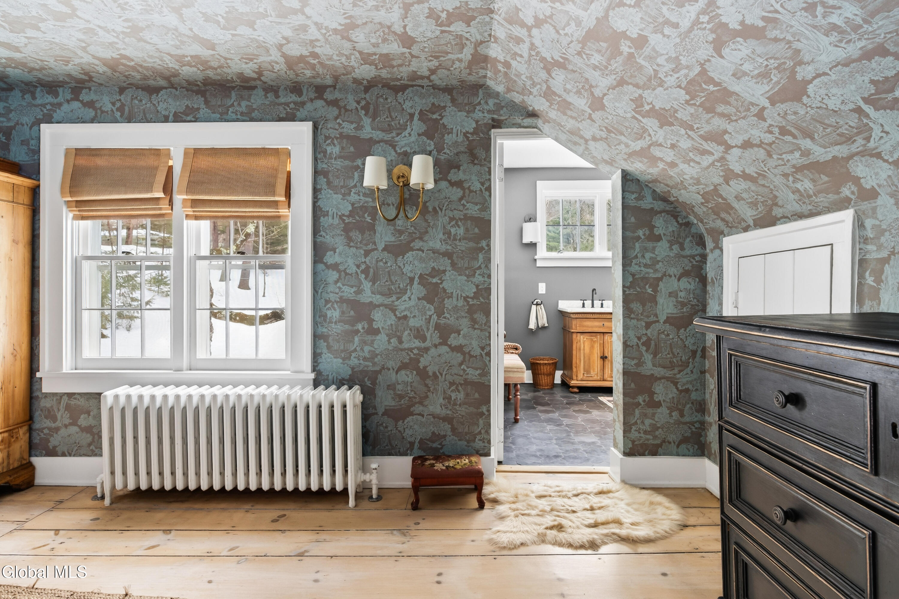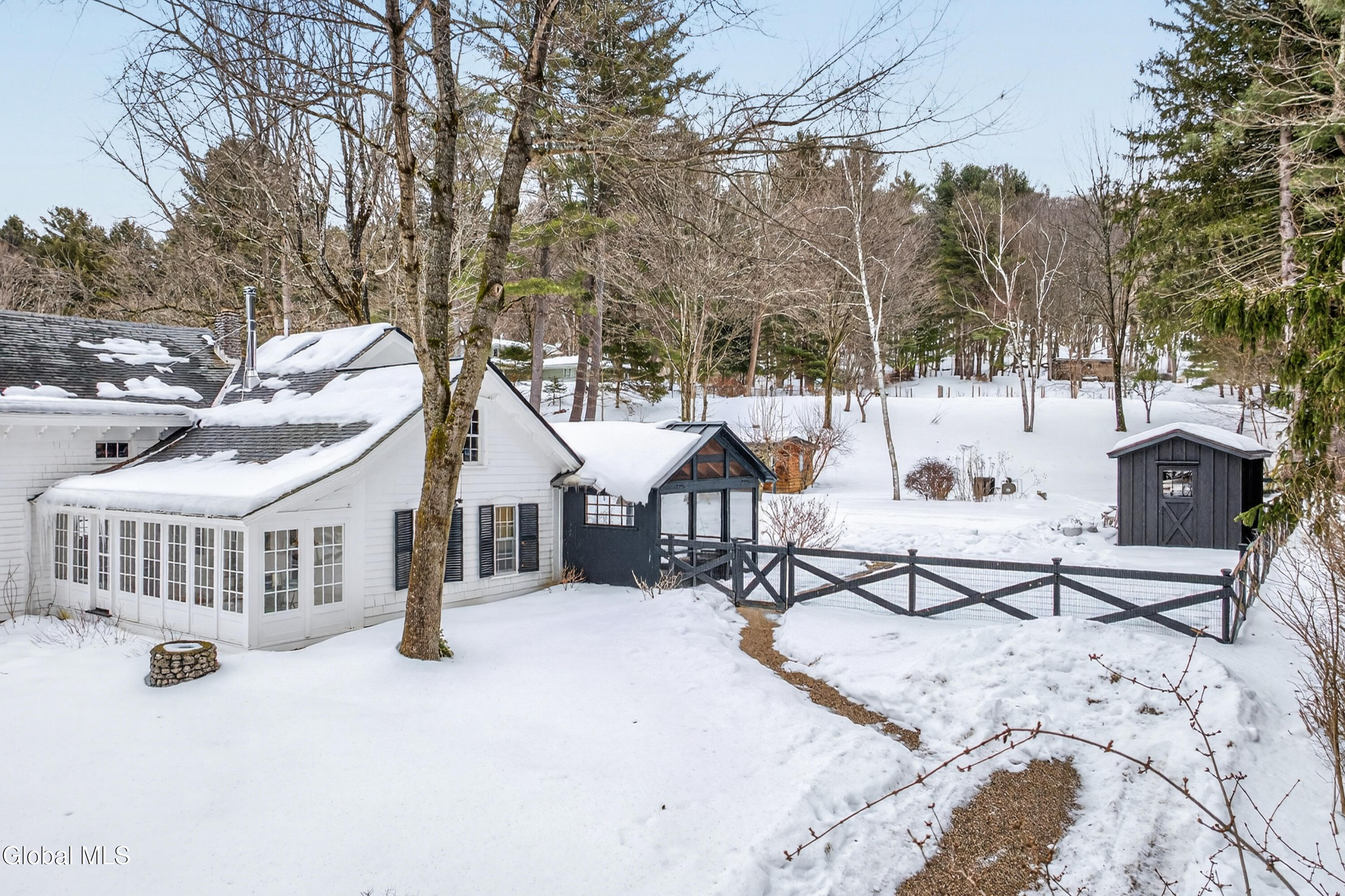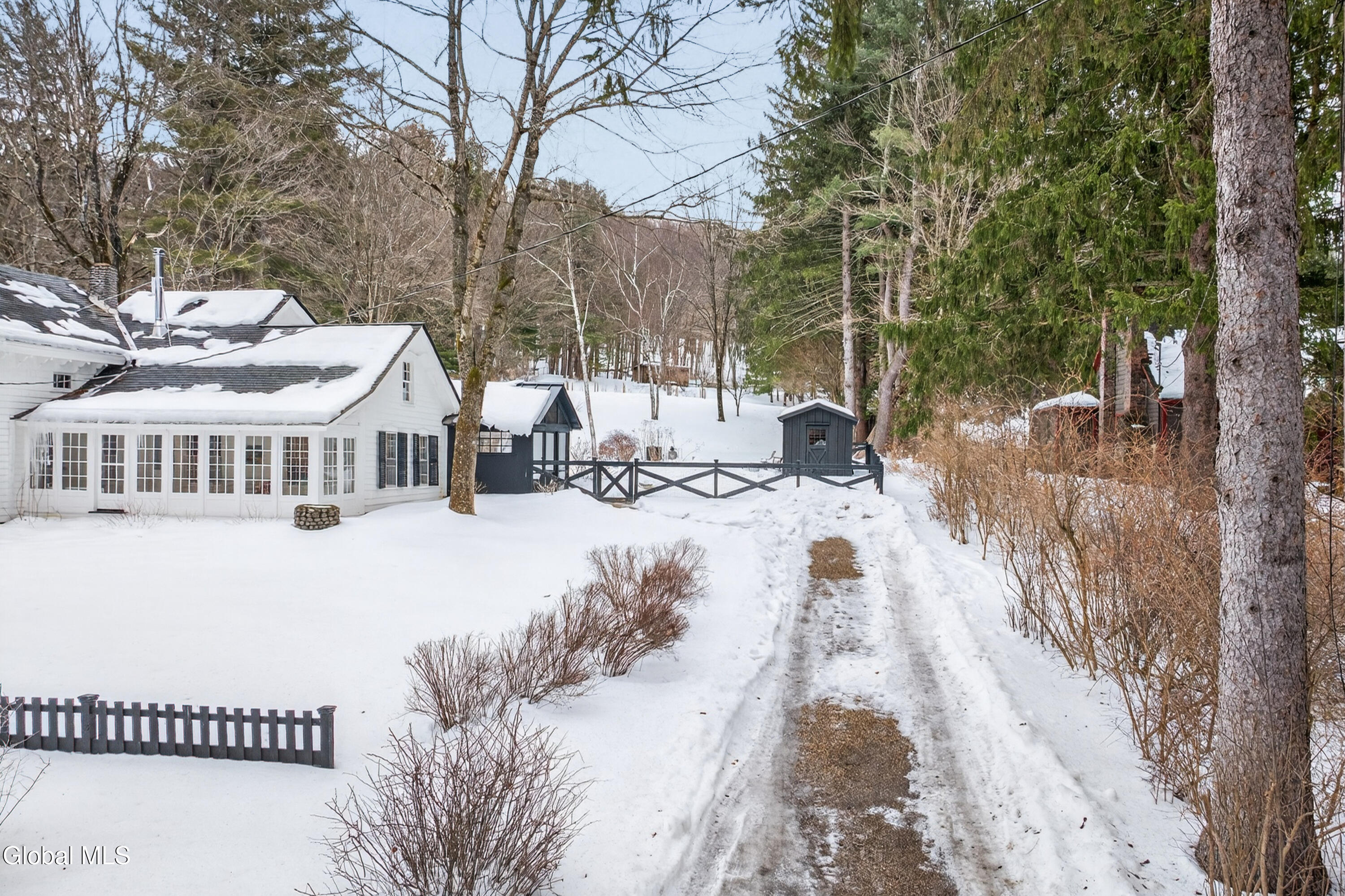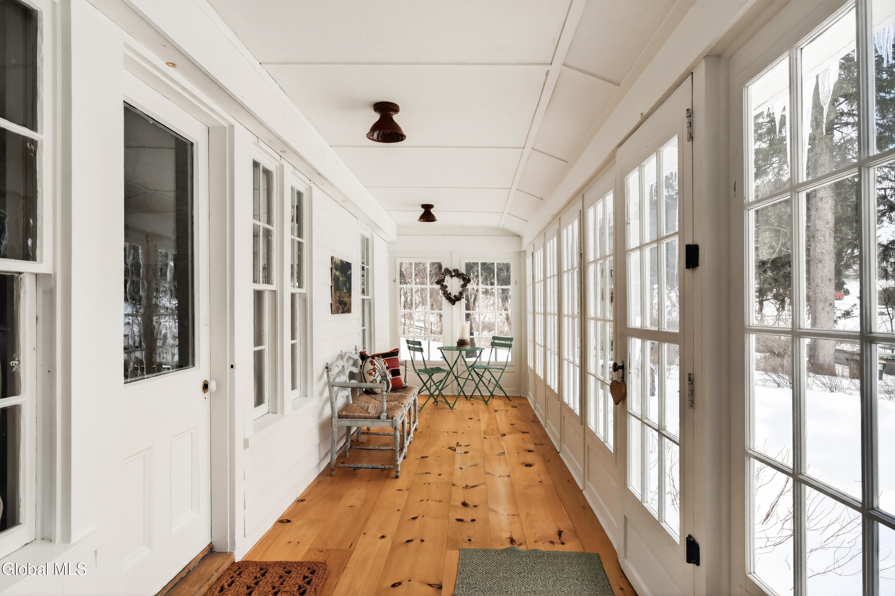 Welcome to Nobletown Farmhouse, a beautifully updated circa 1850 antique farmhouse compound in prime Hillsdale, on one of Columbia County's prettiest country roads. White oak floors flow through sunlit rooms adorned with beautiful period molding and trim, from a welcoming front sunroom to a screened porch in the rear. The chef's kitchen features marble countertops and a farmhouse sink, and flows to a cozy dining room warmed by a wood stove. The grounds include a heated saltwater pool, a pool shed with outdoor shower, a separate studio lounge, and a restored historic stable with a bar, all connected by bluestone pathways and shaded by century-old maples. Minutes to Catamount skiing, the Hillsdale Farmer's Market, and Great Barrington, less than 30 minutes to Hudson, and 2.5 hours to NYC.