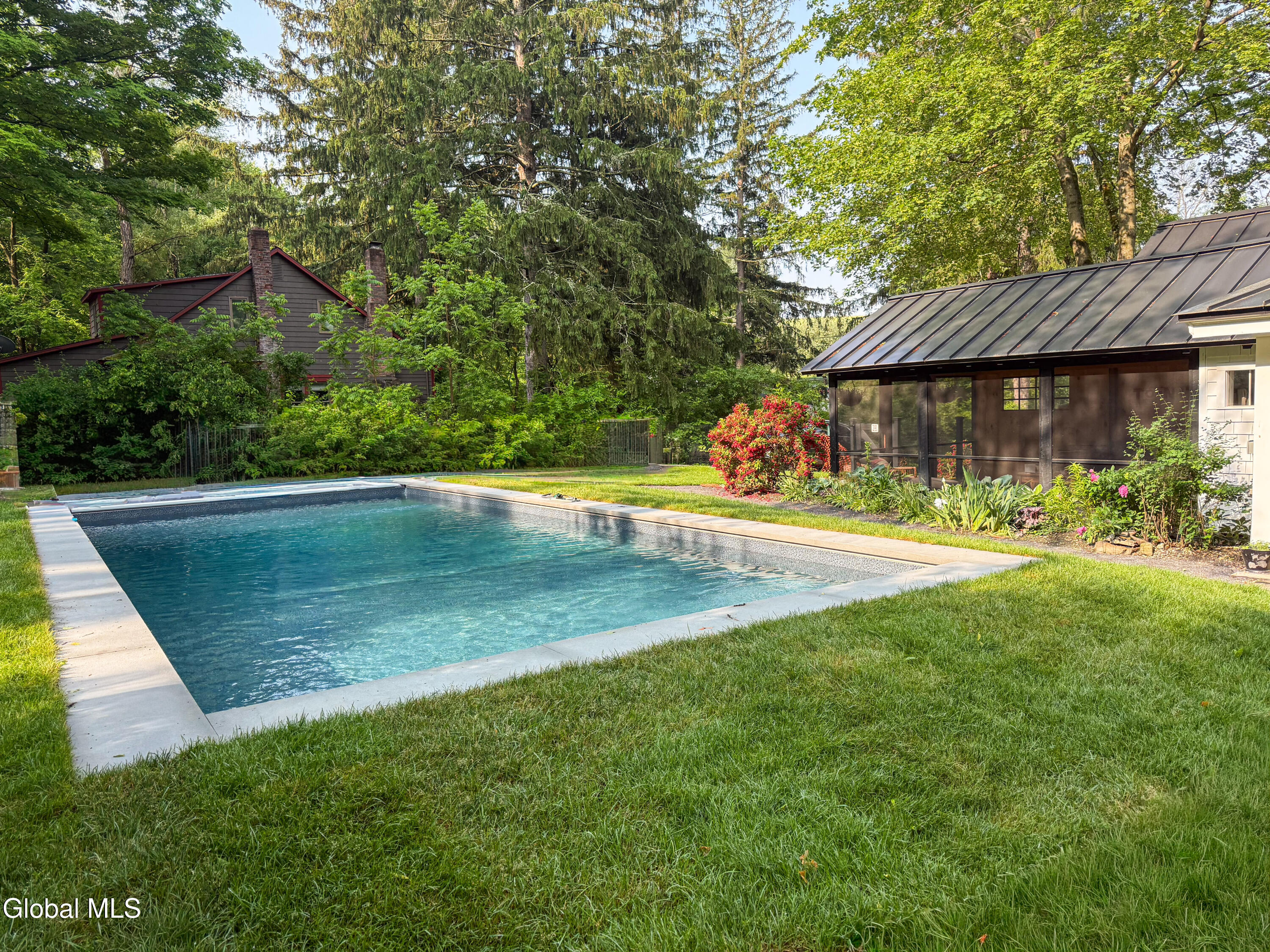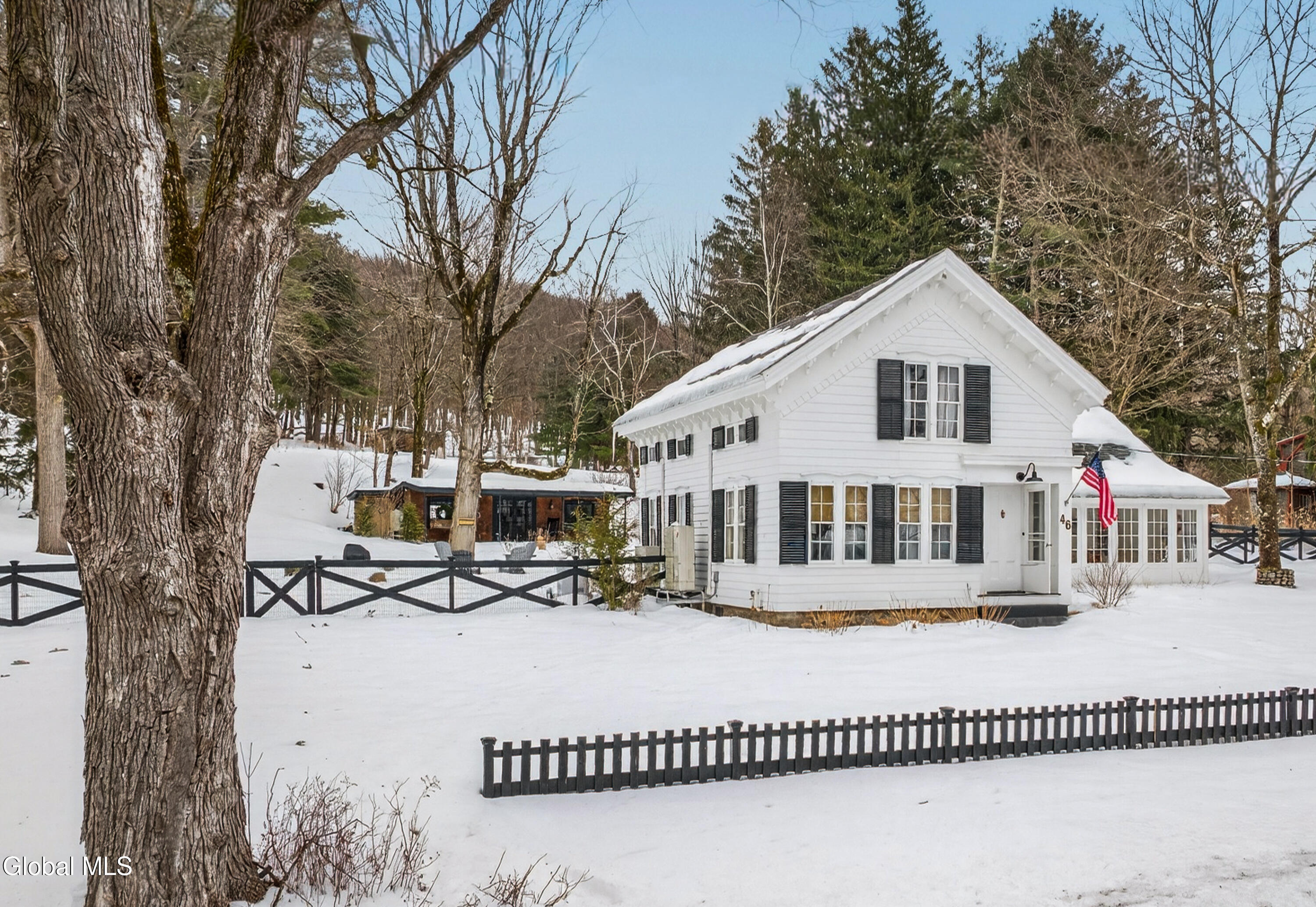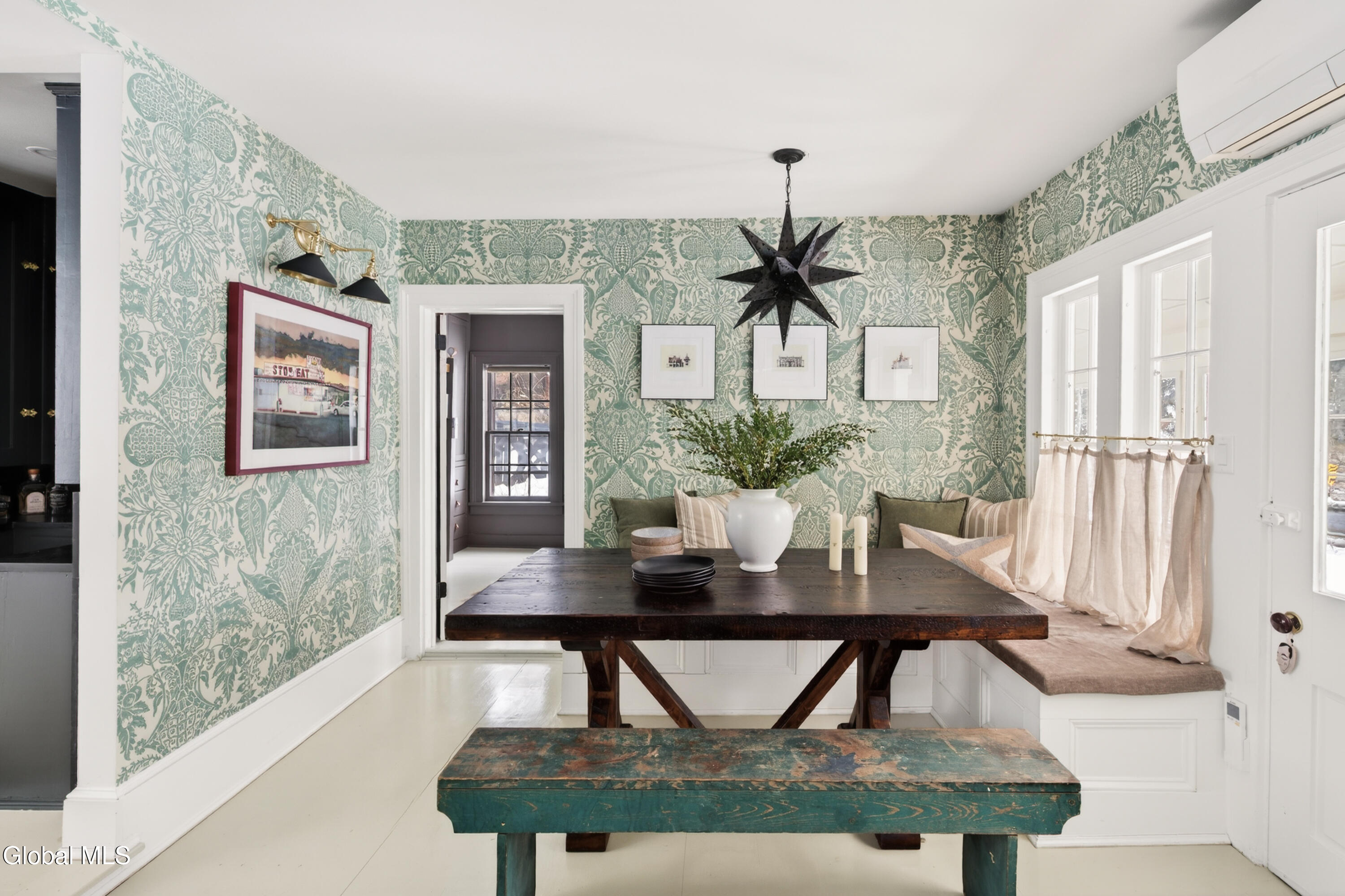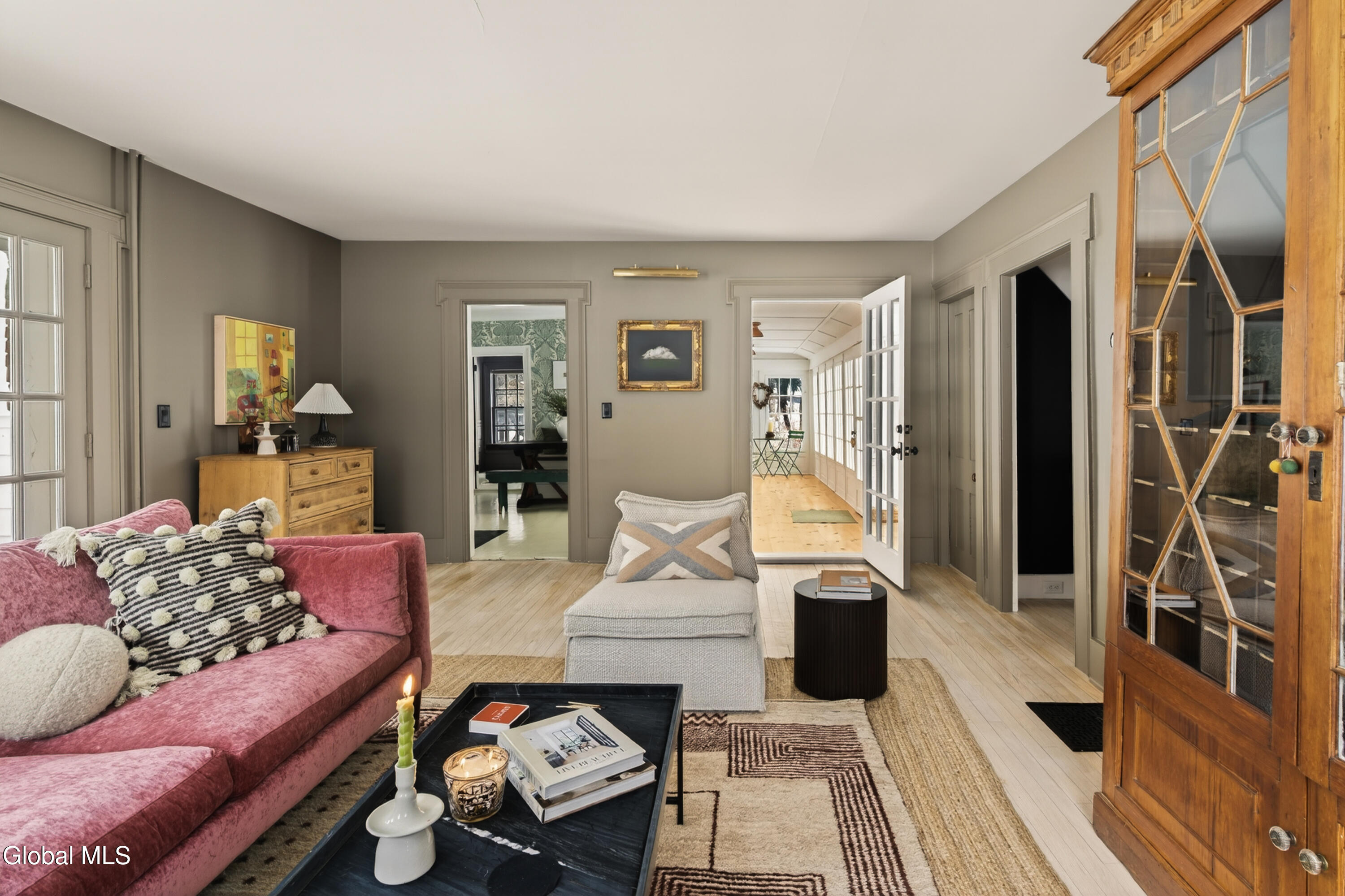 Welcome to Nobletown Farmhouse, a beautifully updated circa 1850 antique farmhouse compound in prime Hillsdale, on one of Columbia County's prettiest country roads. White oak floors flow through sunlit rooms adorned with beautiful period molding and trim, from a welcoming front sunroom to a screened porch in the rear. The chef's kitchen features marble countertops and a farmhouse sink, and flows to a cozy dining room warmed by a wood stove. The grounds include a heated saltwater pool, a pool shed with outdoor shower, a separate studio lounge, and a restored historic stable with a bar, all connected by bluestone pathways and shaded by century-old maples. Minutes to Catamount skiing, the Hillsdale Farmer's Market, and Great Barrington, less than 30 minutes to Hudson, and 2.5 hours to NYC.
