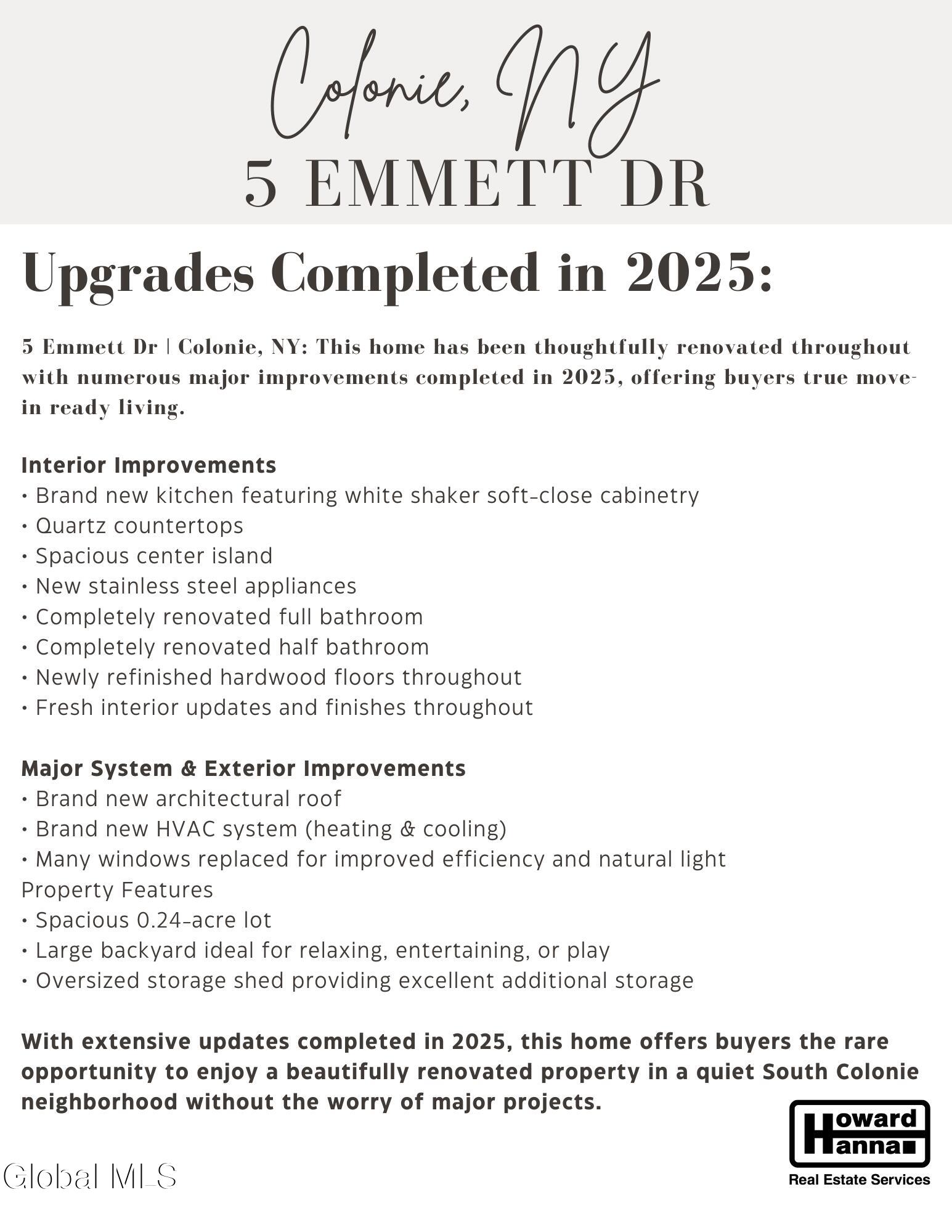 Fully renovated homes in this South Colonie neighborhood rarely hit the market, and this one is completely move-in ready! Welcome to 5 Emmett Dr, tucked away on a quiet non-through street in a highly desirable neighborhood within the Saddlewood Elementary School district. Offering 1,731sqft with 3 bedrooms, and 1.5 bathrooms, this home has been thoughtfully updated from top to bottom! The stunning new kitchen is the centerpiece of the home, featuring gorgeous white shaker soft-close cabinetry, a spacious center island, quartz countertops, and stainless steel appliances, perfect for everyday living and entertaining. Throughout the home you'll find newly refinished hardwood floors, abundant natural light, and beautifully updated spaces. Major improvements provide peace of mind, including a brand-new roof, brand-new HVAC system, numerous replacement windows, and completely renovated bathrooms. Set on 0.24 acres, the property offers a great backyard ideal for relaxing, entertaining, or play, along with a large shed providing excellent storage. The location is hard to beat; situated in a quiet neighborhood with no through traffic while still offering quick access to shopping, restaurants, parks, and major Capital Region roadways! Move-in ready homes with this level of renovation, location, and price point are hard to find in South Colonie in the Saddlewood Elementary School system! The last photo is virtually ''staged!'' We had hopes of doing the landscaping but the great Northeast tundra didn't allow that to happen! With a bit of elbow grease and landscaping, she could be the talk of the town!