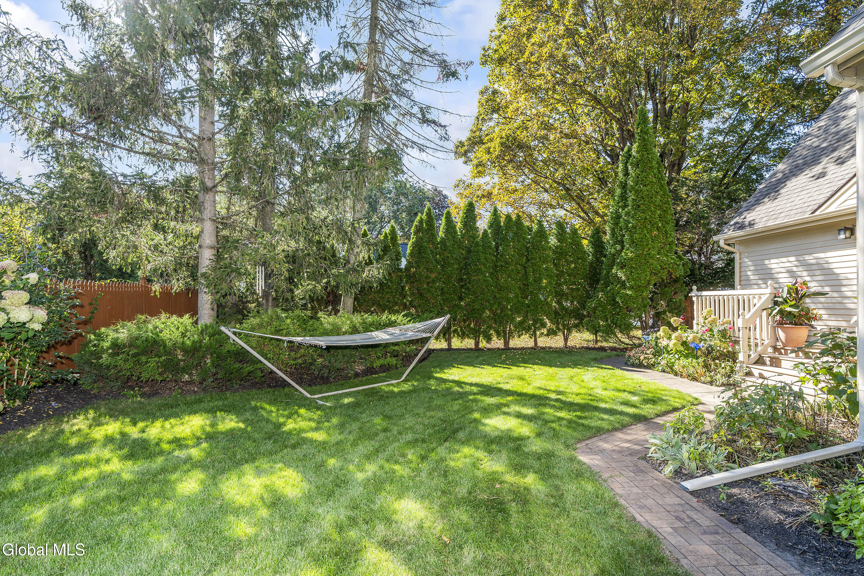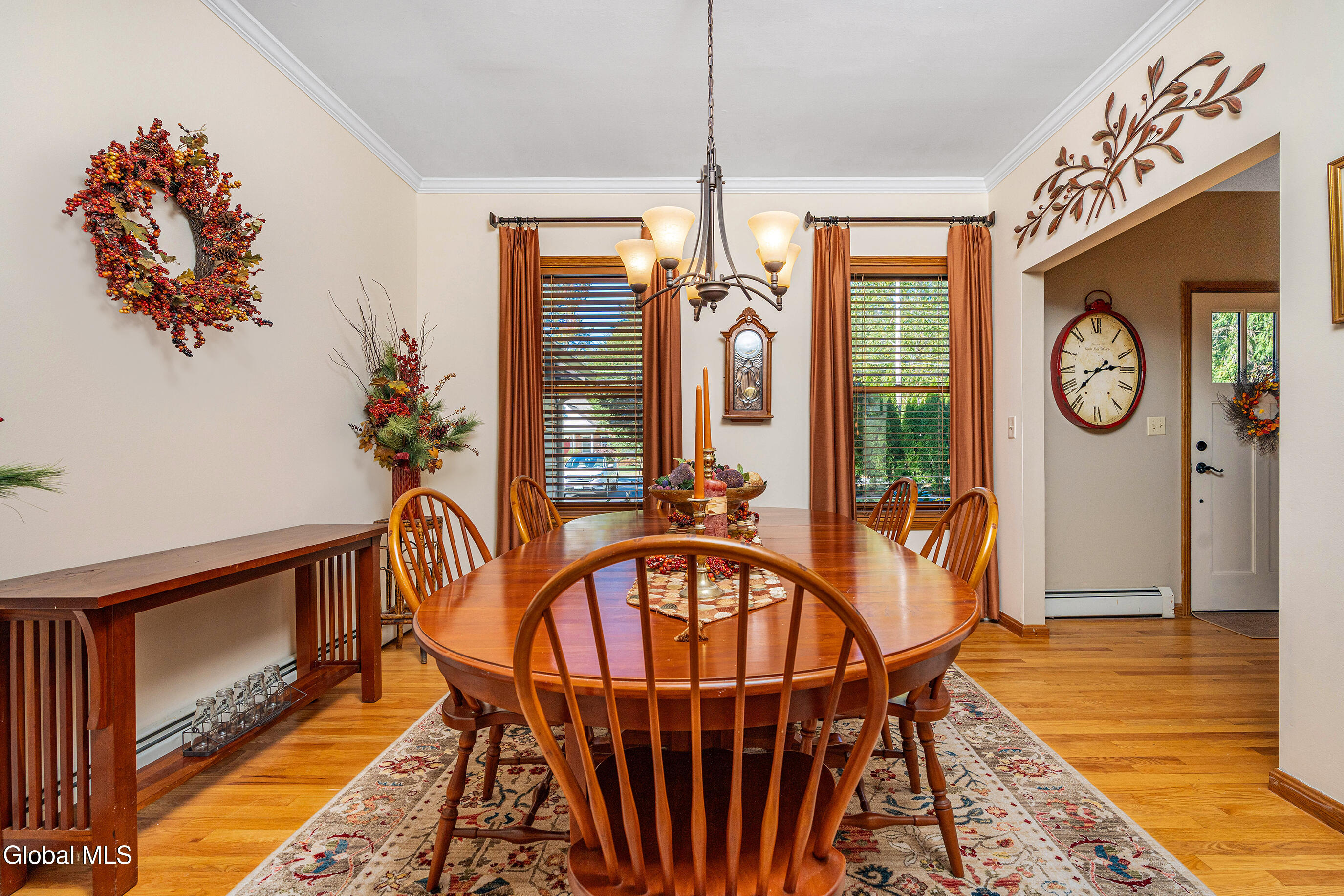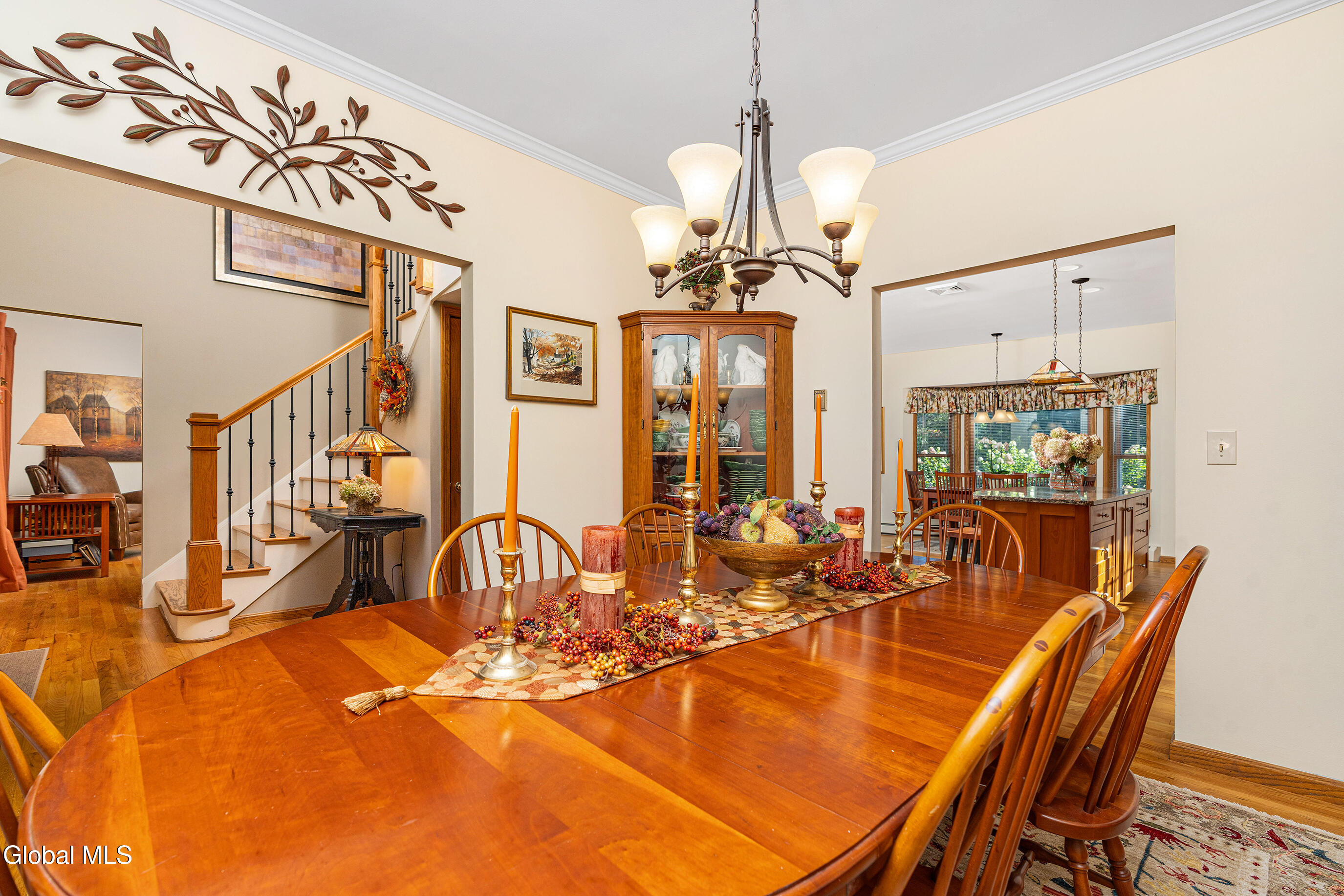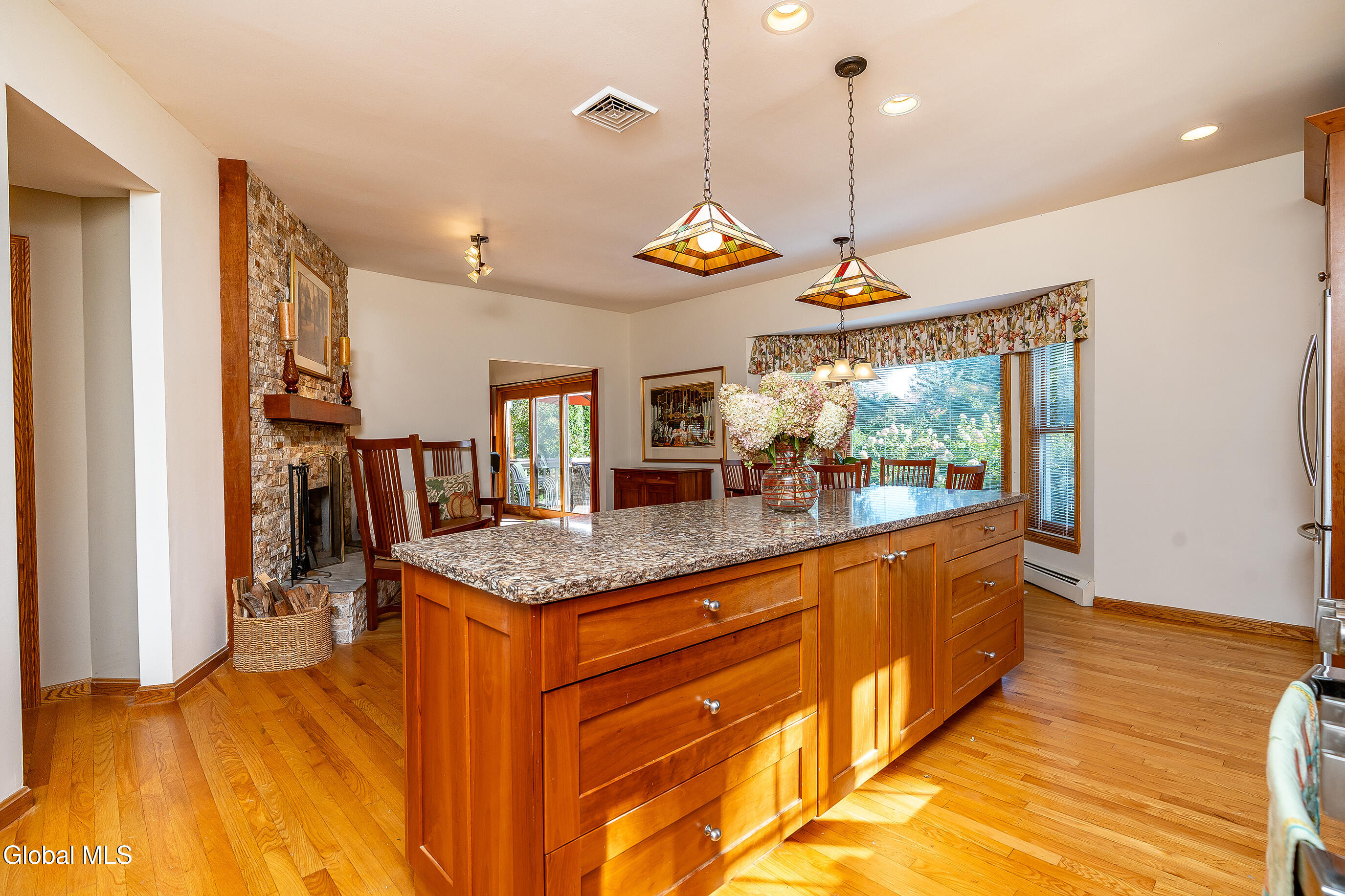 This custom cape blends meticulous maintenance with impressive amenities throughout. Step into a spacious, well-lit foyer with a custom staircase. The first floor showcases stunning hardwoods, a designer eat-in kitchen with cherry cabinetry, quartz countertops, stainless appliances, and a gas stove, all centered around the inviting charm of a cozy wood-burning fireplace. The expansive living room, also featuring a resurfaced stone fireplace, offers flexible space for entertaining, relaxing, or a home office. Enjoy company in the formal dining room adorned with crown molding. A remodeled half bath, convenient backyard entry, and laundry room complete the main level. Upstairs, you'll find three comfortable bedrooms. The primary suite dazzles with a beautifully appointed en suite bath, while the main hall bathroom has also been tastefully updated. Additional highlights include a full dry basement, two-car garage with a brand new door, and lush perennial gardens/landscaping. The private backyard is a peaceful retreat and can be enjoyed from from one of two new composite decks. Quality details such as solid oak interior doors, Central Air (2019), a boiler and Navien tankless hot water system installed in December 2021, and the roof (2009) add lasting value. Located in the award-winning Shenendehowa school district, this home offers unmatched character, thoughtful finishes and quality updates. There is nothing cookie-cutter here. Pride of ownership is evident throughout.