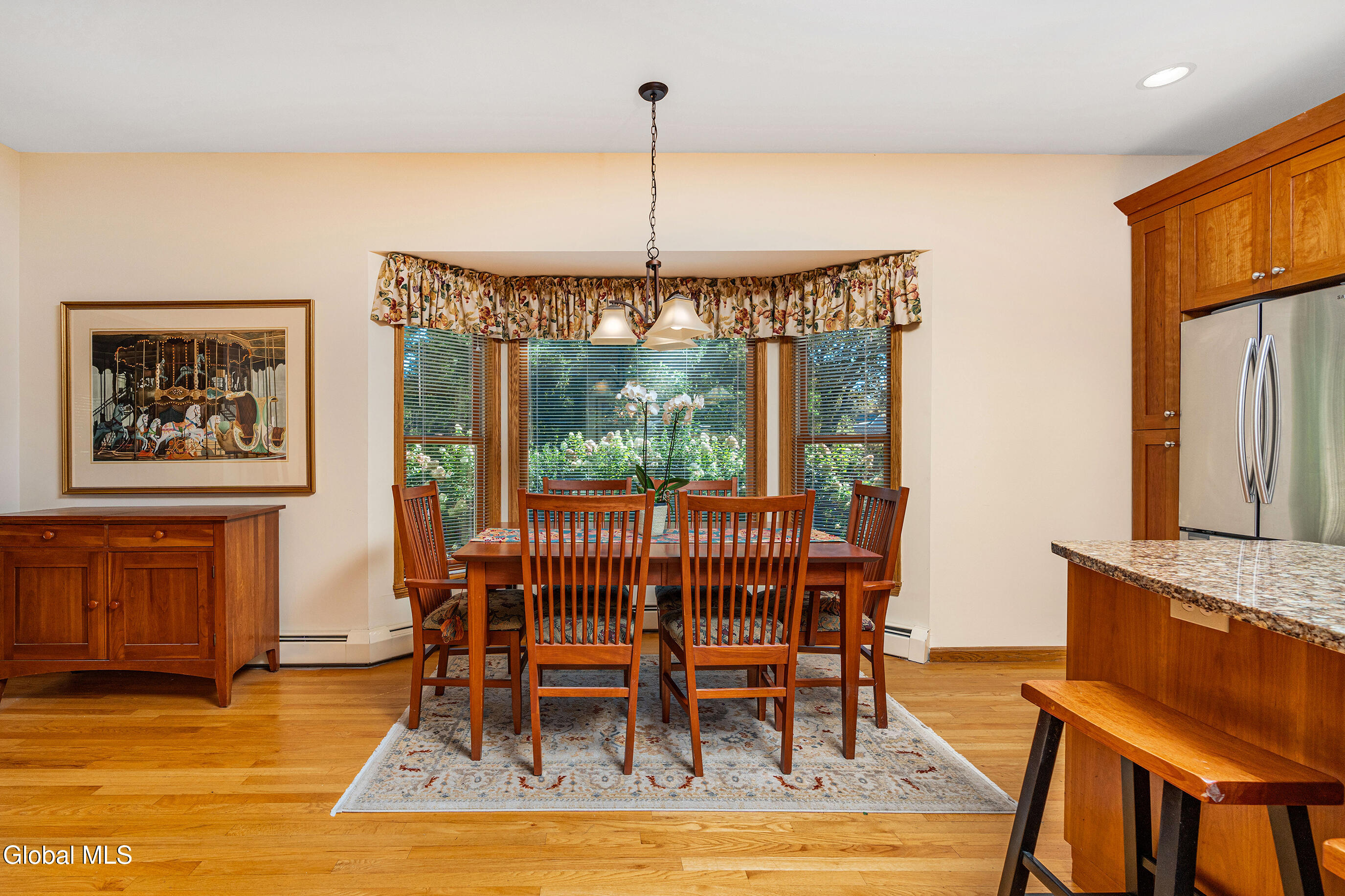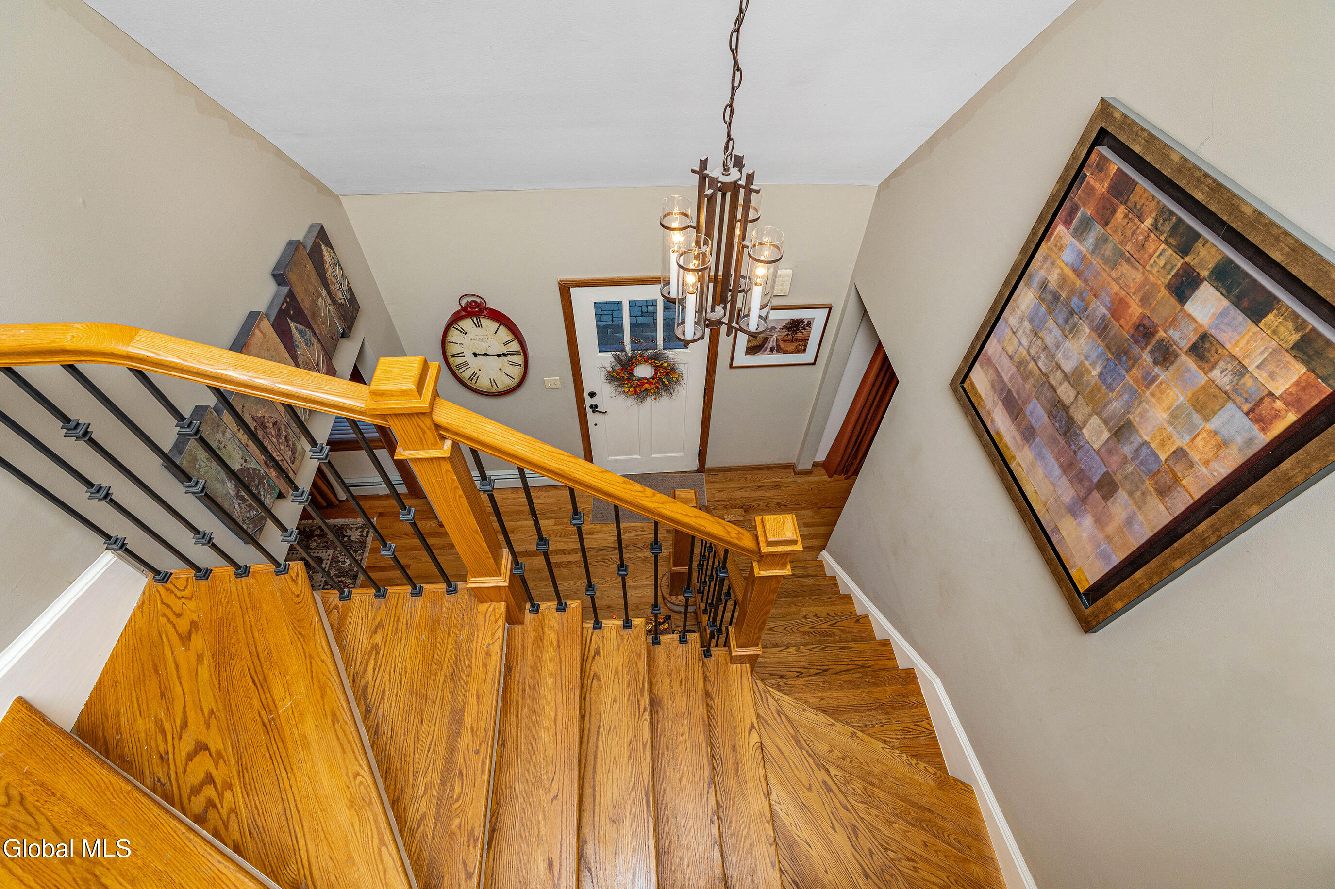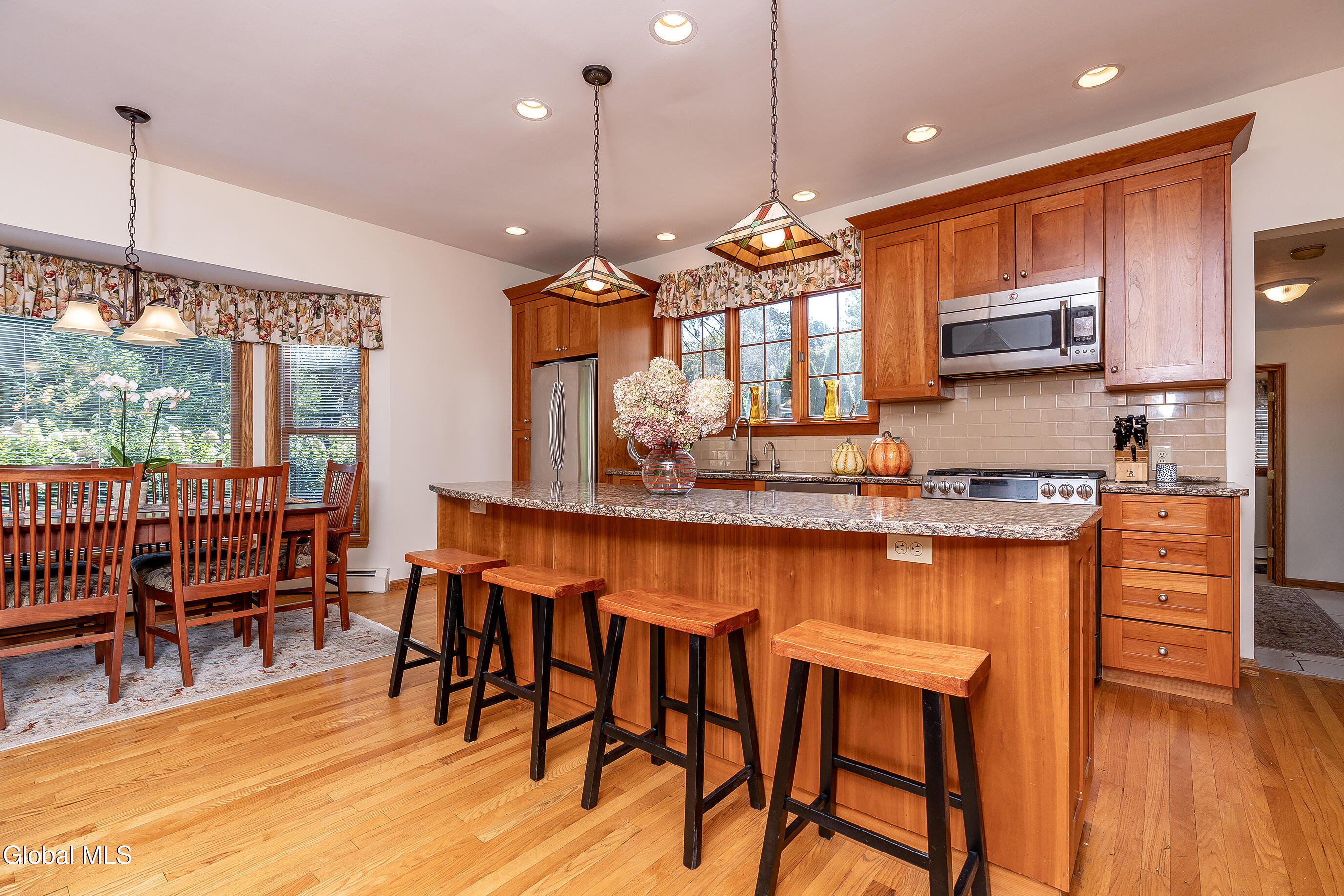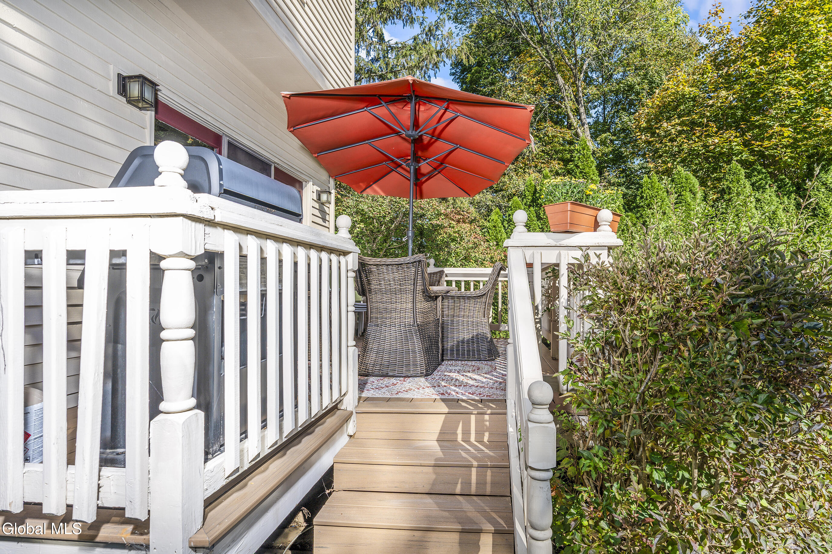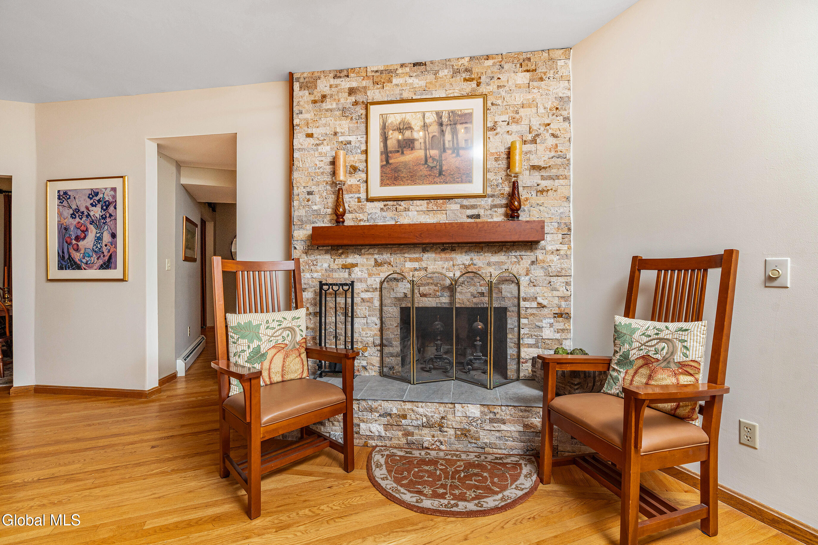 This custom cape blends meticulous maintenance with impressive amenities throughout. Step into a spacious, well-lit foyer with a custom staircase. The first floor showcases stunning hardwoods, a designer eat-in kitchen with cherry cabinetry, quartz countertops, stainless appliances, and a gas stove, all centered around the inviting charm of a cozy wood-burning fireplace. The expansive living room, also featuring a resurfaced stone fireplace, offers flexible space for entertaining, relaxing, or a home office. Enjoy company in the formal dining room adorned with crown molding. A remodeled half bath, convenient backyard entry, and laundry room complete the main level. Upstairs, you'll find three comfortable bedrooms. The primary suite dazzles with a beautifully appointed en suite bath, while the main hall bathroom has also been tastefully updated. Additional highlights include a full dry basement, two-car garage with a brand new door, and lush perennial gardens/landscaping. The private backyard is a peaceful retreat and can be enjoyed from from one of two new composite decks. Quality details such as solid oak interior doors, Central Air (2019), a boiler and Navien tankless hot water system installed in December 2021, and the roof (2009) add lasting value. Located in the award-winning Shenendehowa school district, this home offers unmatched character, thoughtful finishes and quality updates. There is nothing cookie-cutter here. Pride of ownership is evident throughout.