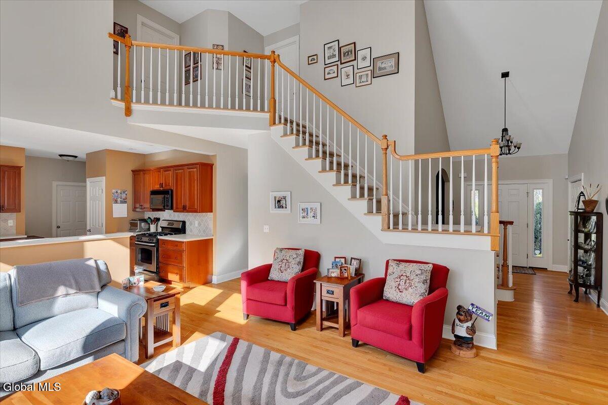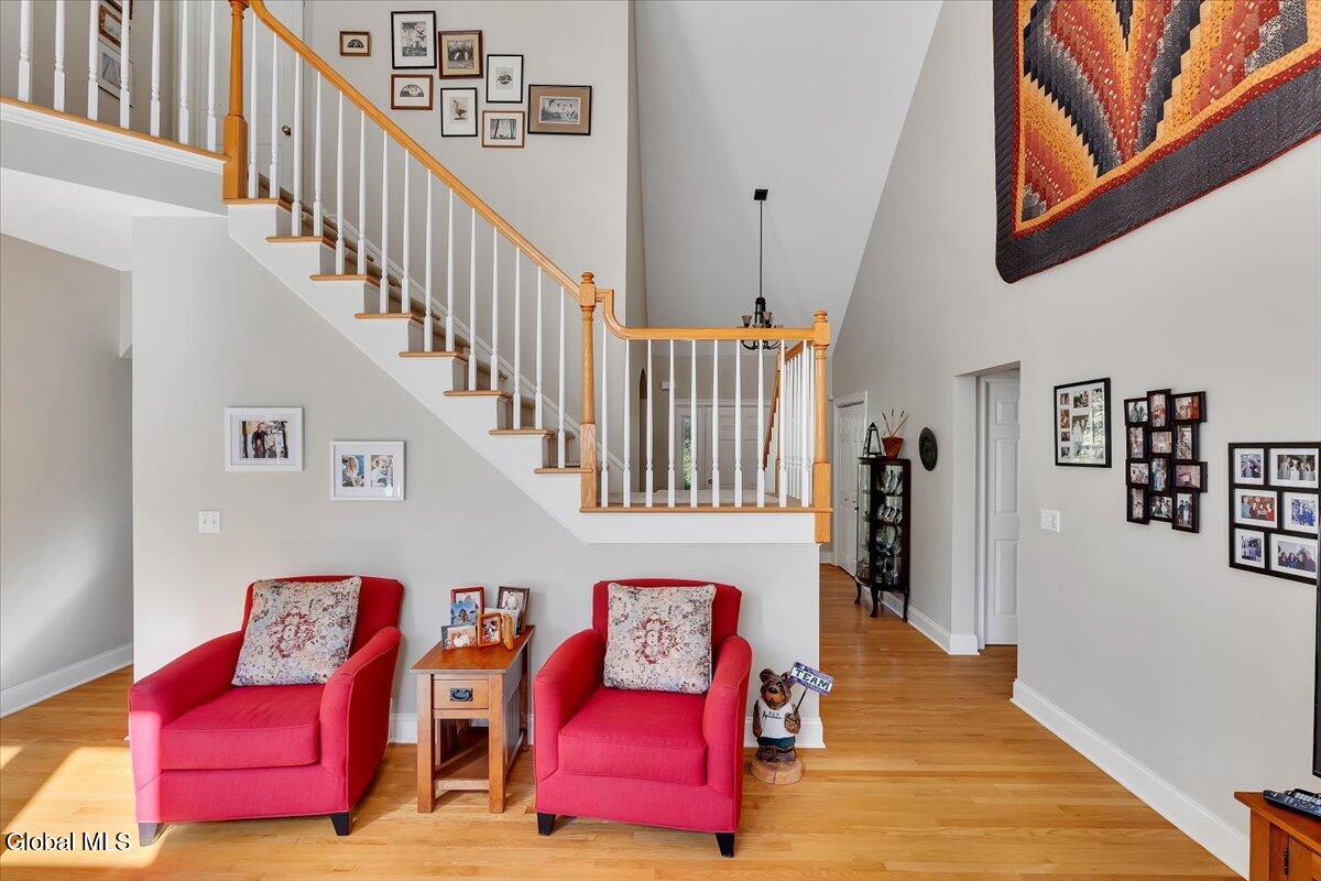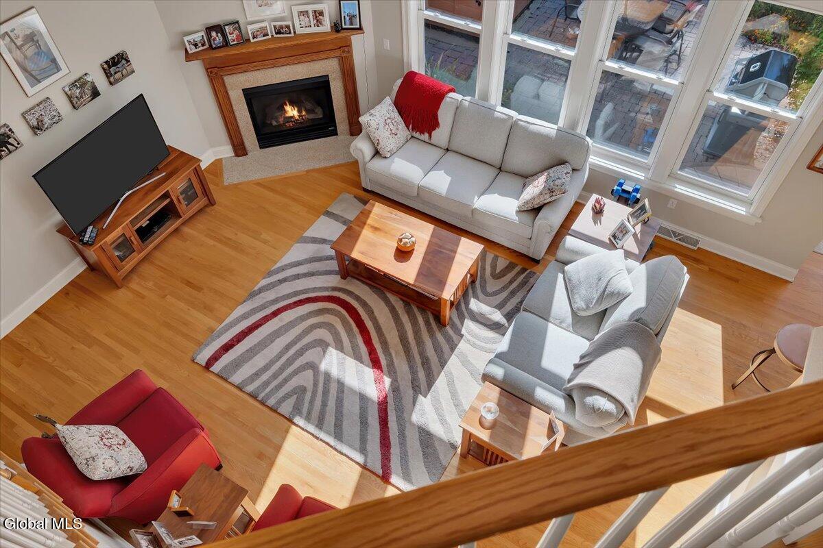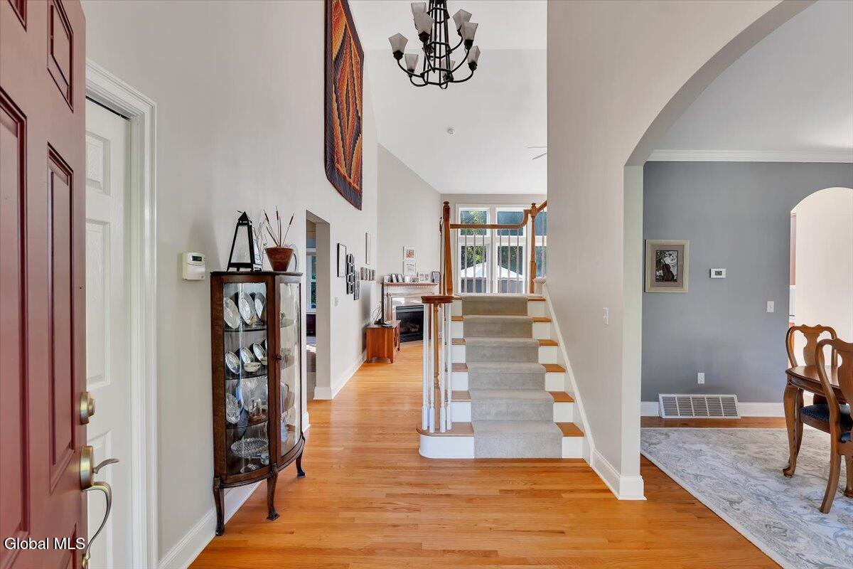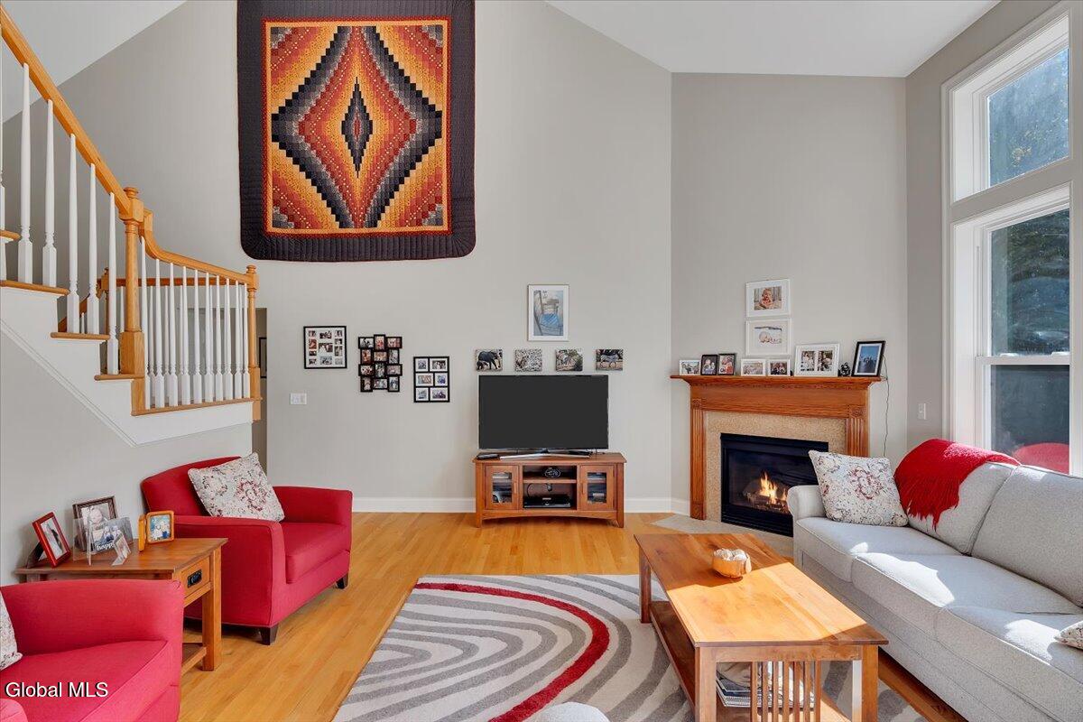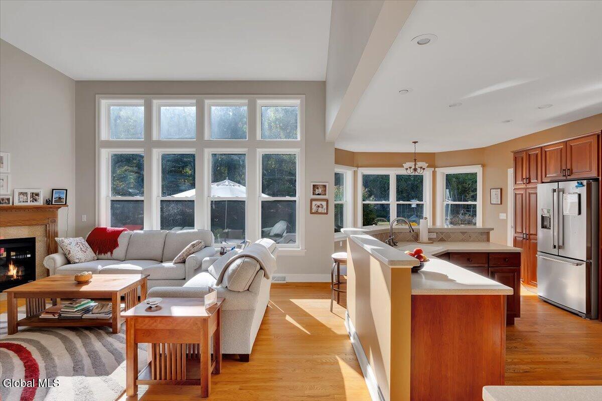 Welcome to 56 Schuurman Rd. Experience the perfect blend of modern design and natural beauty. This stunning 3-bedroom, 2.5-bathroom residence includes a first floor primary bedroom. The home offers an open-concept floor plan designed for both effortless entertainment and comfortable daily living. A wall of windows and tons of natural light highlight the hardwood floors. The flow between the kitchen, dining, and living areas makes this house great for enjoying family and friends. The kitchen has expansive counter space, generous amounts of cherry cabinets, huge kitchen island with recessed lighting. You will find crown molding, arched doorways with 9' high ceilings leading to cathedral ceilings in the great room. Laundry room is conveniently located on the first floor. Rinnai hot water on demand water system. You will love the oversized 2 car garage. The basement has unlimited possibilities with 9' high ceilings and utility sink. Whether you're sipping morning coffee in the 3-season screened room or stepping outside to a beautifully landscaped yard and patio. This home has plenty of options to relax and enjoy the manicured garden that serves as your personal sanctuary. Minutes from Albany and shopping. Other updates include washer in 2018, new refrigerator in 2024, gutters and covers, new smoke and Co2 alarms, dishwasher in 2019, microwave, and vented range hood.