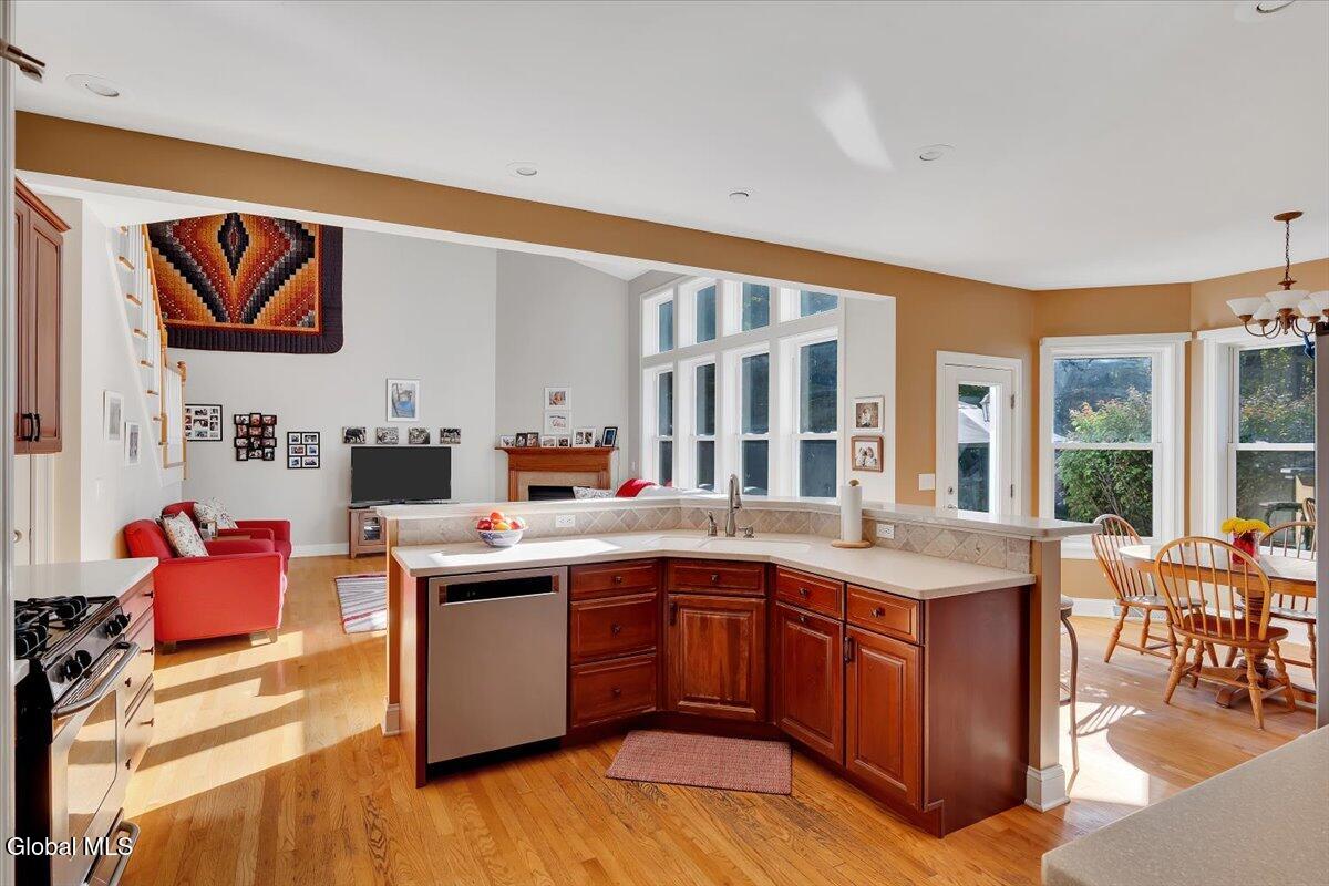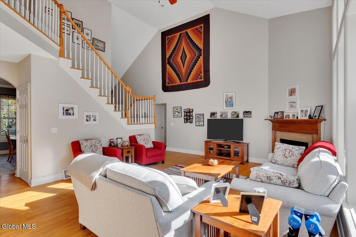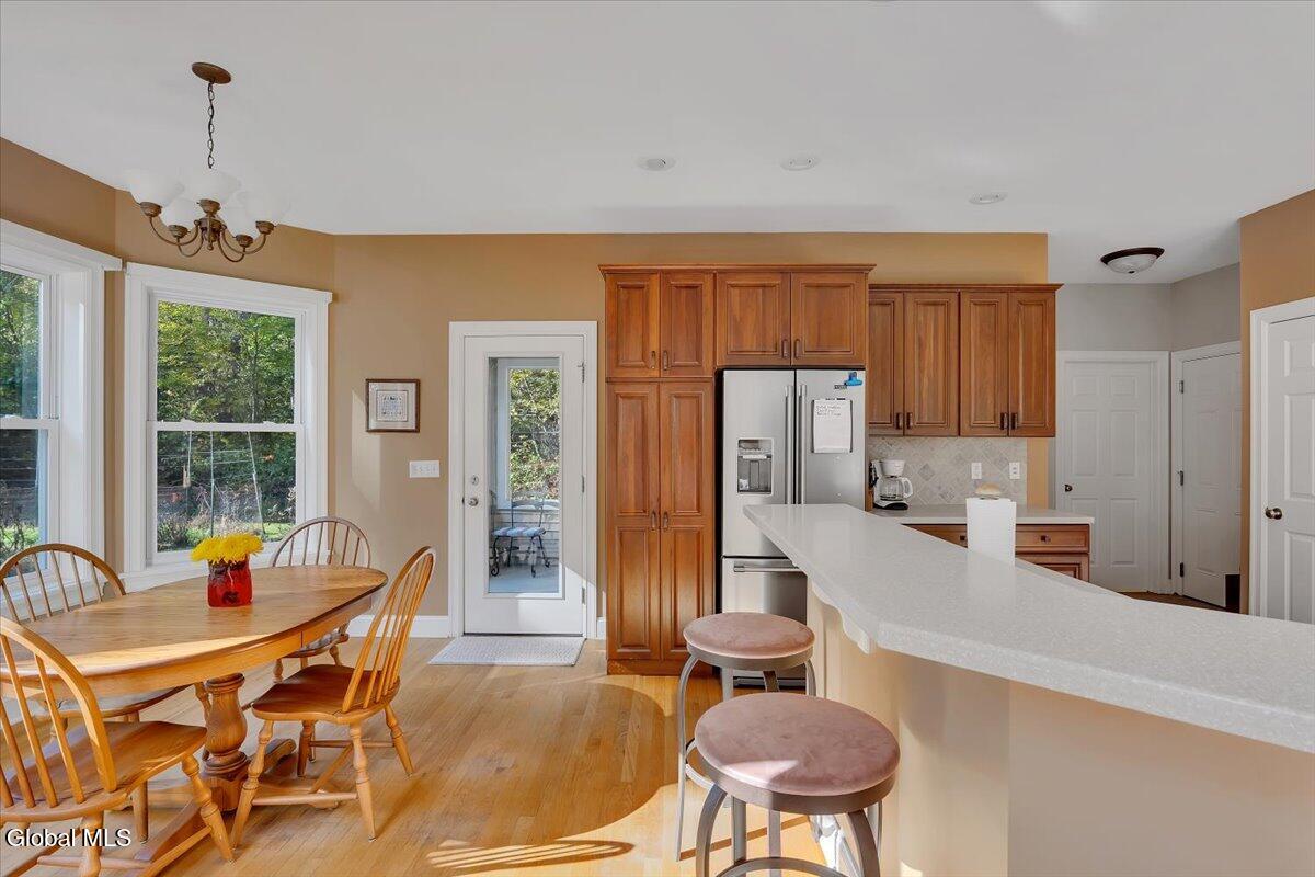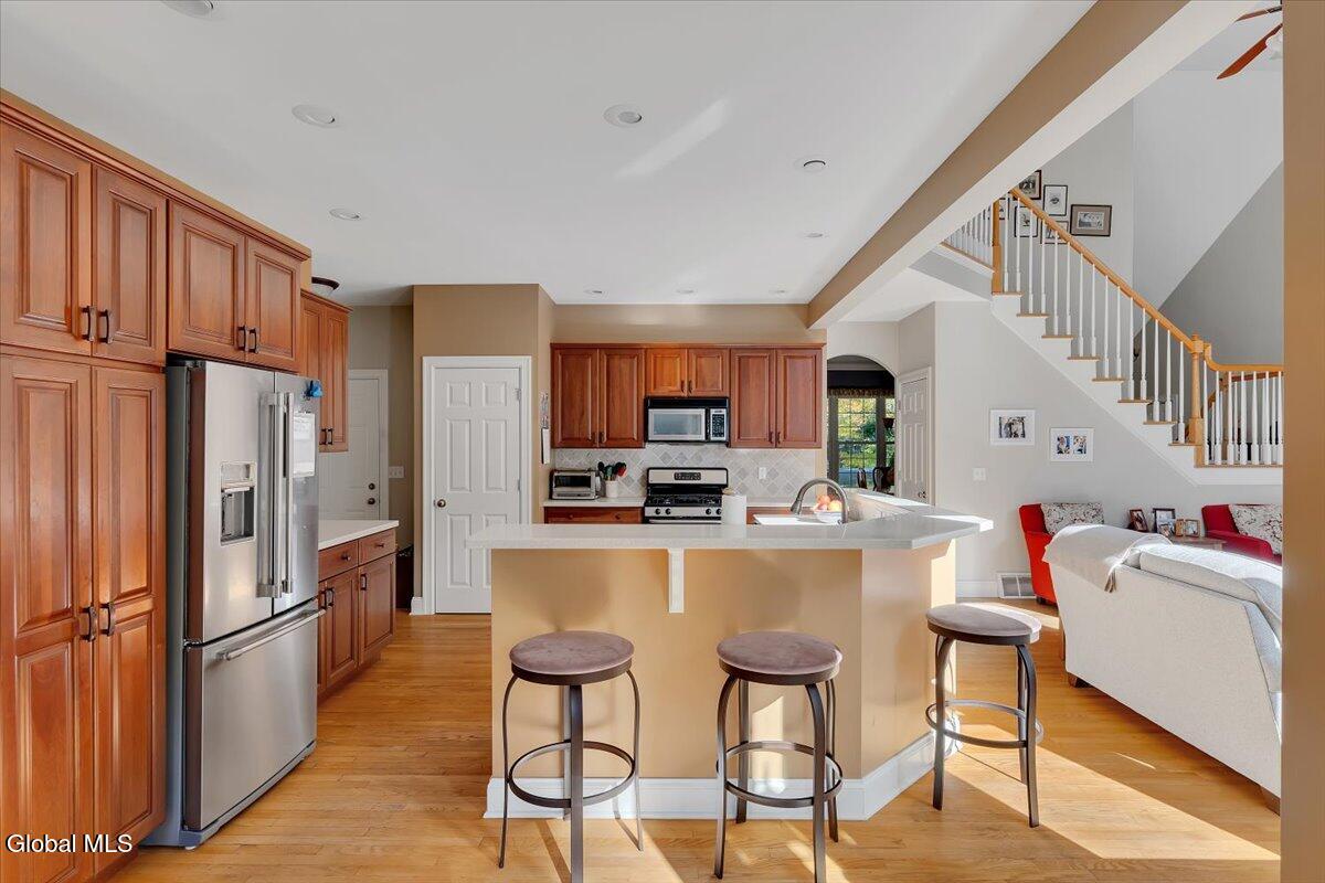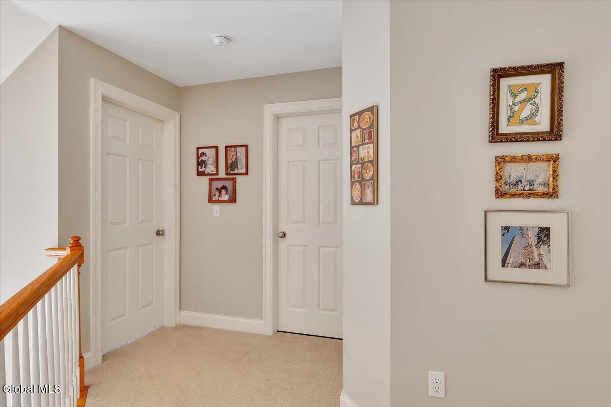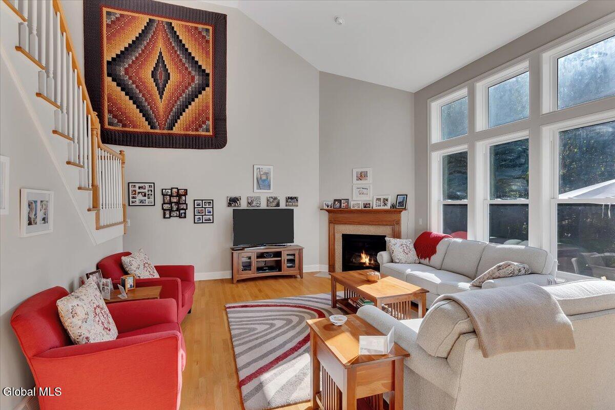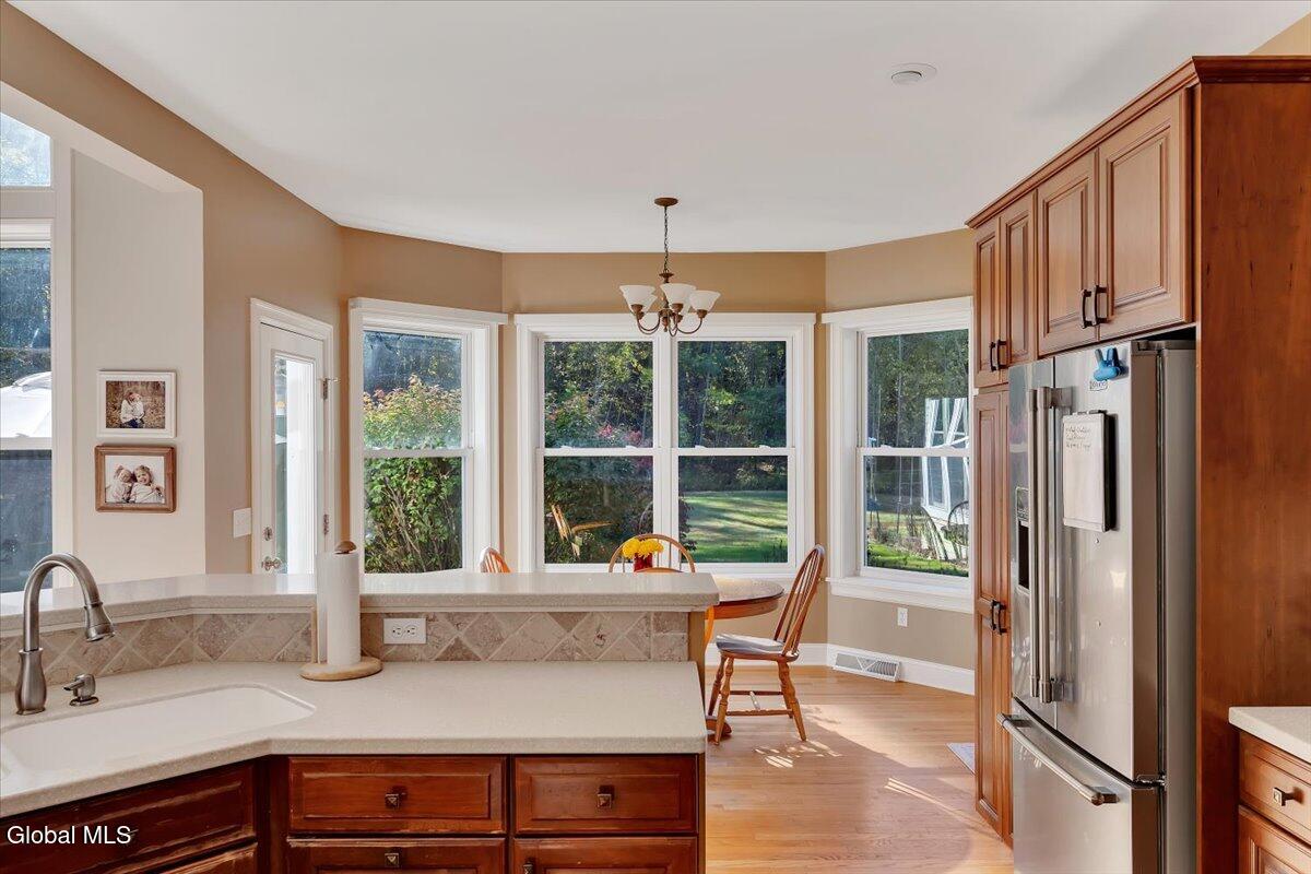 Welcome to 56 Schuurman Rd. Experience the perfect blend of modern design and natural beauty. This stunning 3-bedroom, 2.5-bathroom residence includes a first floor primary bedroom. The home offers an open-concept floor plan designed for both effortless entertainment and comfortable daily living. A wall of windows and tons of natural light highlight the hardwood floors. The flow between the kitchen, dining, and living areas makes this house great for enjoying family and friends. The kitchen has expansive counter space, generous amounts of cherry cabinets, huge kitchen island with recessed lighting. You will find crown molding, arched doorways with 9' high ceilings leading to cathedral ceilings in the great room. Laundry room is conveniently located on the first floor. Rinnai hot water on demand water system. You will love the oversized 2 car garage. The basement has unlimited possibilities with 9' high ceilings and utility sink. Whether you're sipping morning coffee in the 3-season screened room or stepping outside to a beautifully landscaped yard and patio. This home has plenty of options to relax and enjoy the manicured garden that serves as your personal sanctuary. Minutes from Albany and shopping. Other updates include washer in 2018, new refrigerator in 2024, gutters and covers, new smoke and Co2 alarms, dishwasher in 2019, microwave, and vented range hood.