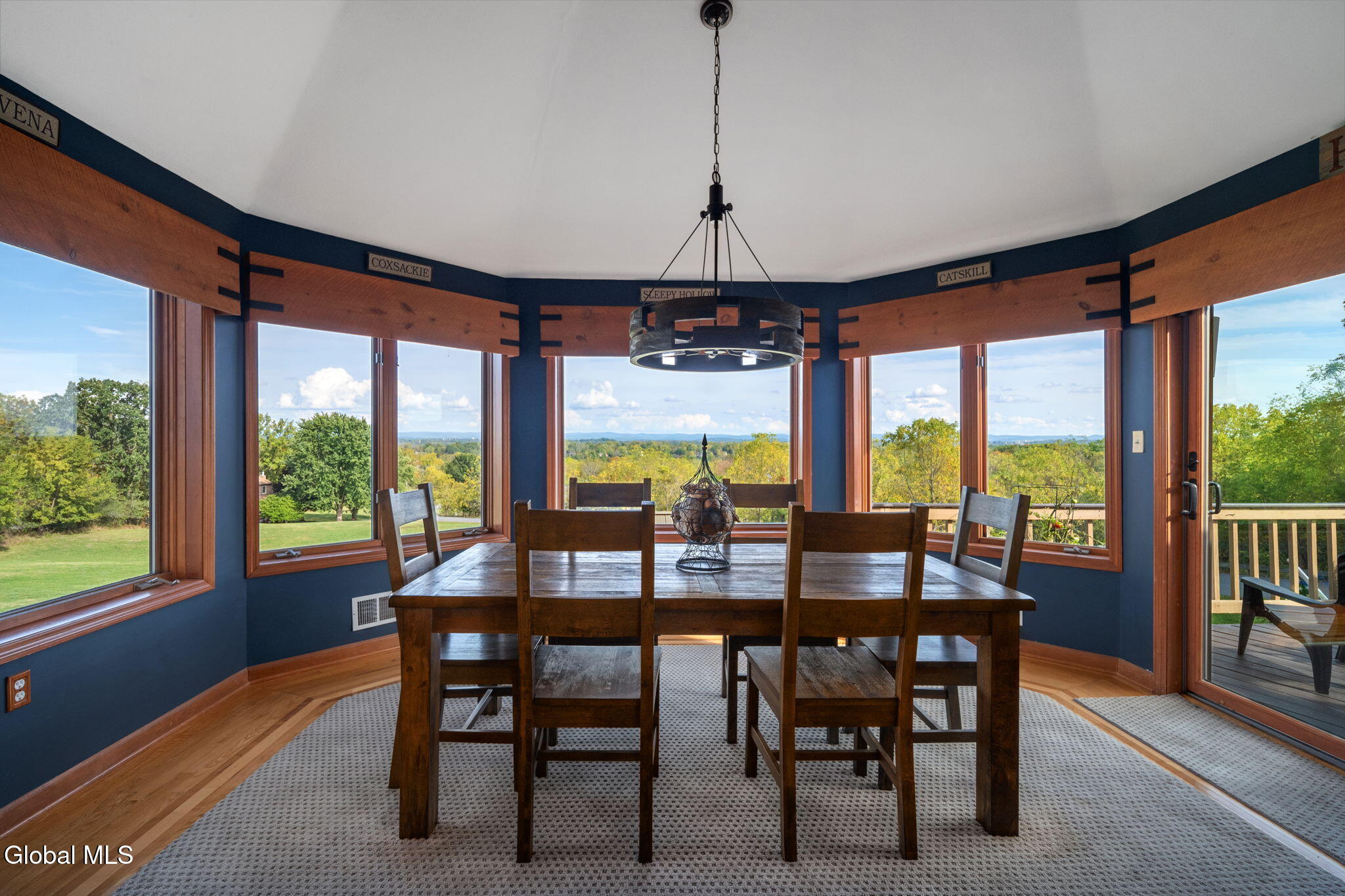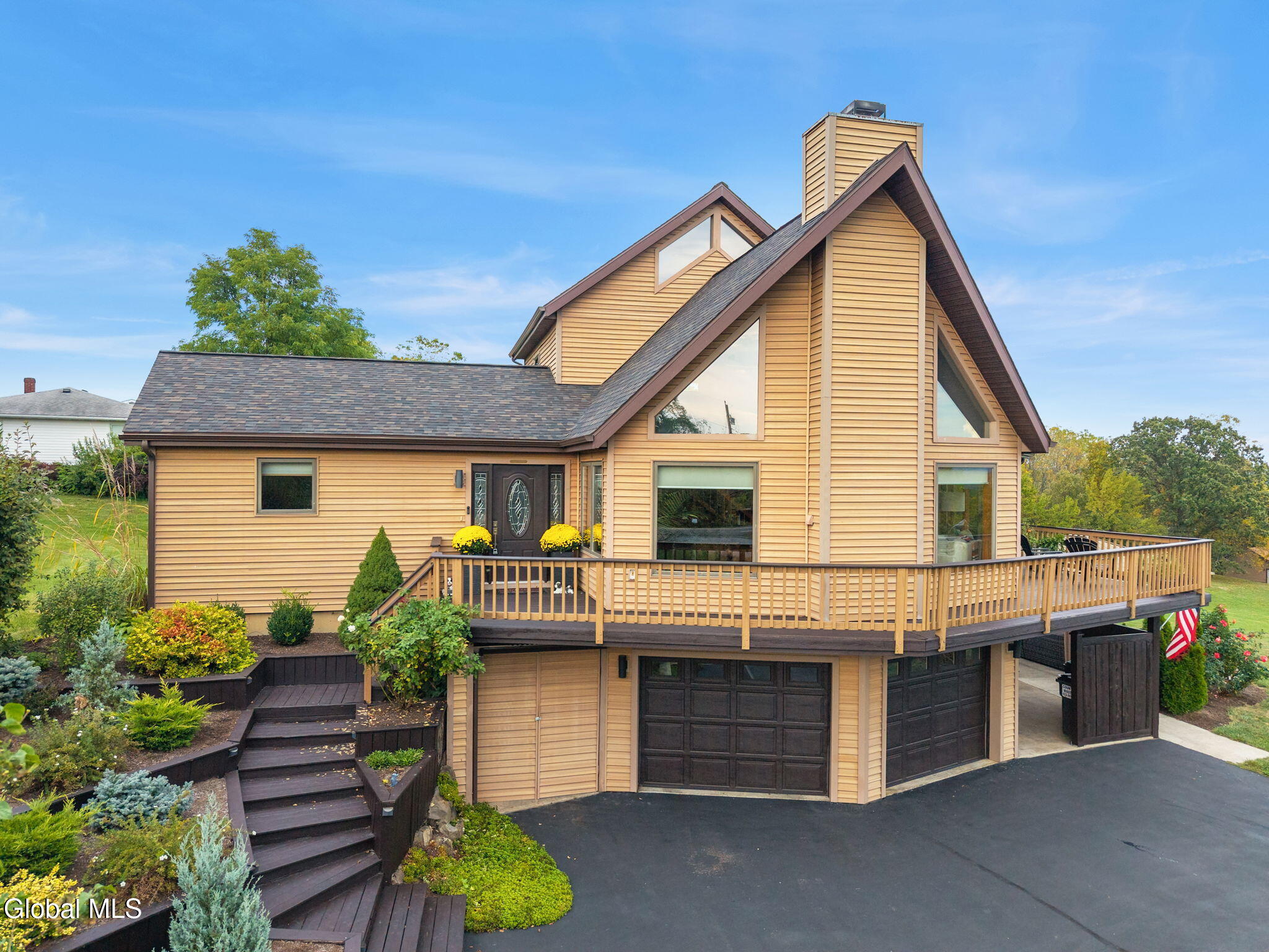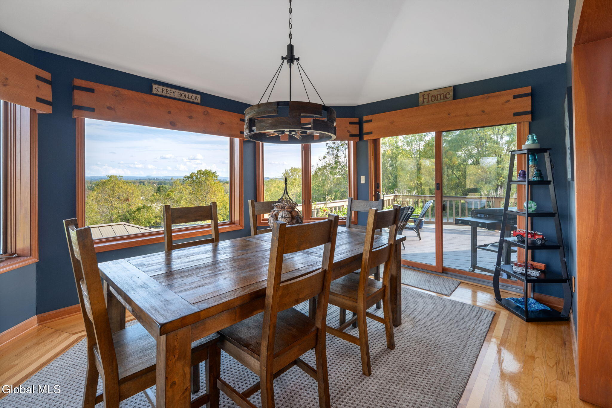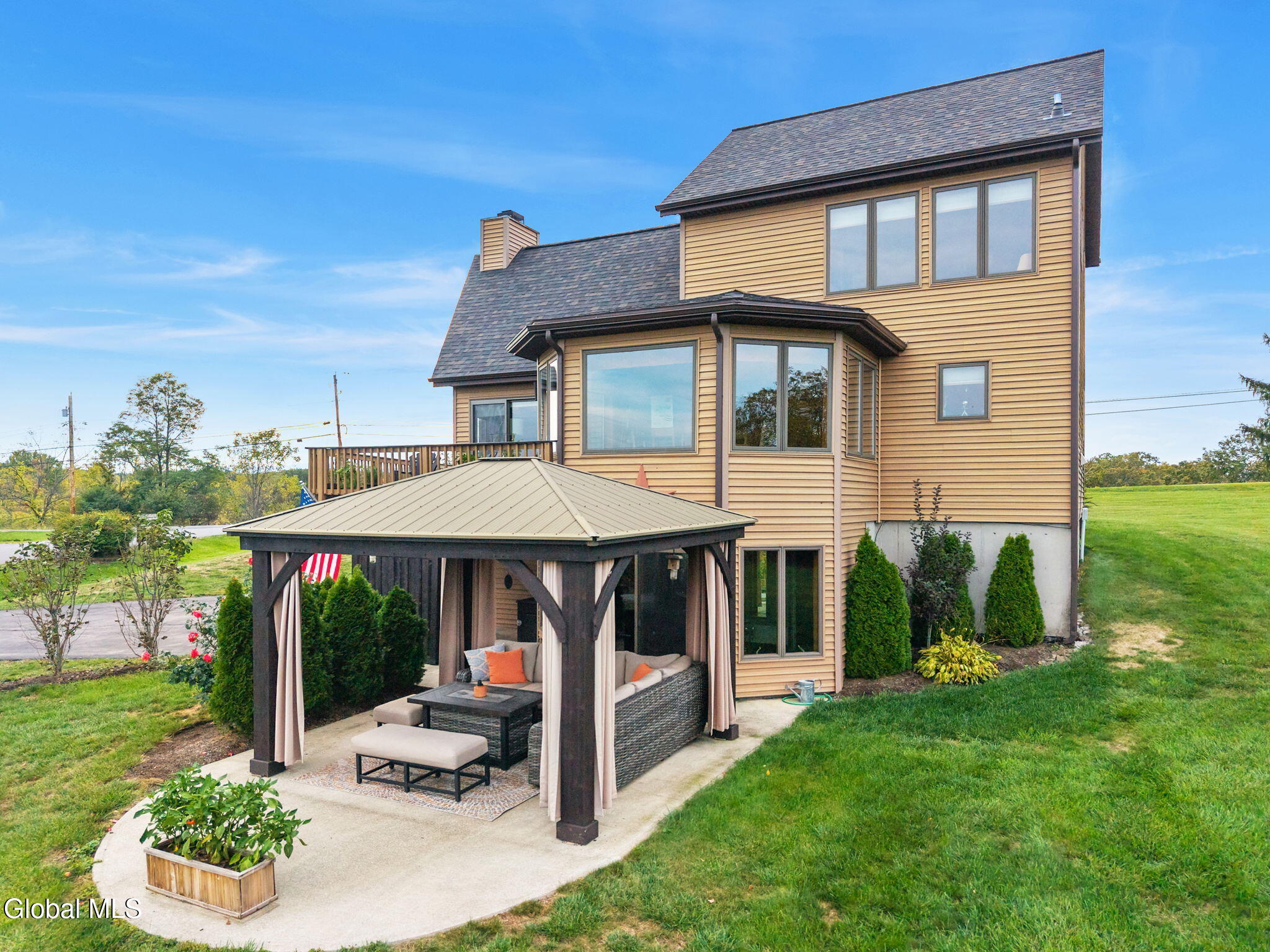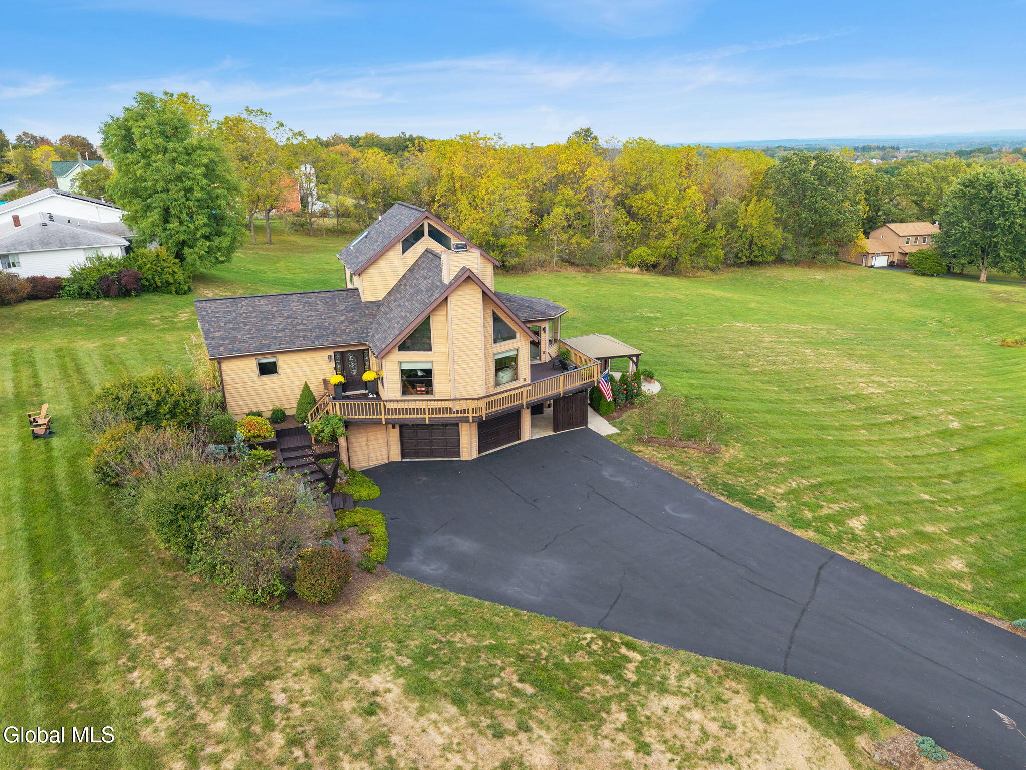 Breathtaking views from every room at this stylish, updated 3 bed / 3 full bath contemporary home on over an acre of land in the Sleepy Hollow Lake Community with wonderful lakeside amenities for all residents. Whip up delicious meals in the refreshed kitchen with granite counters, slate backsplash, useful island and newer appliances, including a handy beverage fridge. Gather round the table in the formal dining room with a sweeping panoramic view. Take the party outside onto the elevated wraparound deck with 180 degree view of the Berkshires & the Catskills in the distance. When it's time to unwind & relax you'll enjoy curling up in front of the gas fireplace flanked by custom windows under soaring celings in the living room. Spend lazy mornings upstairs in your gorgeous primary suite with huge walk in closet, lovely views of nature's beauty, and incredibly stylish primary bathroom featuring walk in shower, custom lighting, and custom concrete double vanity. Pull down the Murphy bed to quickly convert your home office into a guest room. There's space to play in the lower level rec room or workout in the home gym with door onto the extensive patio that's perfect for outdoor entertaining under the gazebo. Benefit from green geothermal heating & cooling. Practical laundry room has had a recent makeover. Tinker to your heart's content in the workshop. Built in shed offers plenty of storage for outdoor equipment. 2 car attached garage is heated. Luxury features include new central vac and inlaid hardwood floors. New roof in 2023 and brand new Andersen sliding glass doors. Affordable HOA is just $2,300 per year and you get access to all Sleepy Hollow Lake amenities including lake & beach access, clubhouse, 24-hour security, two heated in-ground pools, pickleball courts, and available boat slips with storage options.
