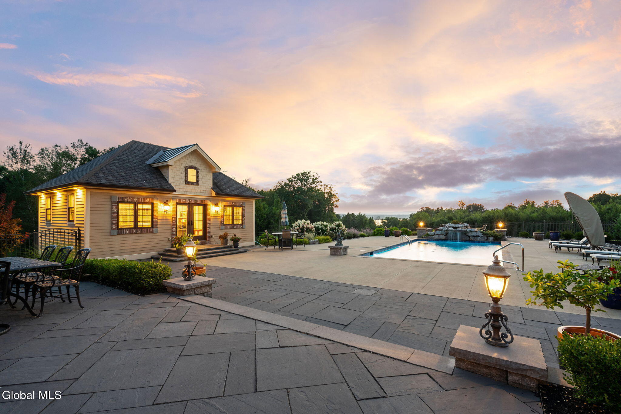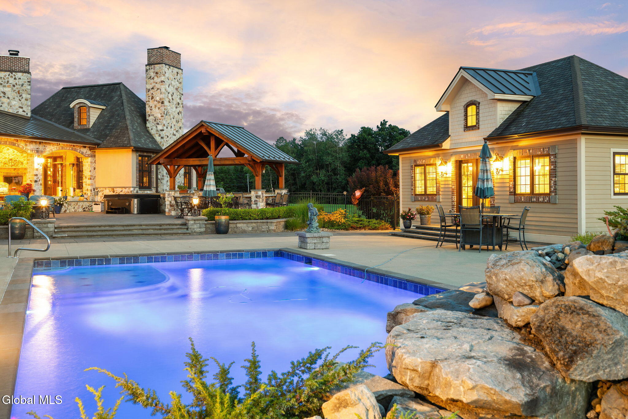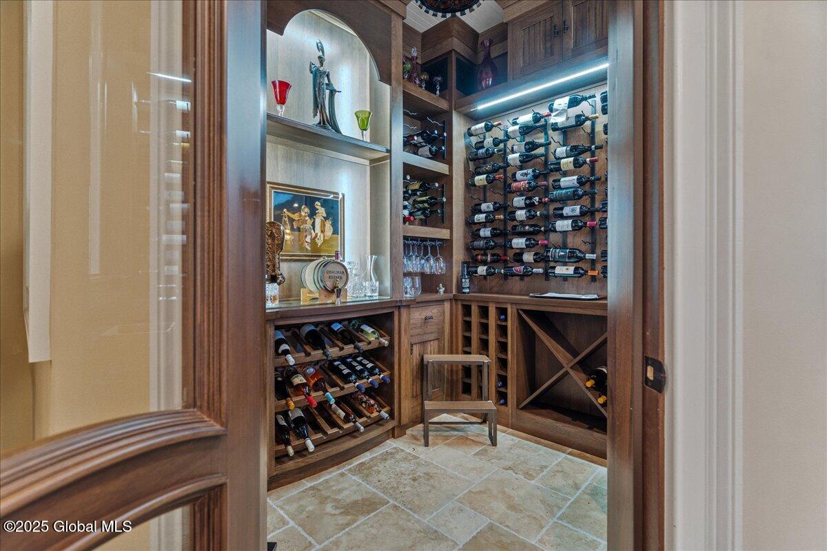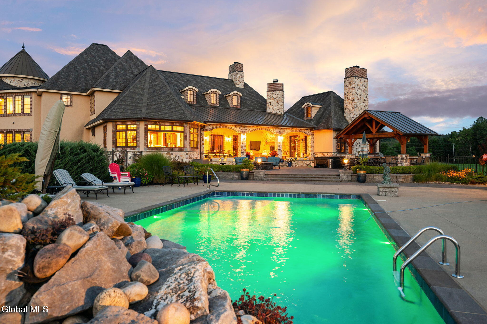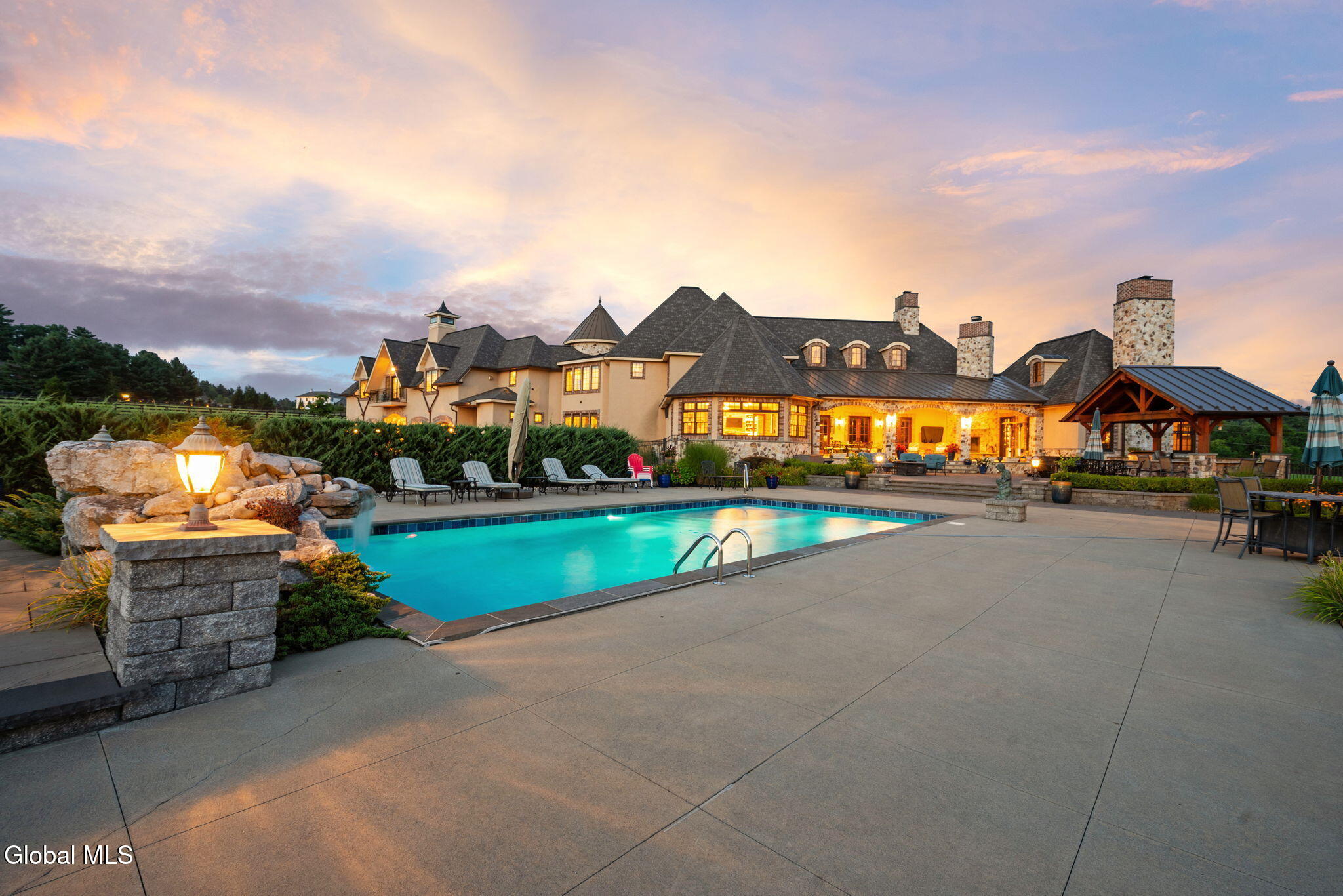 A Private French Country Château Overlooking Saratoga Lake Commanding 9.15 acres of pristine, private grounds, this 7,237± square-foot custom French Country château represents a rare opportunity to acquire a legacy estate in one of Saratoga's most coveted settings. Designed to international luxury standards, the residence blends classical European influence with modern, uncompromising craftsmanship—offering an elevated lifestyle defined by privacy, elegance, and enduring value. The home features five expansive bedroom suites and 7.5 beautifully curated baths, each designed as a private retreat. At the heart of the residence, the chef's kitchen showcases Miele appliances, an imported Italian backsplash, a dramatic marble island, and an oversized walk-in pantry, catering seamlessly to both refined daily living and large-scale entertaining. Grand yet inviting, the Great Room is ideal for hosting distinguished gatherings, while the sophisticated Club Room with full bar offers a refined setting for private evenings and social occasions. A private elevator and grand staircase lead to the Primary Suite, a sanctuary of understated opulence featuring a spa-level white marble bath, freestanding soaking tub, steam shower, and private sauna—a retreat rivaling the world's finest hotels. Arrival is marked by an elegant porte-cochère, leading to a heated four car garage, thoughtfully designed for discerning collectors. Outdoors, the estate unfolds into a resort-style sanctuary, where a beautifully positioned pool, hot tub, built-in barbecue, and serene natural surroundings frame sweeping views of Saratoga Lake. A separate pool house, complete with kitchenette, bath, and fireplace, provides exceptional accommodations for guests and year-round entertaining. Offered to a global audience seeking privacy, prestige, and architectural distinction, this extraordinary property stands apart as a timeless Saratoga Lake estate— IMPOSSIBLE TO REPLACE!
