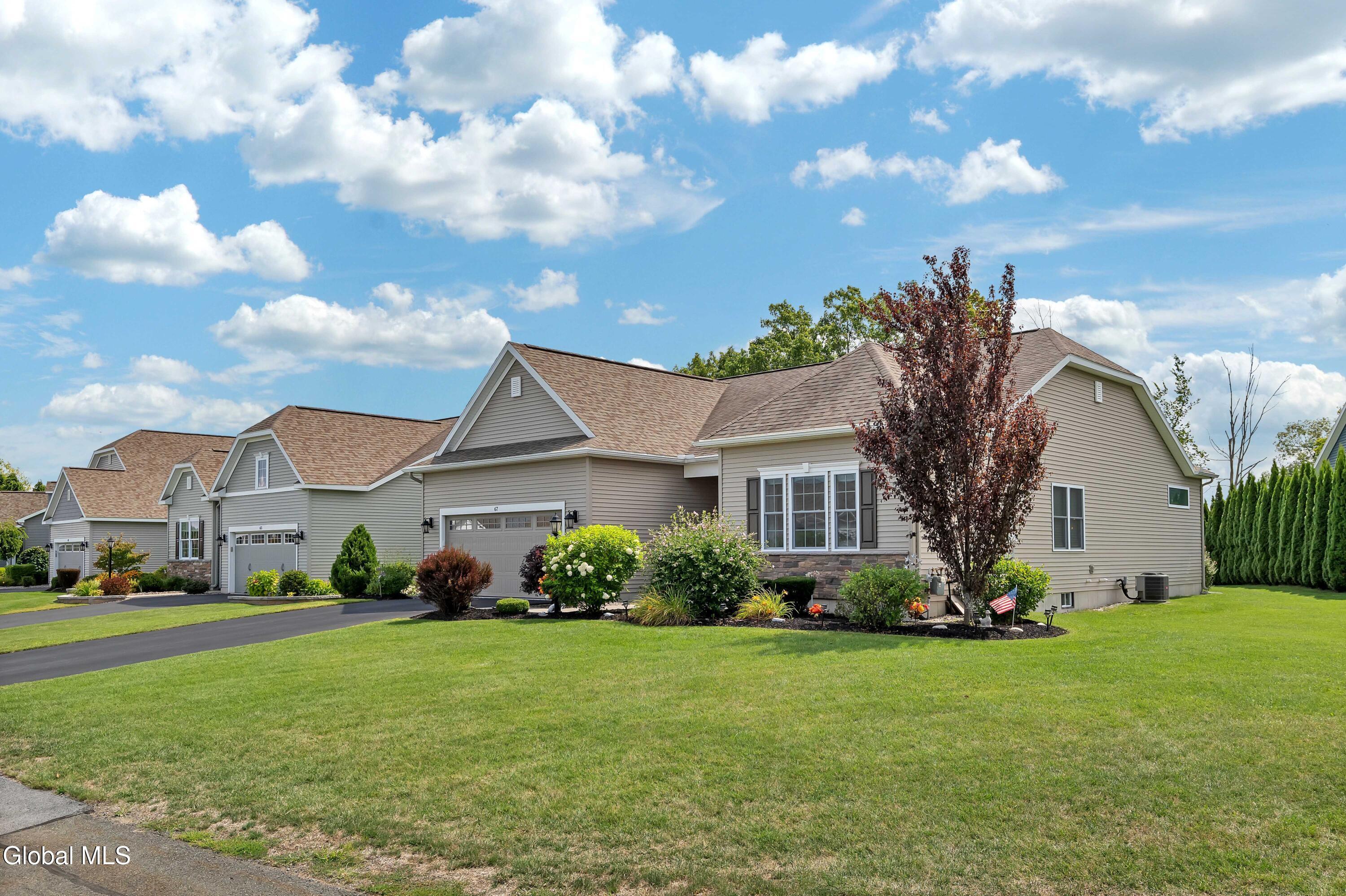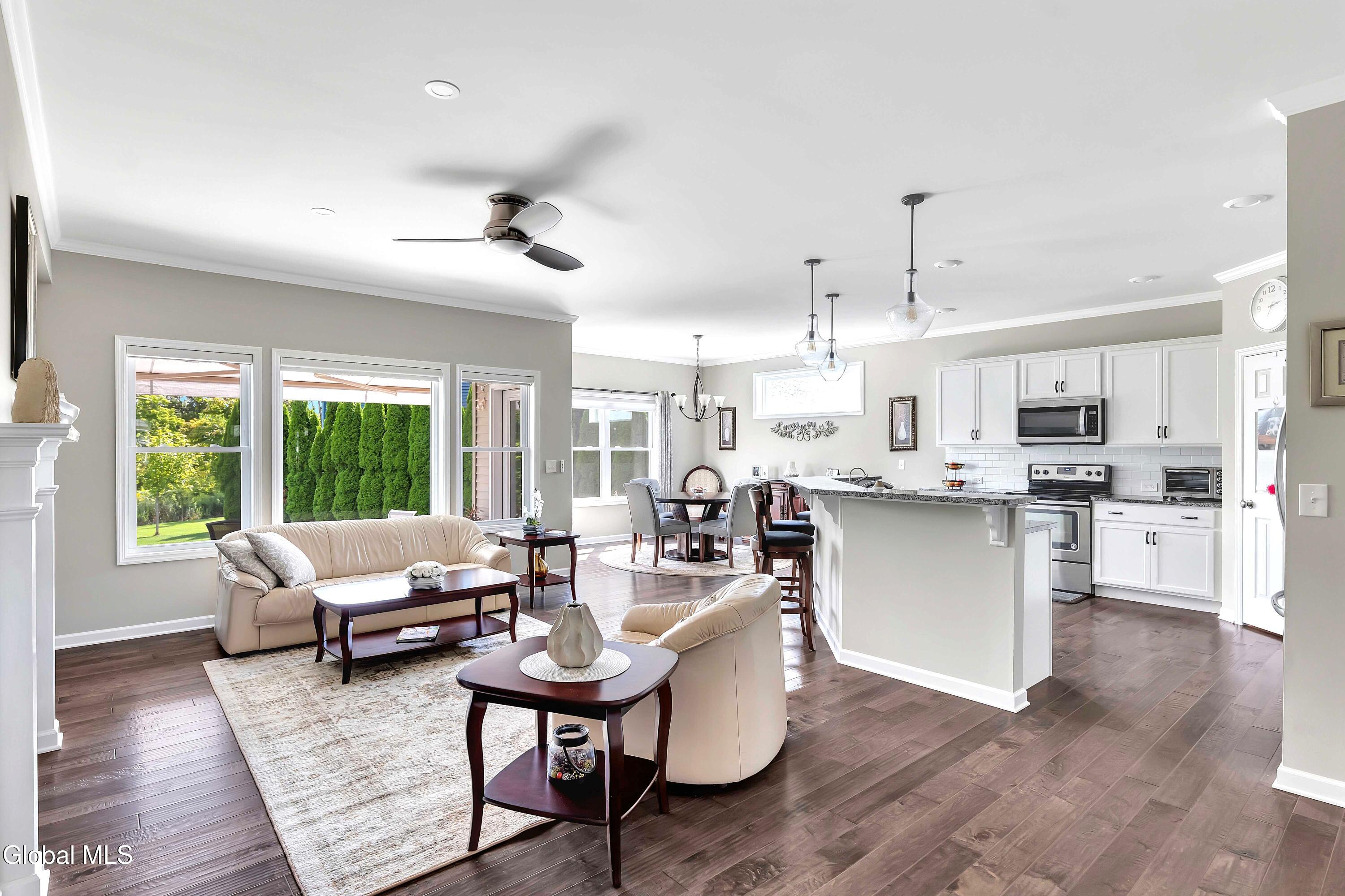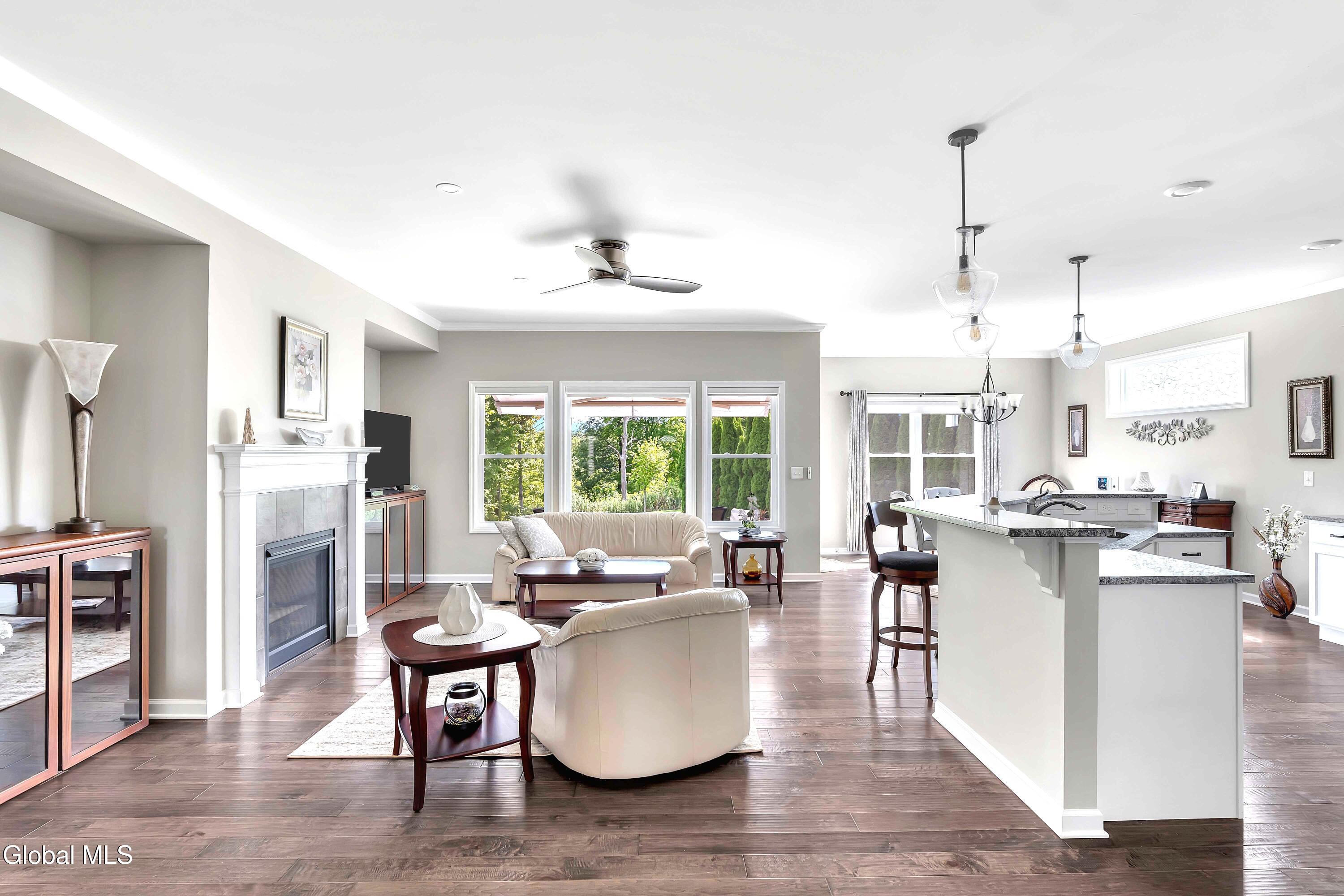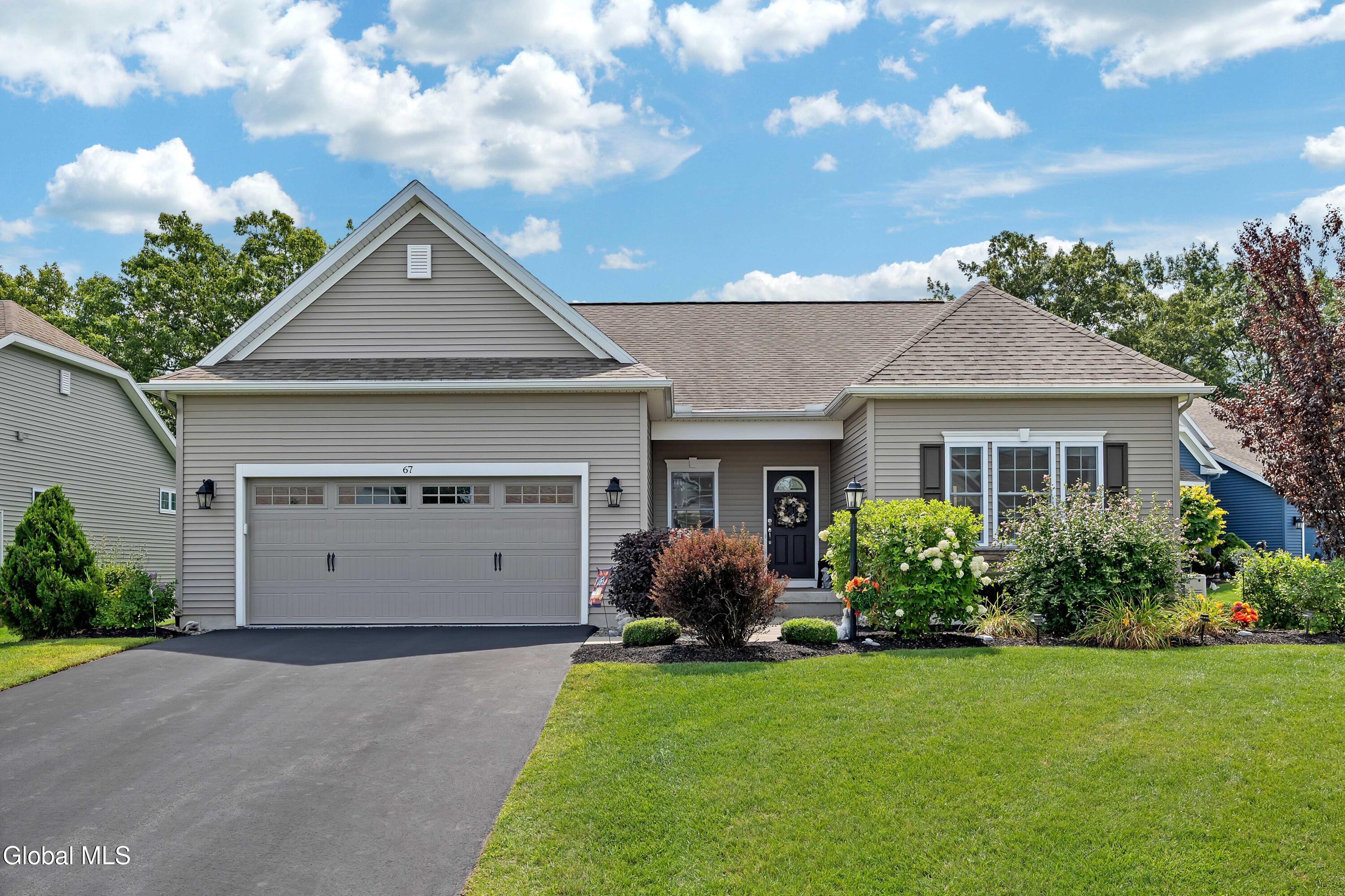 This stunning, like-new custom ranch offers the perfect blend of style, comfort, and easy living. Featuring 3 spacious bedrooms and 2.5 baths, this beautifully maintained and thoughtfully upgraded and meticulously maintained home offers the perfect balance of space, style, and maintenance-free living. Step inside to find a light filled open design where the great room, kitchen and dining flow seamlessly together — ideal for both relaxing and entertaining. Hand-scraped wide plank hardwood floors enrich the main living spaces with warmth, durability, and character. At the heart of the home, the kitchen features hand-selected granite countertops, 36'' cabinets with crown molding, dovetail soft-close drawers and doors, and a large walk-in pantry. The expansive island with bar seating makes the perfect spot for gathering, cooking, or casual dining. The luxury primary suite is a true retreat, showcasing a large private bath with an oversized tiled shower with built in bench seat and glass doors, a spacious vanity, and not one, but TWO generous walk in closets! Two additional bedrooms provide comfort and flexibility for family, guests, or a home office. The finished basement with half bath offers endless possibilities — from recreation space to home gym or media room — while thoughtful details throughout the home such as crown molding and Hunter Douglas custom blinds ensure both beauty and function; practical touches like the large mudroom, walk-in laundry room, reverse osmosis drinking water, a whole house generator and epoxy-coated garage floor add to the home's ease and functionality. Blending elegance with everyday comfort situated on a scenic lot with forever wild in the rear, this home is a rare find for those seeking space, quality, and carefree living.