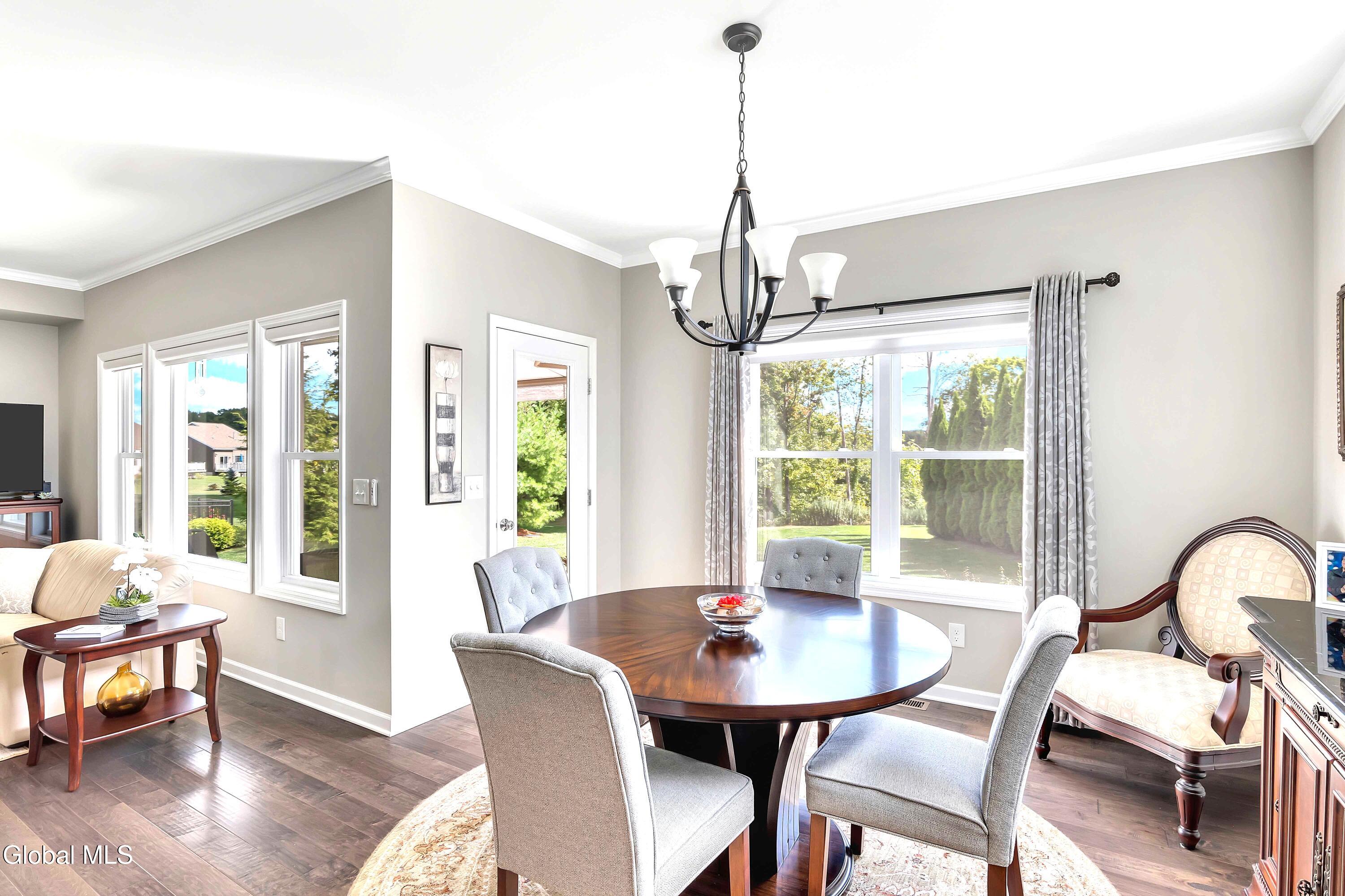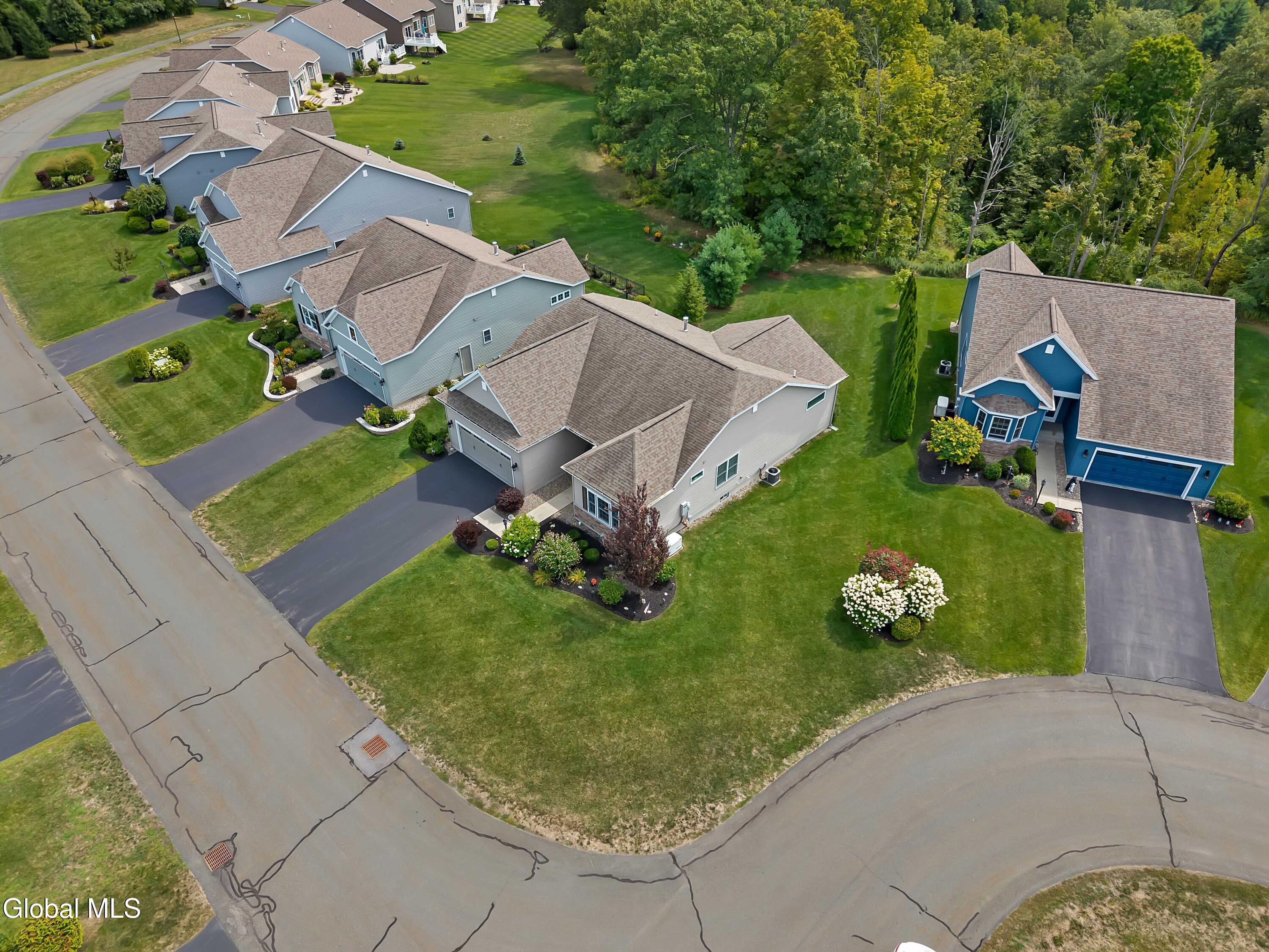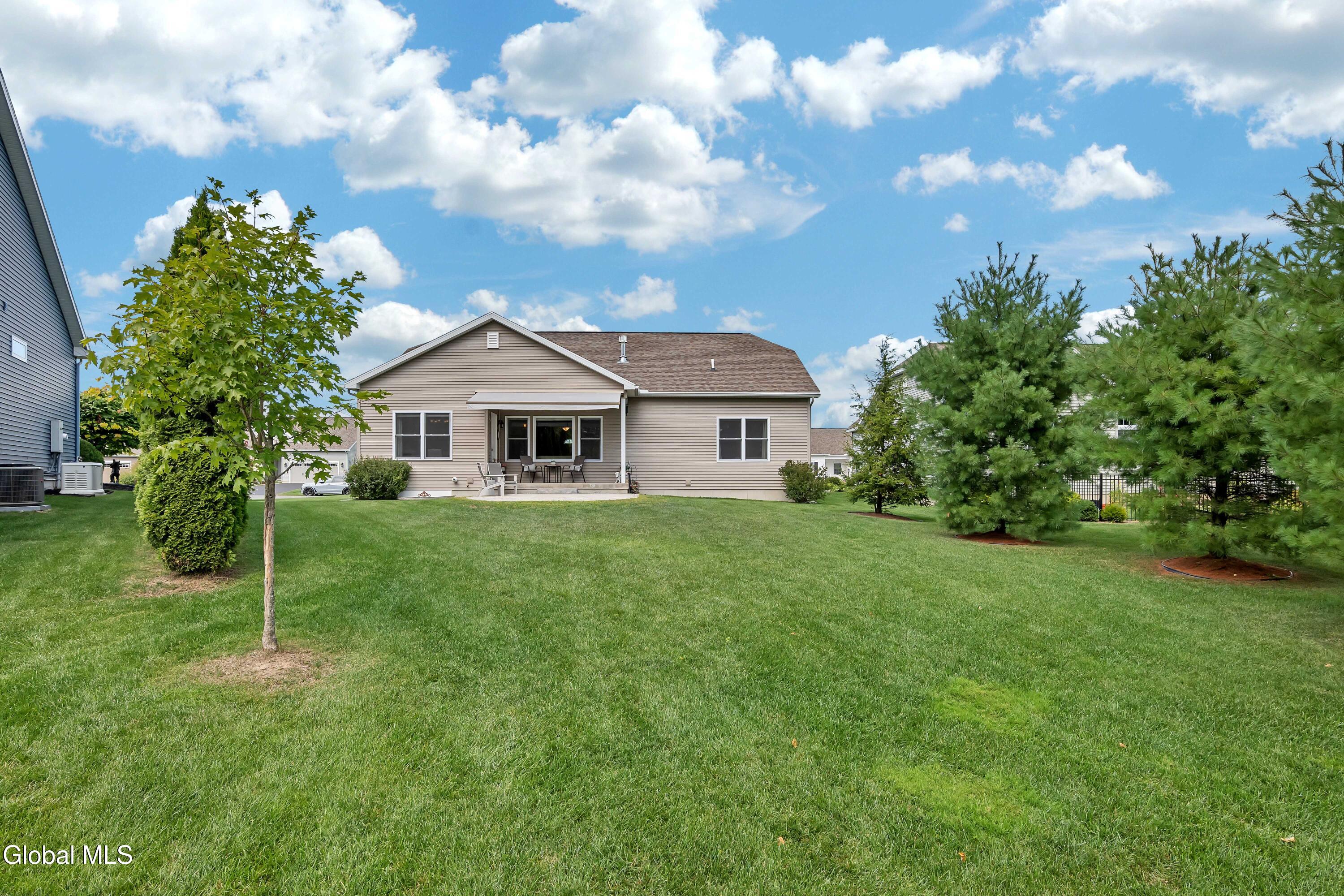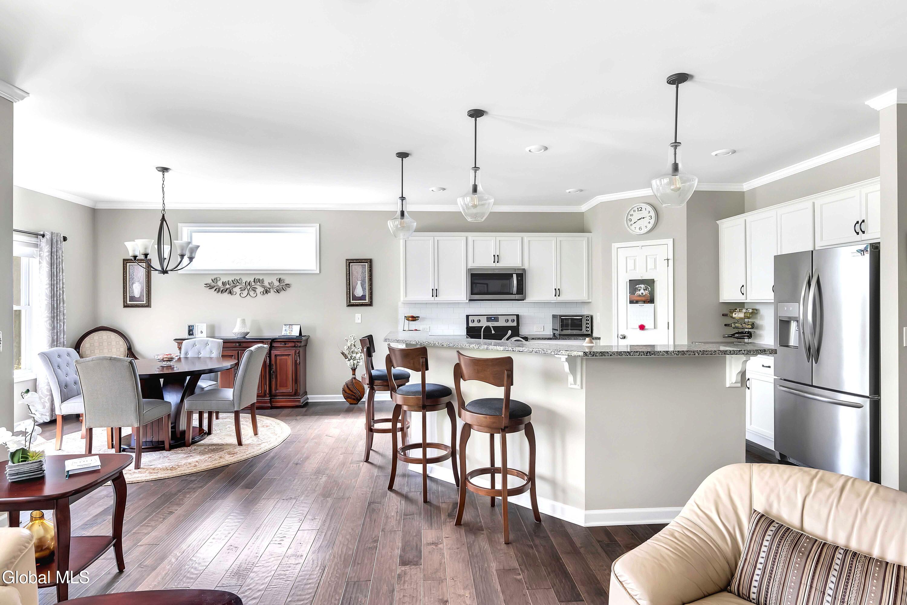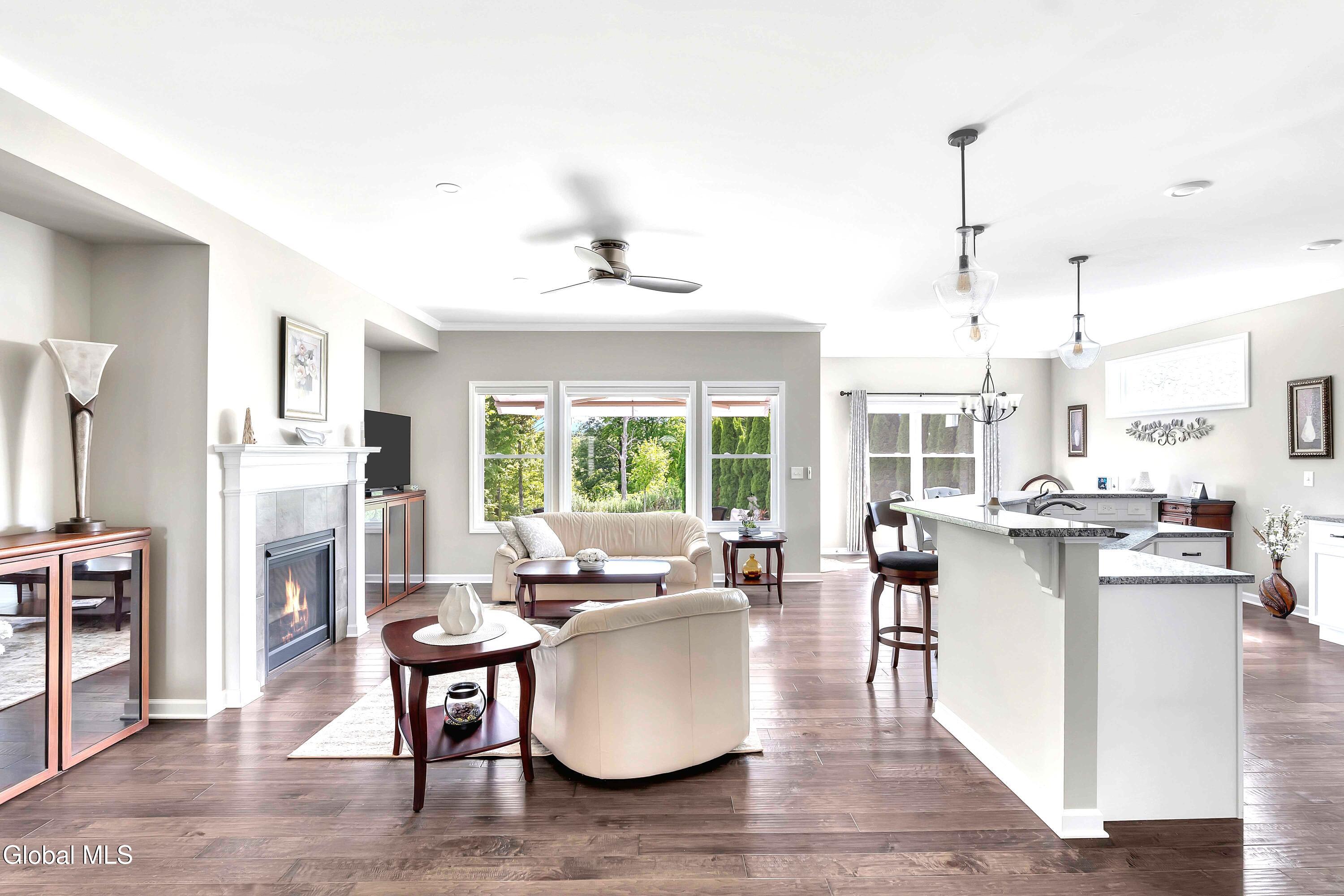 This stunning, like-new custom ranch offers the perfect blend of style, comfort, and easy living. Featuring 3 spacious bedrooms and 2.5 baths, this beautifully maintained and thoughtfully upgraded and meticulously maintained home offers the perfect balance of space, style, and maintenance-free living. Step inside to find a light filled open design where the great room, kitchen and dining flow seamlessly together — ideal for both relaxing and entertaining. Hand-scraped wide plank hardwood floors enrich the main living spaces with warmth, durability, and character. At the heart of the home, the kitchen features hand-selected granite countertops, 36'' cabinets with crown molding, dovetail soft-close drawers and doors, and a large walk-in pantry. The expansive island with bar seating makes the perfect spot for gathering, cooking, or casual dining. The luxury primary suite is a true retreat, showcasing a large private bath with an oversized tiled shower with built in bench seat and glass doors, a spacious vanity, and not one, but TWO generous walk in closets! Two additional bedrooms provide comfort and flexibility for family, guests, or a home office. The finished basement with half bath offers endless possibilities — from recreation space to home gym or media room — while thoughtful details throughout the home such as crown molding and Hunter Douglas custom blinds ensure both beauty and function; practical touches like the large mudroom, walk-in laundry room, reverse osmosis drinking water, a whole house generator and epoxy-coated garage floor add to the home's ease and functionality. Blending elegance with everyday comfort situated on a scenic lot with forever wild in the rear, this home is a rare find for those seeking space, quality, and carefree living.