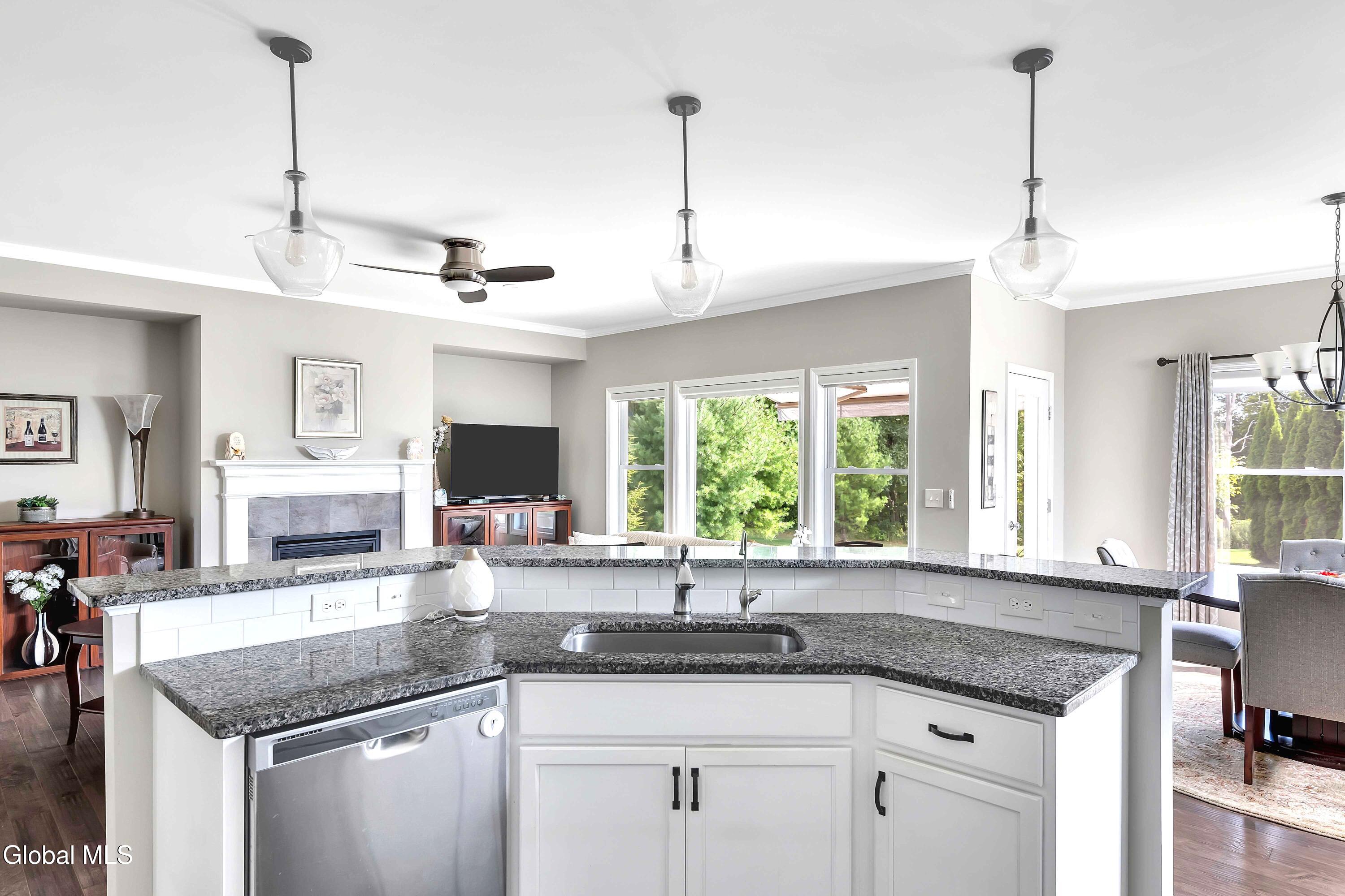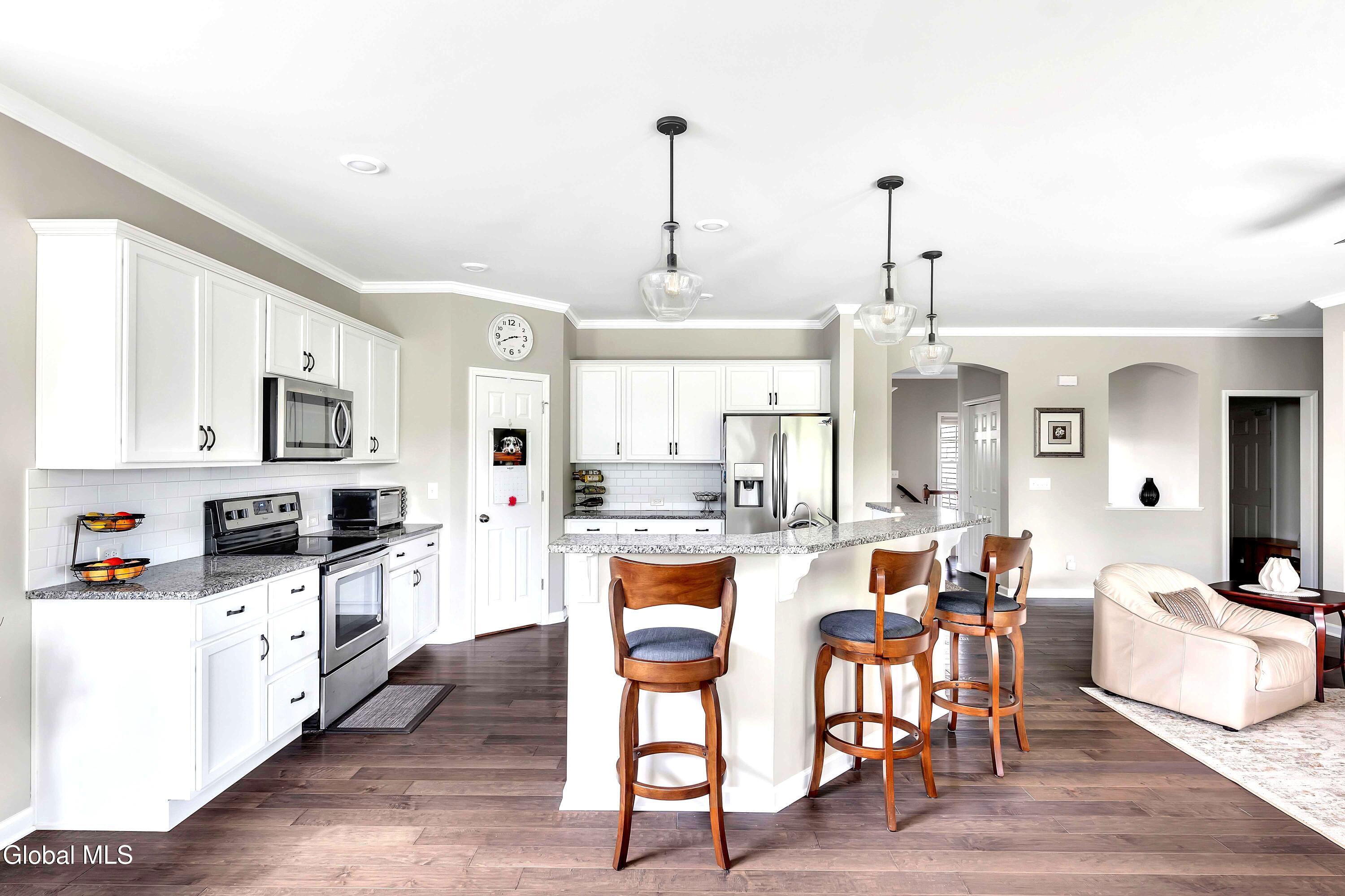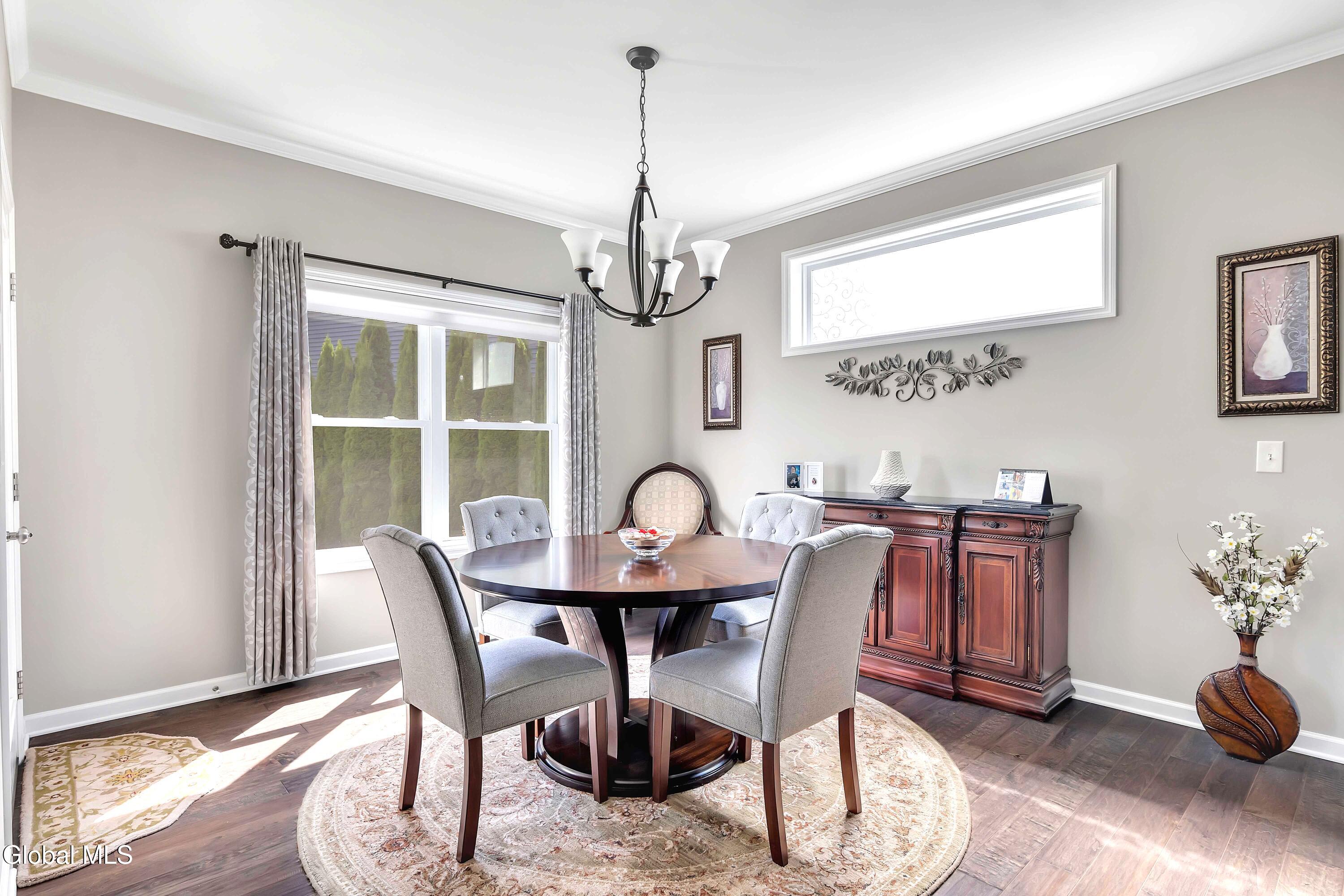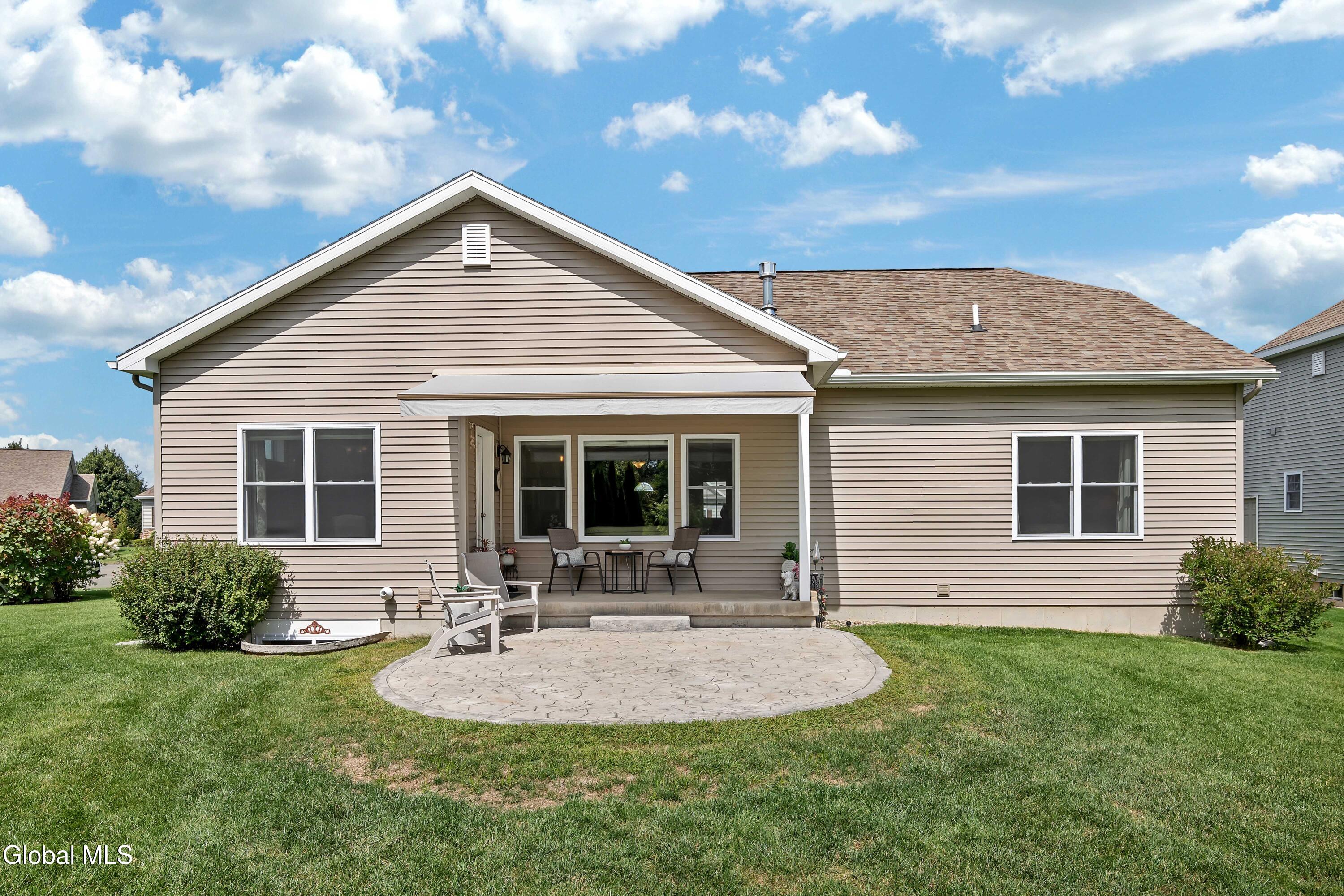 This stunning, like-new custom ranch offers the perfect blend of style, comfort, and easy living. Featuring 3 spacious bedrooms and 2.5 baths, this beautifully maintained and thoughtfully upgraded and meticulously maintained home offers the perfect balance of space, style, and maintenance-free living. Step inside to find a light filled open design where the great room, kitchen and dining flow seamlessly together — ideal for both relaxing and entertaining. Hand-scraped wide plank hardwood floors enrich the main living spaces with warmth, durability, and character. At the heart of the home, the kitchen features hand-selected granite countertops, 36'' cabinets with crown molding, dovetail soft-close drawers and doors, and a large walk-in pantry. The expansive island with bar seating makes the perfect spot for gathering, cooking, or casual dining. The luxury primary suite is a true retreat, showcasing a large private bath with an oversized tiled shower with built in bench seat and glass doors, a spacious vanity, and not one, but TWO generous walk in closets! Two additional bedrooms provide comfort and flexibility for family, guests, or a home office. The finished basement with half bath offers endless possibilities — from recreation space to home gym or media room — while thoughtful details throughout the home such as crown molding and Hunter Douglas custom blinds ensure both beauty and function; practical touches like the large mudroom, walk-in laundry room, reverse osmosis drinking water, a whole house generator and epoxy-coated garage floor add to the home's ease and functionality. Blending elegance with everyday comfort situated on a scenic lot with forever wild in the rear, this home is a rare find for those seeking space, quality, and carefree living.