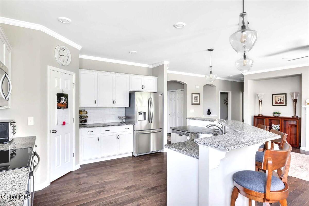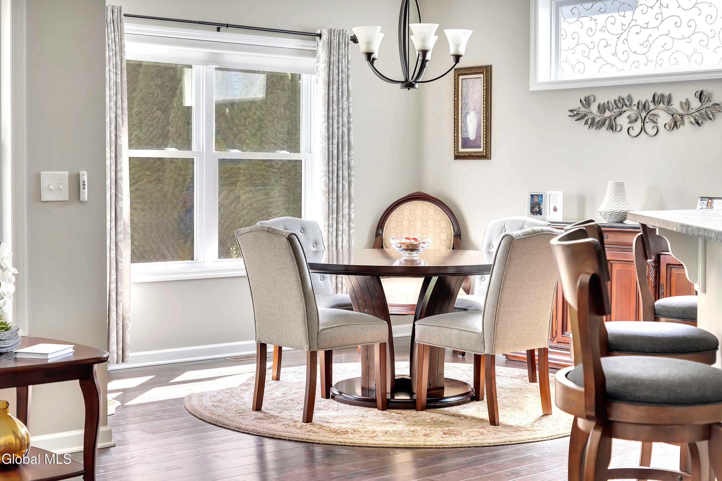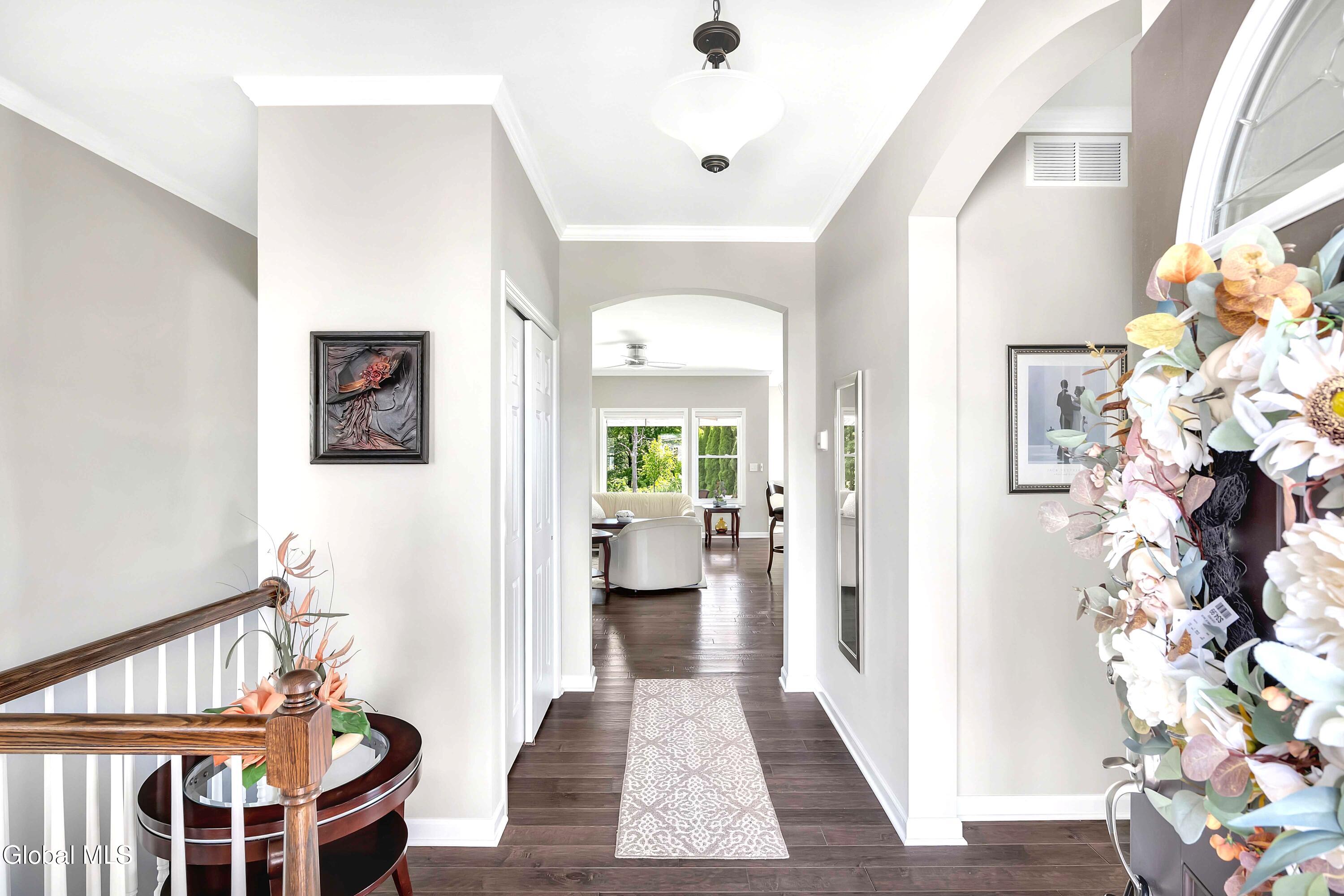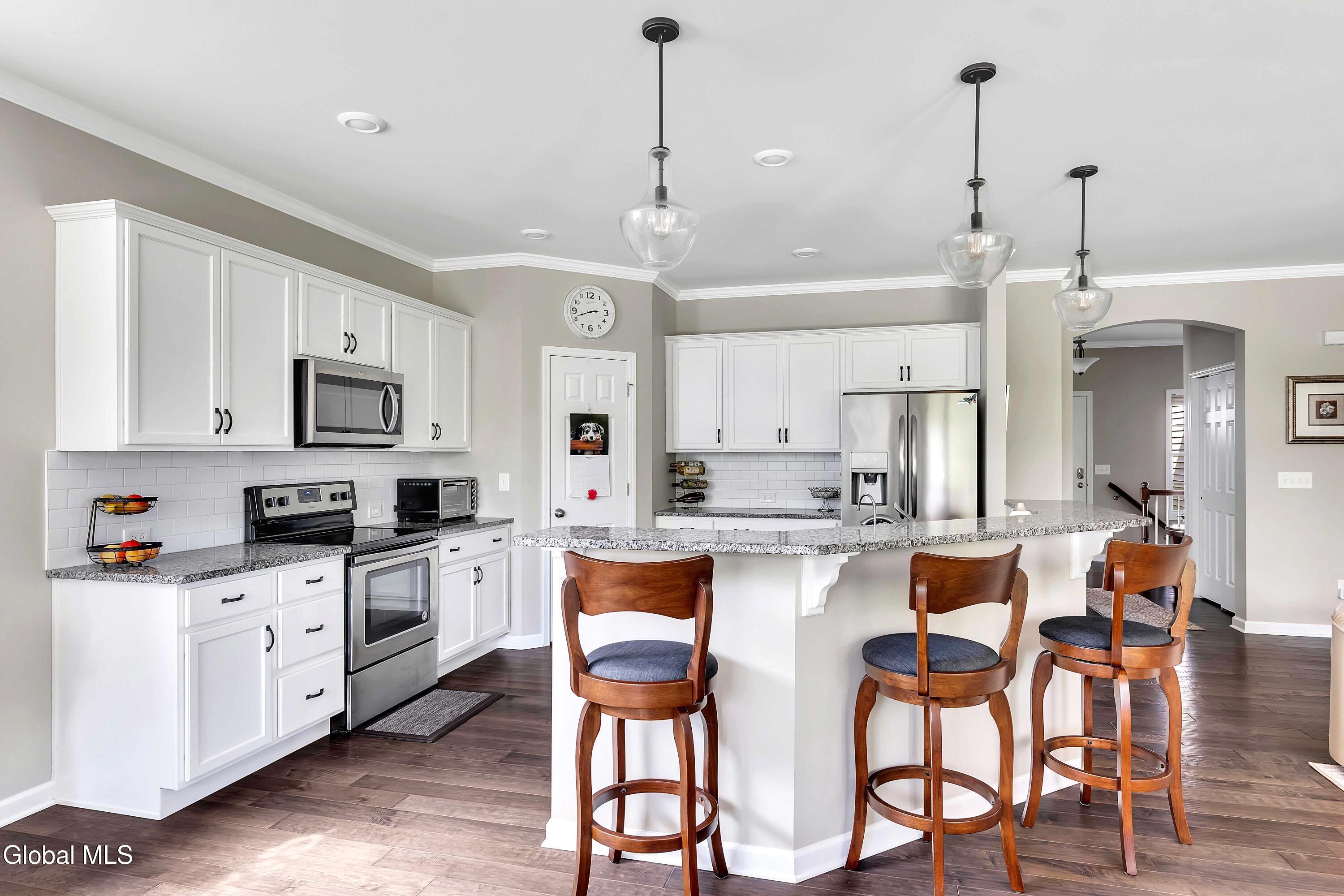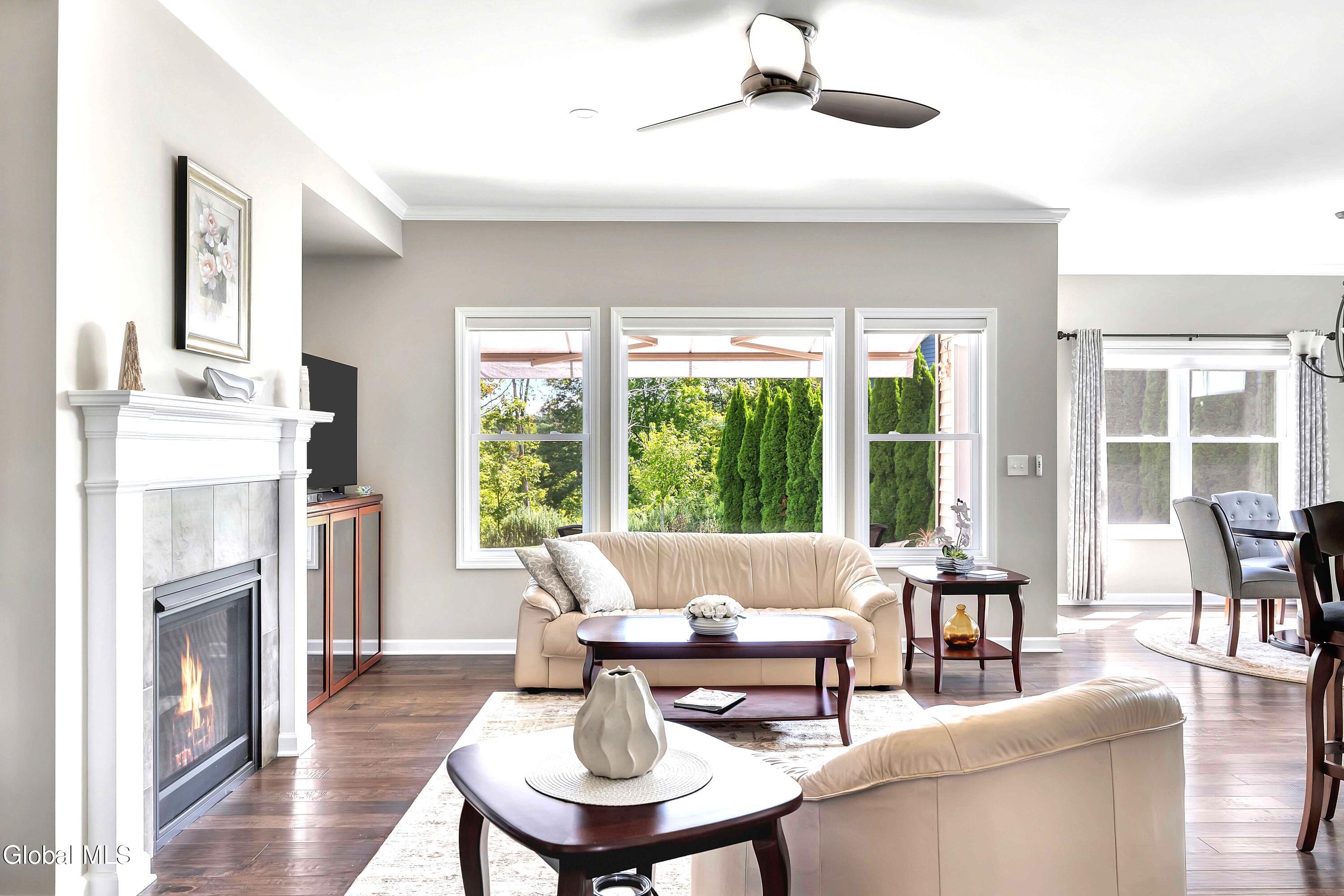 This stunning, like-new custom ranch offers the perfect blend of style, comfort, and easy living. Featuring 3 spacious bedrooms and 2.5 baths, this beautifully maintained and thoughtfully upgraded and meticulously maintained home offers the perfect balance of space, style, and maintenance-free living. Step inside to find a light filled open design where the great room, kitchen and dining flow seamlessly together — ideal for both relaxing and entertaining. Hand-scraped wide plank hardwood floors enrich the main living spaces with warmth, durability, and character. At the heart of the home, the kitchen features hand-selected granite countertops, 36'' cabinets with crown molding, dovetail soft-close drawers and doors, and a large walk-in pantry. The expansive island with bar seating makes the perfect spot for gathering, cooking, or casual dining. The luxury primary suite is a true retreat, showcasing a large private bath with an oversized tiled shower with built in bench seat and glass doors, a spacious vanity, and not one, but TWO generous walk in closets! Two additional bedrooms provide comfort and flexibility for family, guests, or a home office. The finished basement with half bath offers endless possibilities — from recreation space to home gym or media room — while thoughtful details throughout the home such as crown molding and Hunter Douglas custom blinds ensure both beauty and function; practical touches like the large mudroom, walk-in laundry room, reverse osmosis drinking water, a whole house generator and epoxy-coated garage floor add to the home's ease and functionality. Blending elegance with everyday comfort situated on a scenic lot with forever wild in the rear, this home is a rare find for those seeking space, quality, and carefree living.