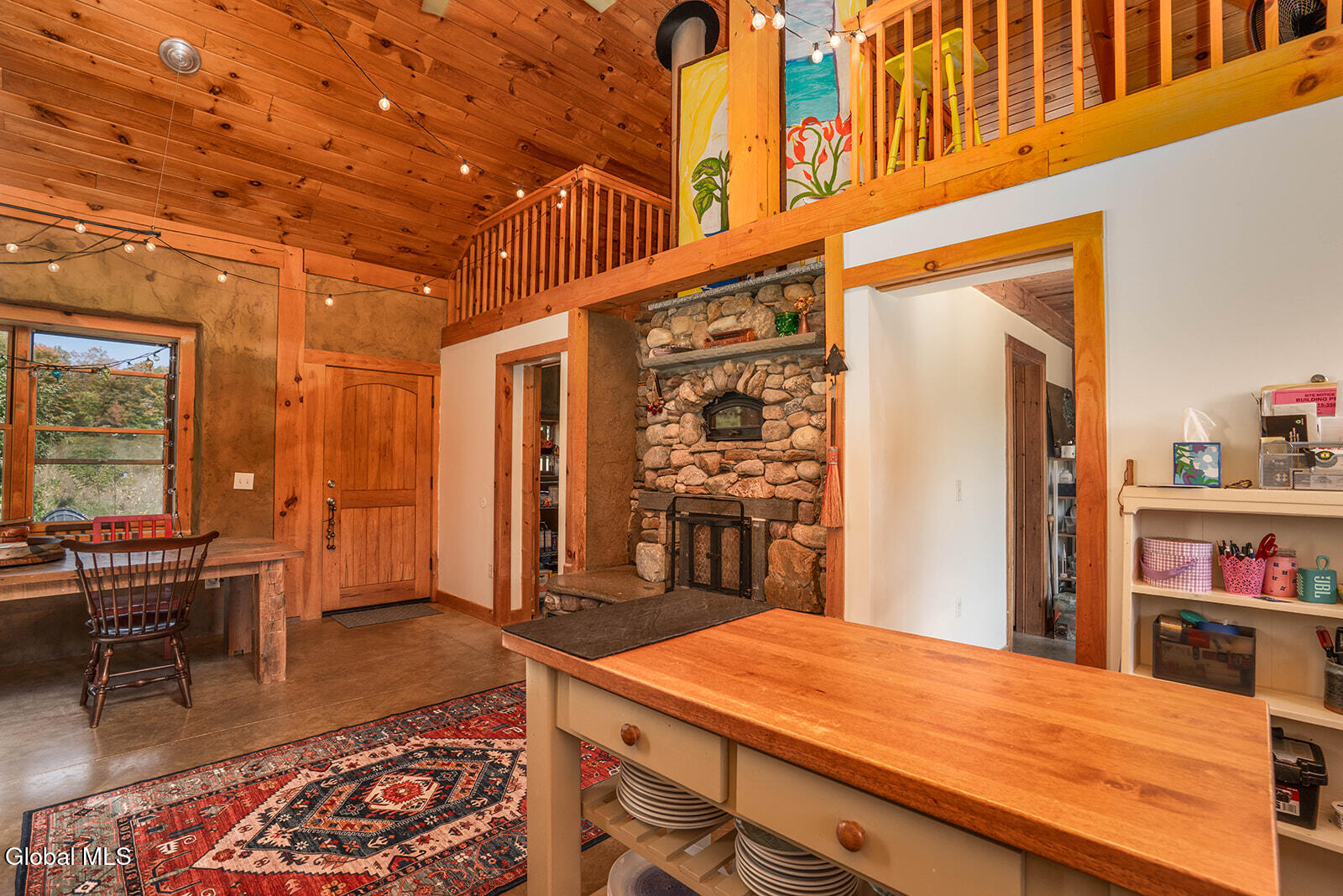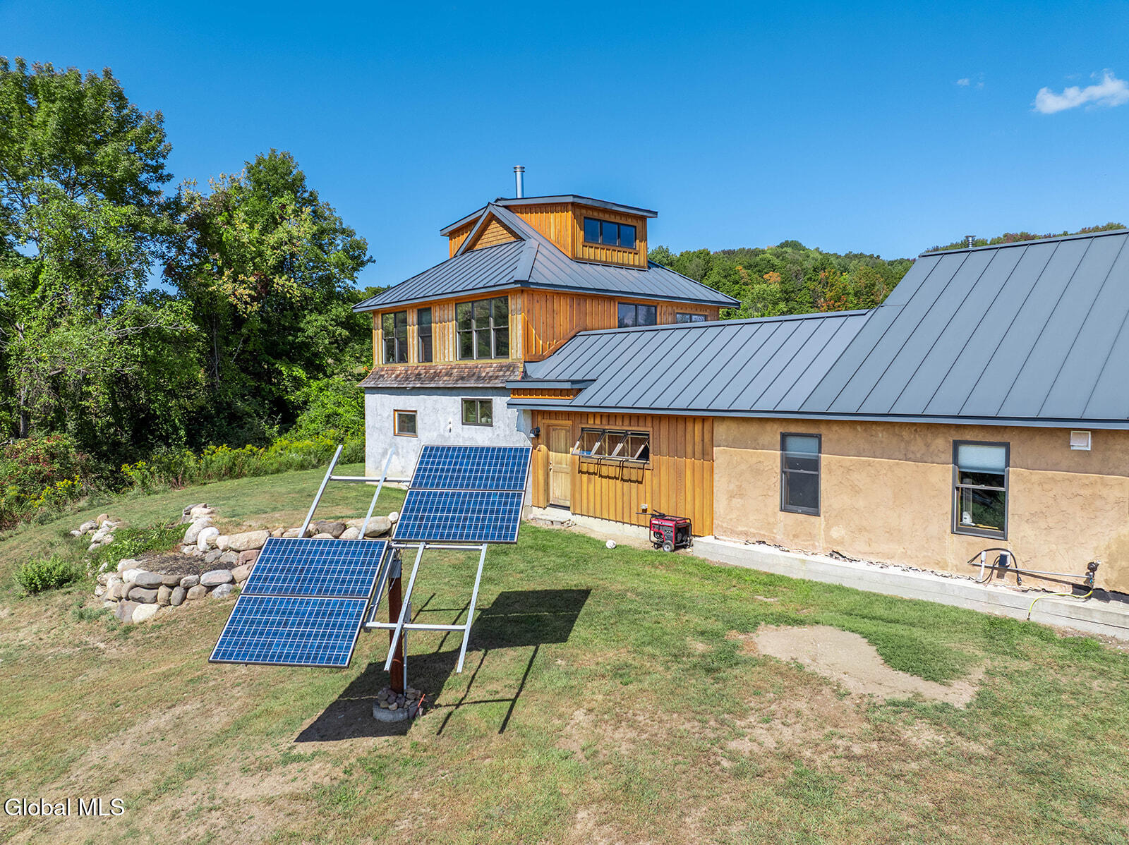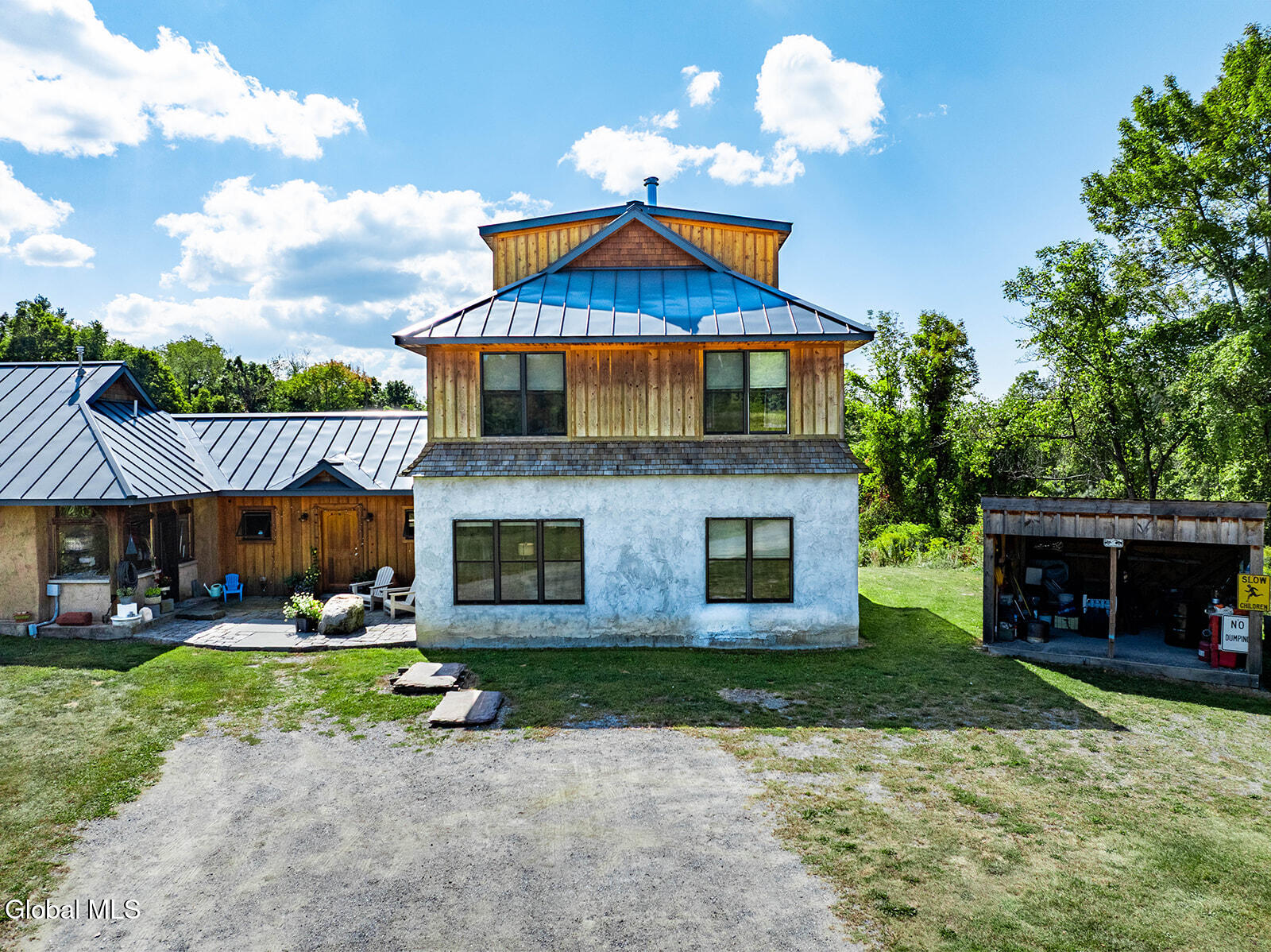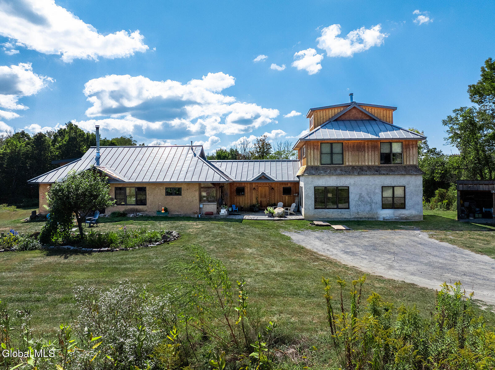 This ecologically friendly 4+ bedroom home blends creativity and sustainability with its strawbale construction, unique design, light-filled rooms, and a flexible floor plan. The eat-in kitchen, with cathedral ceilings, centers around a striking Finnish contra-flow masonry heater with a built-in pizza oven. The main living area also offers a cozy loft, pantry, full bath, living room, utility room, and a spacious mudroom. The first-floor primary suite has its own exterior access and an adjacent bath, currently a half bath but plumbed for a walk-in rain shower and soaking tub. Upstairs, you'll find three bedrooms, a half bath, and an office, plus a third-floor studio or game room. Radiant floor heating is a welcome reprieve from winter's chills. An intricate masonry patio welcomes you to the home, while 7.8 private acres of mostly open meadow provide ample space for homesteading, animals, or simply enjoying the outdoors. Established gardens, a small pond, and two outbuildings enhance the setting. Perfectly situated, the property is just minutes from Cossayuna Lake, Carter's Pond Wildlife Area, and the Battenkill, and less than 45 minutes to Saratoga Springs, NY, or Manchester, VT. With a few finishing touches, this one-of-a-kind property is ready to become your ideal full-time residence or spacious vacation retreat, offering plenty of room for family and friends.