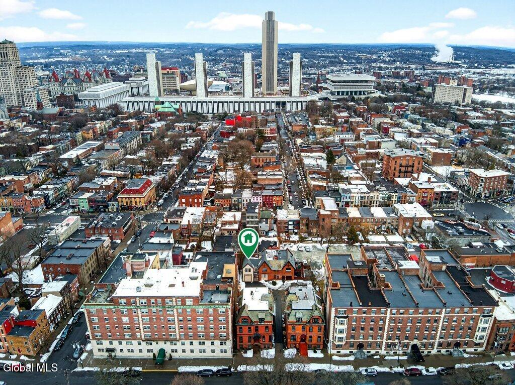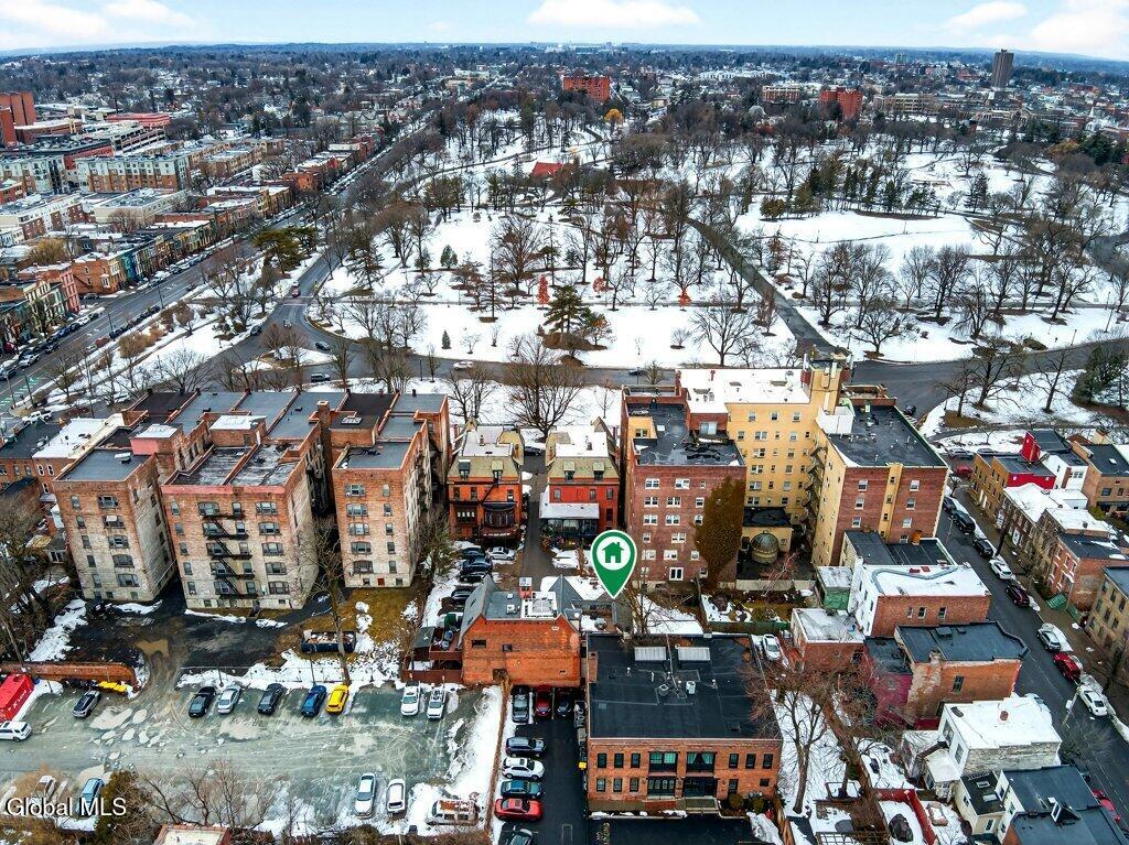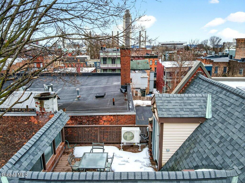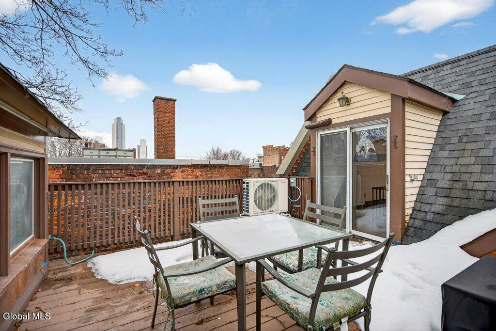 Welcome to 78A Willett Street, Albany. This unique and memorable home was created in an 1800's carriage house, it has 3 floors and over 2400sq ft of living space with a garage and 3rd floor patio/deck over looking downtown skyline. The first floor consists of a huge primary suite, with laundry, walk-in closet and updated bath. The second floor has soaring ceilings, and is bright and airy, with skylights, a large picture window, and tons of natural light. A massive chef's dream kitchen with 4X9 Island, white Cafe appliances, tons of cabinets and storage, huge windows and is enviable! This opens up into the living room with cathedral ceilings and floor to ceiling fireplace, built in bookcase with rolling ladder, and an impressive spa-like full bath with stand alone soaking tub and shower. Then the spiral staircase leads you to the 3rd floor loft and deck. This property is full of flex space(s) and has so many possibilities. Make the loft an office or a bedroom, with its own 1/2 bath too. The deck/patio is perfect for watching the fireworks on the 4th, such a cool and unique space. The property has been thoughtfully updated and maintained. There is new on -demand hot water, ductless air conditioning, kitchen, baths, and roof. All you have to do is stop by and fall in love. You have arrived home, with your own garage and additional parking, in Albany, Across from Washington Park, set back from the street. Take the virtual tour or see it in person, you won't be disappointed.