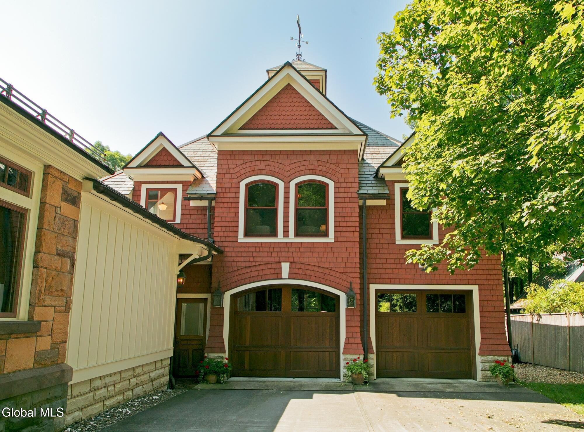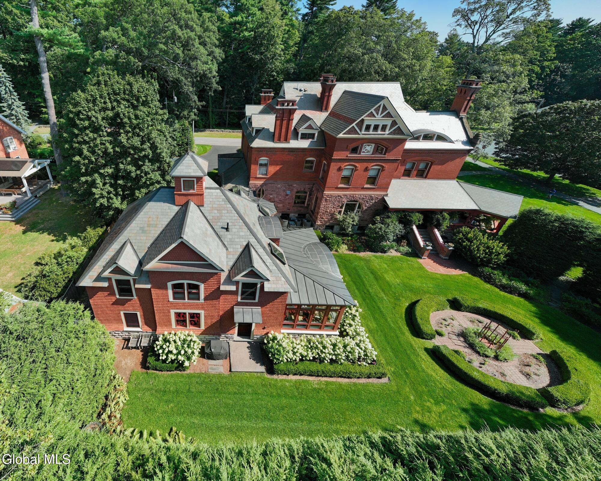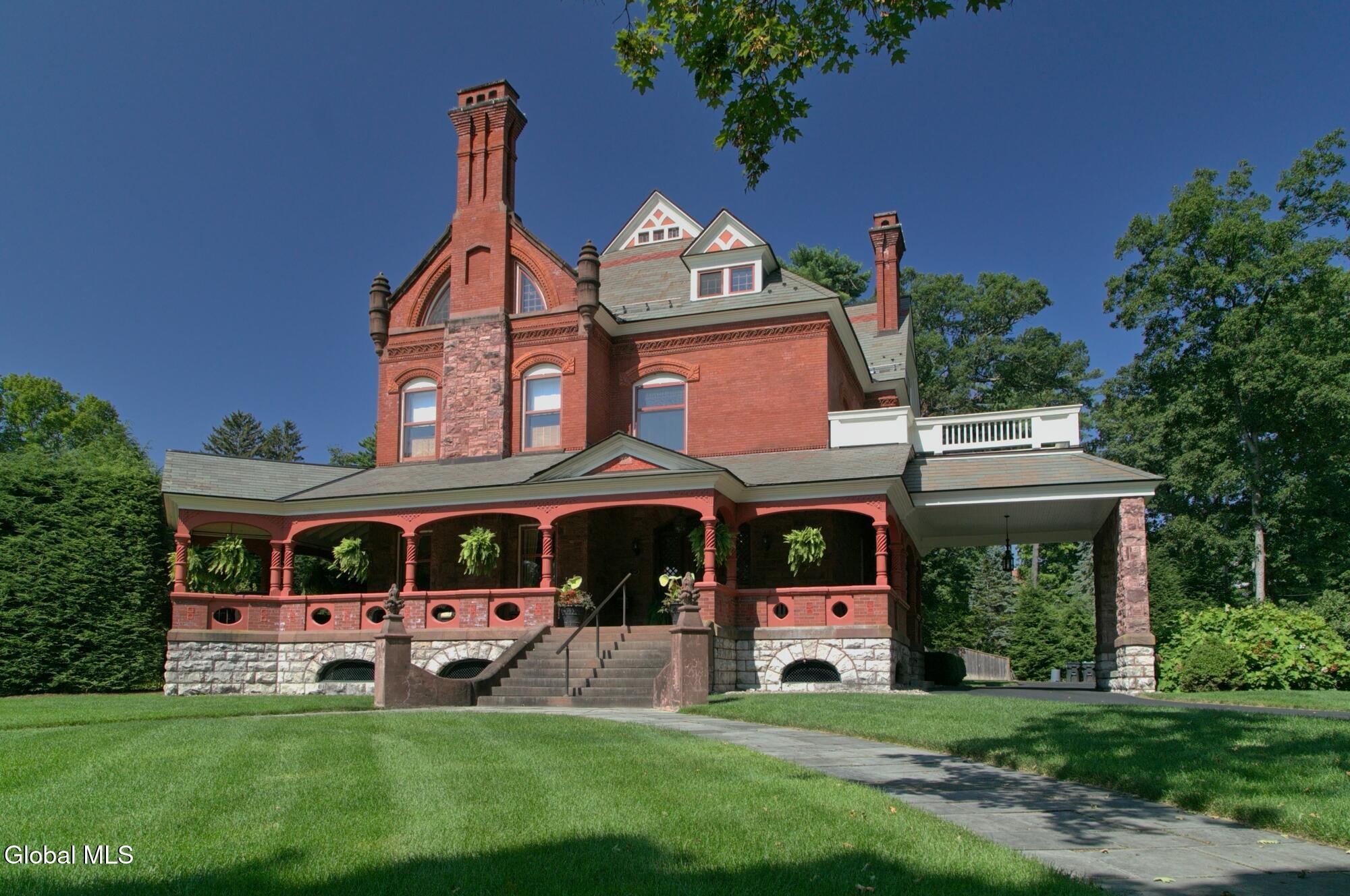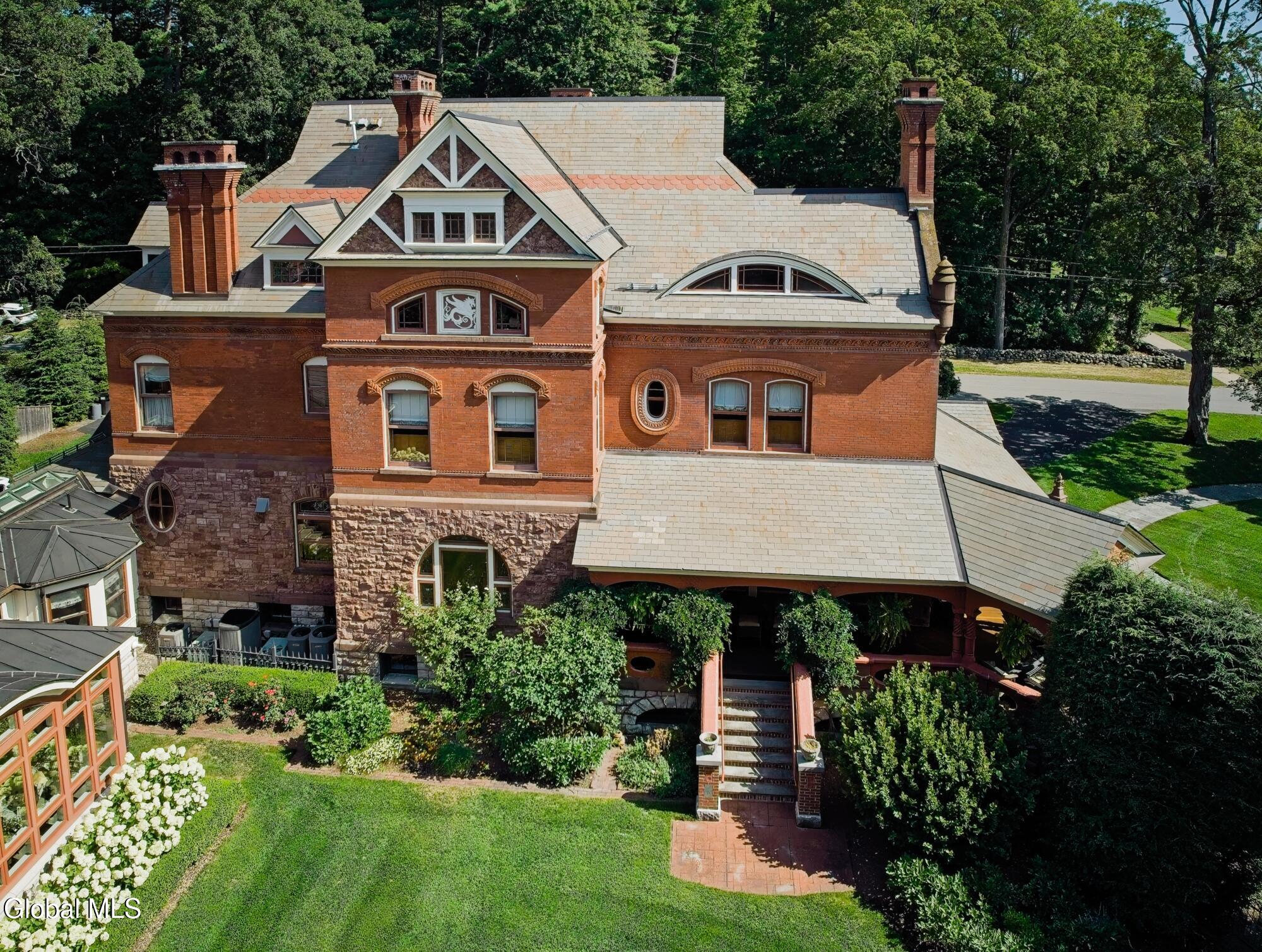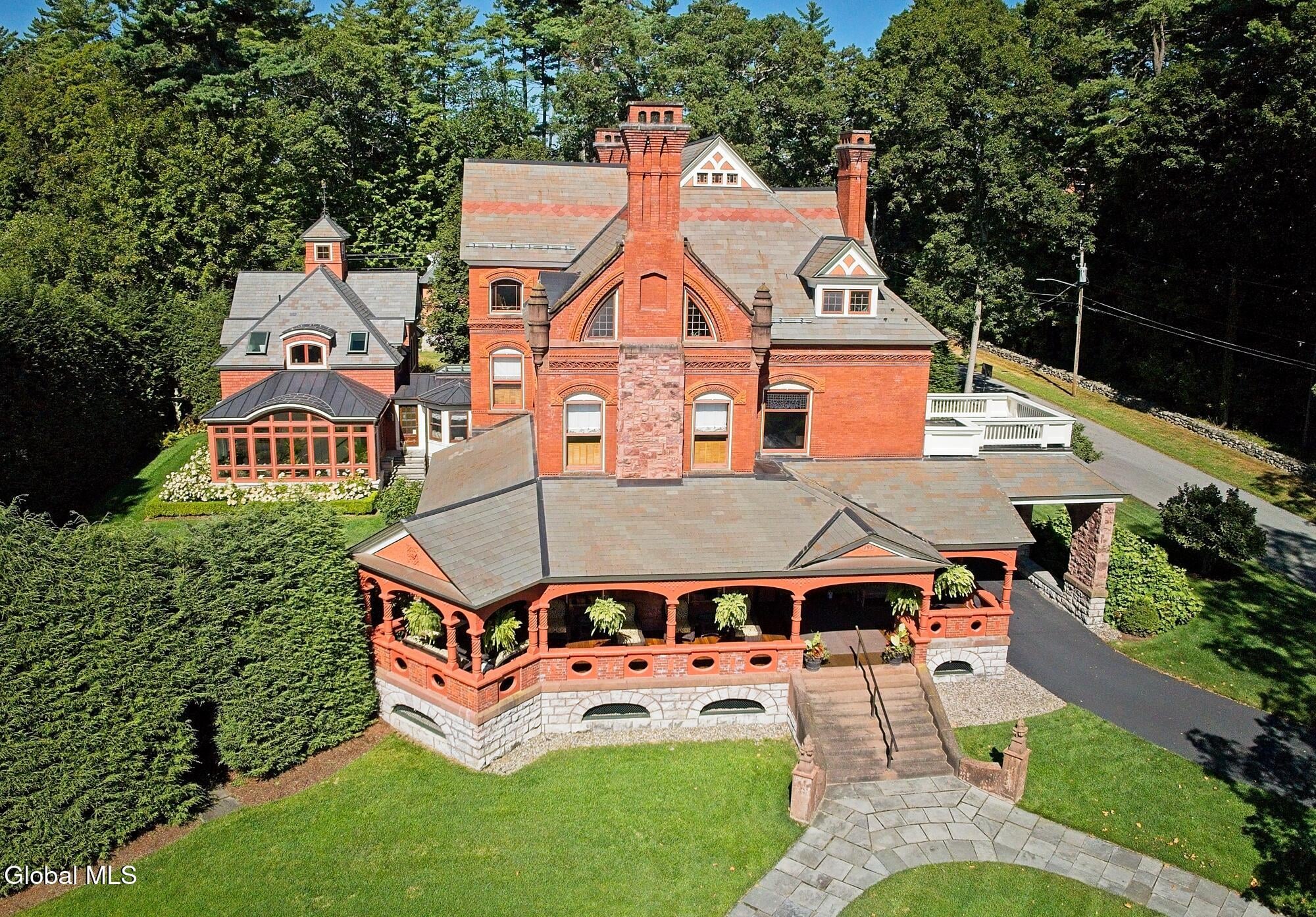 Welcome to Redstone, an exquisite, fully restored and updated historic home located on prestigious North Broadway in the heart of Saratoga Springs. This beautiful Queen Anne Romanesque Revival-style home blends the intricate details and skillful craftsmanship of a bygone era with the comforts and conveniences of today's lifestyle. The brick and sandstone facade, soaring eleven-foot ceilings, masterfully carved woodwork, stained glass windows, mantled fireplaces, and sweeping staircases are among the original features reflecting the home's splendor and artistry. Enjoy hosting both small, intimate gatherings and exciting soirees, aided by the home's thoughtful and modern amenities. The main house features seven en suite bedrooms including a generous primary suite. The live-in kitchen anchors the home with a fireplace, soapstone countertops, mahogany wet bar, and views into the surrounding grounds. A lower-level catering kitchen, wine cellar, elevator, and finished basement further enhance the home's functionality. In 2015, a significant architectural addition was completed, earning the New Contextual Design Award from the Saratoga Springs Preservation Foundation. This Carriage House-style expansion, connected by a skylit mudroom breezeway, includes a vaulted great room, exposed barn beams, reclaimed wood flooring, full bath, custom bar, and a cupola that fills the space with natural light. A sunroom overlooking formal gardens, garden sink area, and two-car garage complete the space. This property offers a wraparound front porch, private side yard, and formal gardens ideal for outdoor entertaining. The location provides easy access to downtown Saratoga Springs and Skidmore College, while preserving a sense of privacy and retreat.